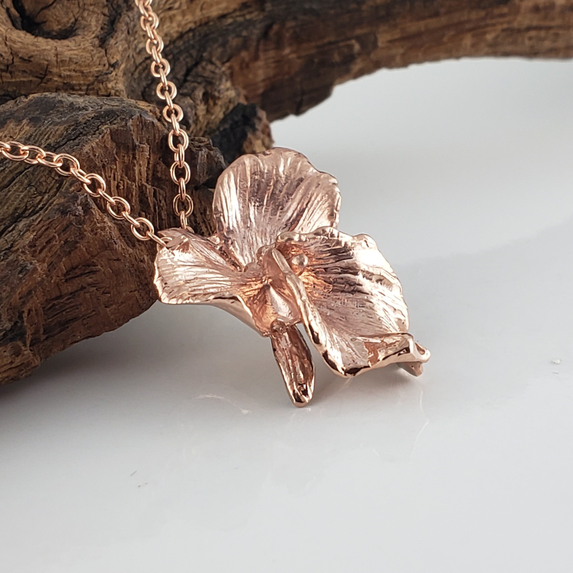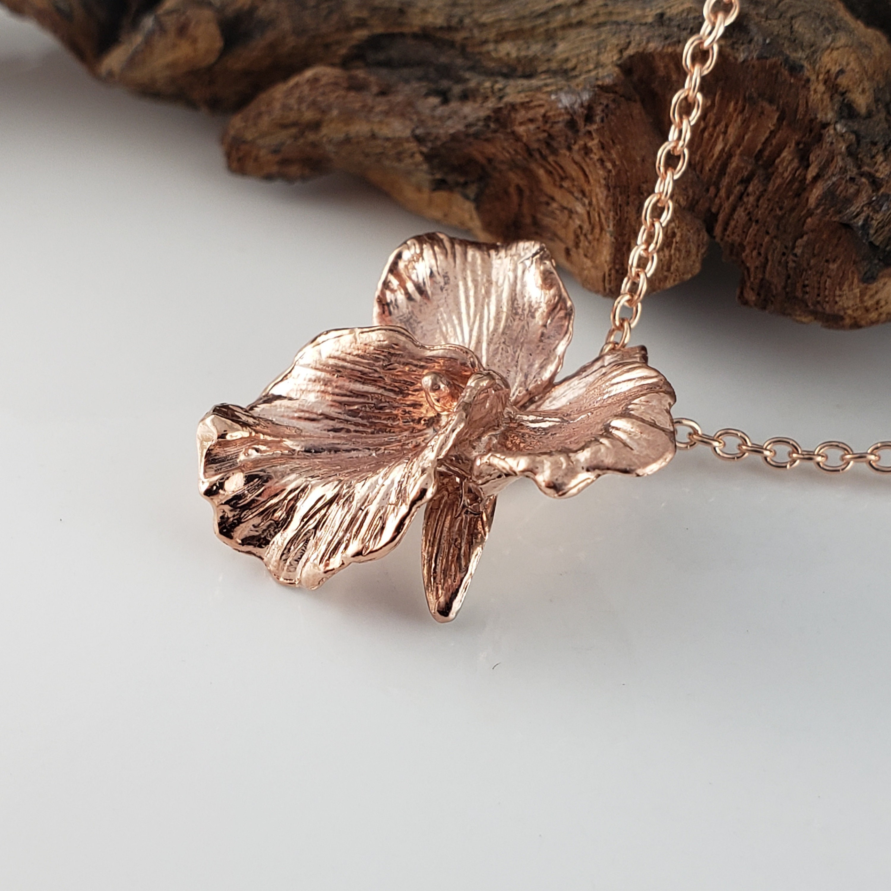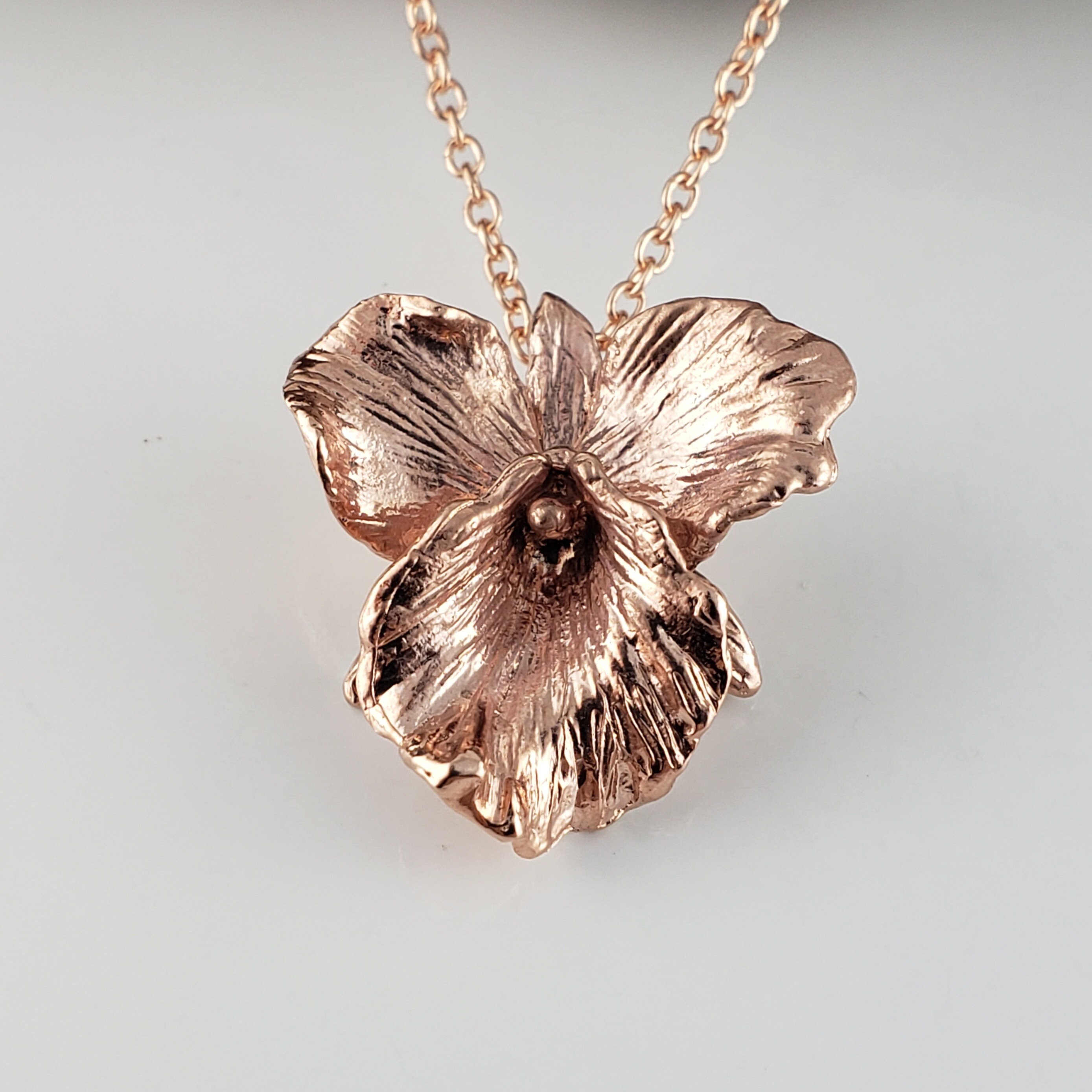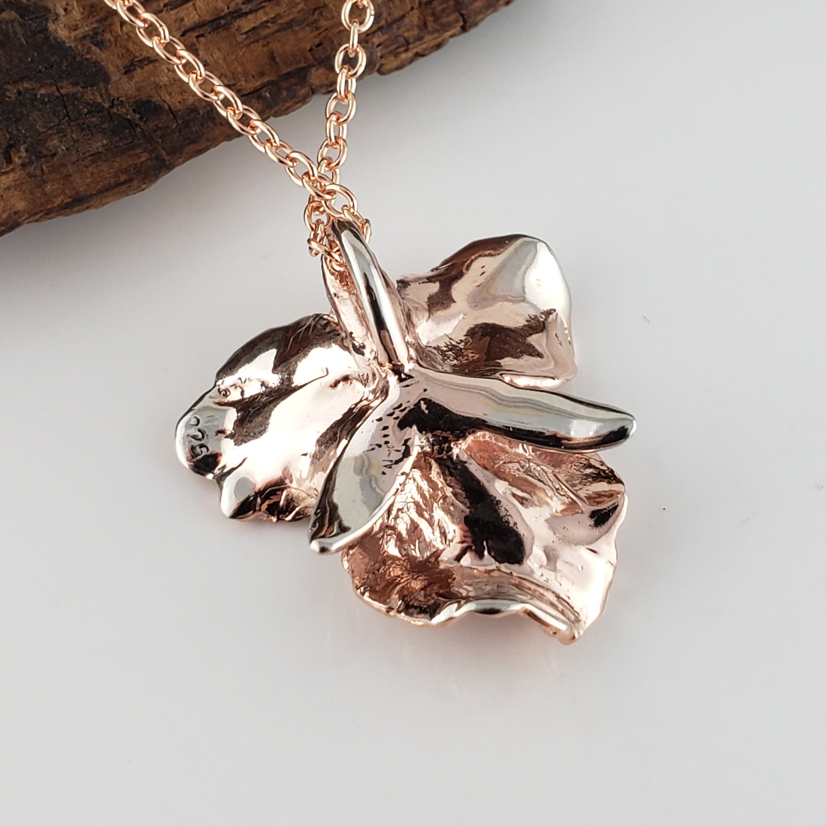 92.5 Sterling Silver Orchid Pendant plated in 14k Rose Gold, pendant only or with Gold Filled Cable Chain