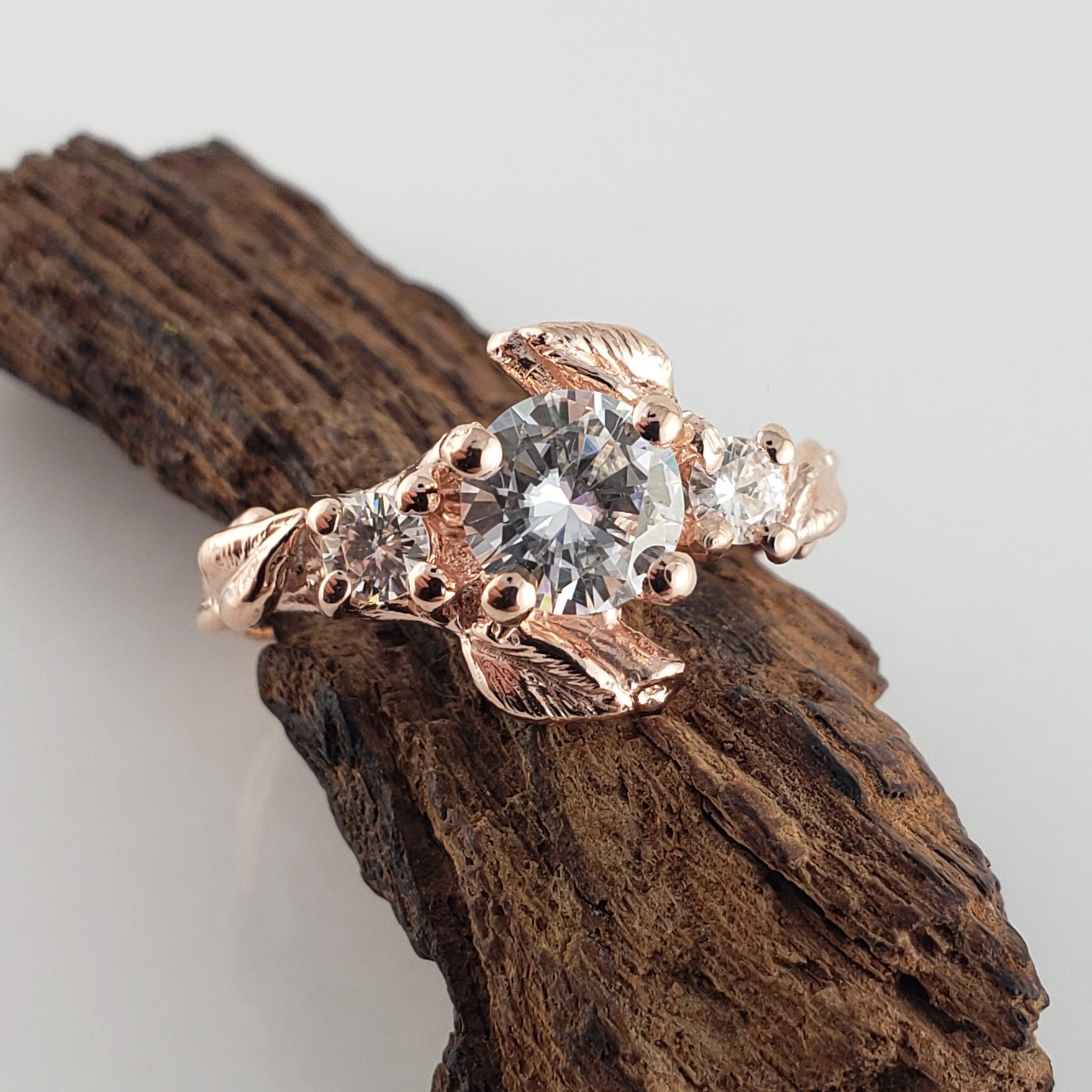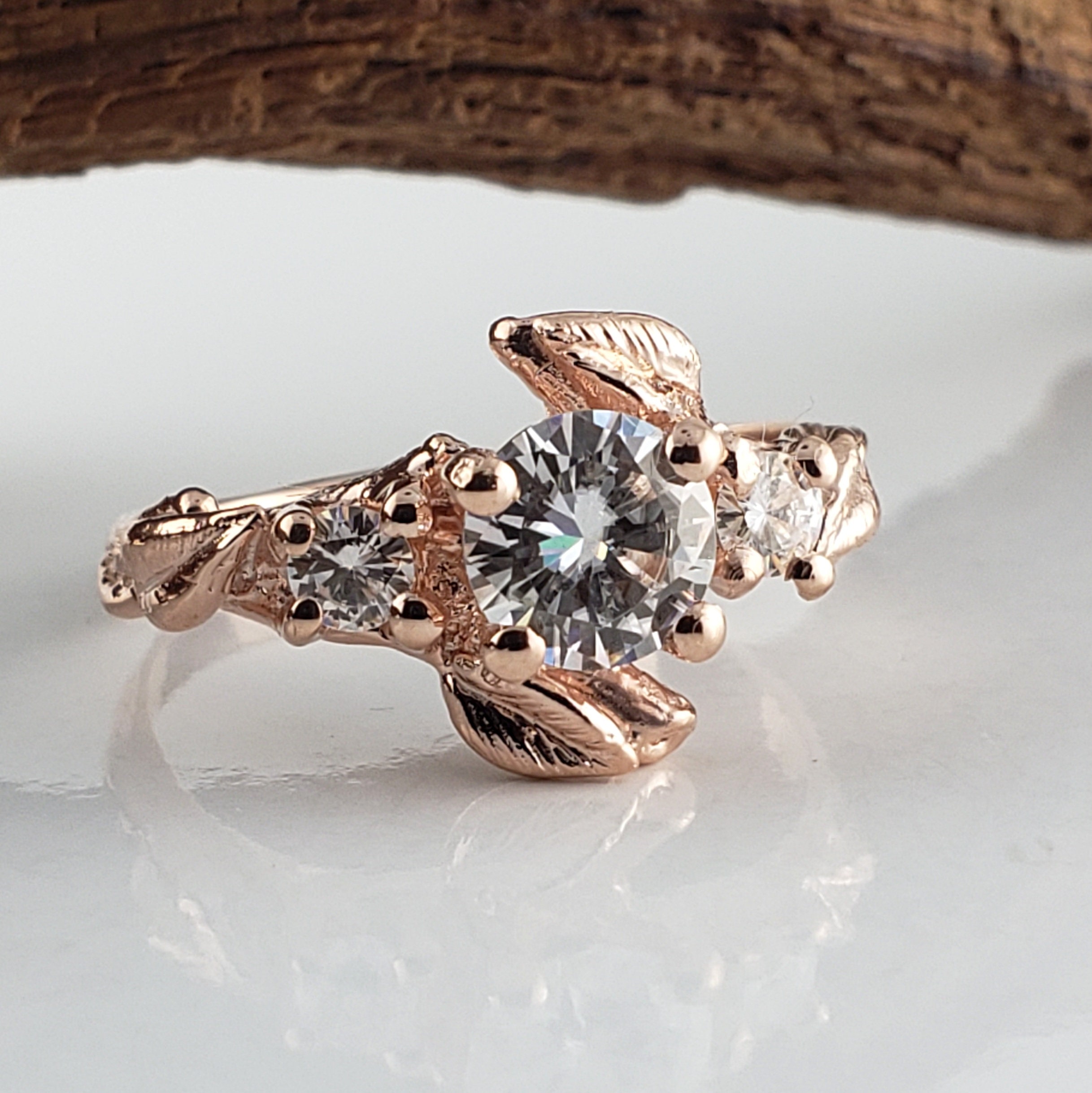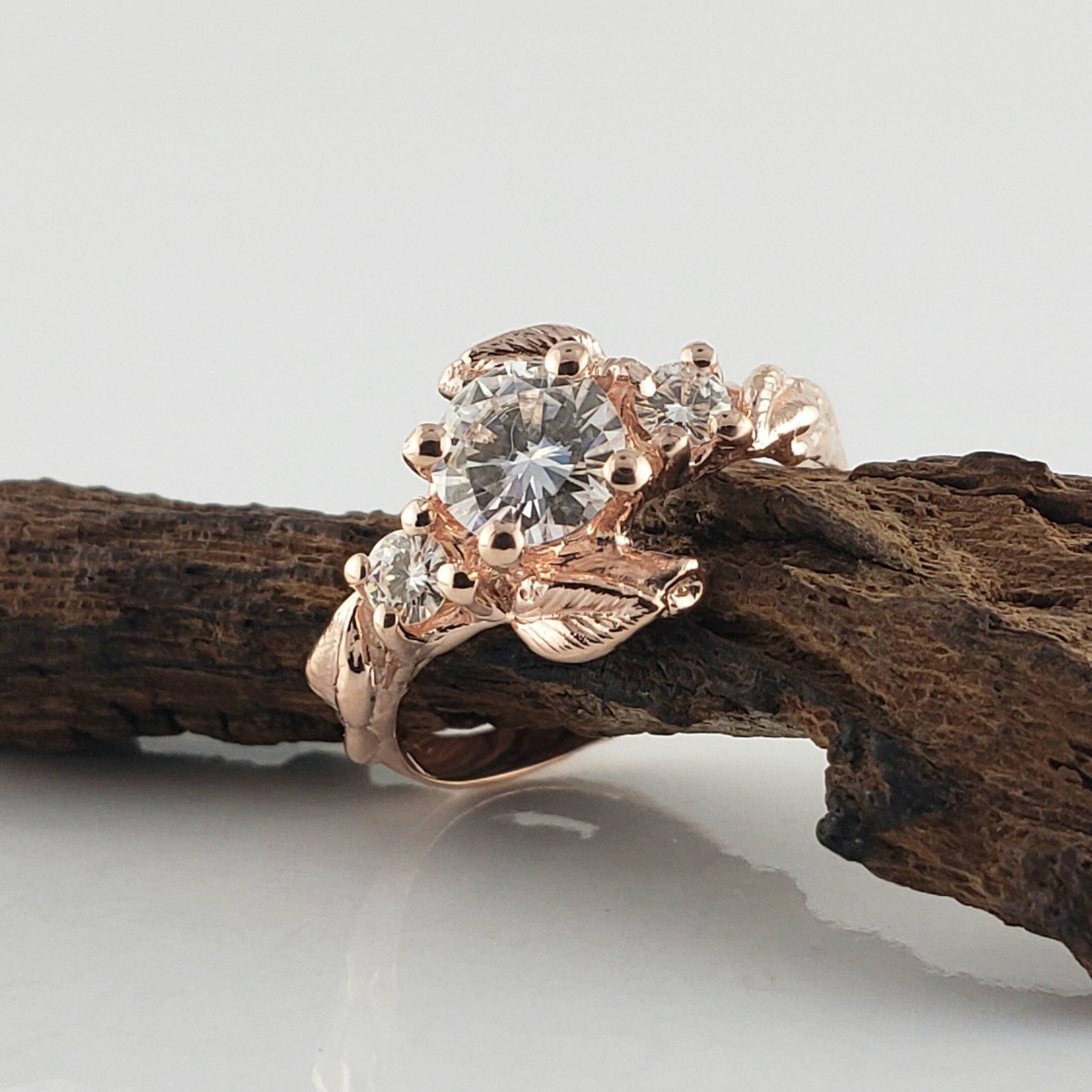 Moissanite Leaf & Twig Engagement Ring in Solid Gold, Three Stones - Anniversary Jewelry - by DV Designs