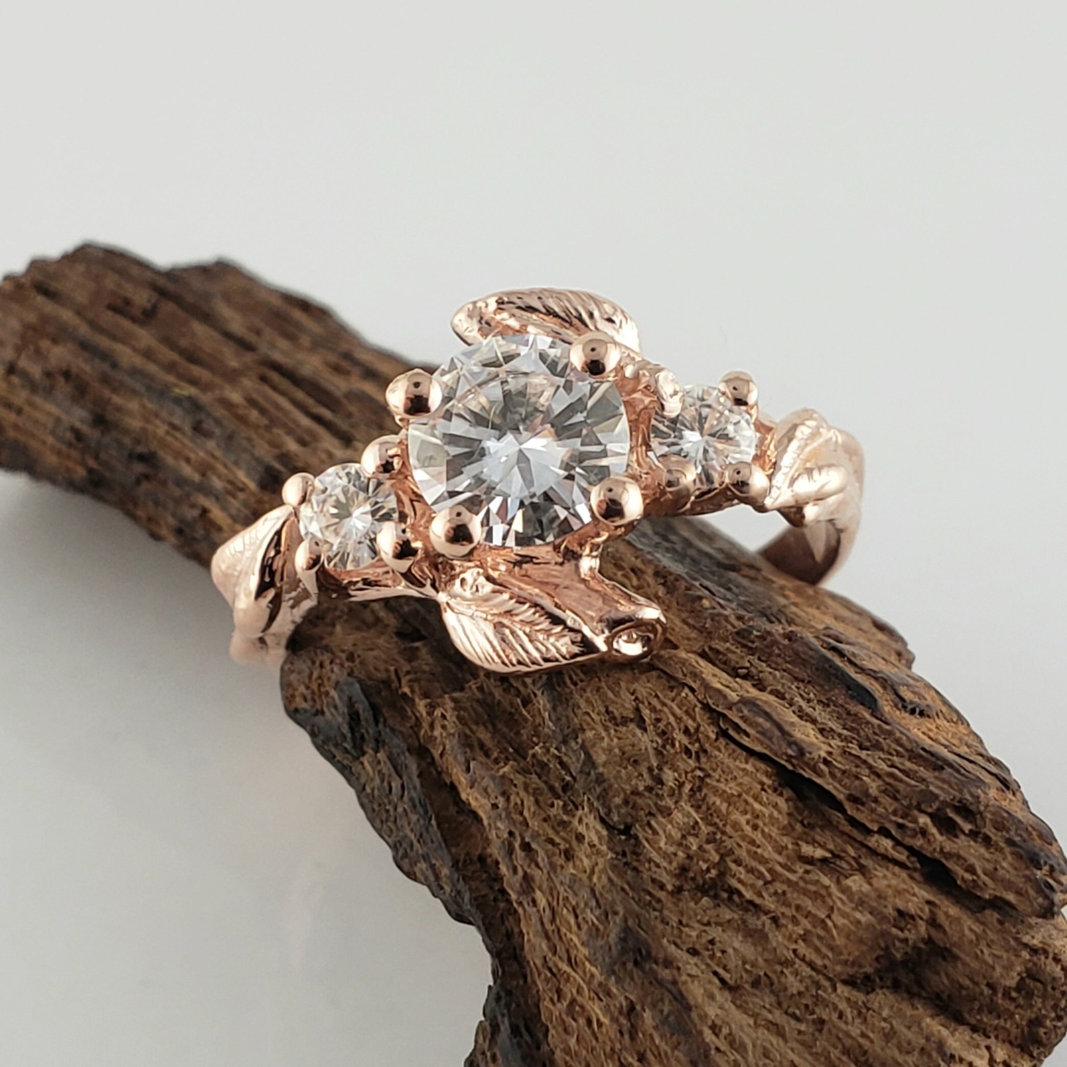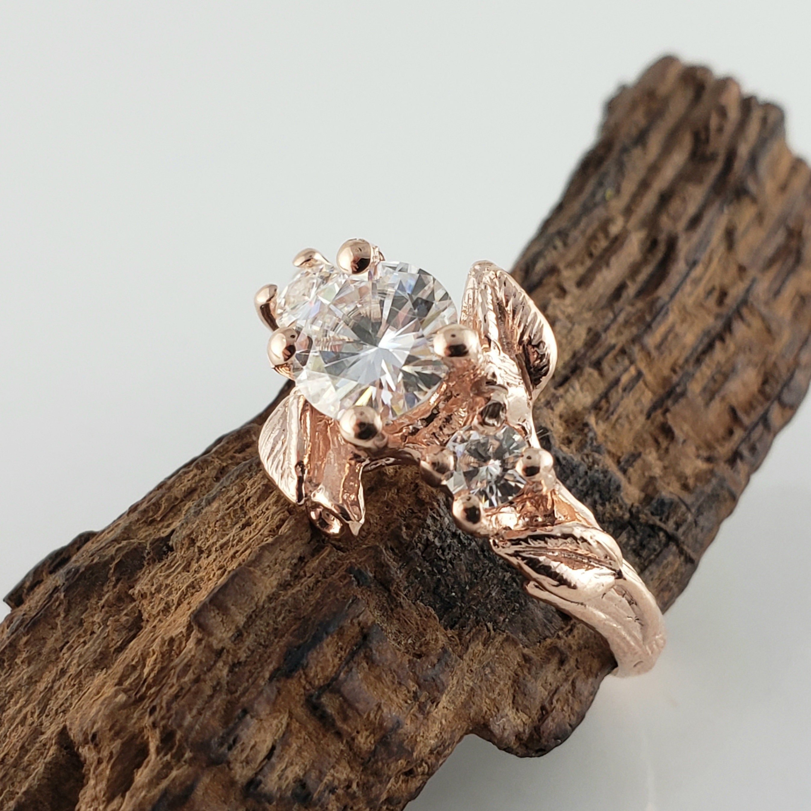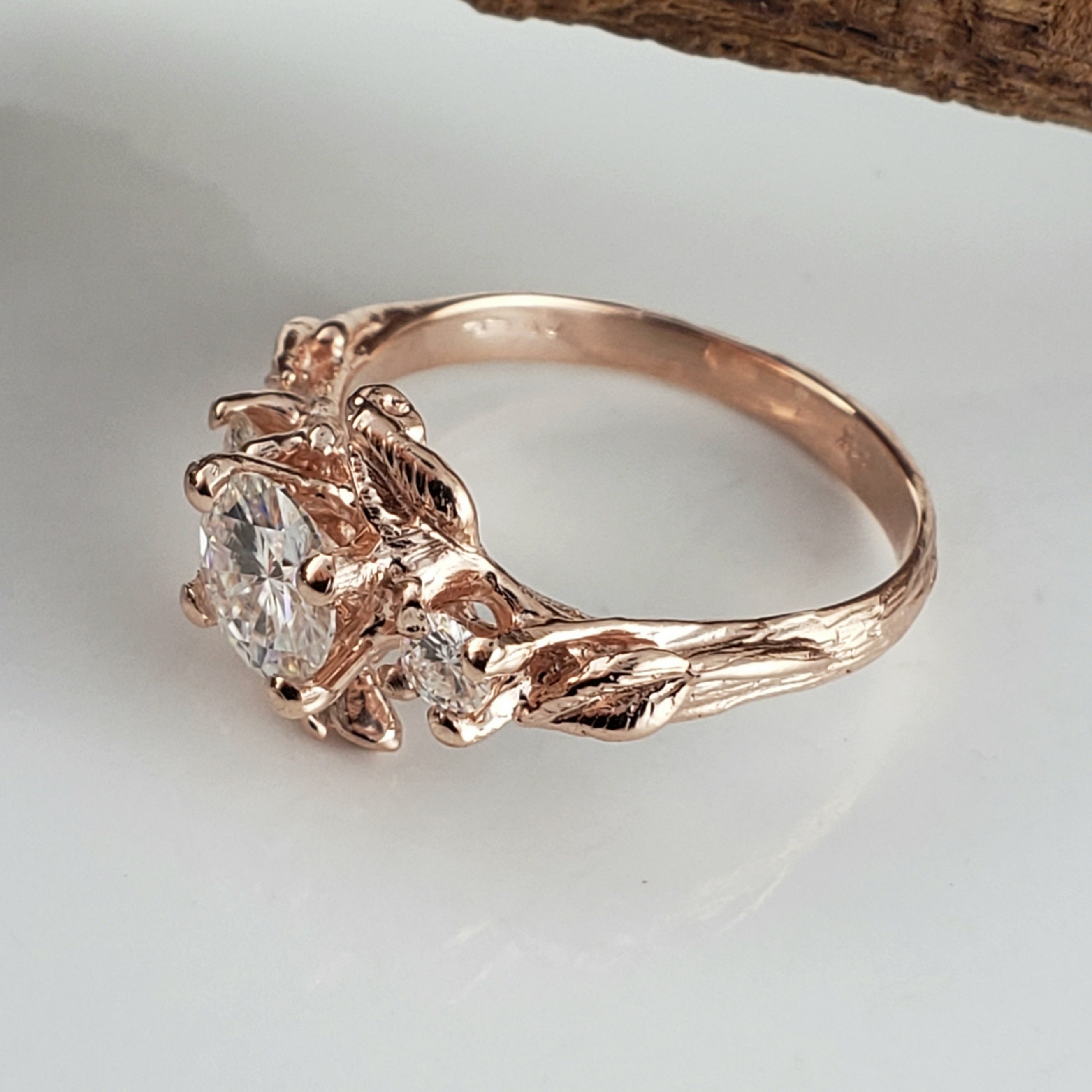 Moissanite Leaf & Twig Engagement Ring in Solid Gold, Three Stones - Anniversary Jewelry - by DV Designs
