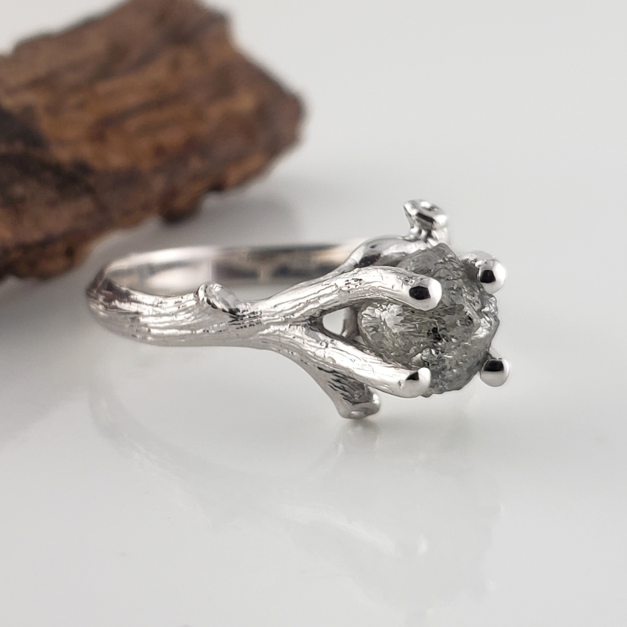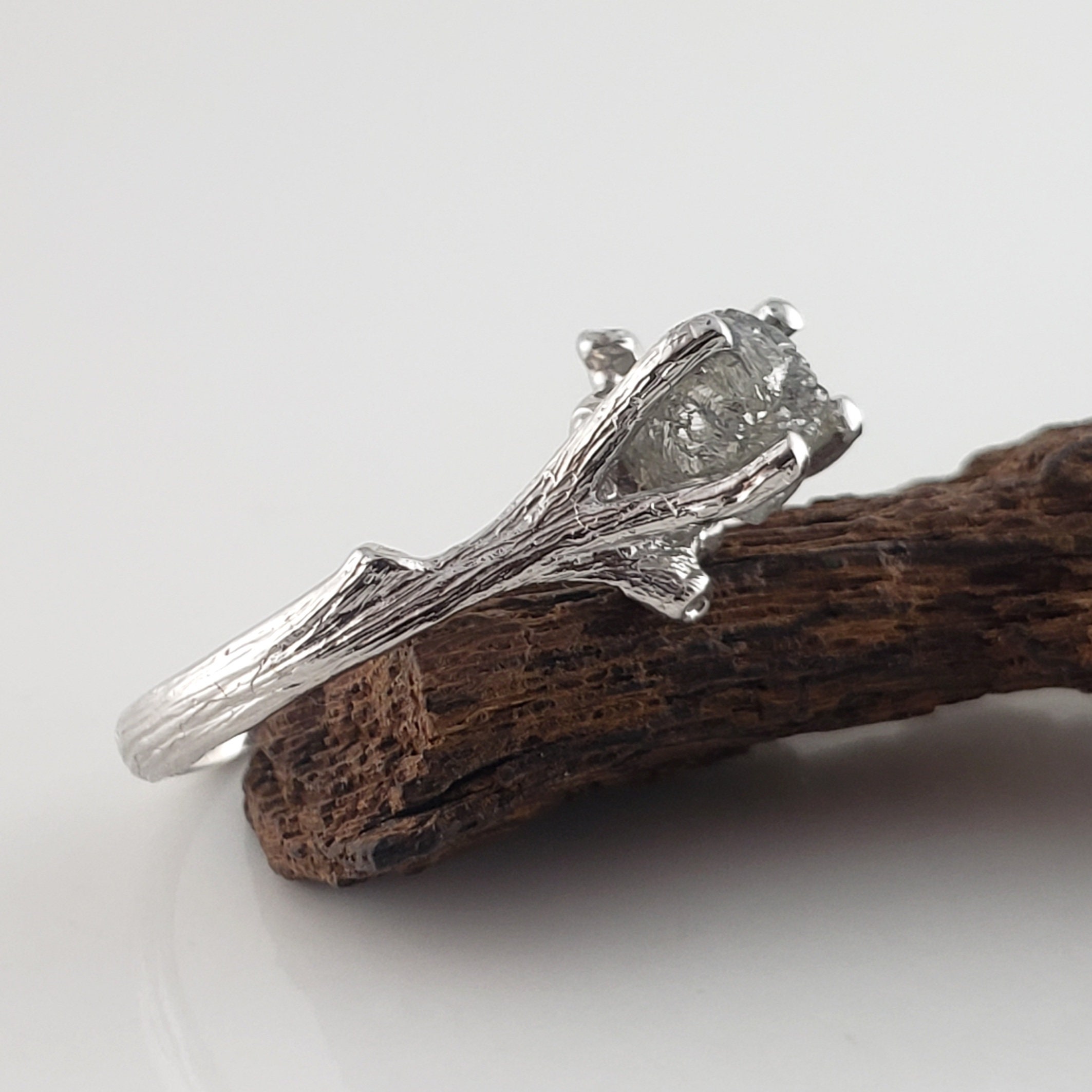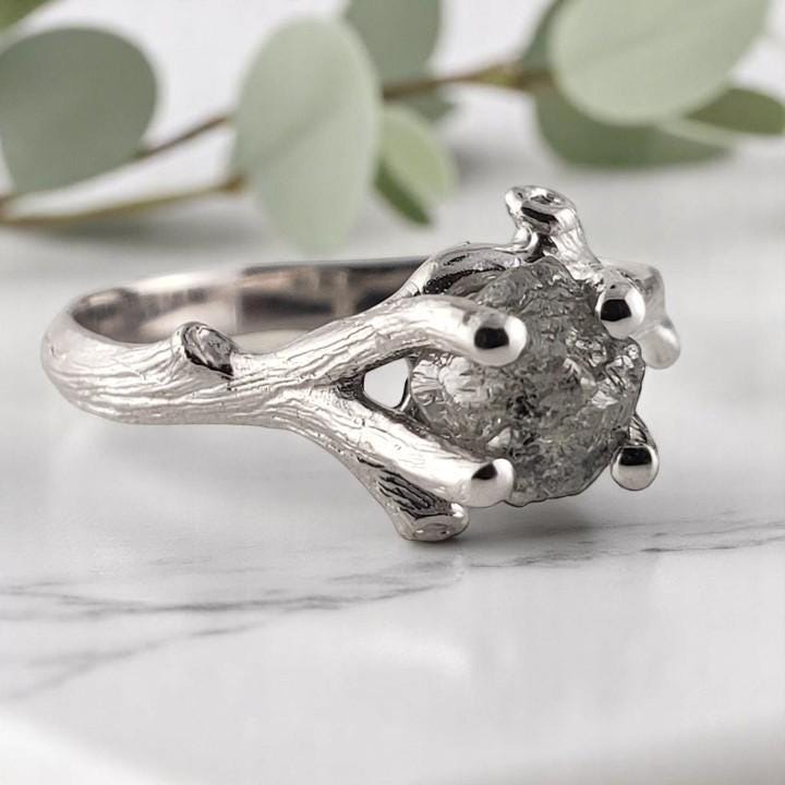 Raw Diamond Ring, Salt and Pepper Rough Diamond Twig Engagement Ring Solid Gold, Goth Engagement Ring