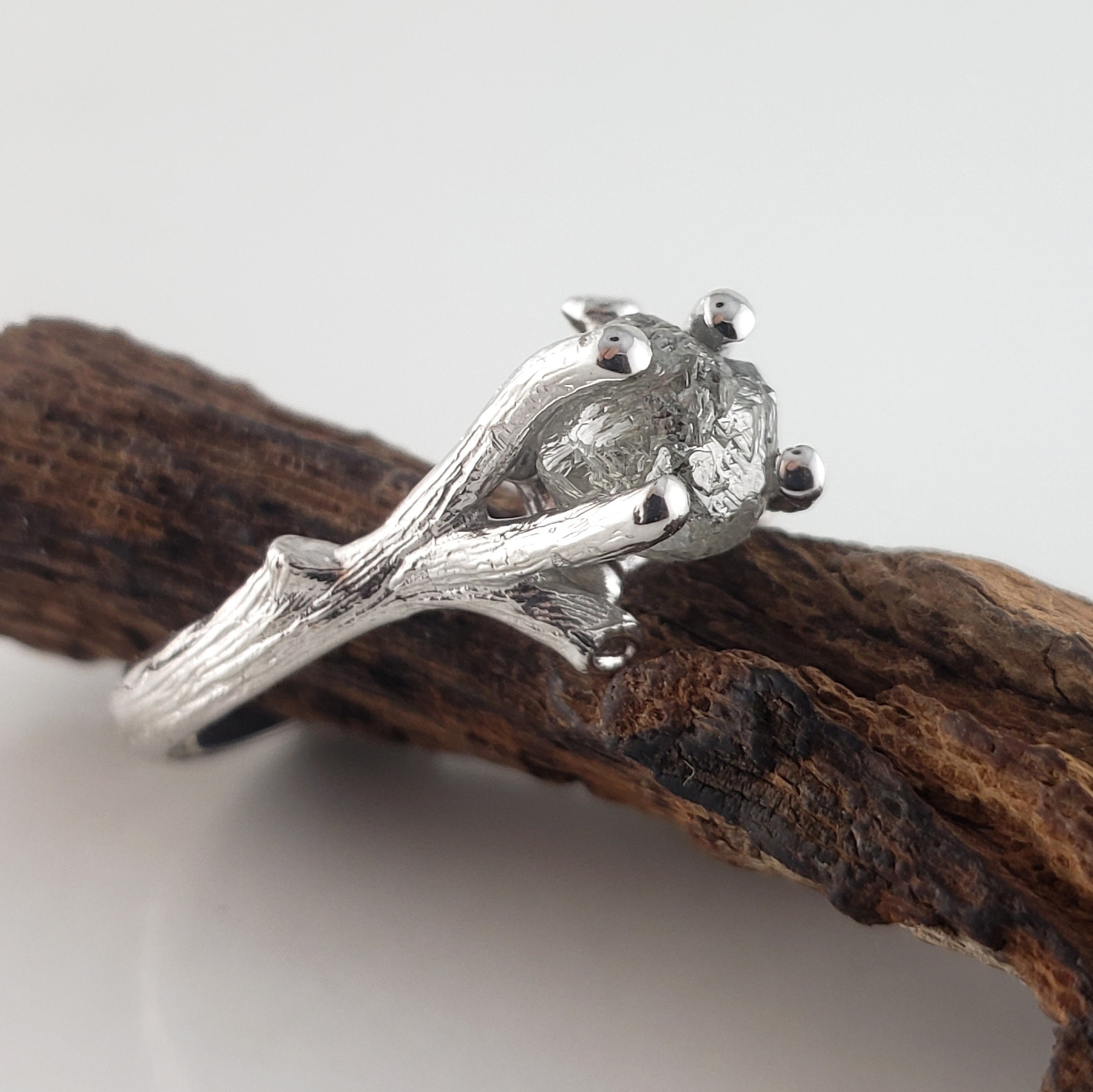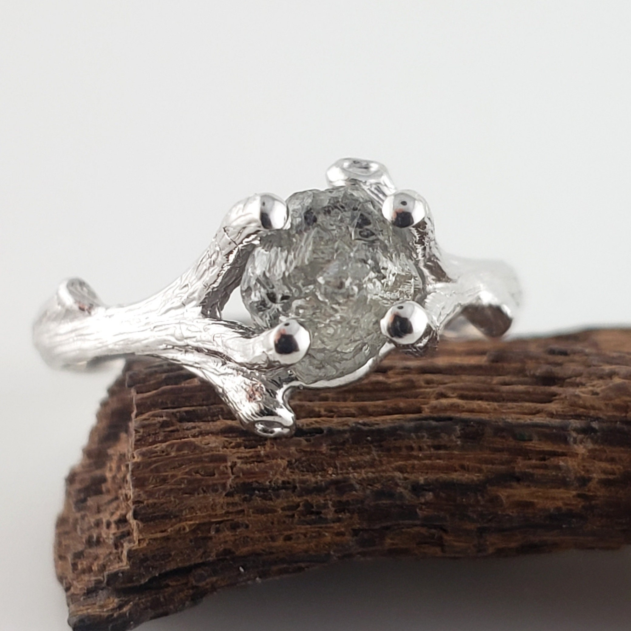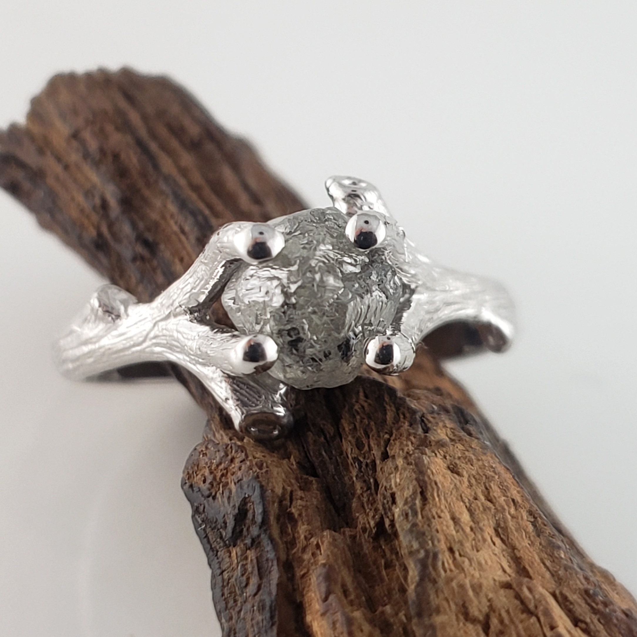 Raw Diamond Ring, Salt and Pepper Rough Diamond Twig Engagement Ring Solid Gold, Goth Engagement Ring