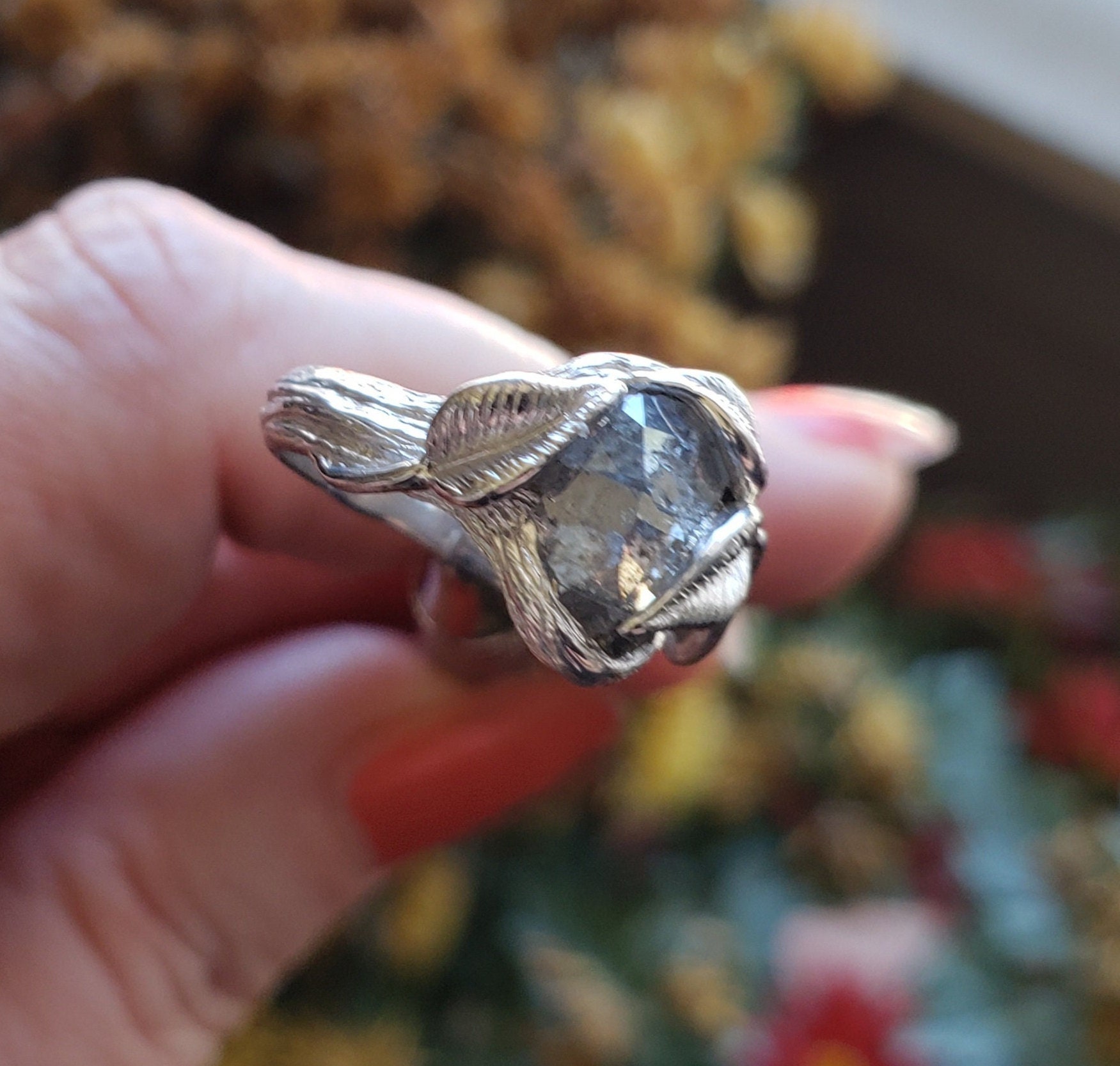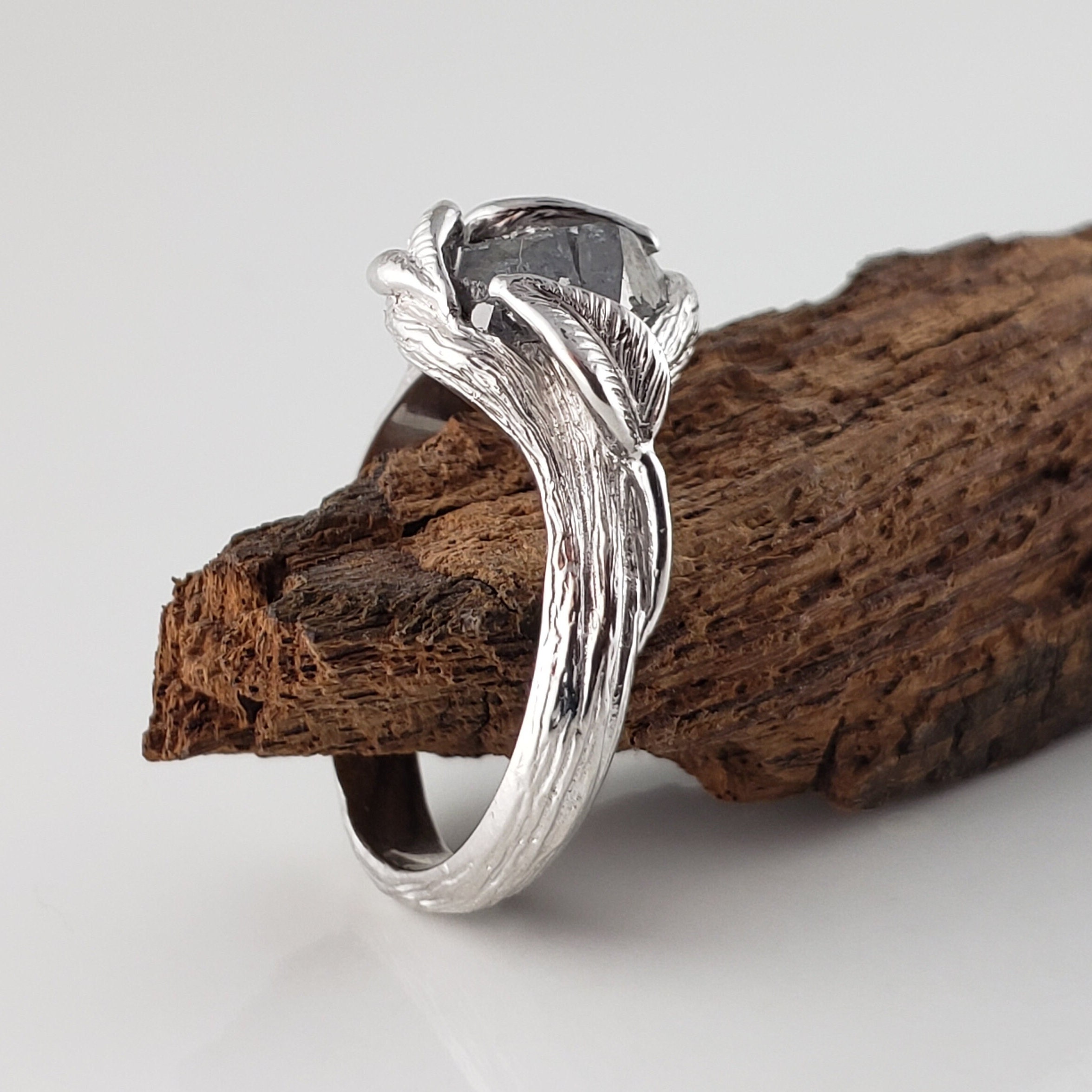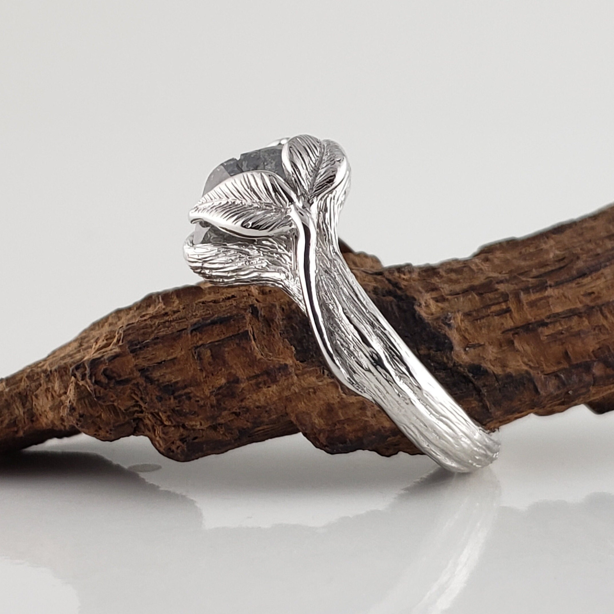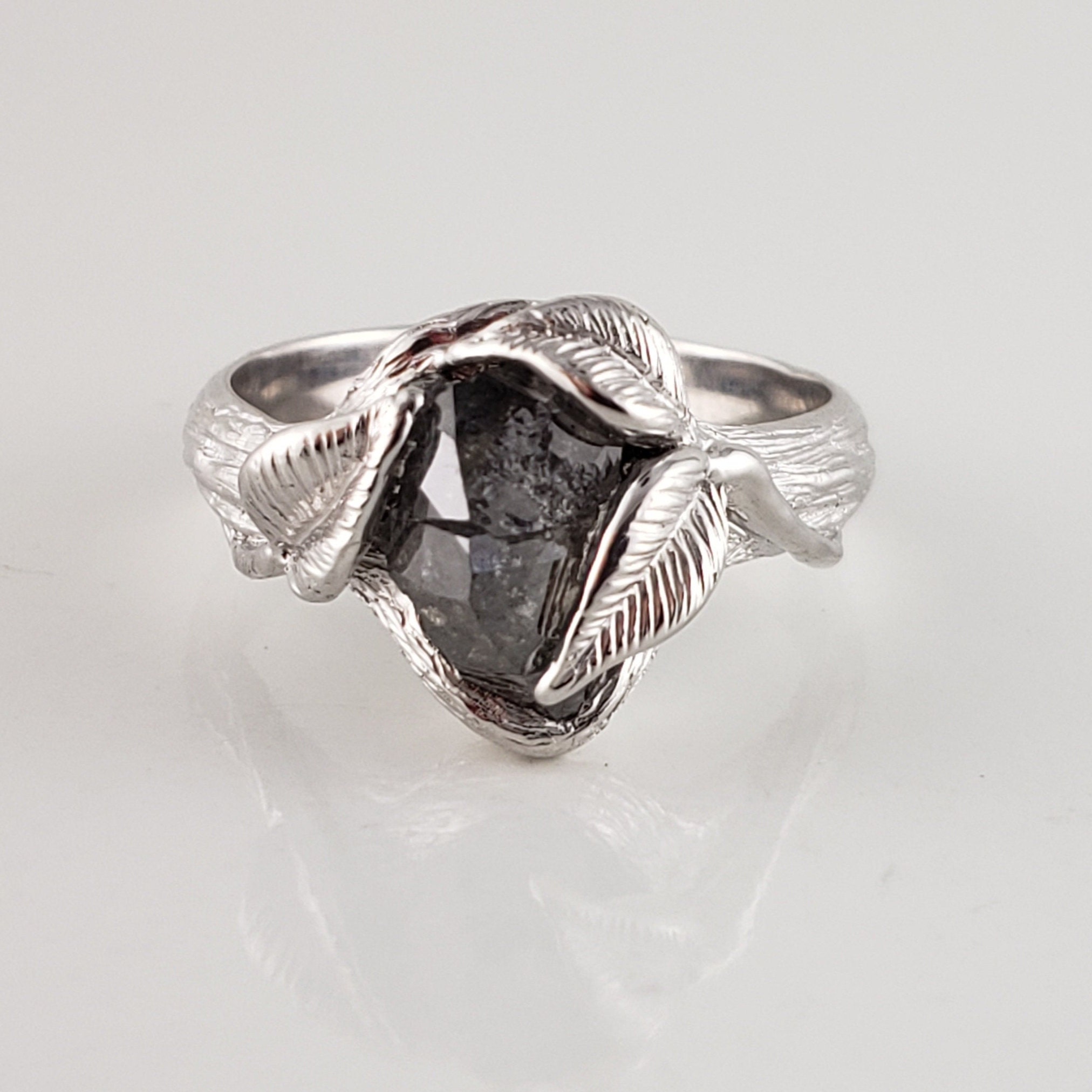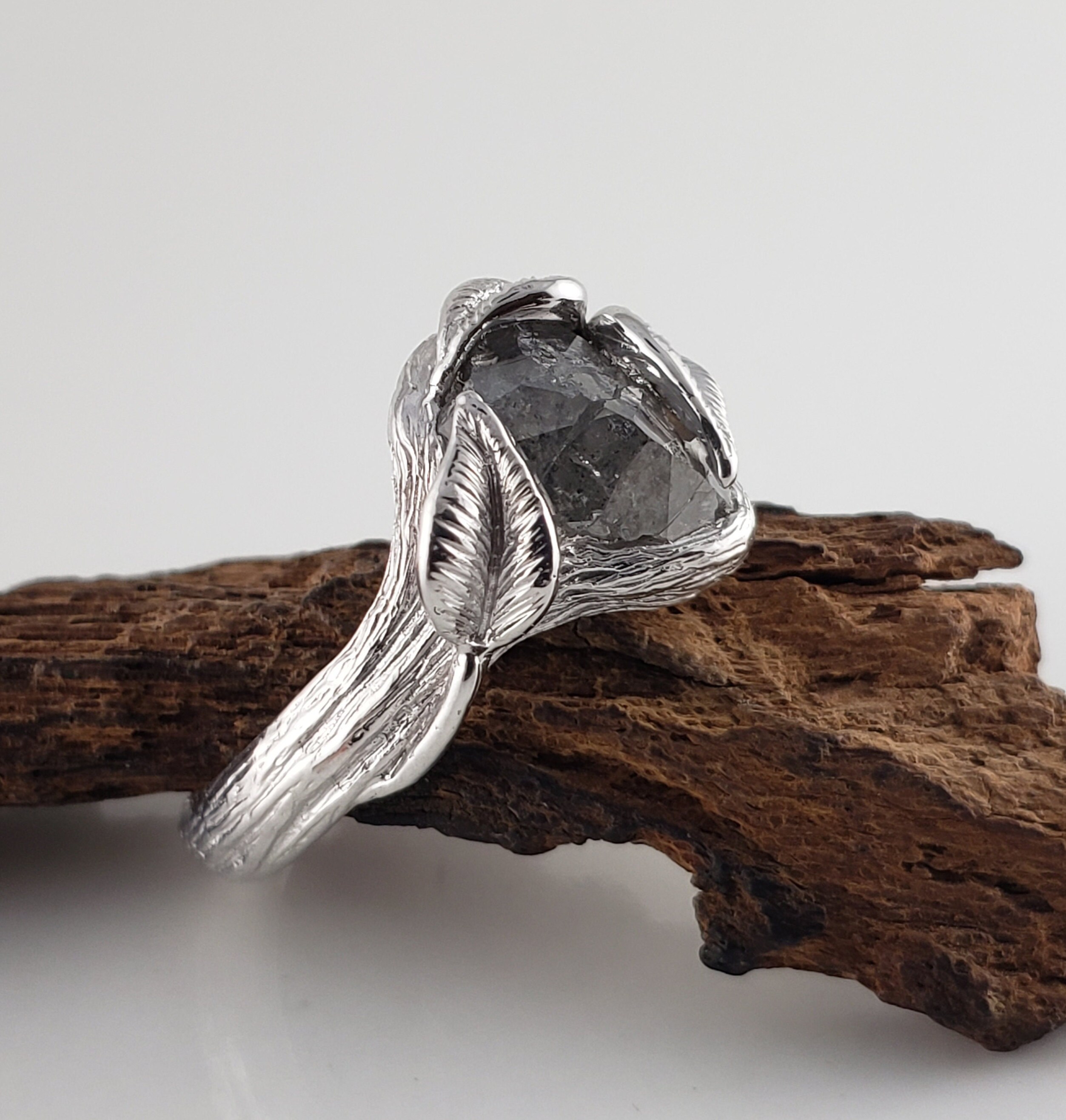 One-of-a-Kind Leaf and Twig Engagement Ring, Partially Hand Cut Salt and Pepper Diamond - Anniversary Ring - DV Jewelry Designs