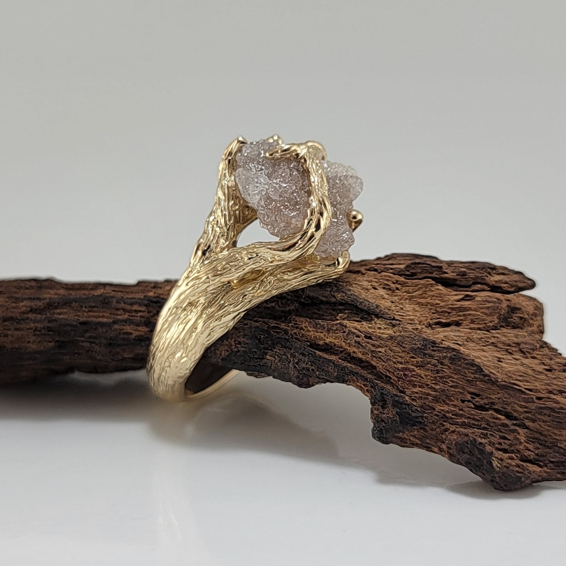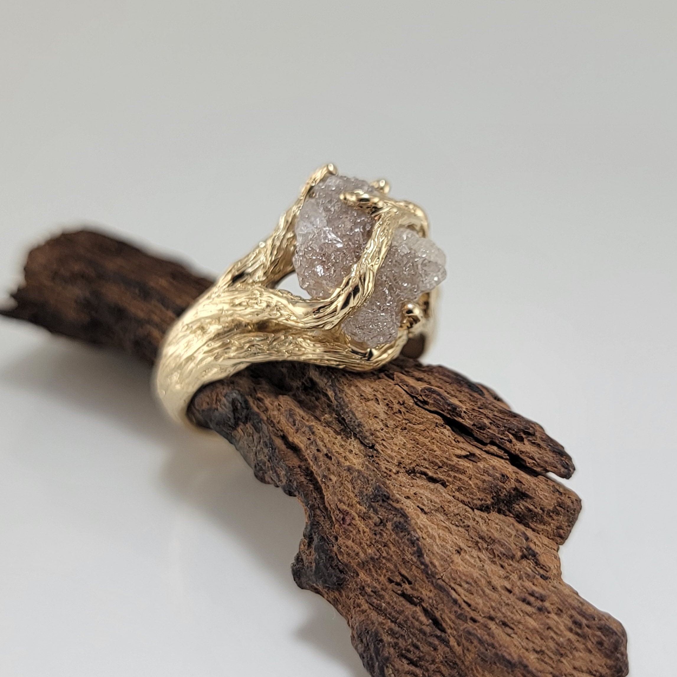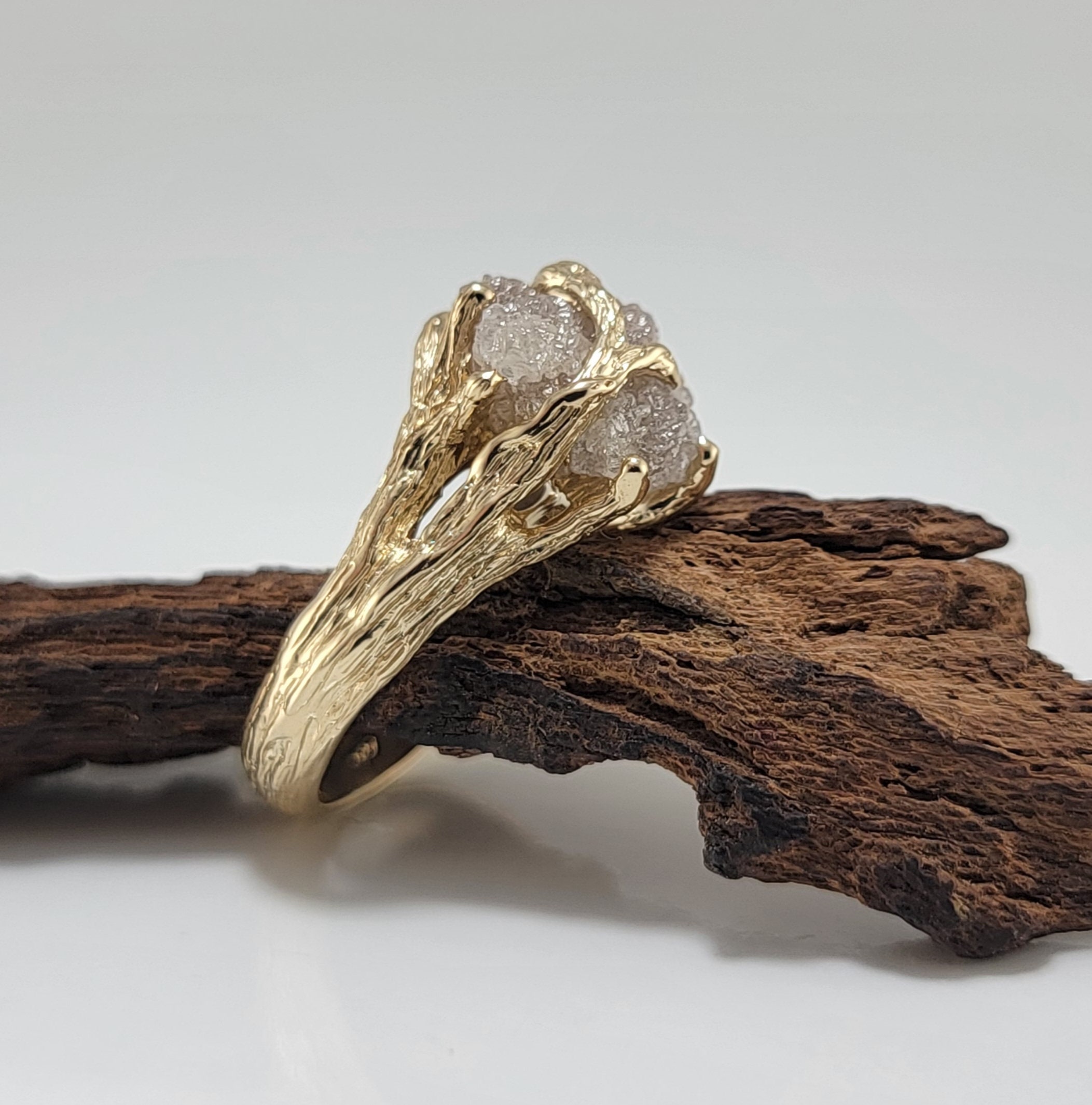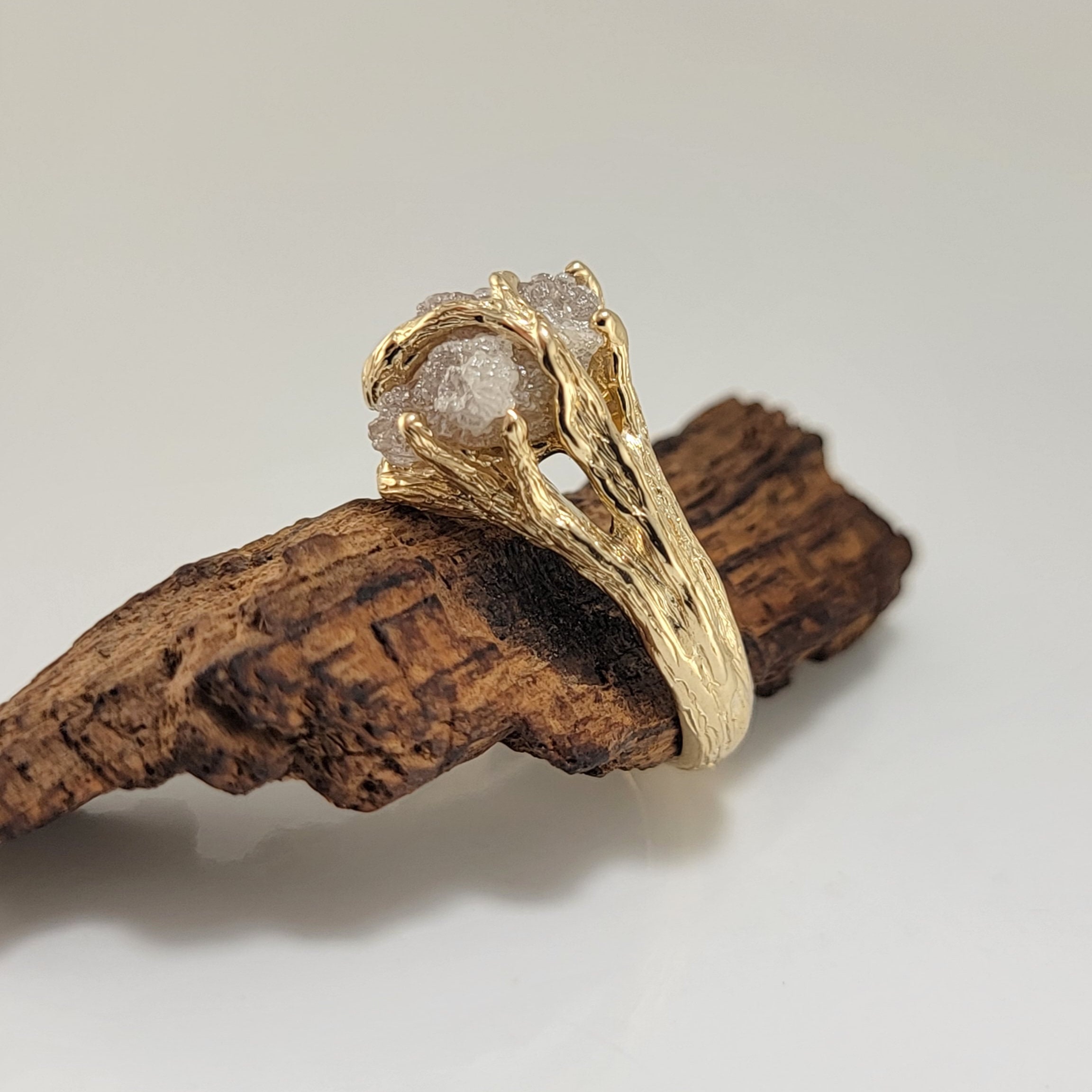 Organic Rough Diamond Branch Ring in Yellow Gold for Anniversaries and Engagements