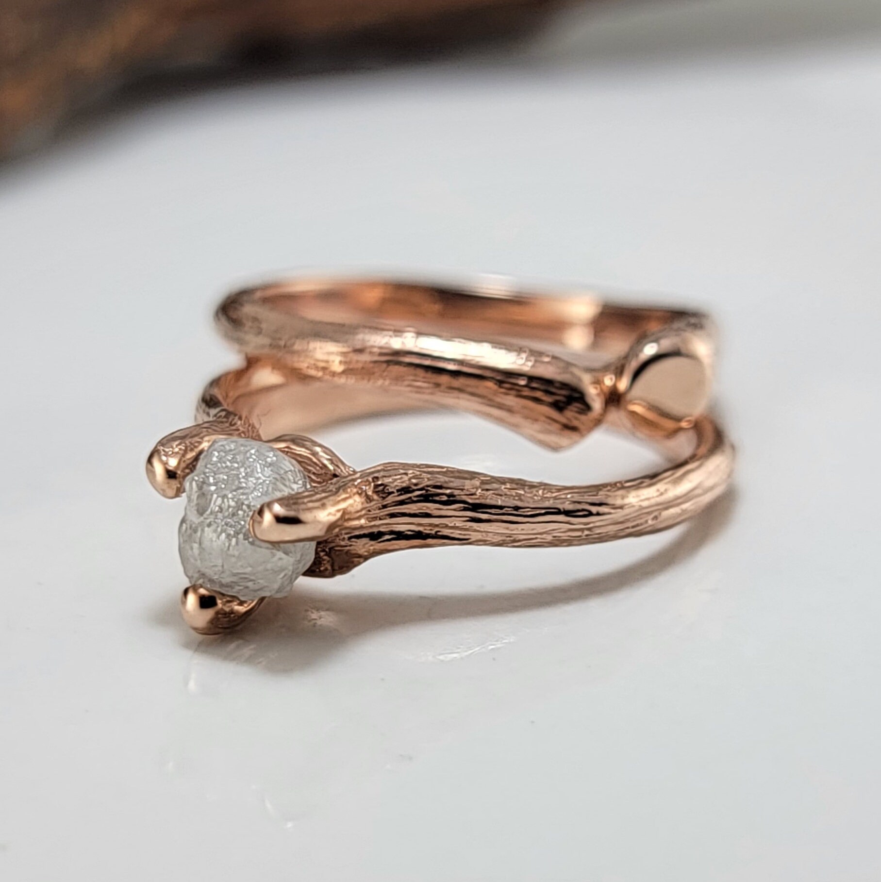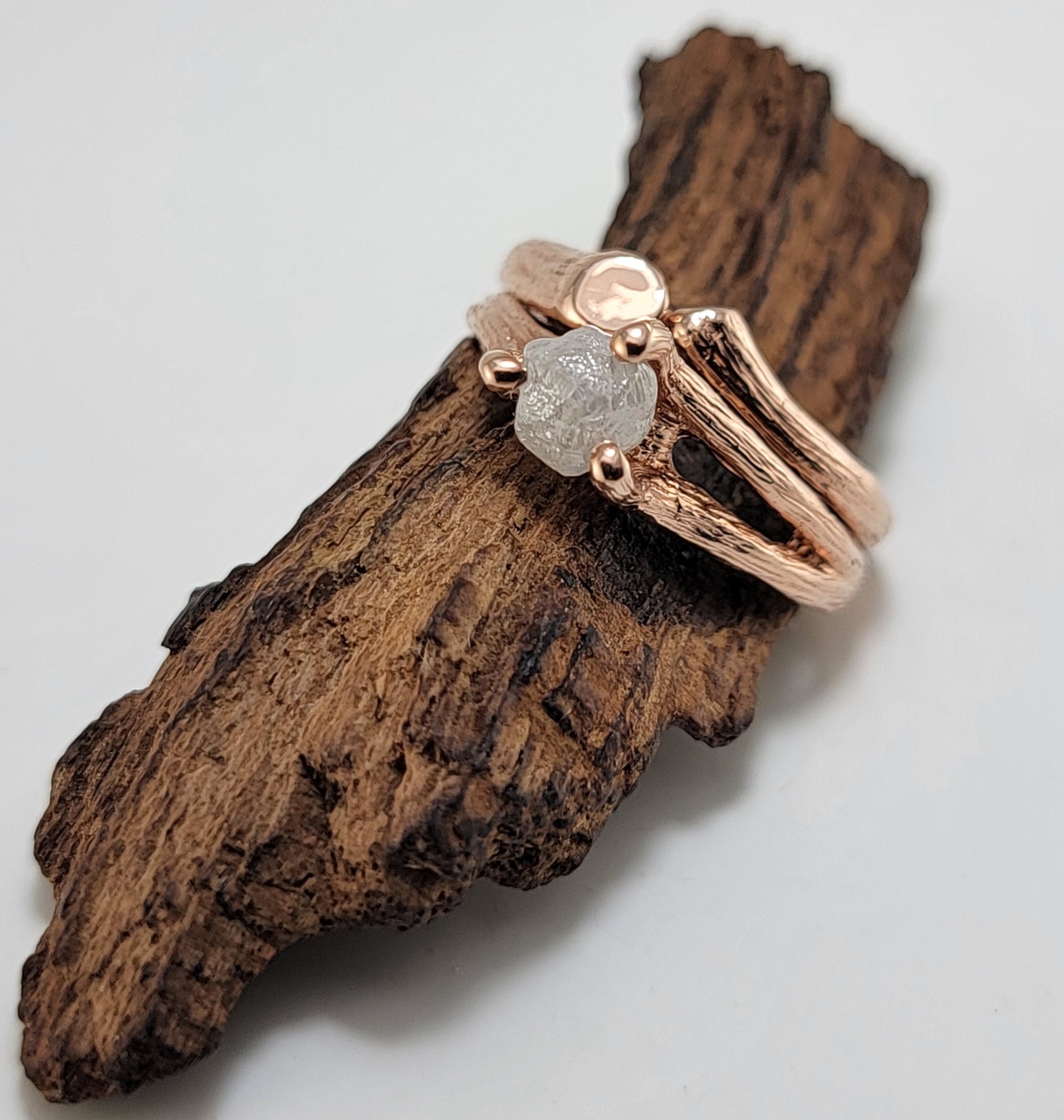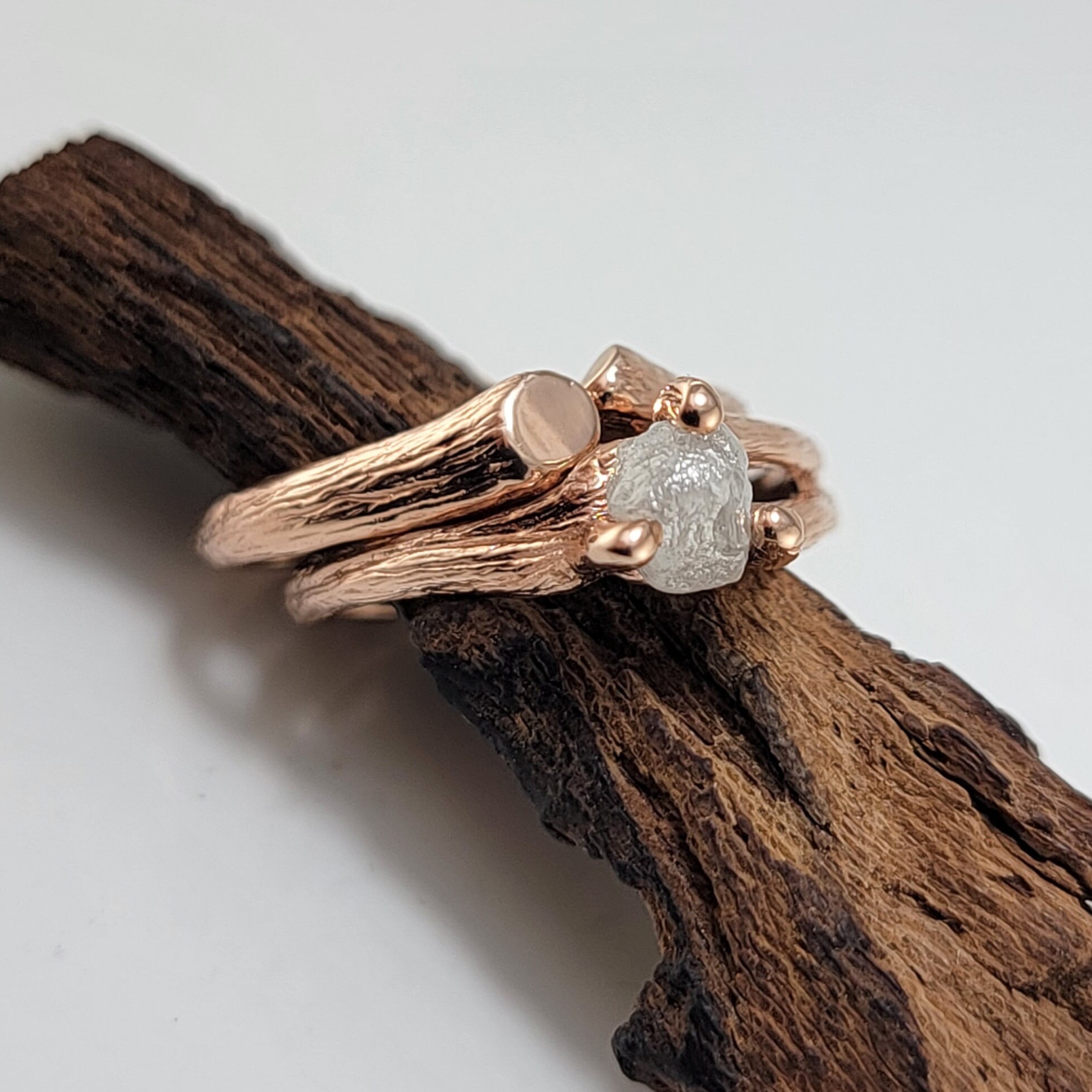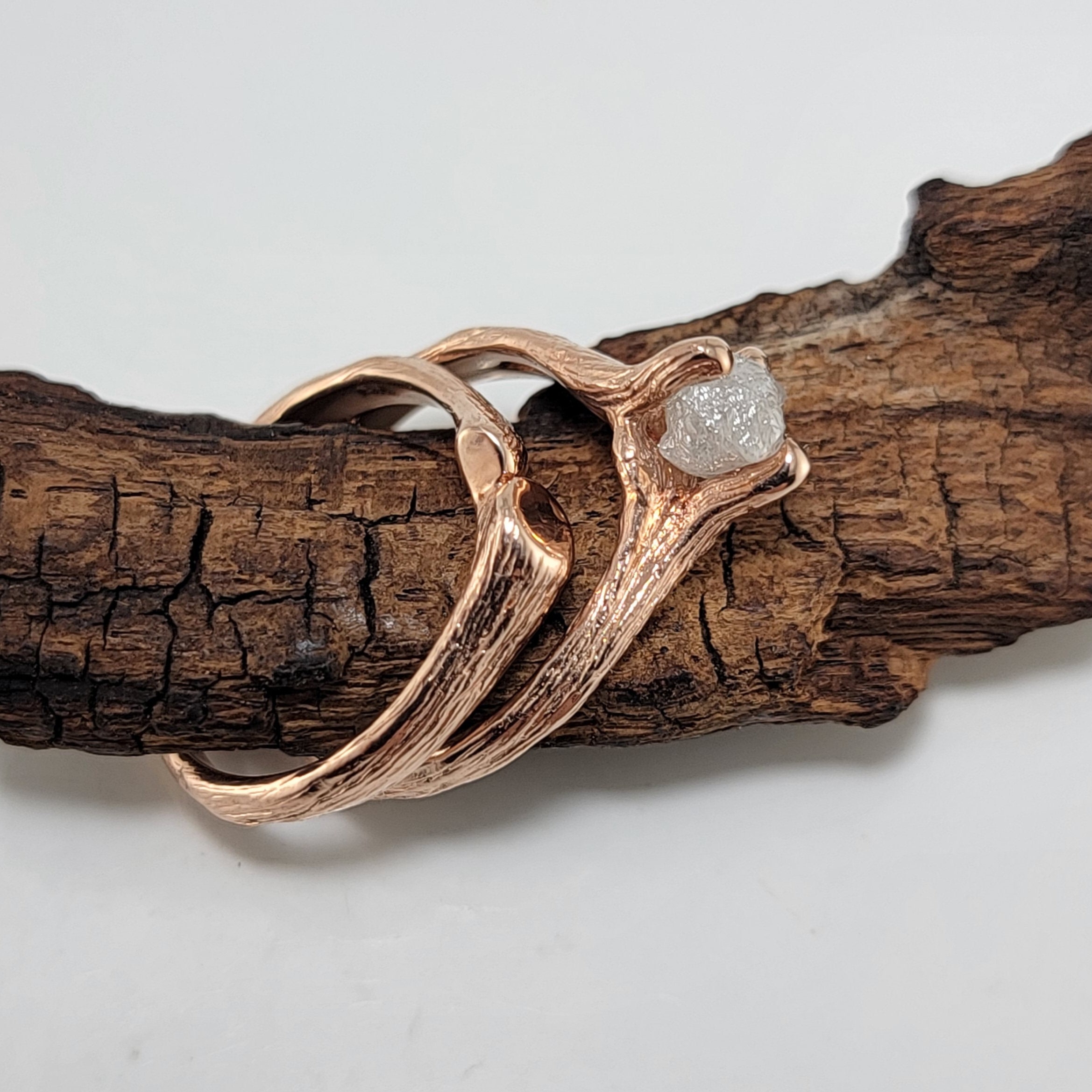 Rough Diamond Twig Engagement Ring in Solid Gold with Split Twig Wedding Band