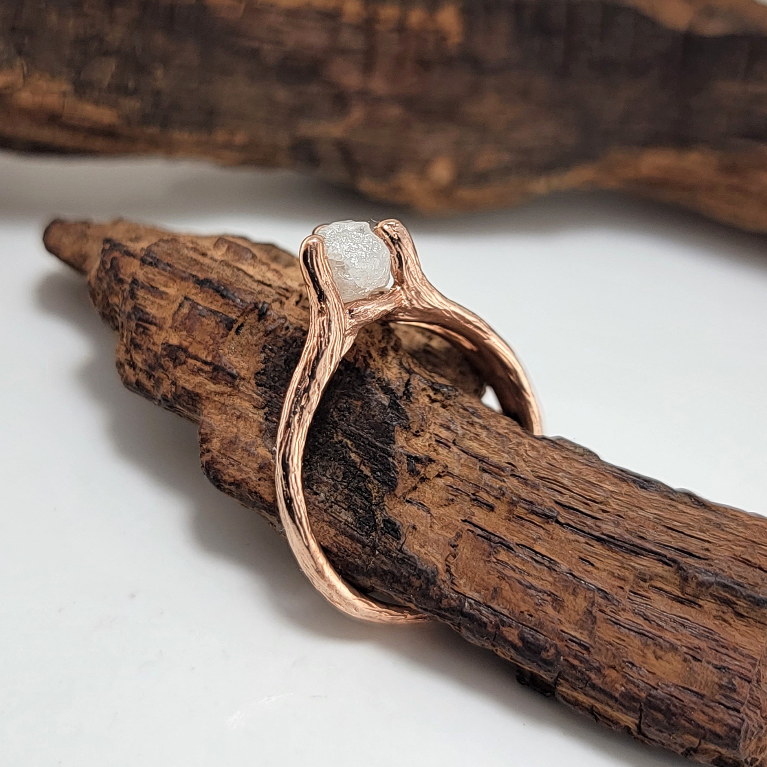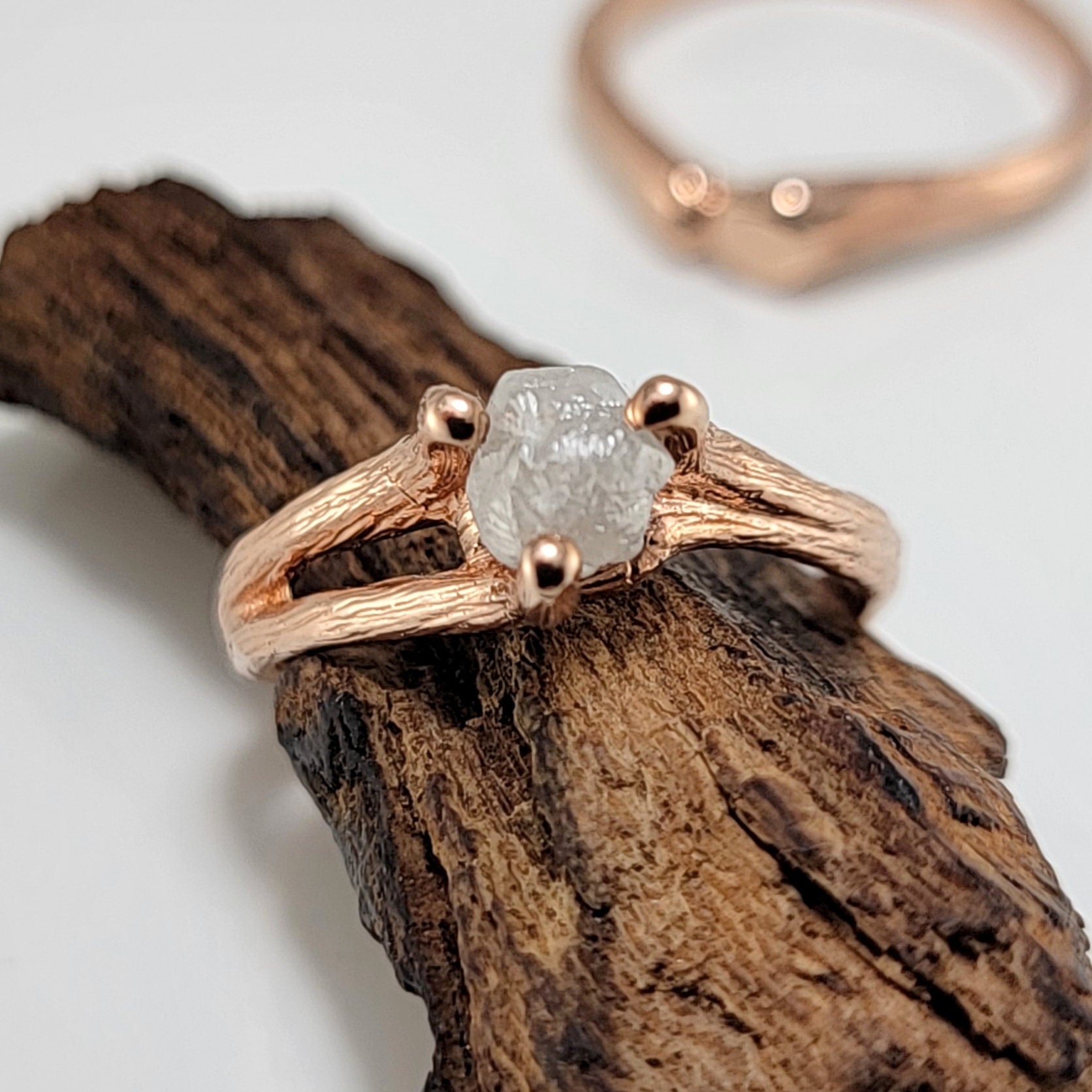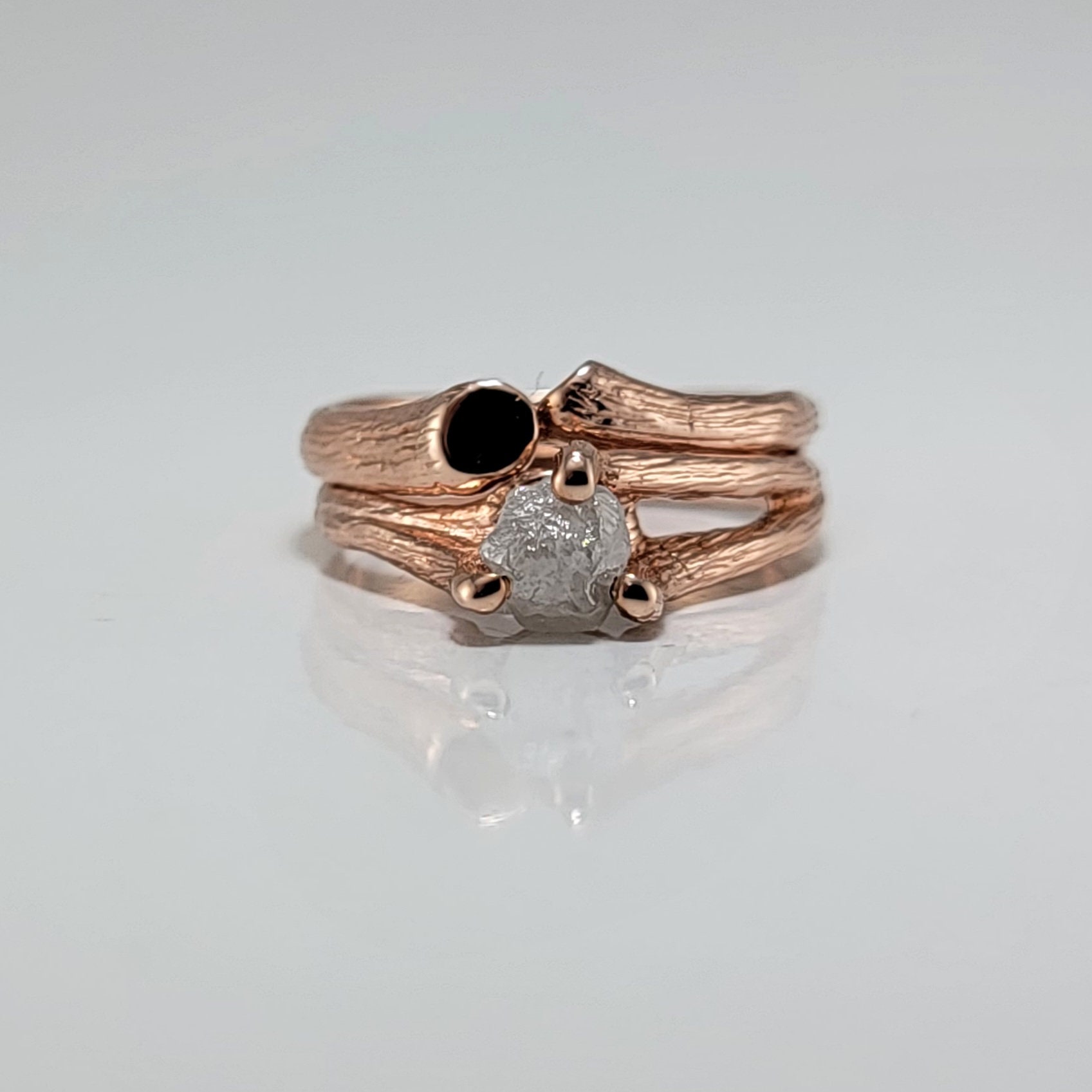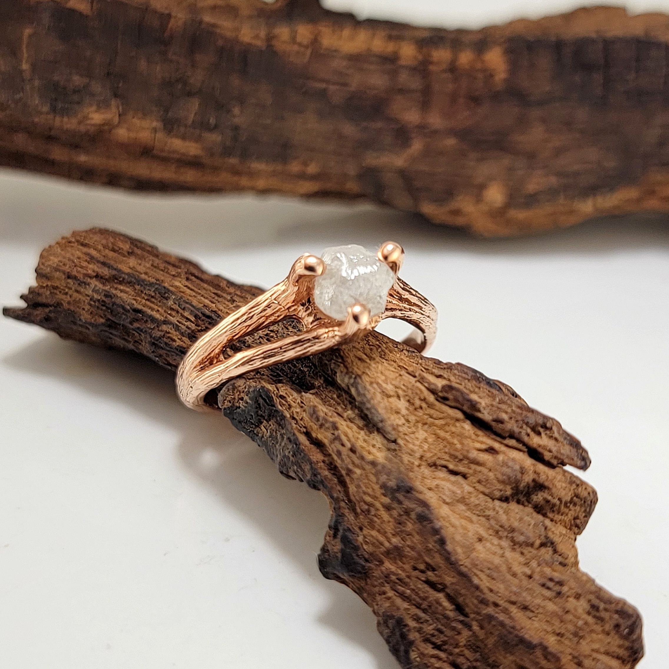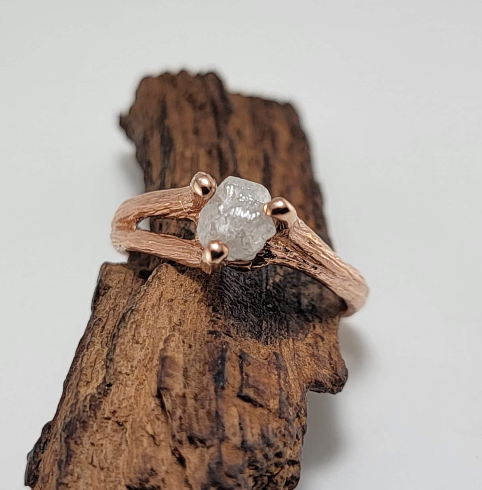 Rough Diamond Twig Engagement Ring in Solid Gold with Split Twig Wedding Band