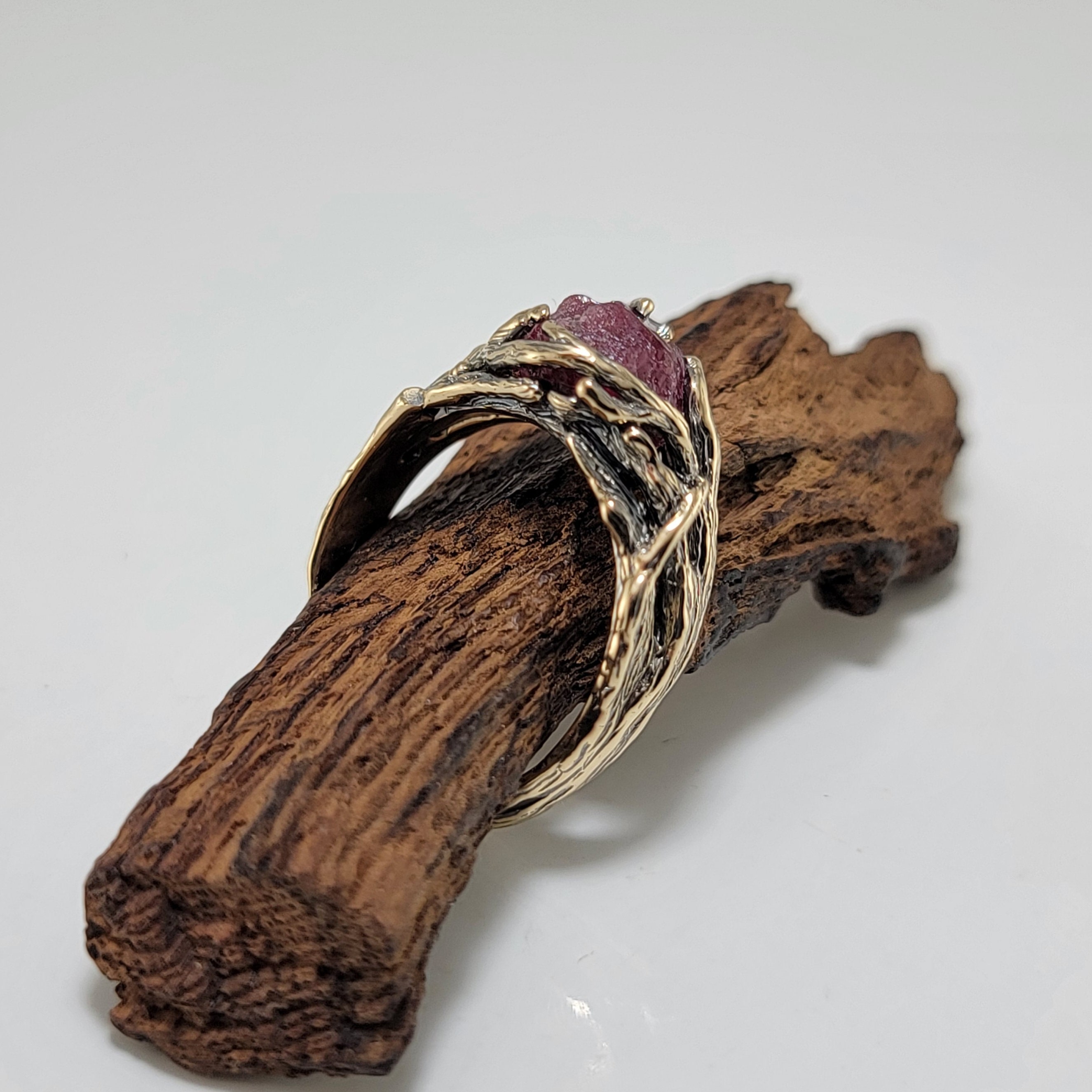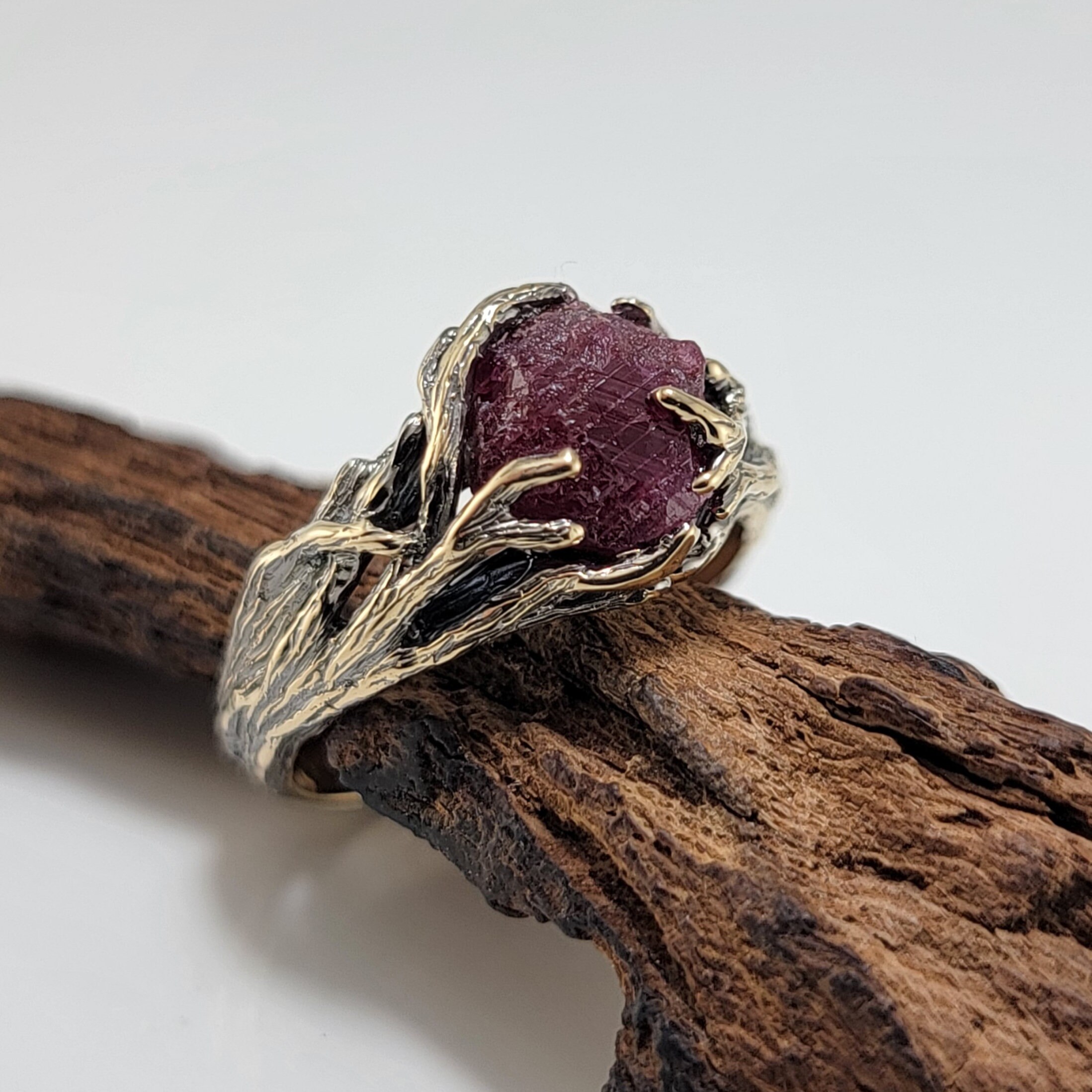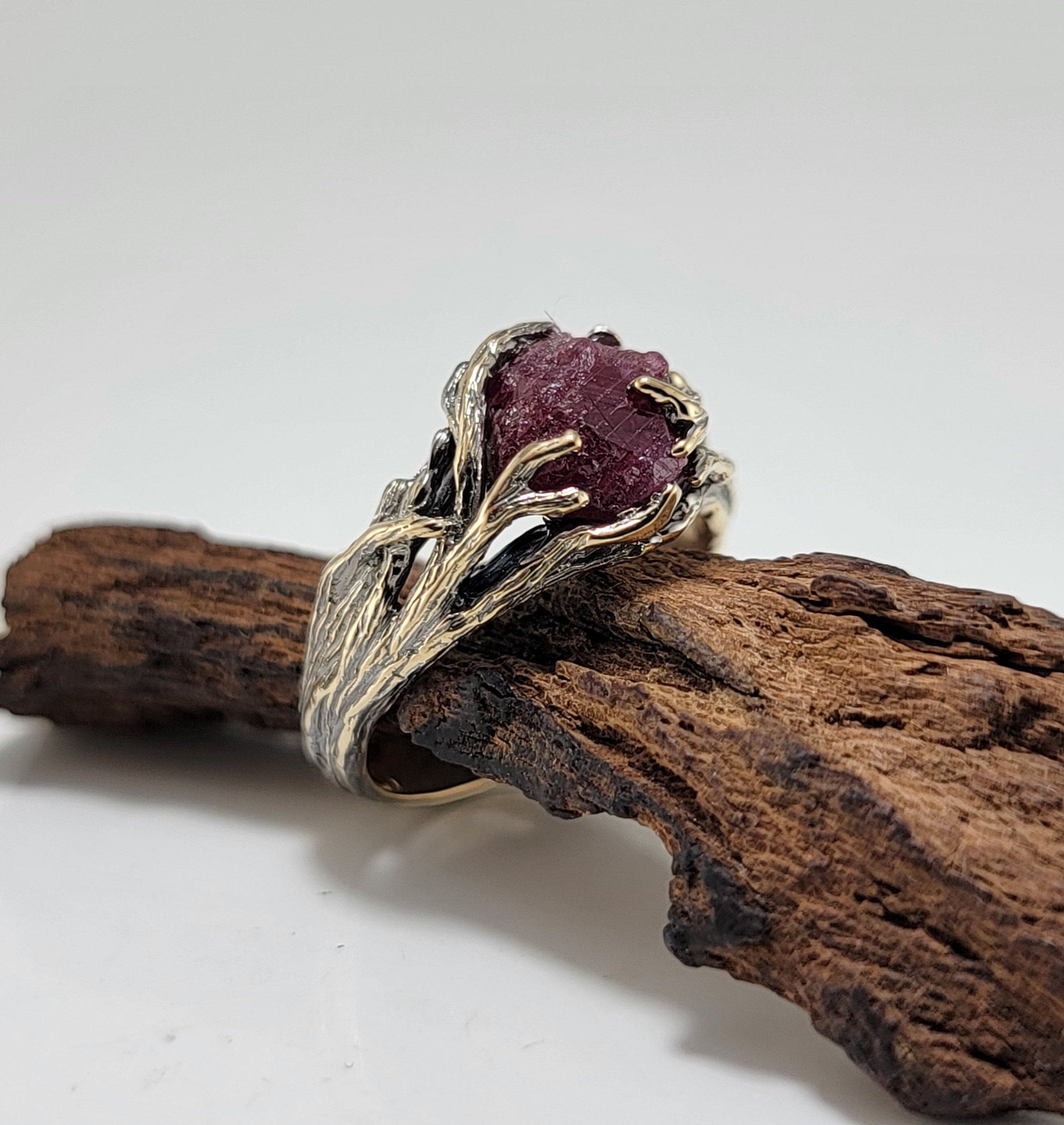 About the Stones: These are Winza Ruby Crystals from Tanzania. They are considered facetable and are unheated and untreated making them perfect for my process. Cast-in-Place, is a process where the ruby, sapphire or rough diamond are cast in place. My wax design that I have sculpted around the stone is replaced with 14k or 18k solid gold, creating an extremely durable setting.
