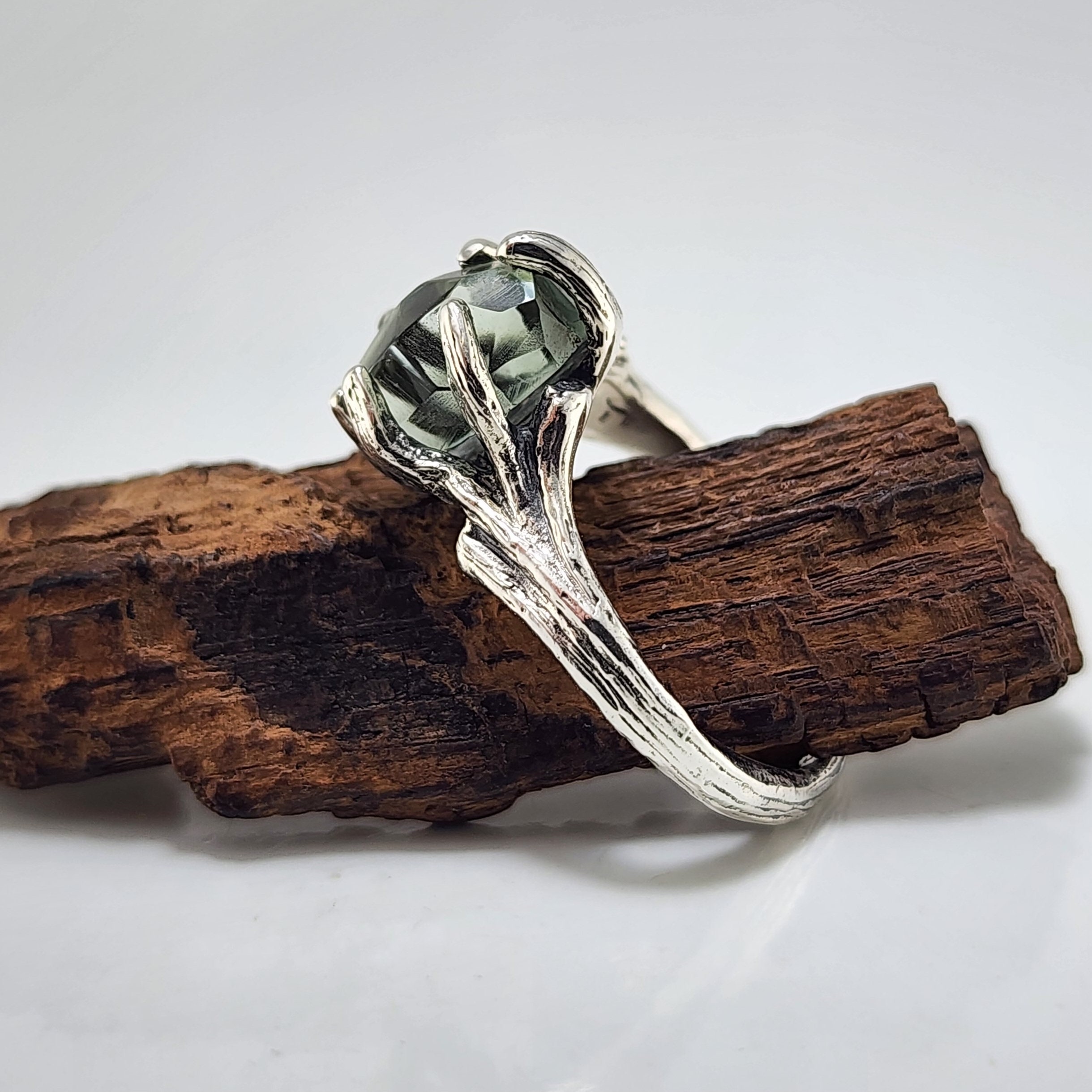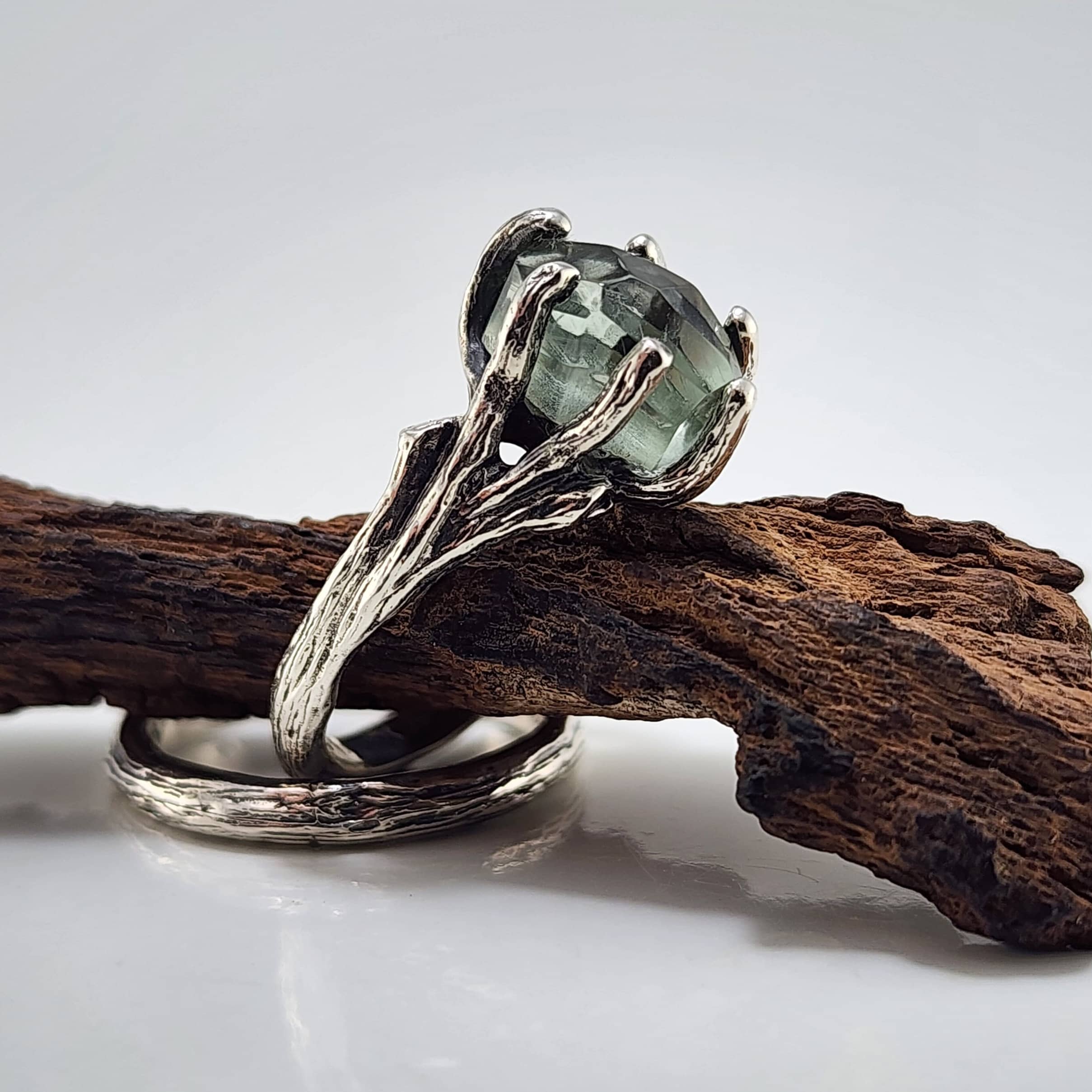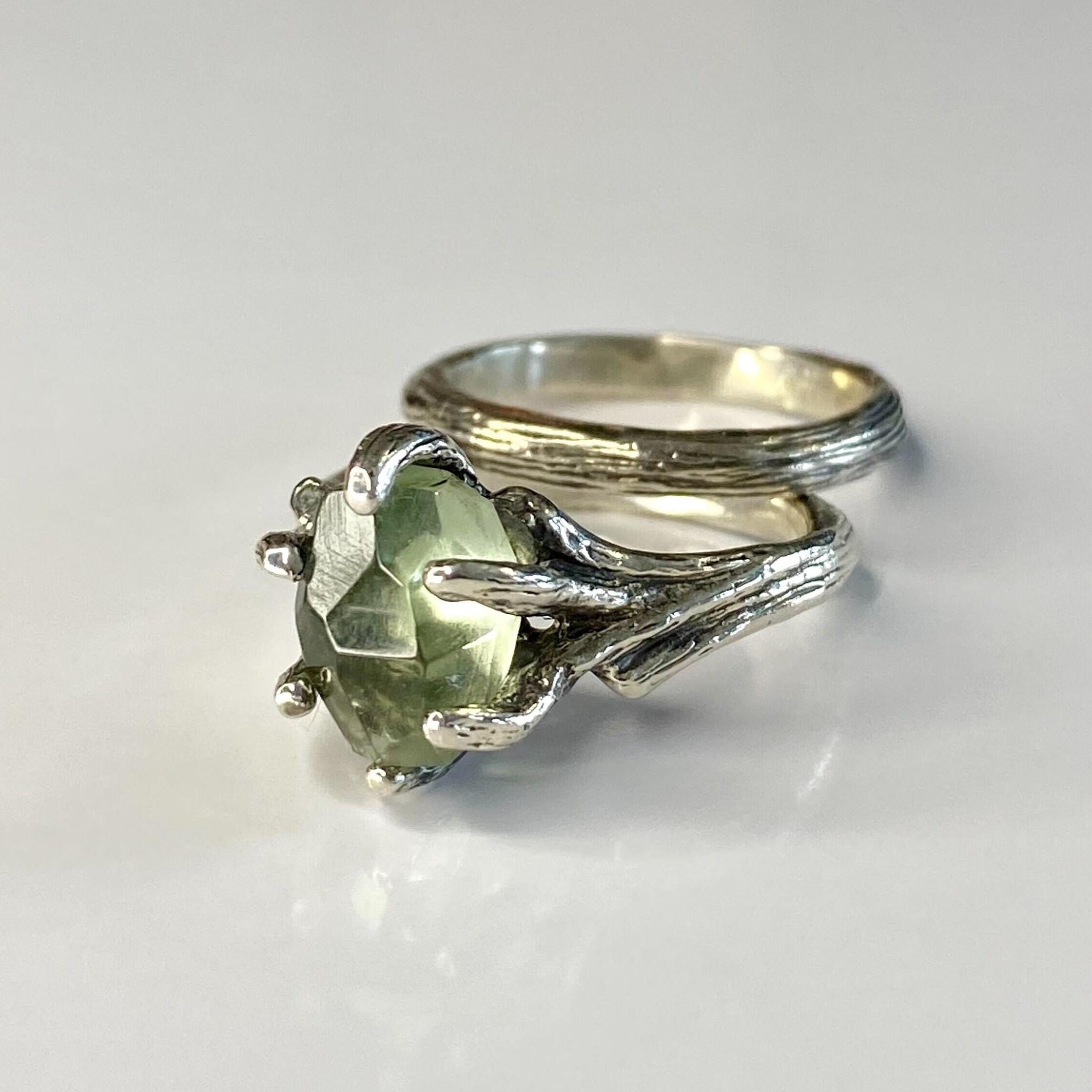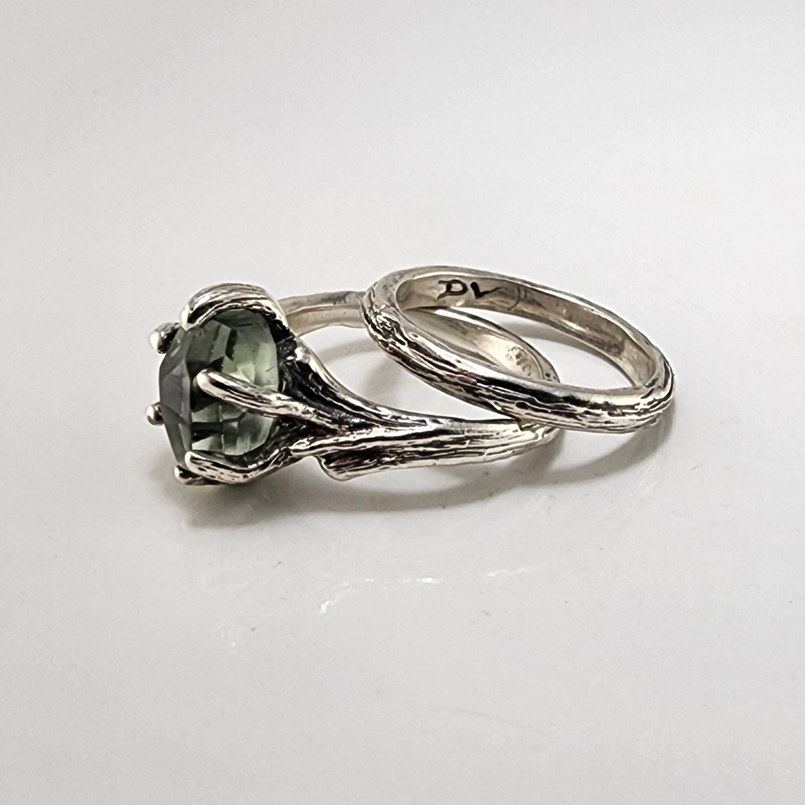 Green Amethyst Sterling Silver Engagement Ring Nature Inspired Set by DV Designs