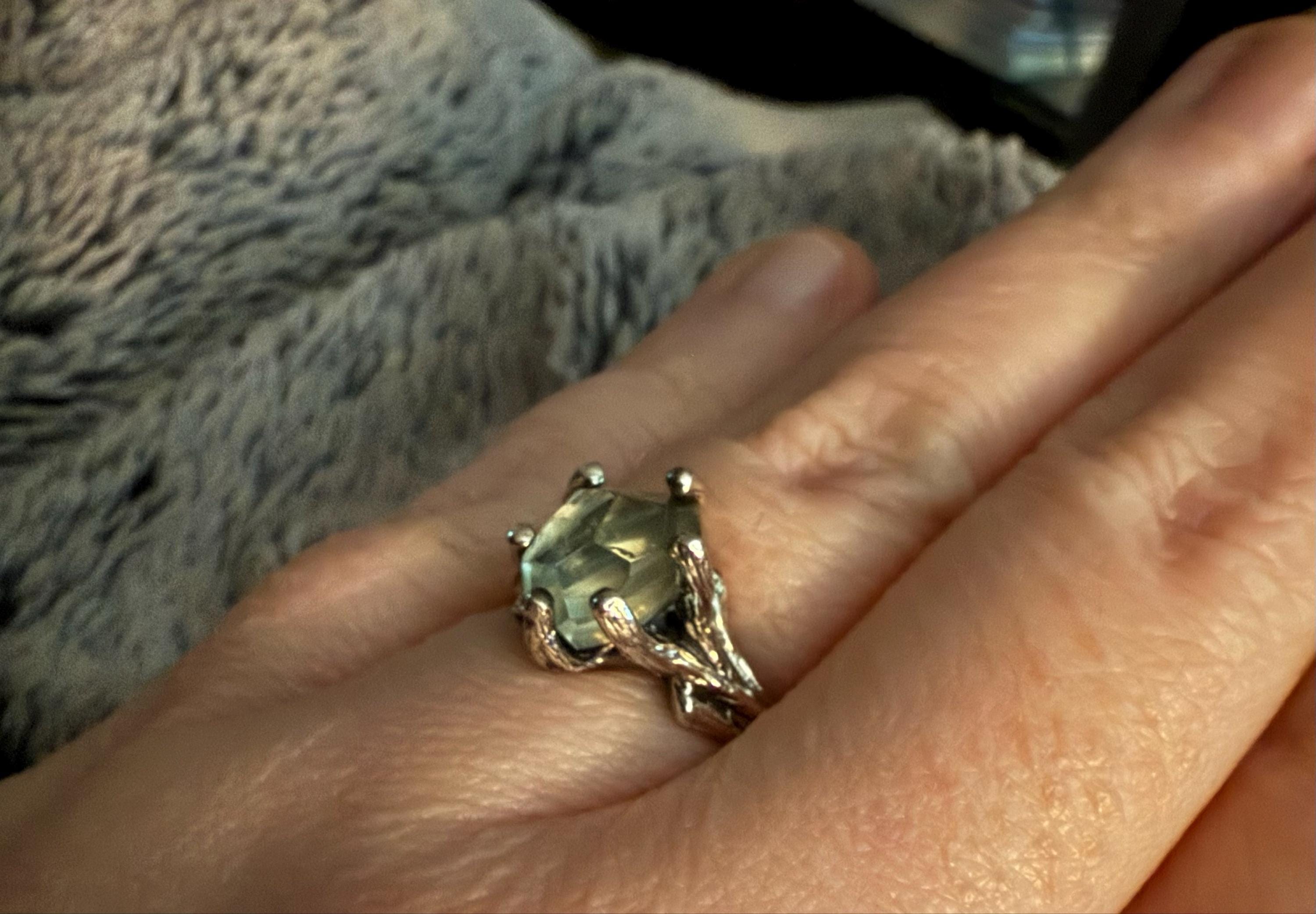 Excellent customer service! Fast shipping because seller stayed on top of it. Beautiful big green amethyst and the setting is creative with branches for a natural feel. Perfect weight and fits like it’s not even there. Really comfortable. Highly recommend this shop and seller! Thank you again, I’ll be back for sure!