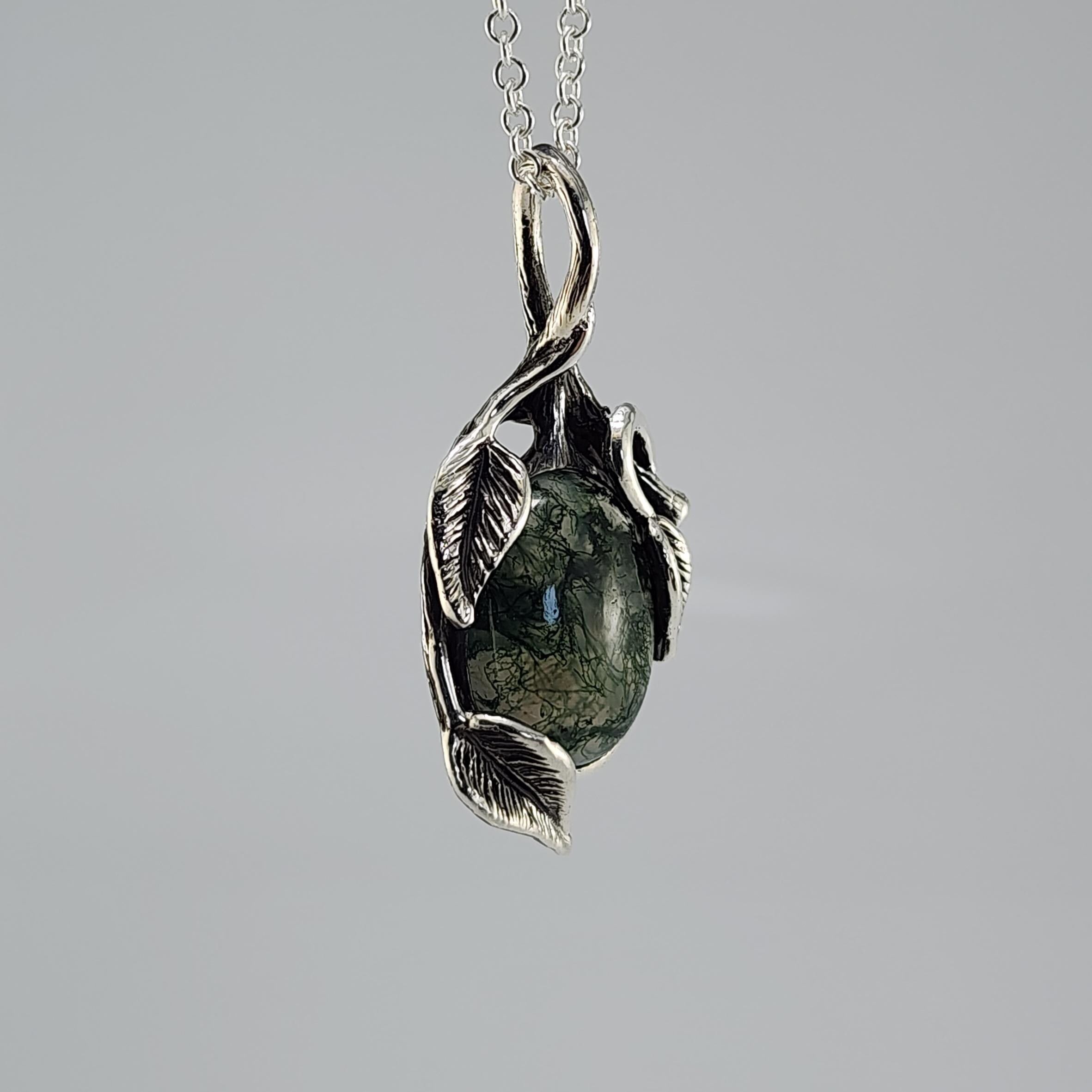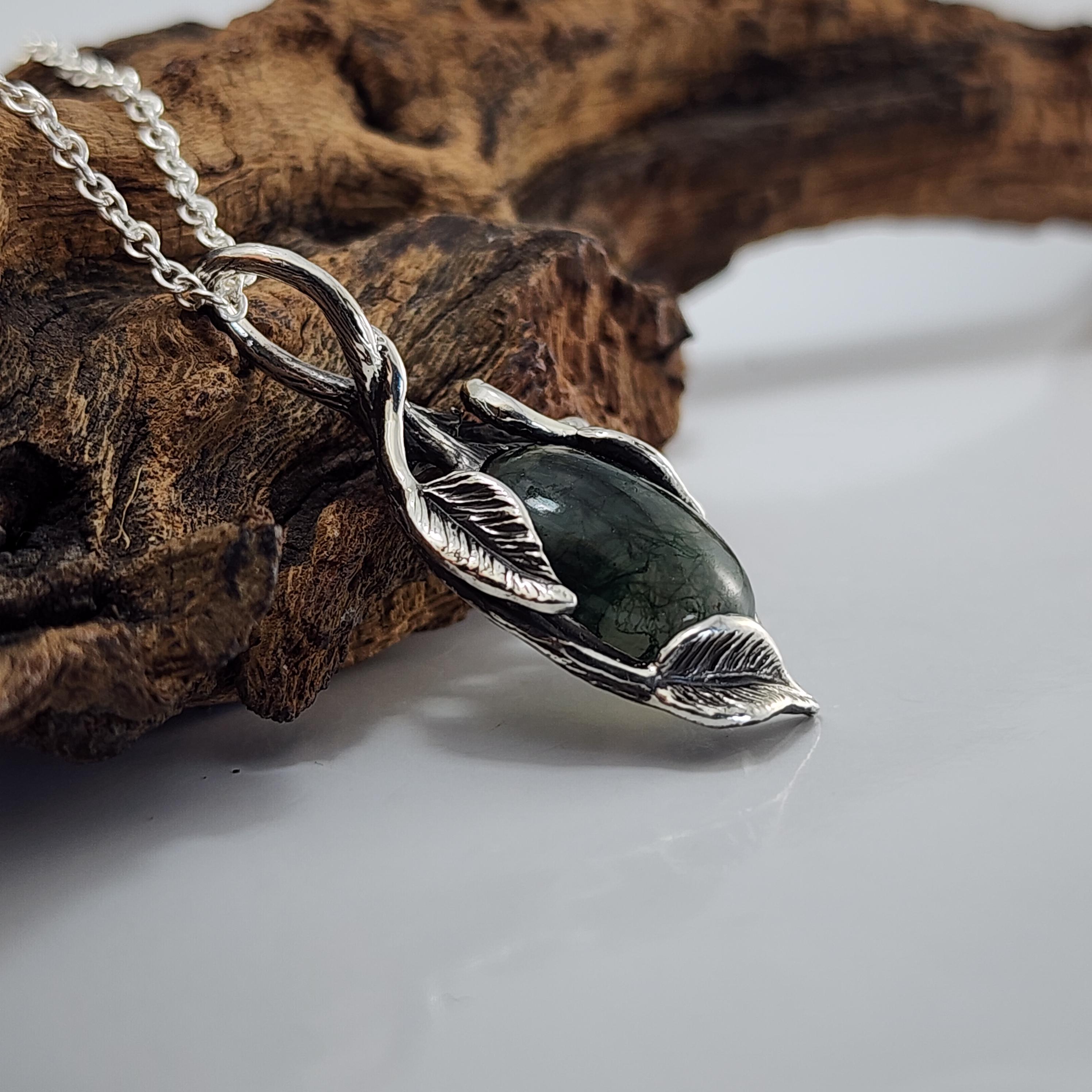 Hand-sculpted Leaf Pendant surrounding a beautiful Moss Agate gemstone. Embrace the natural beauty of our Moss Agate Cabochon Leaf Style Pendant, a heartfelt choice for bridesmaid gifts that showcases stunning earthy tones in each unique stone. Crafted with genuine sterling silver, this elegant silver necklace not only complements any outfit but also serves as a meaningful token of appreciation—make your choice today and let them carry a piece of nature close to their heart.