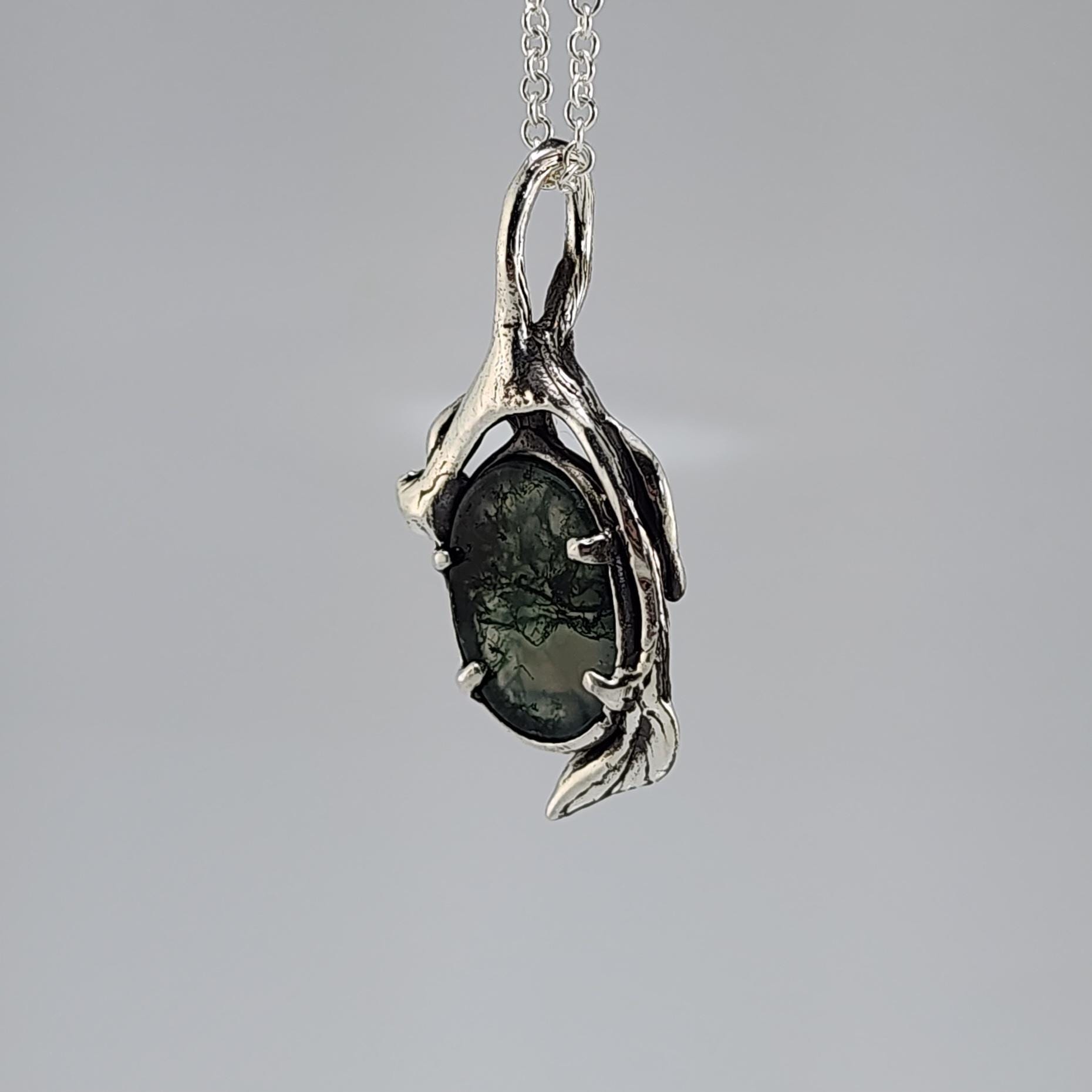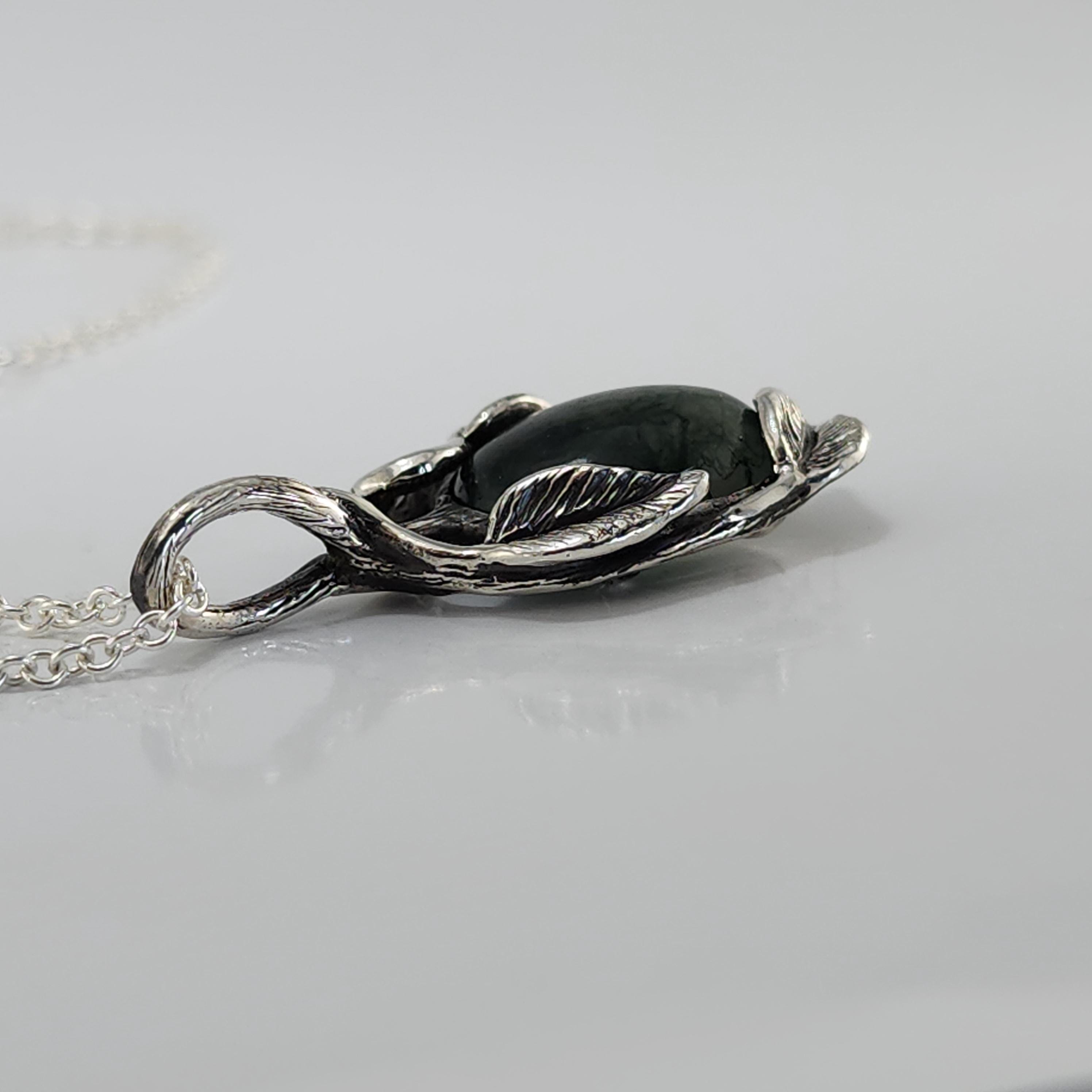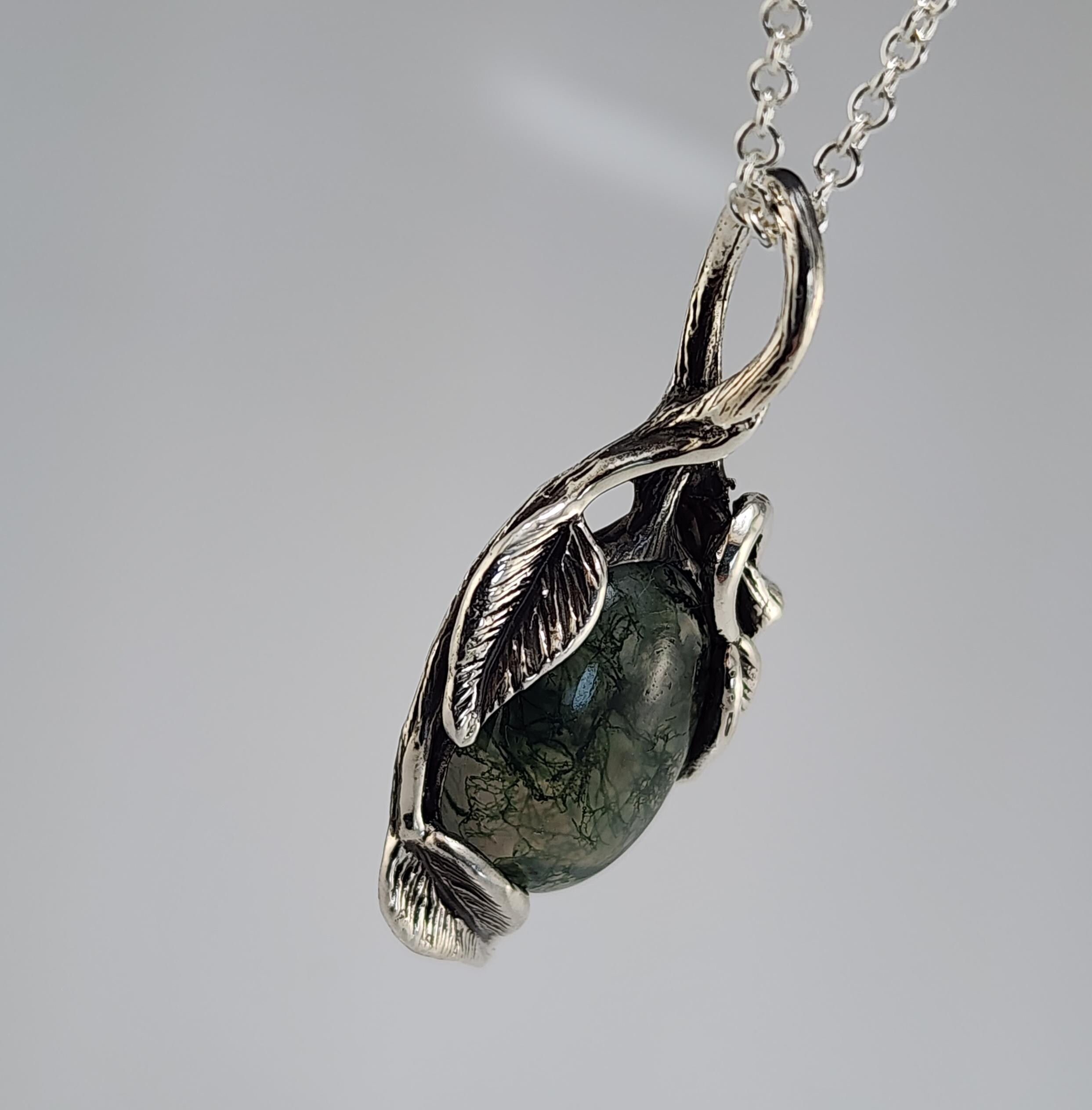 Add a touch of nature-inspired elegance to your look with this stunning Moss Agate pendant. Handcrafted in sterling silver, this leaf and twig style necklace is the perfect accessory for nature lovers. Makes a unique and meaningful gift by DV Jewelry Designs.