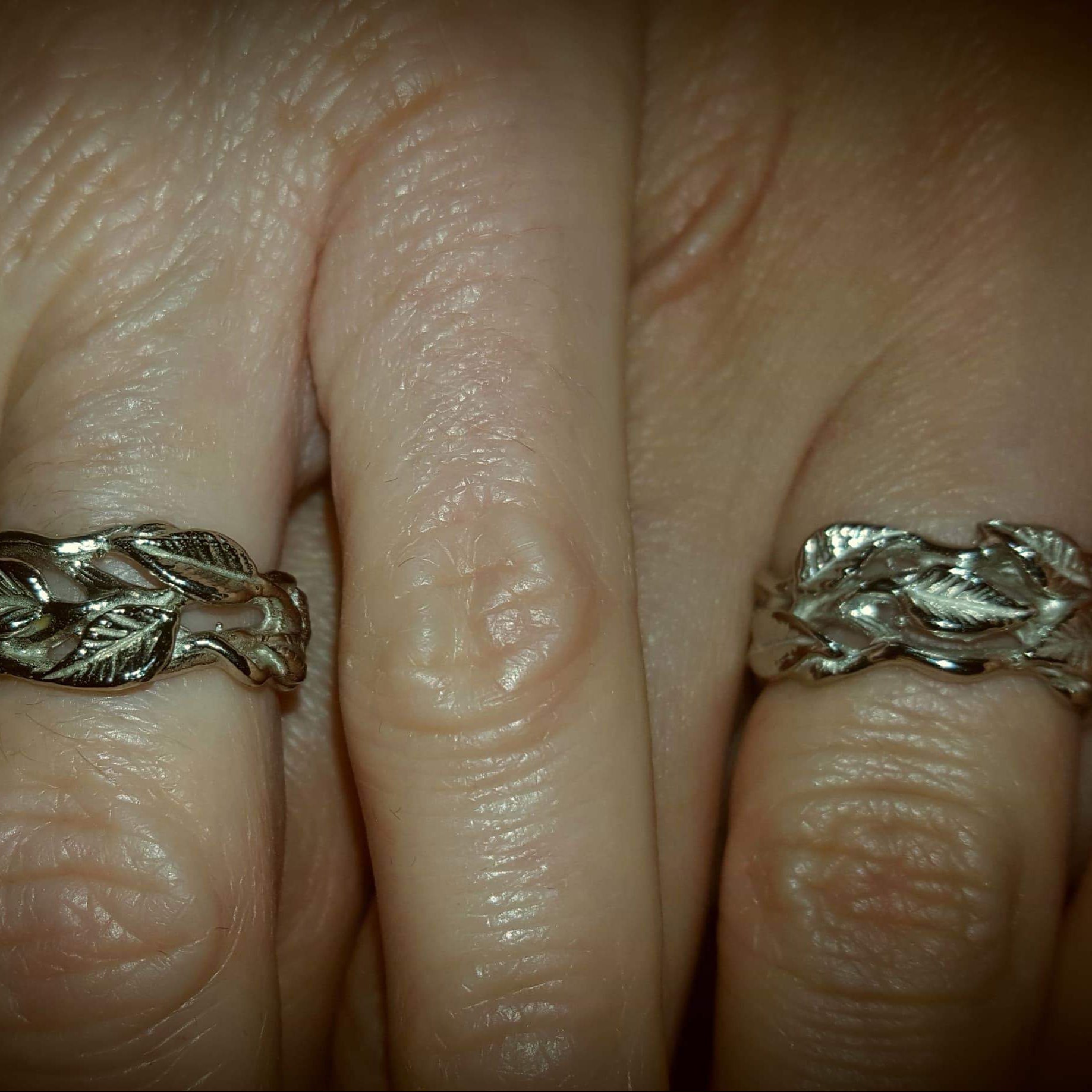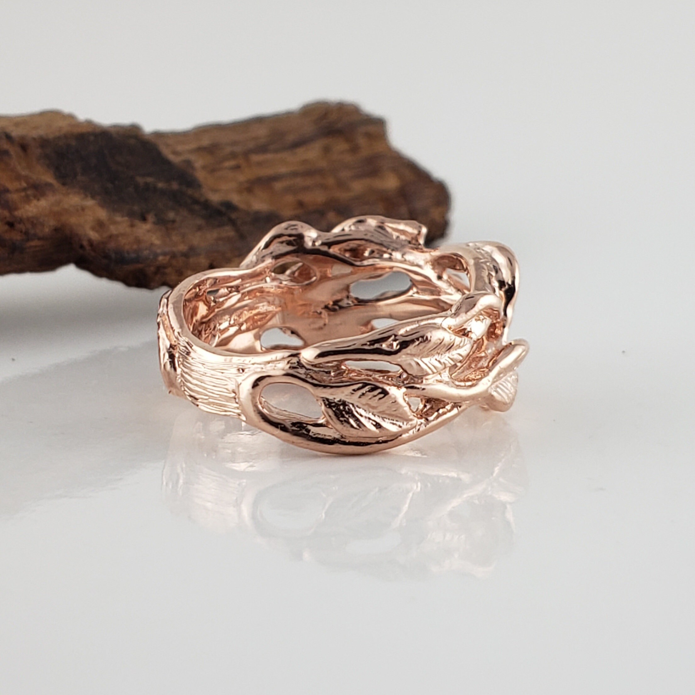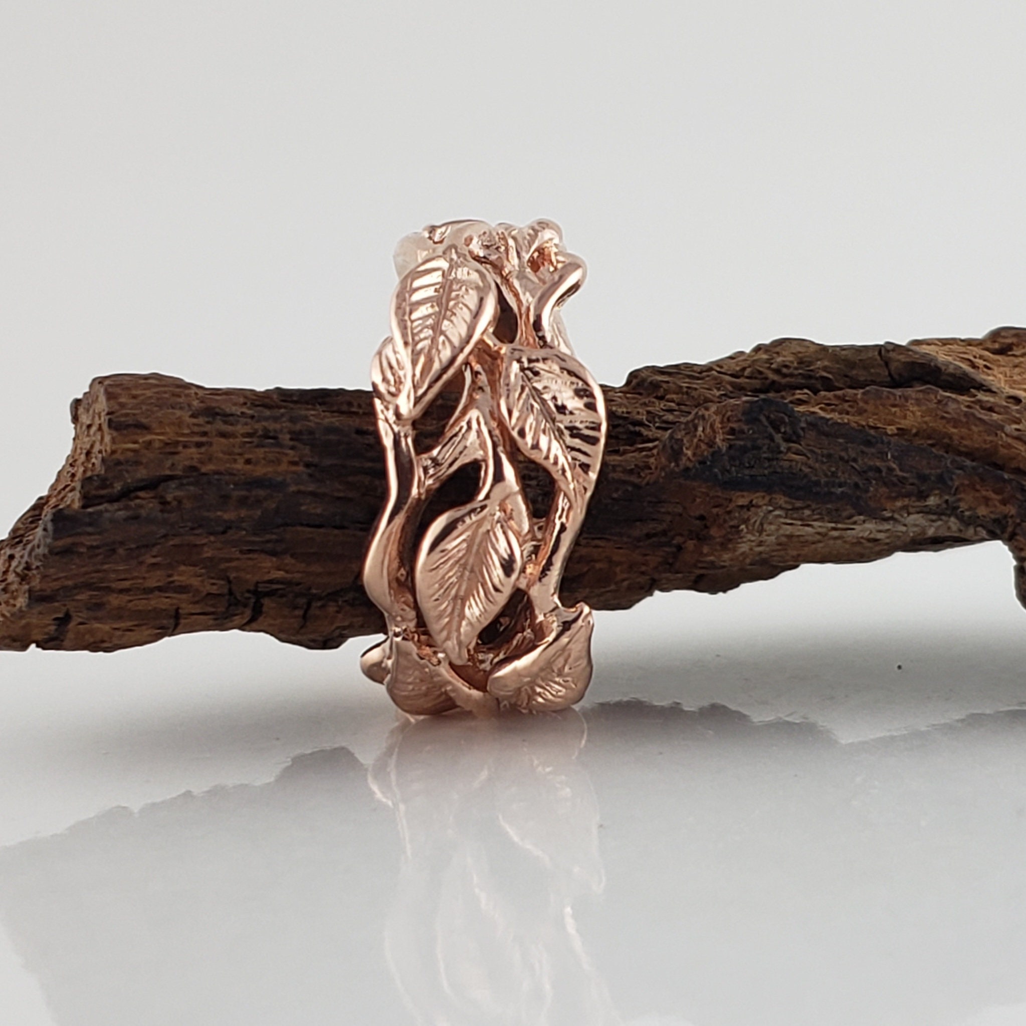 I wanted to create a beautiful Twig and Leaf Band, so I sculpted the stems first and then added eight beautiful natural flowing leaves. Similar to the original Leaf and Twig Design, just a bit more weight and no twigs on the edge of the ring.