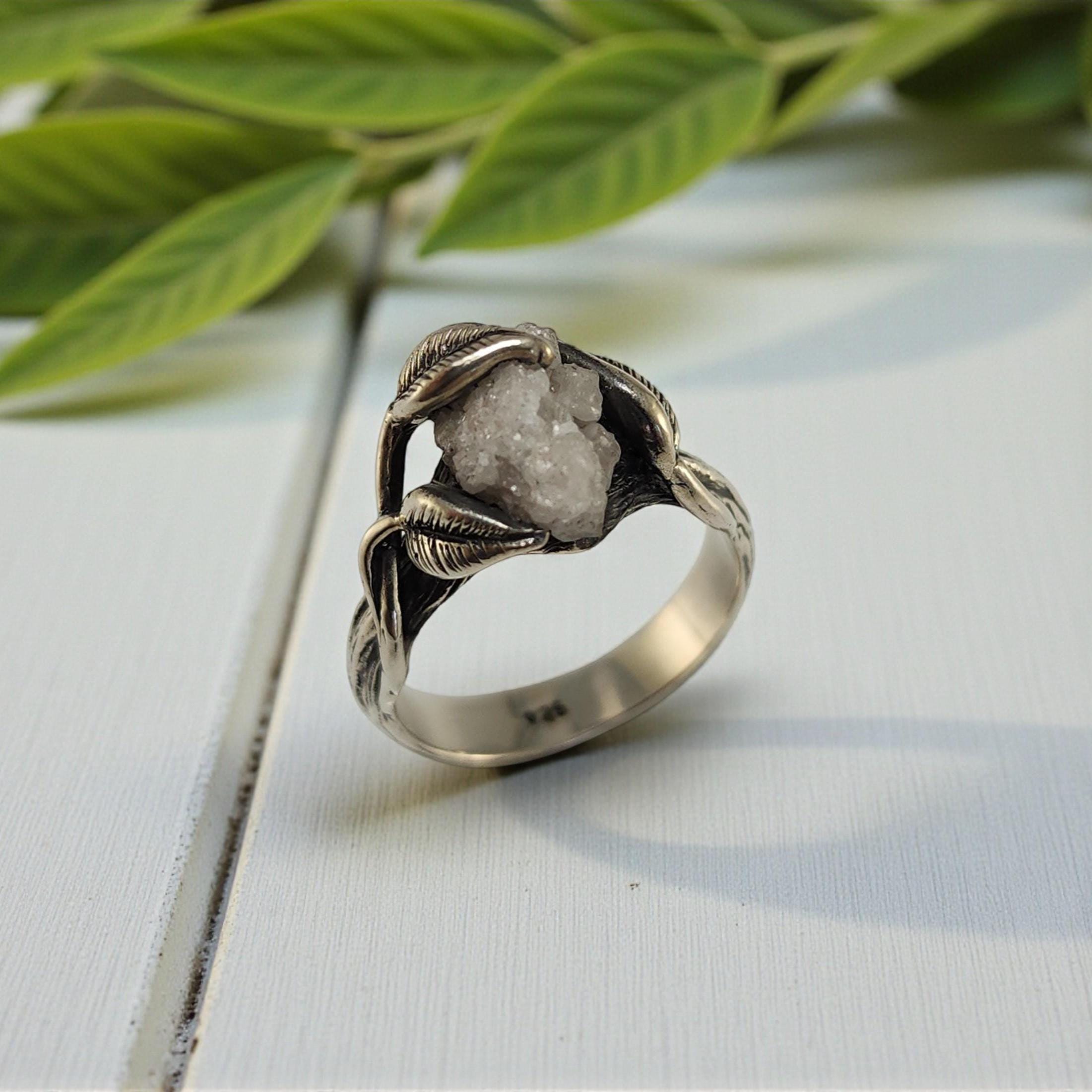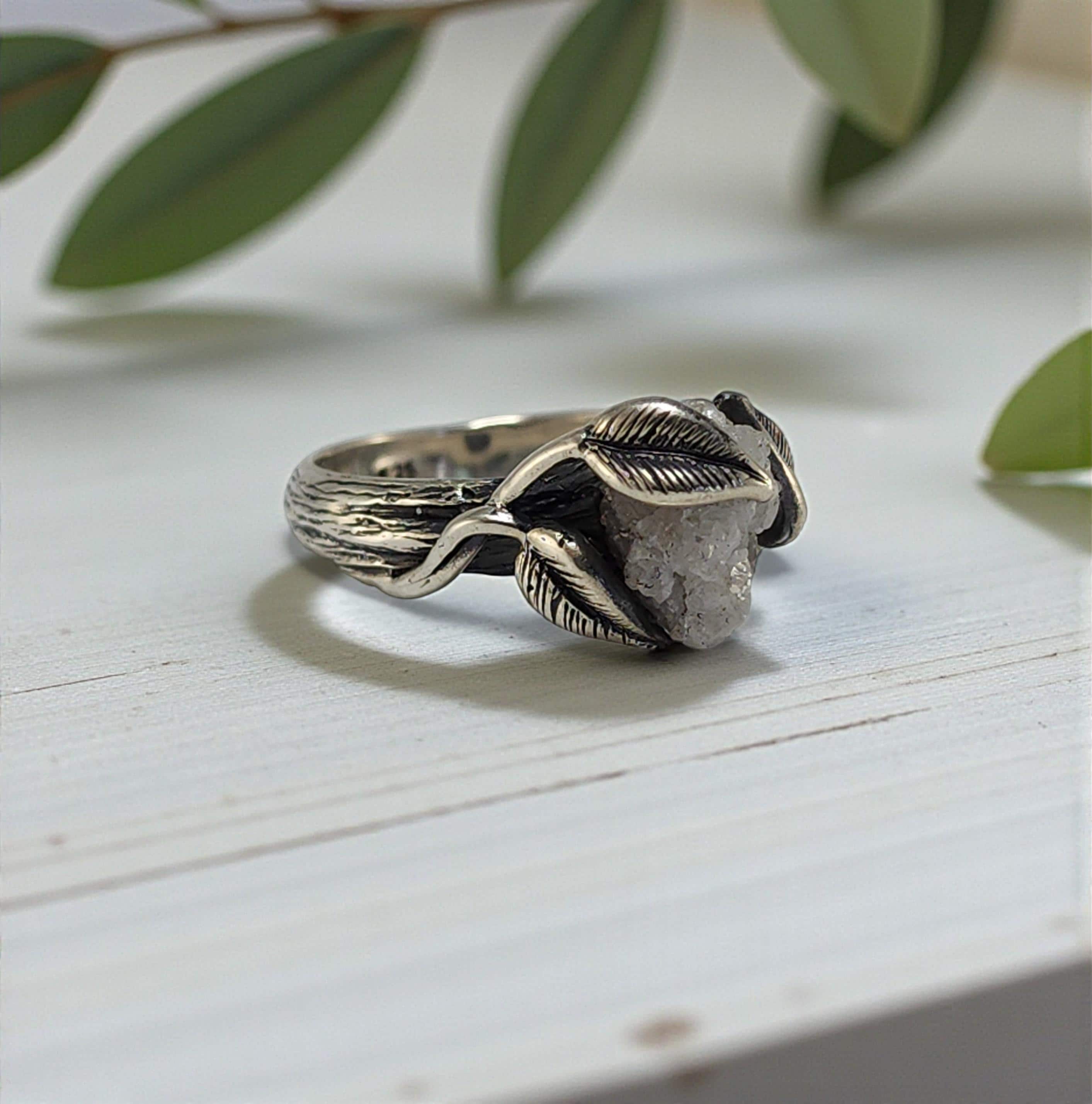 Hand-sculpted, One-of-a-kind beautiful raw rough diamond engagement ring with twig and leaf detail.