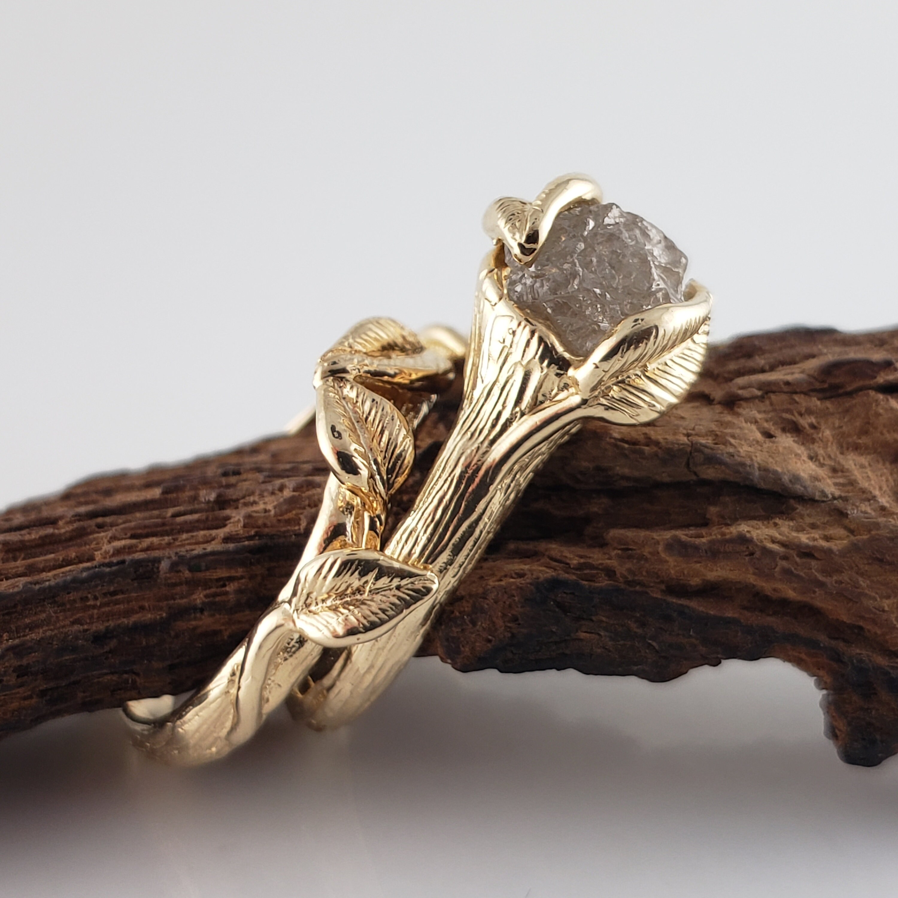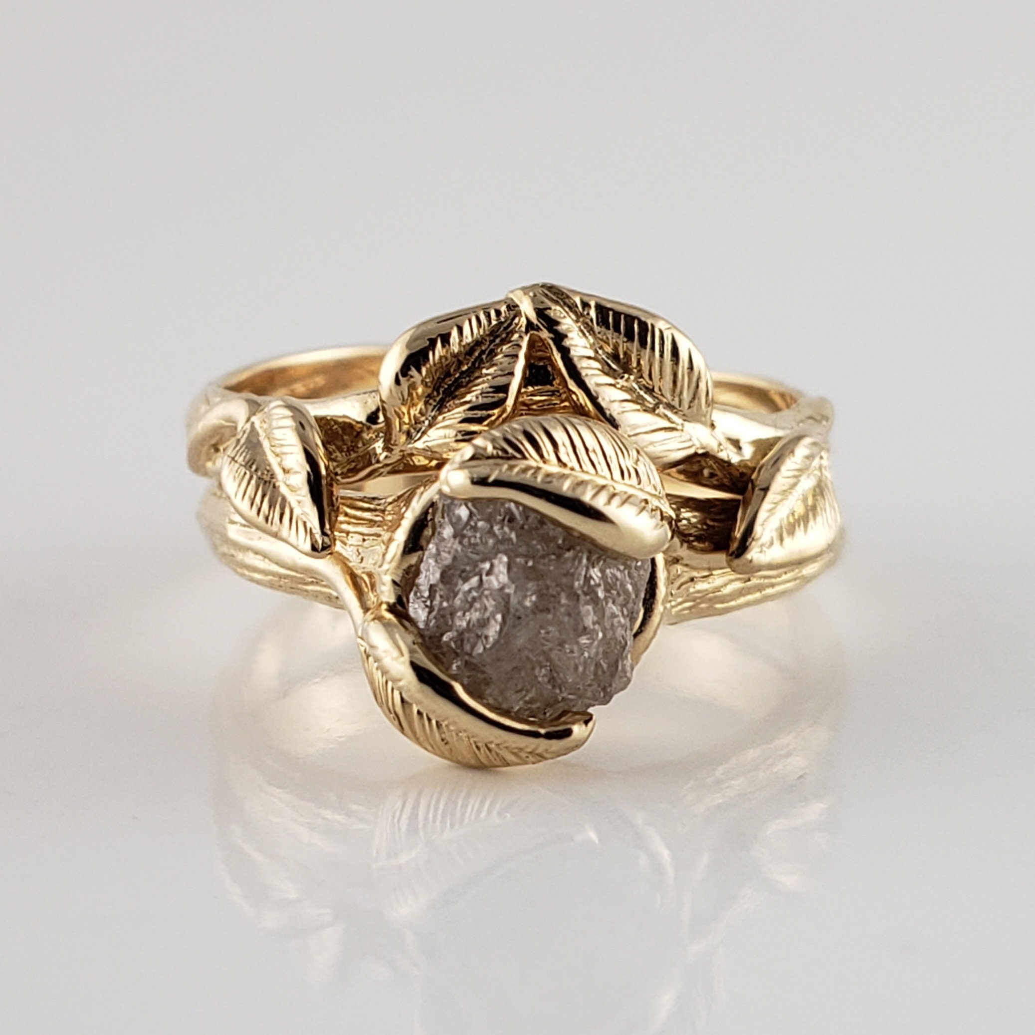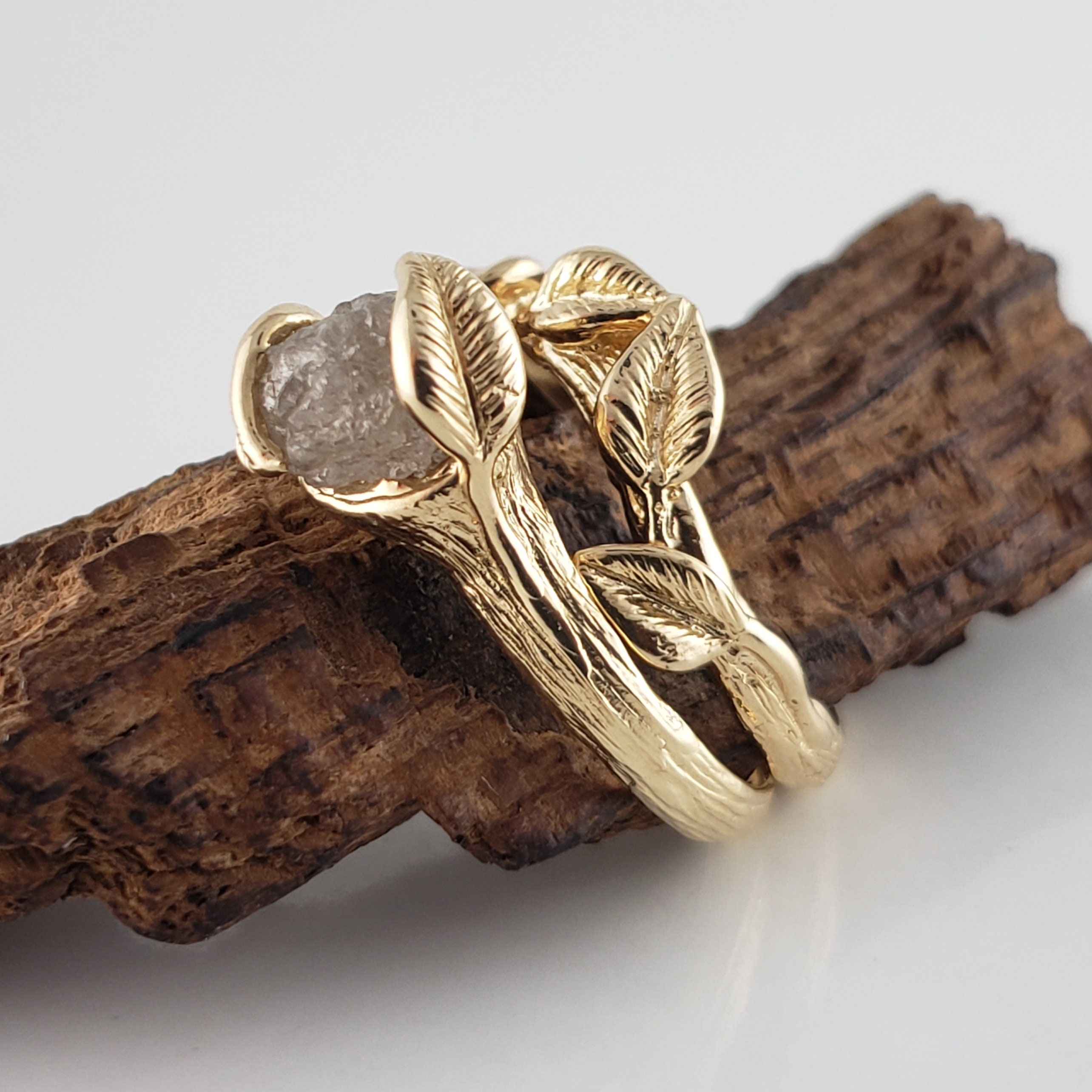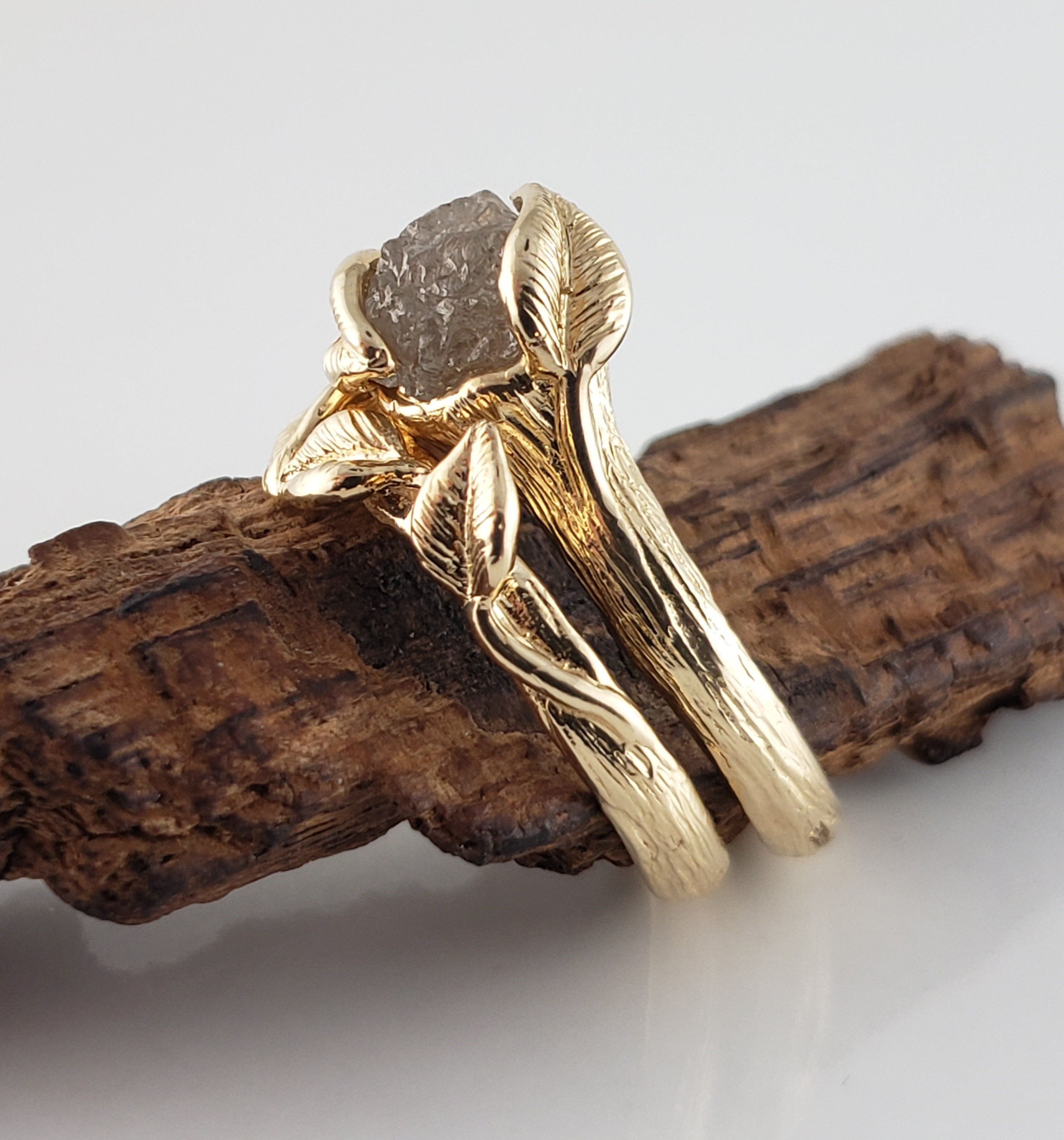 Rough Diamond Leaf Bridal Set in Solid Gold, Engagement Ring by DV Jewelry Designs