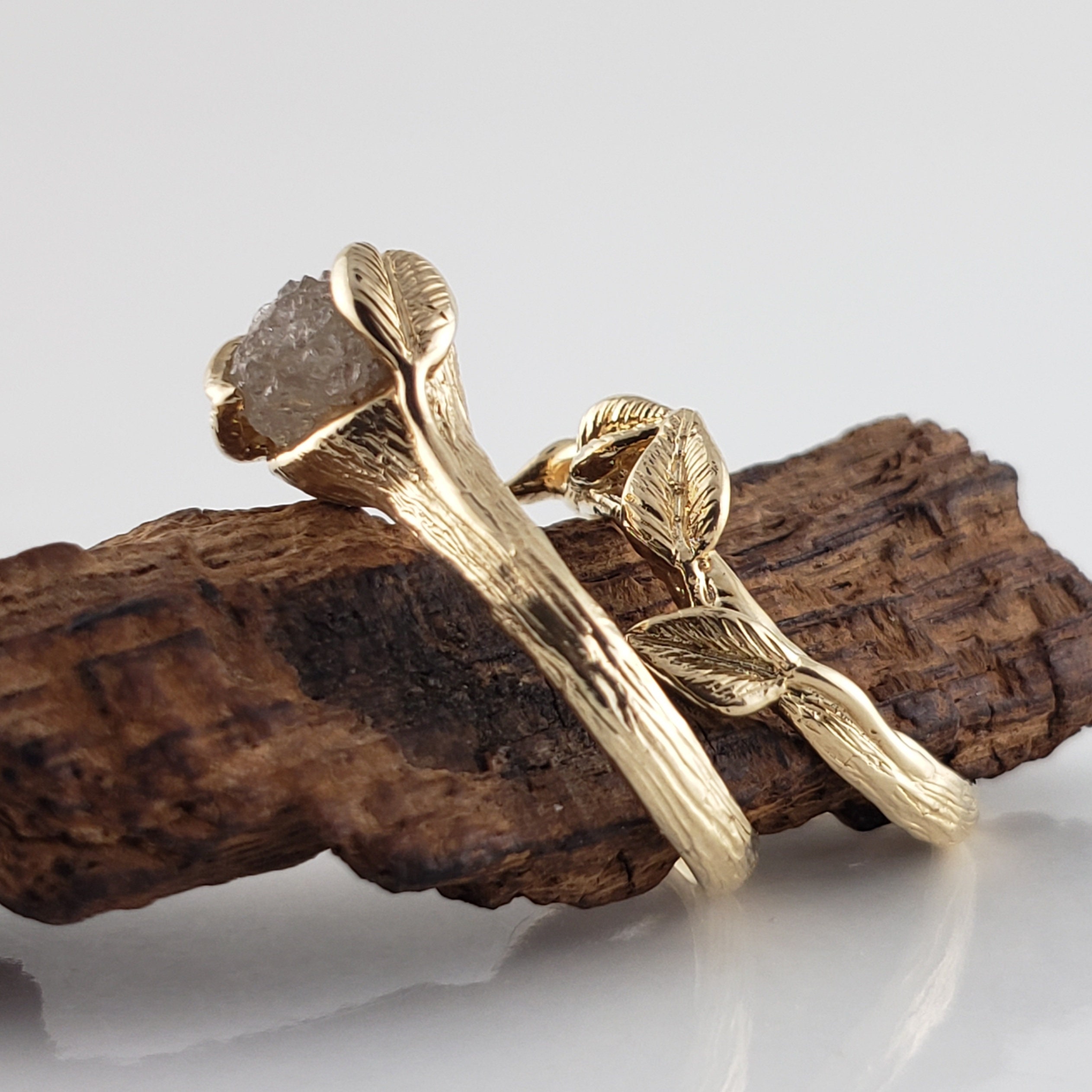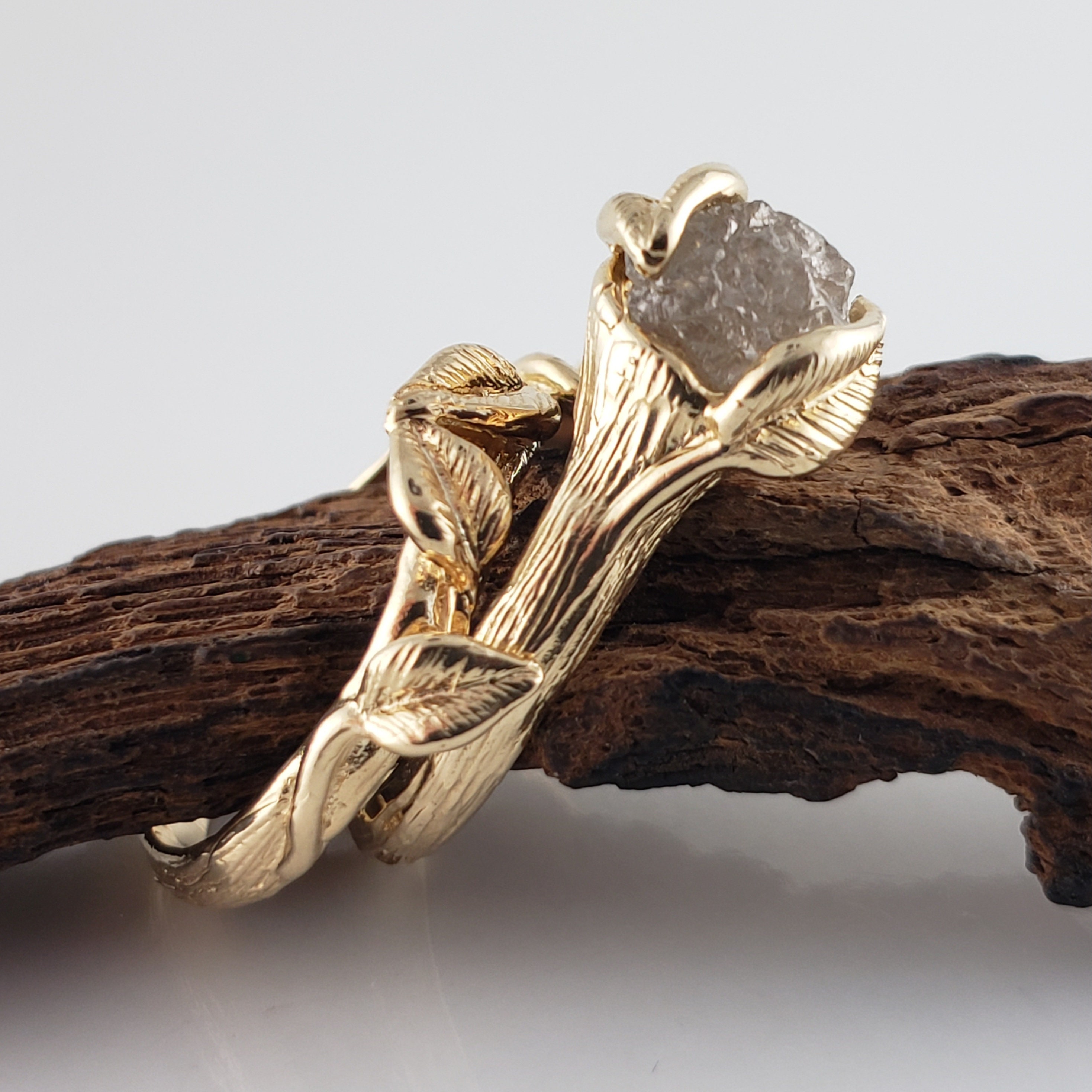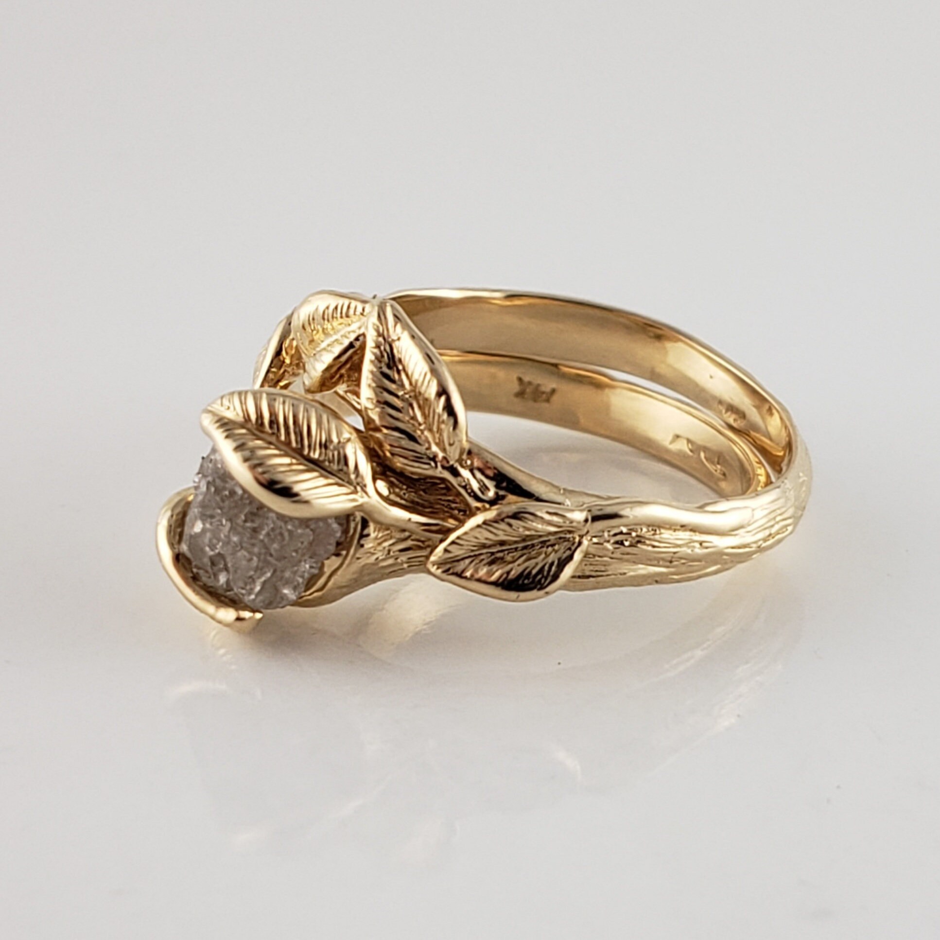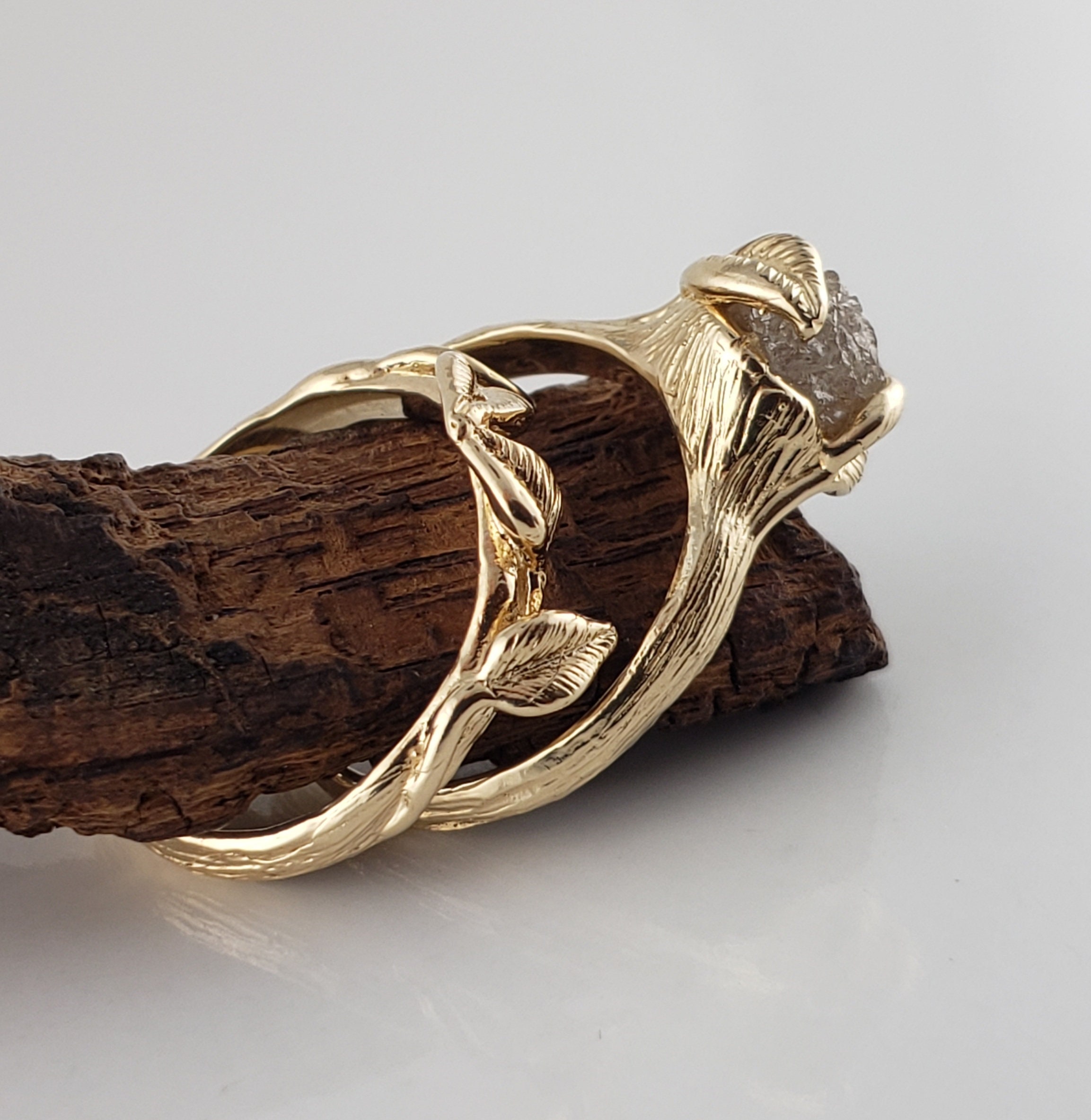 Rough Diamond Leaf Bridal Set in Solid Gold, Engagement Ring by DV Jewelry Designs