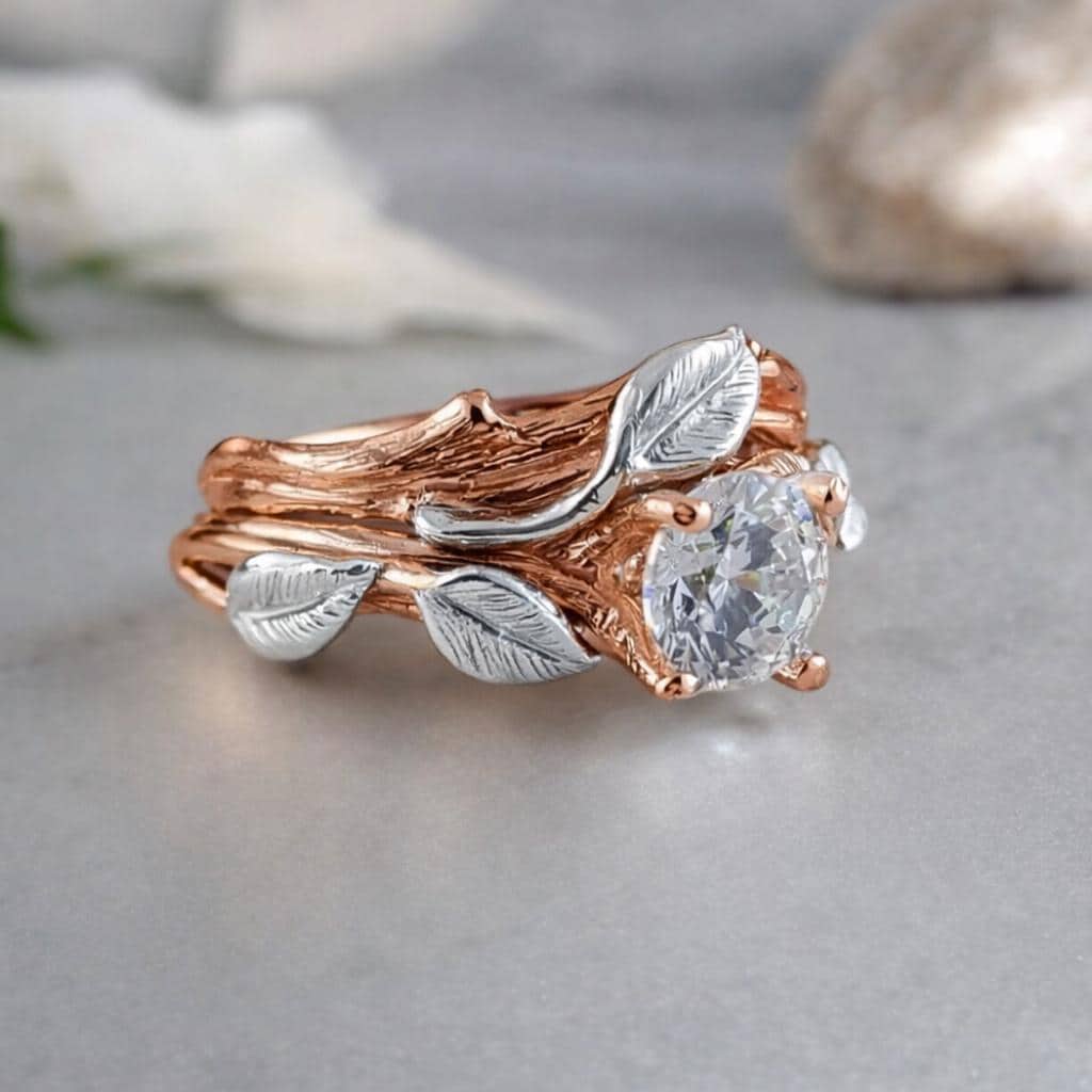 This listing is for two rings, a Moissanite leaf and twig solitaire with a matching twig band with a single leaf, as shown. These rings are shown in two-tone gold, 14k White Gold with 14k Rose Gold Leaves.