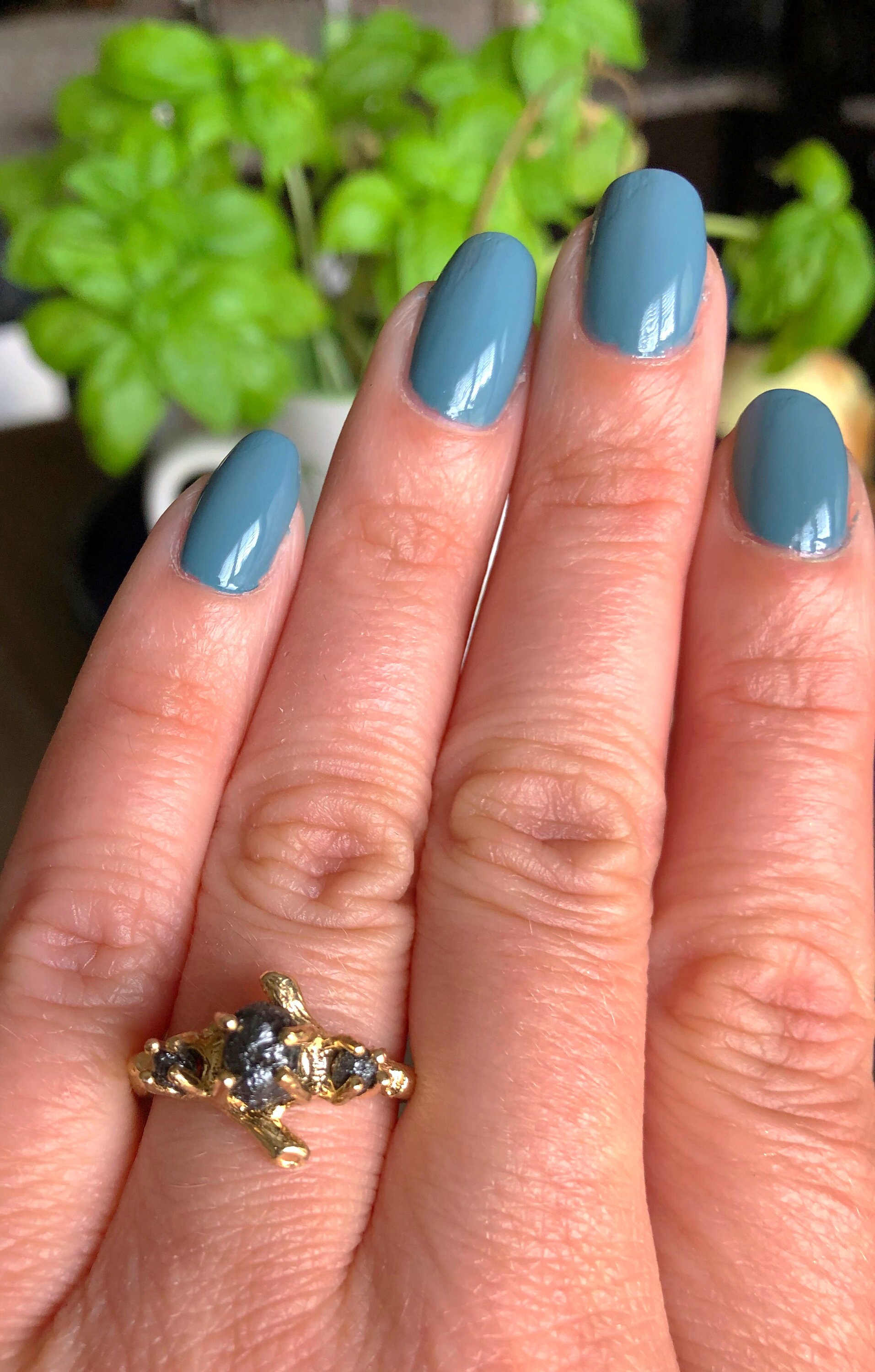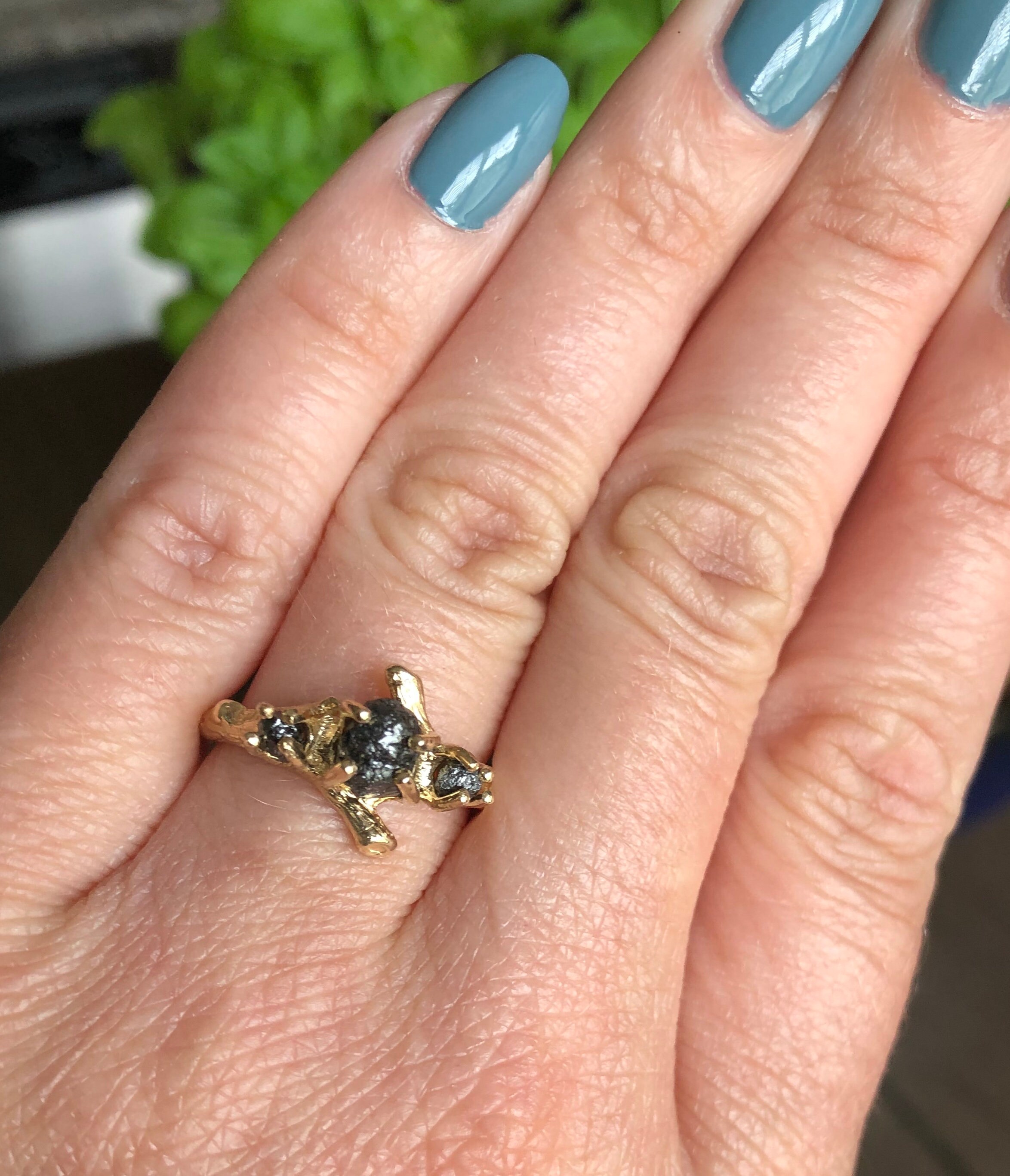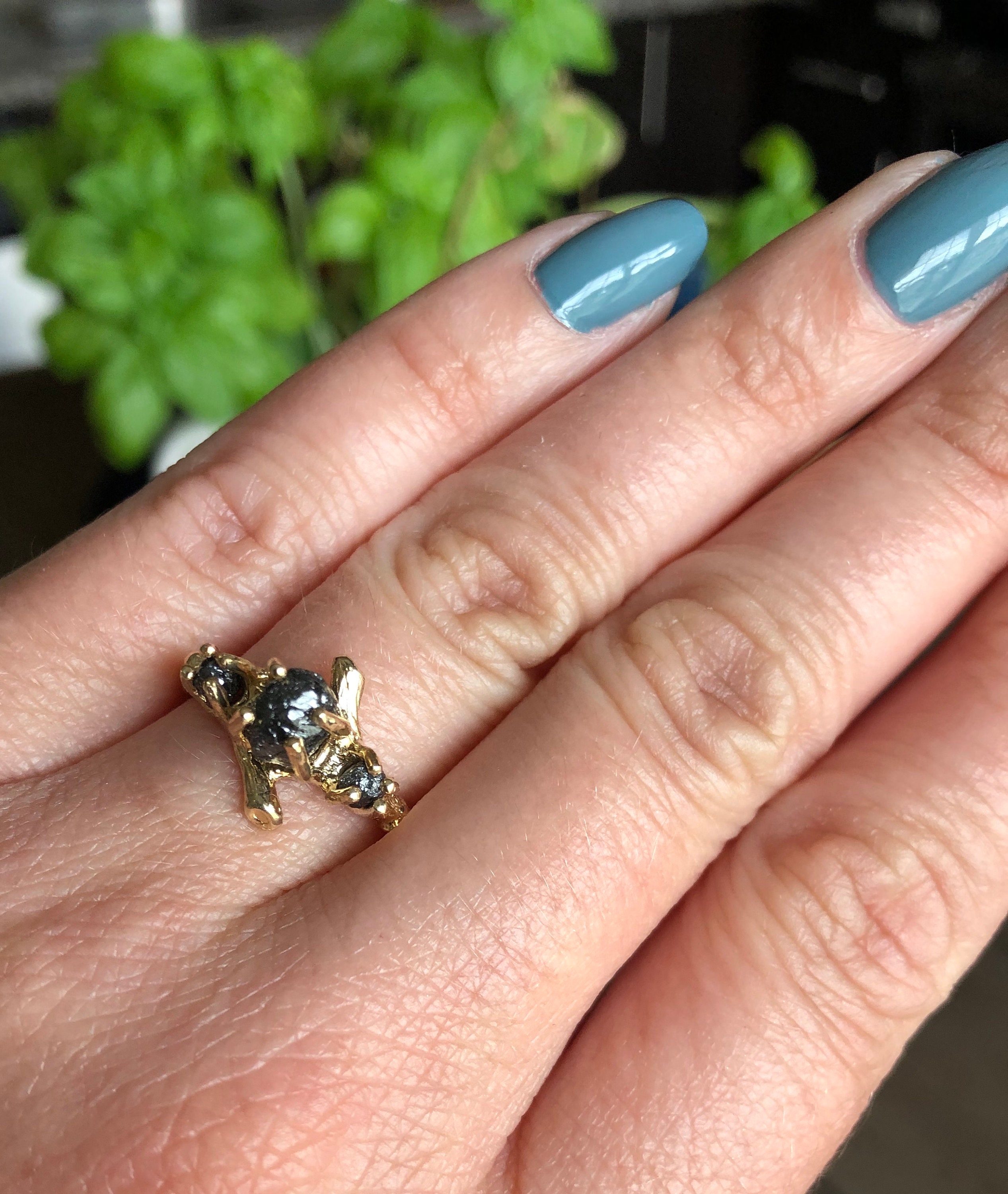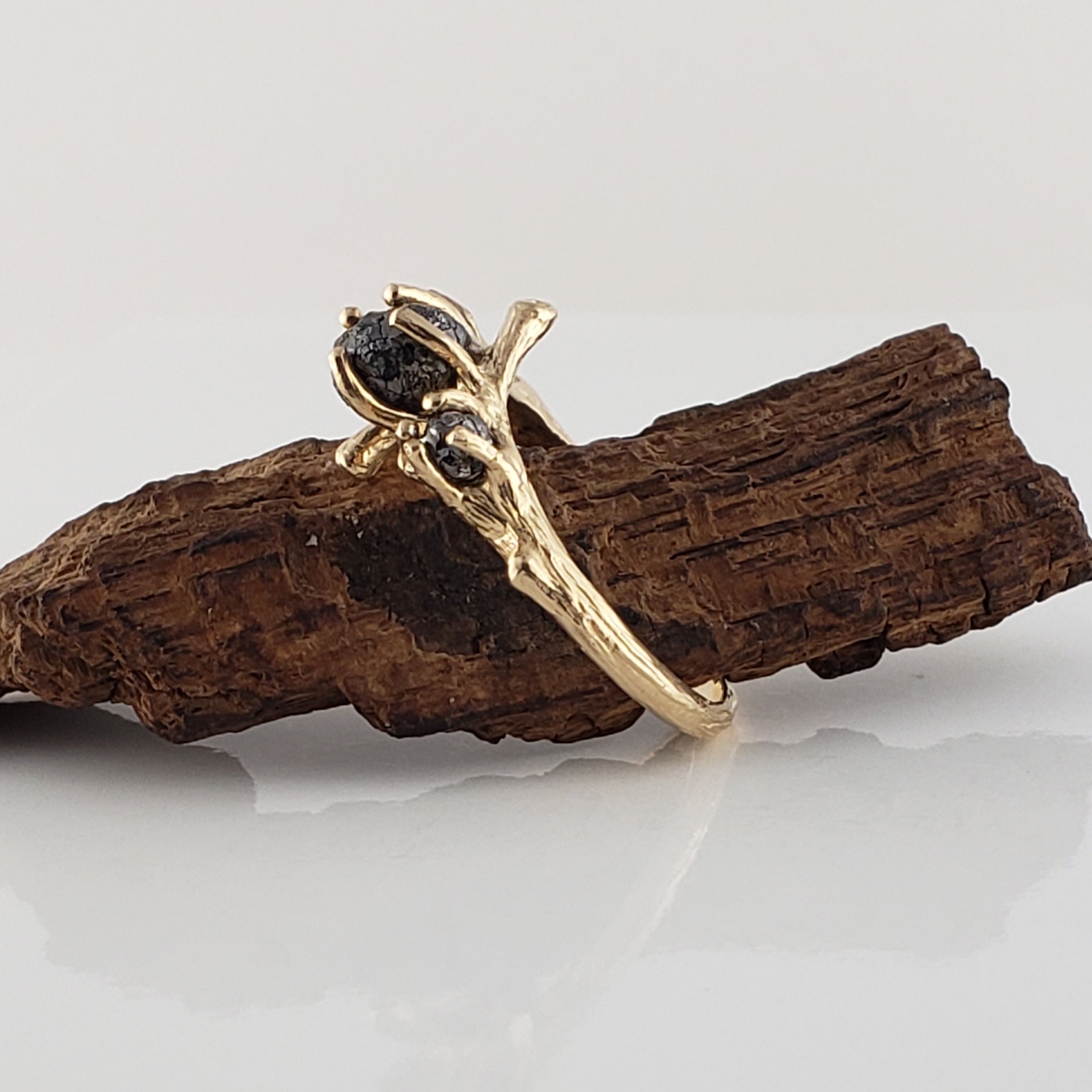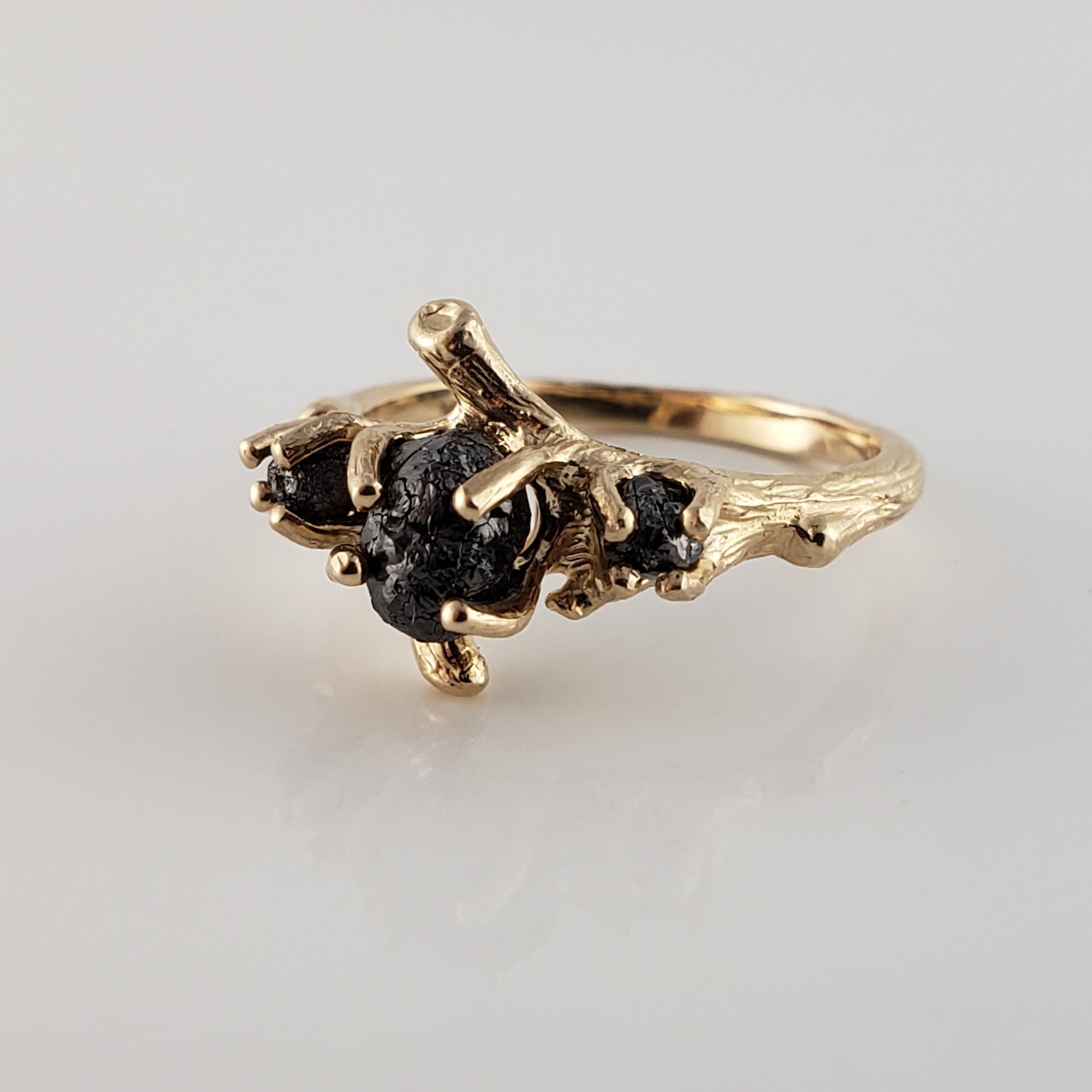 14k Yellow Gold 3 Black Rough Raw Diamond Engagement Ring by Dawn Vertrees
