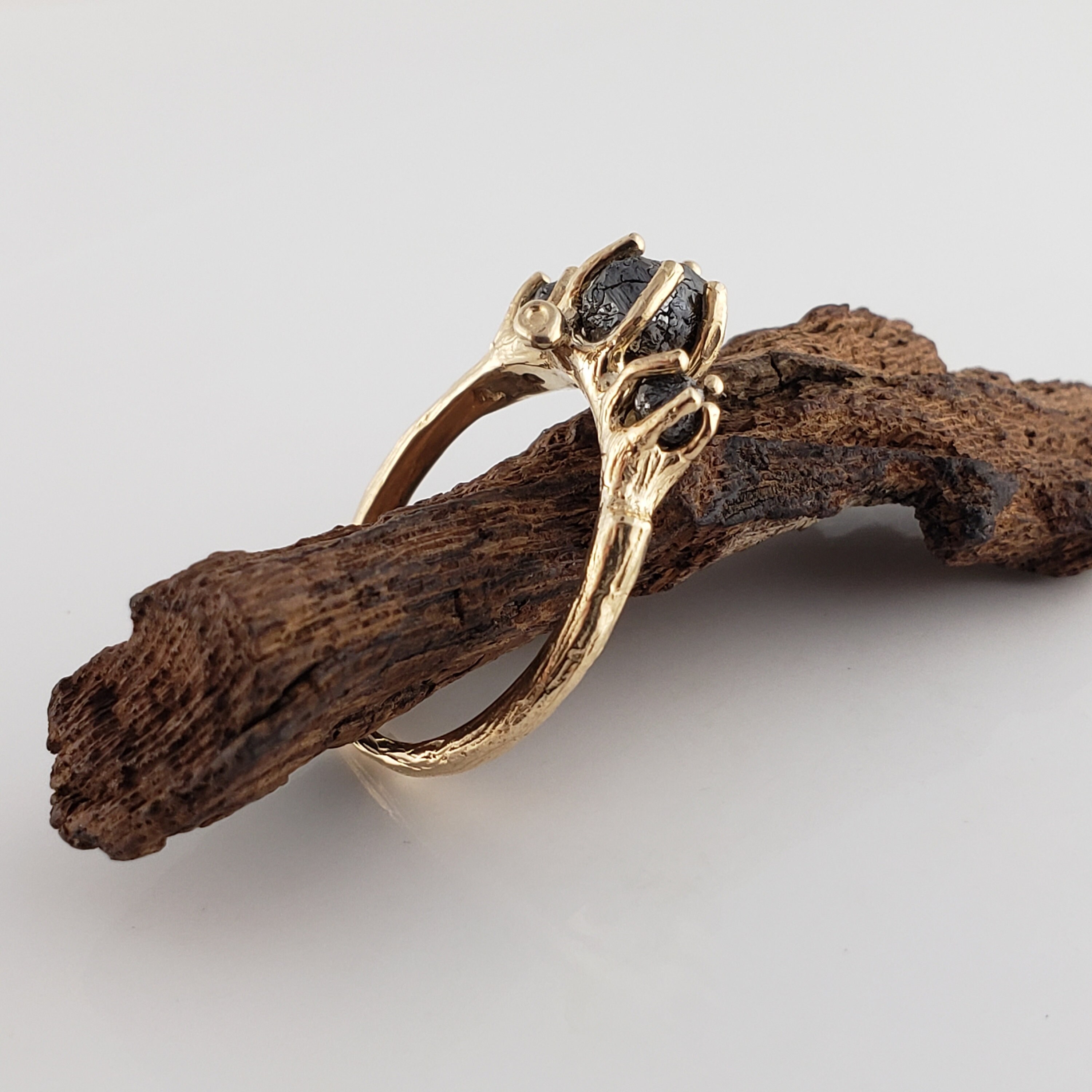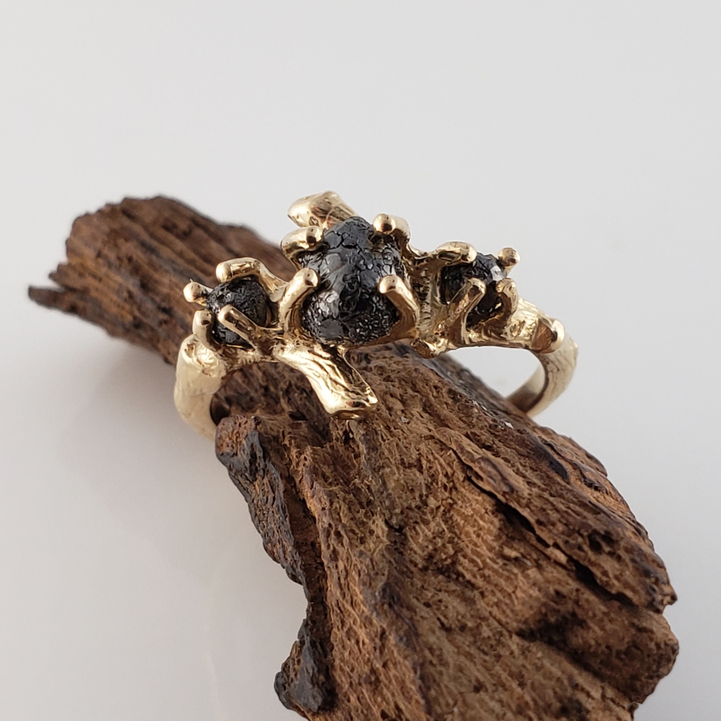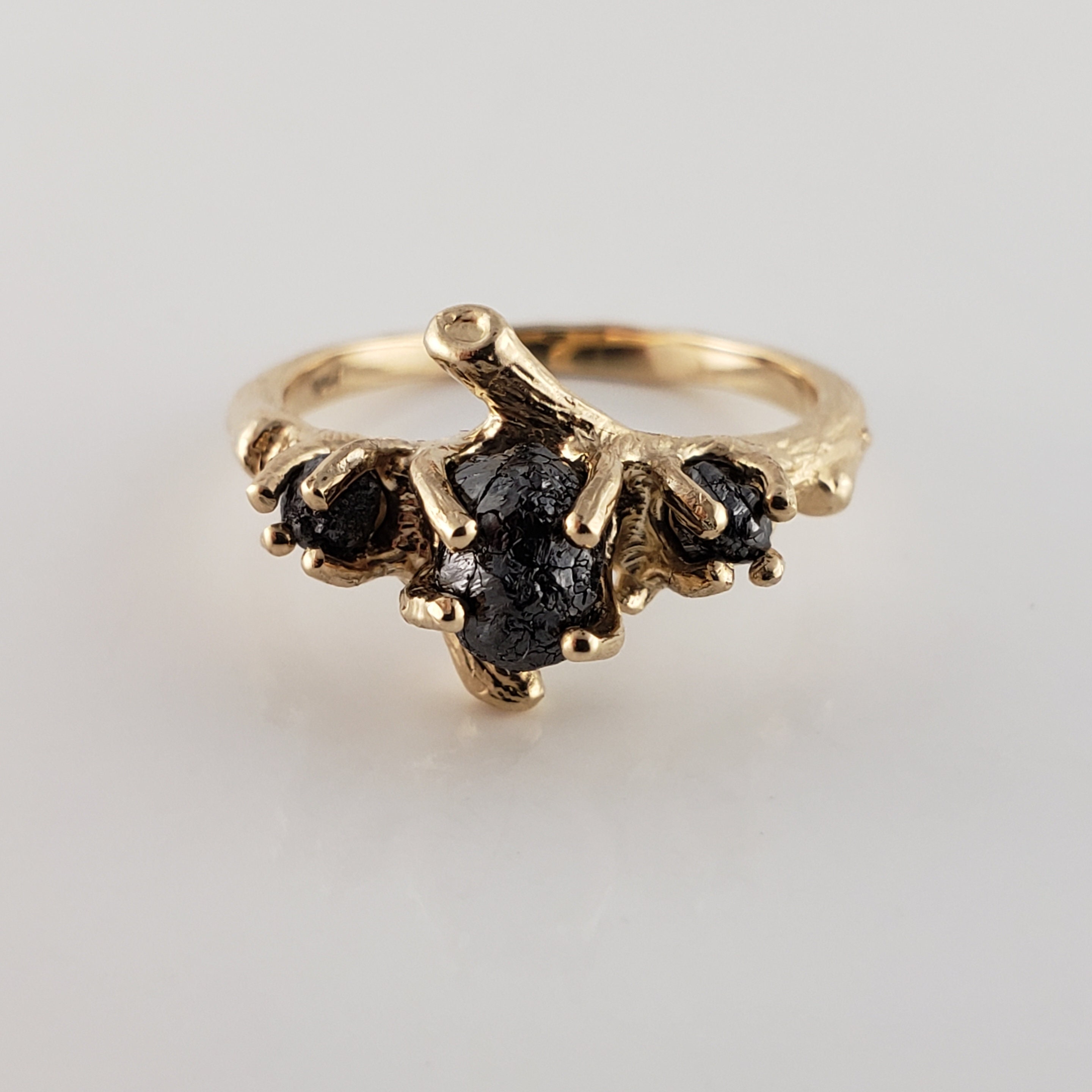 Raw Black Diamond Engagement ring using Three Uncut Rough Diamonds set in 14k Yellow Gold. This ring does not come with a matching wedding band but one can be made. Just contact us!