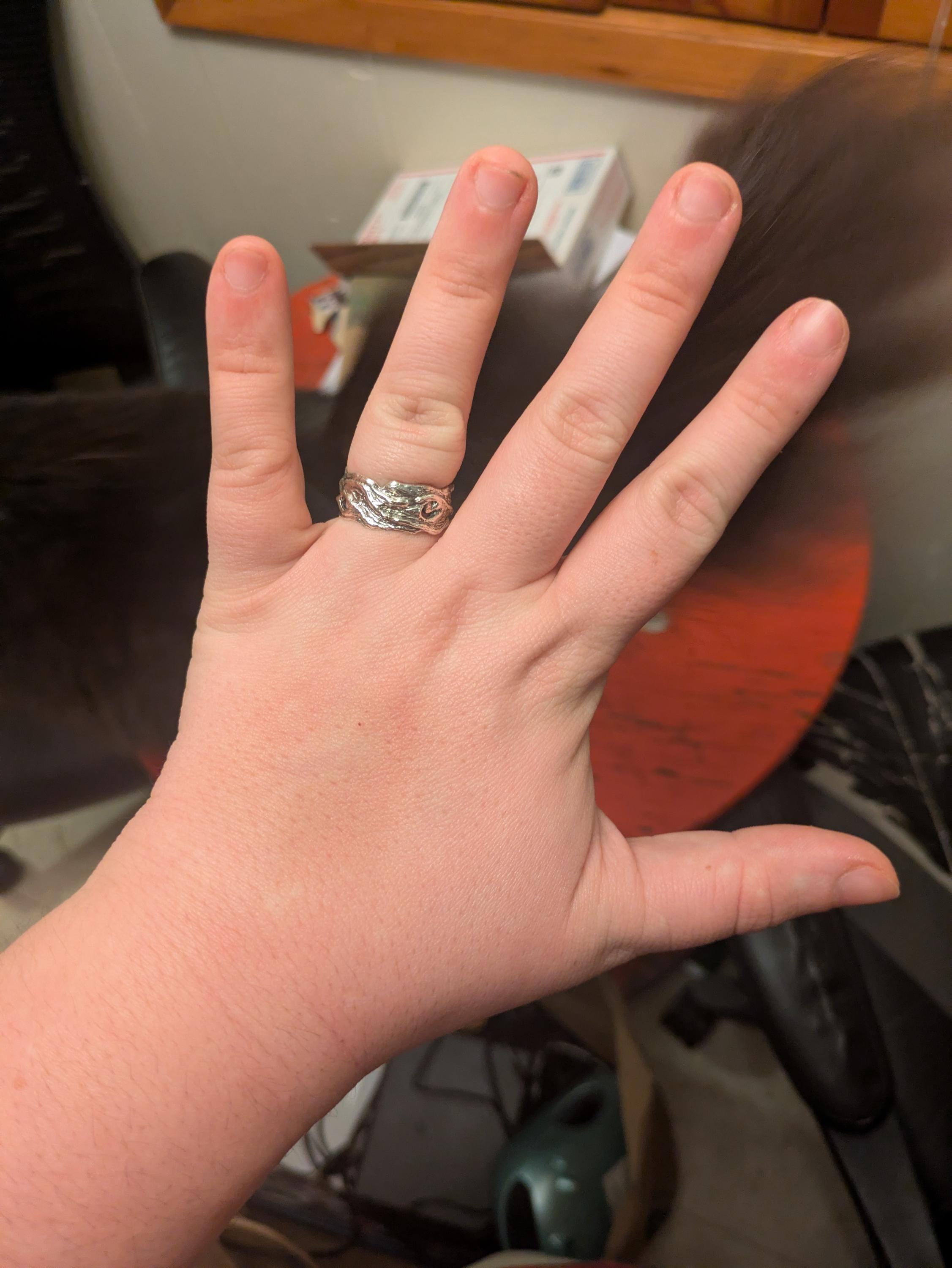 I love this ring. I was worried it might be a big thick but it is way more sleek than expected! I think this unique band is lovely, a lot of rings trying to replicate this texture look tacky imo but this one is perfect. The lil holes charm me and the back towards your palm is smoother to help ease any texture issues you might have had. (Not the most pretty photo but you can only include one)