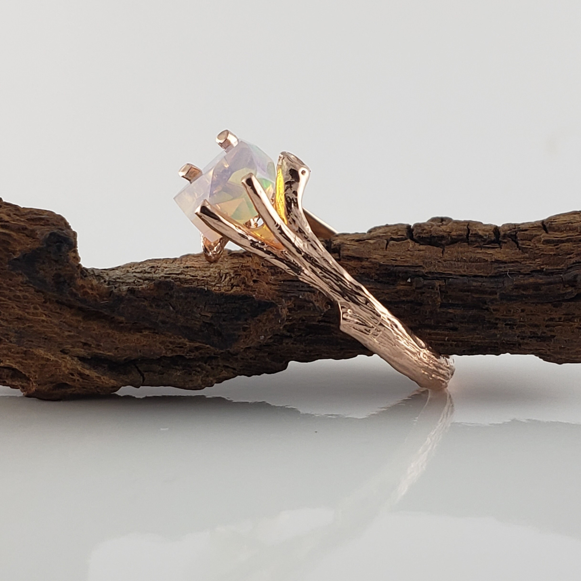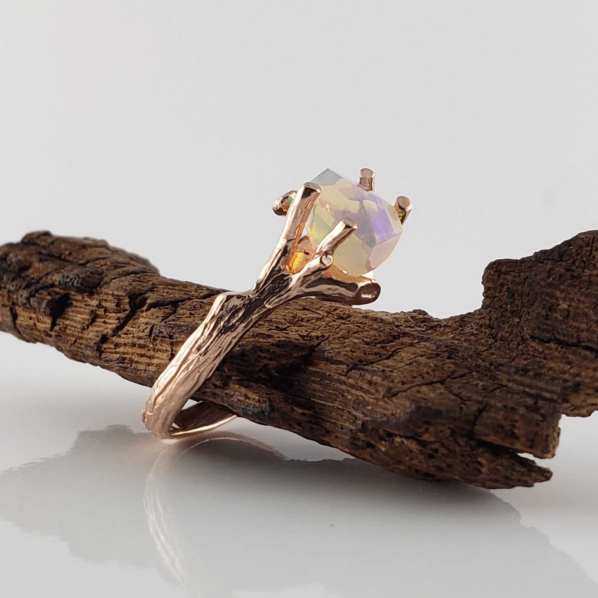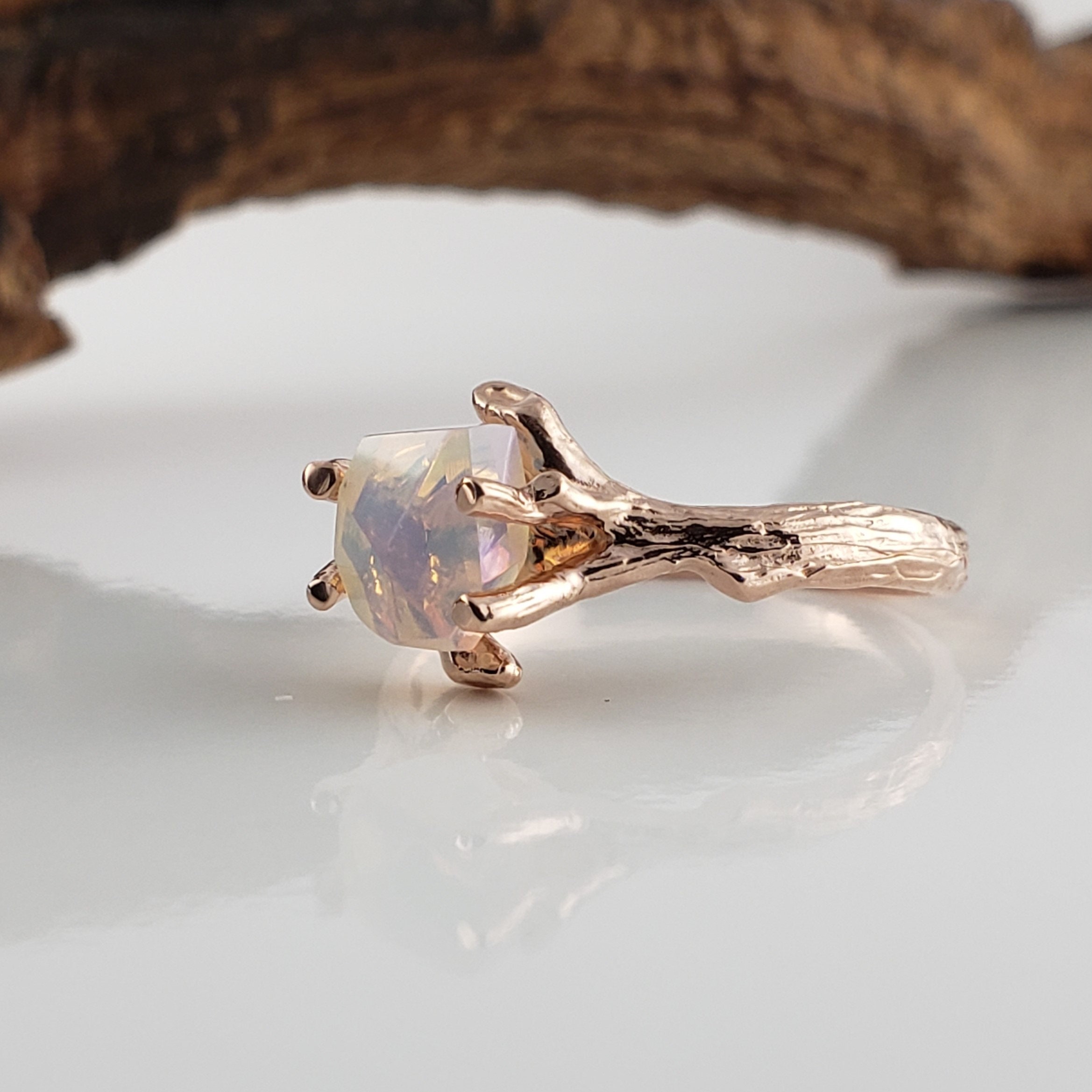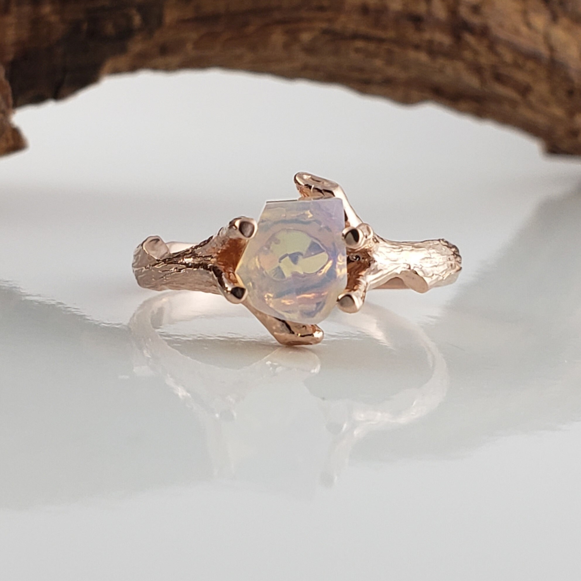 Opal Engagement Ring: Hand-Cut Gem, 14k Rose Gold Twig Band
