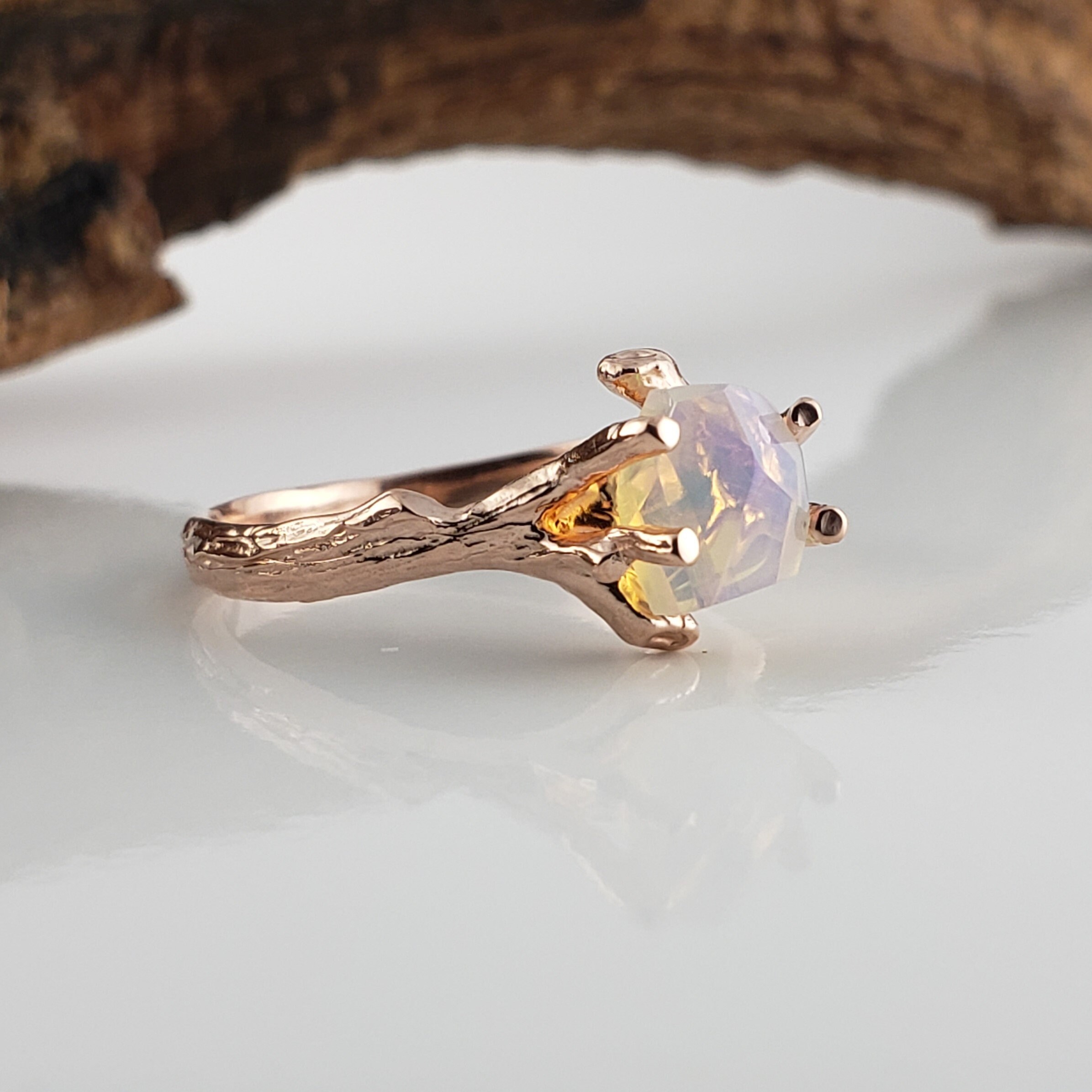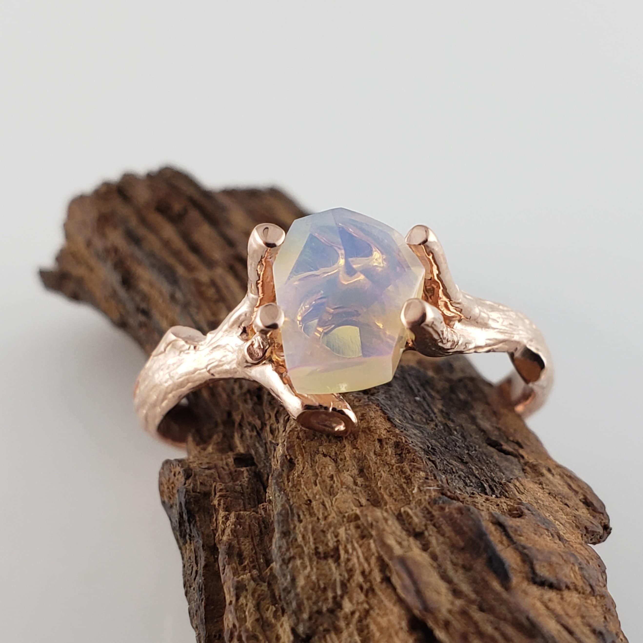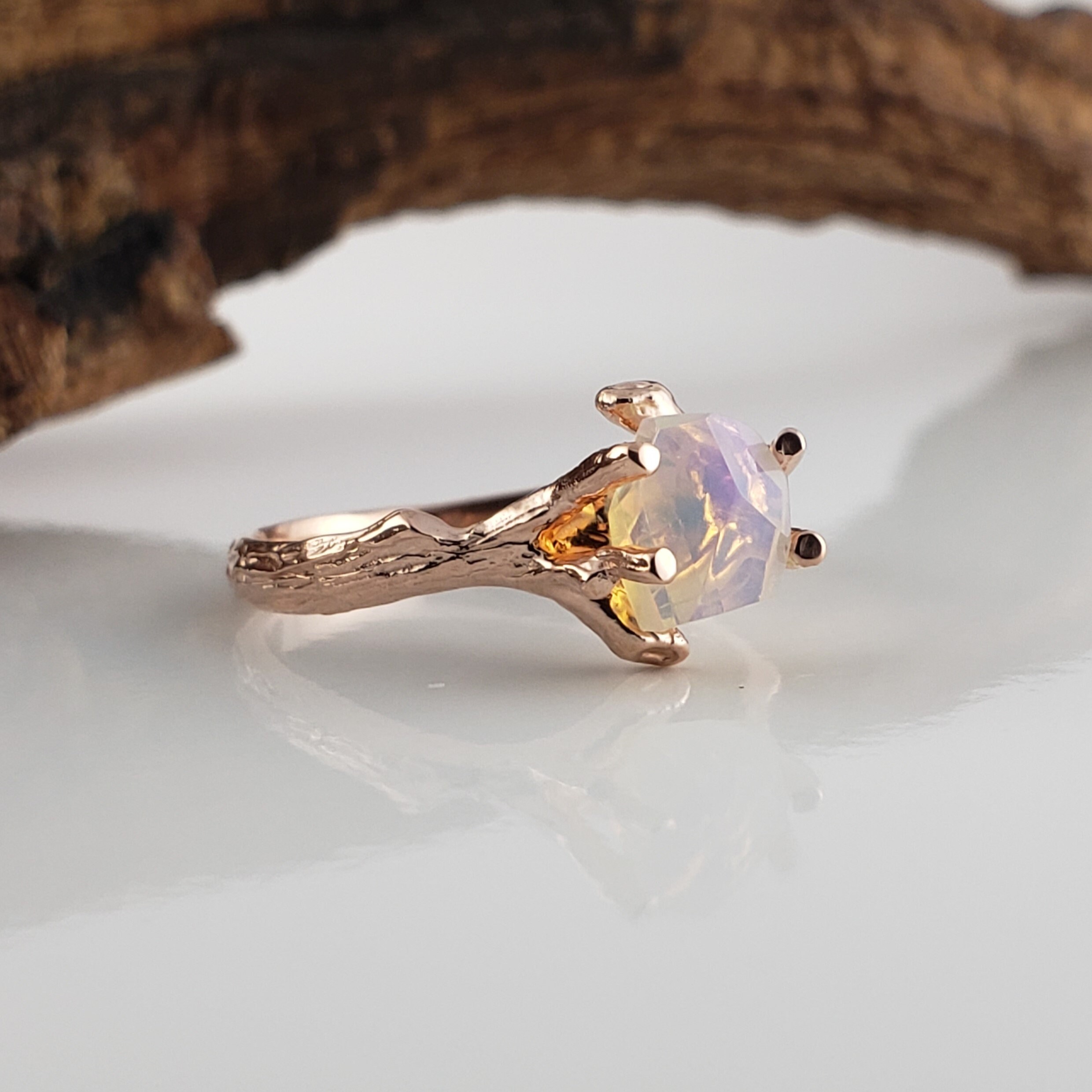 Opal Engagement Ring: Hand-Cut Gem, 14k Rose Gold Twig Band