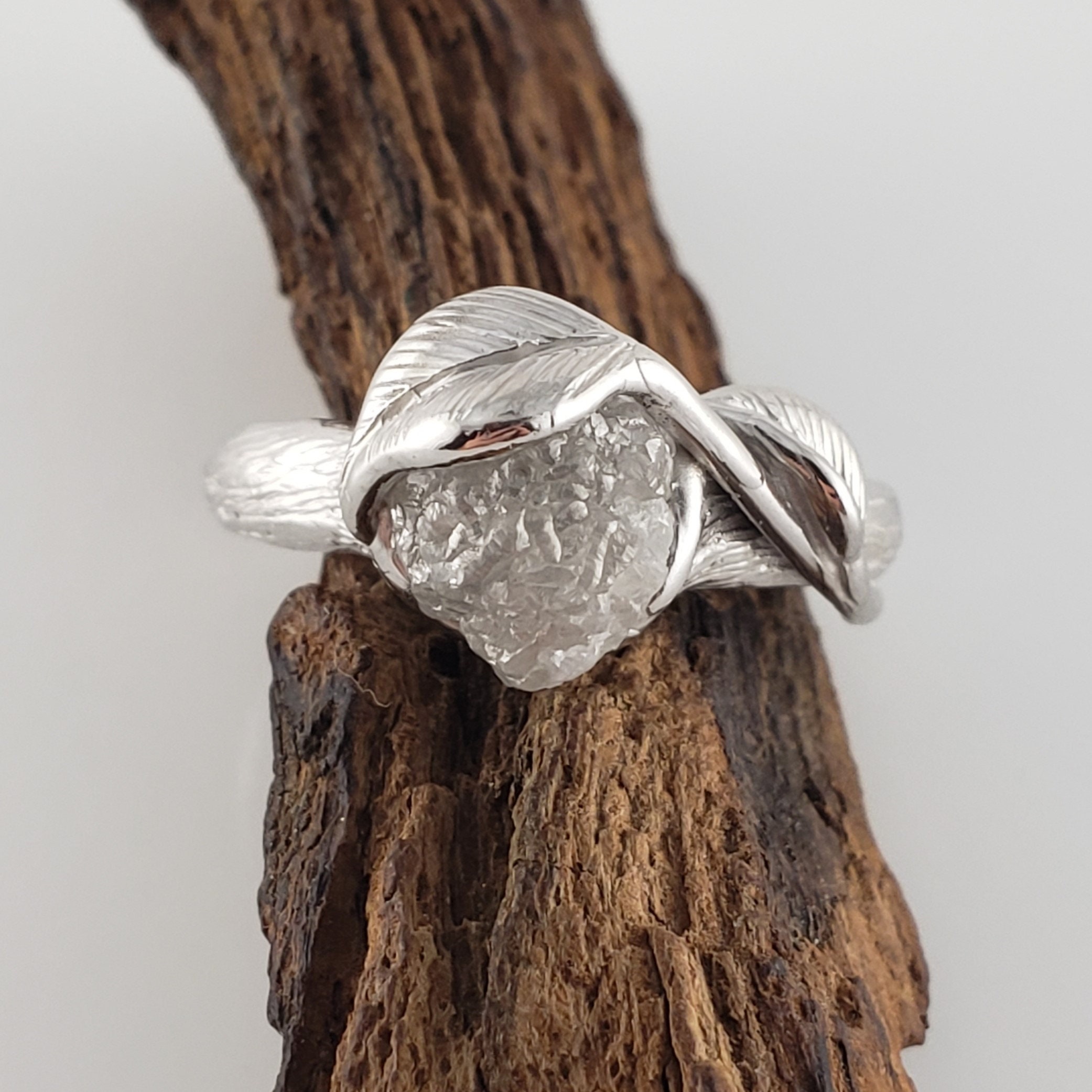 I wanted to create a beautiful engagement ring with Rough Uncut Diamond, so I sculpted the branch to focus on the showcasing this rough diamond and elegant leaves draped over the raw crystal like diamond.