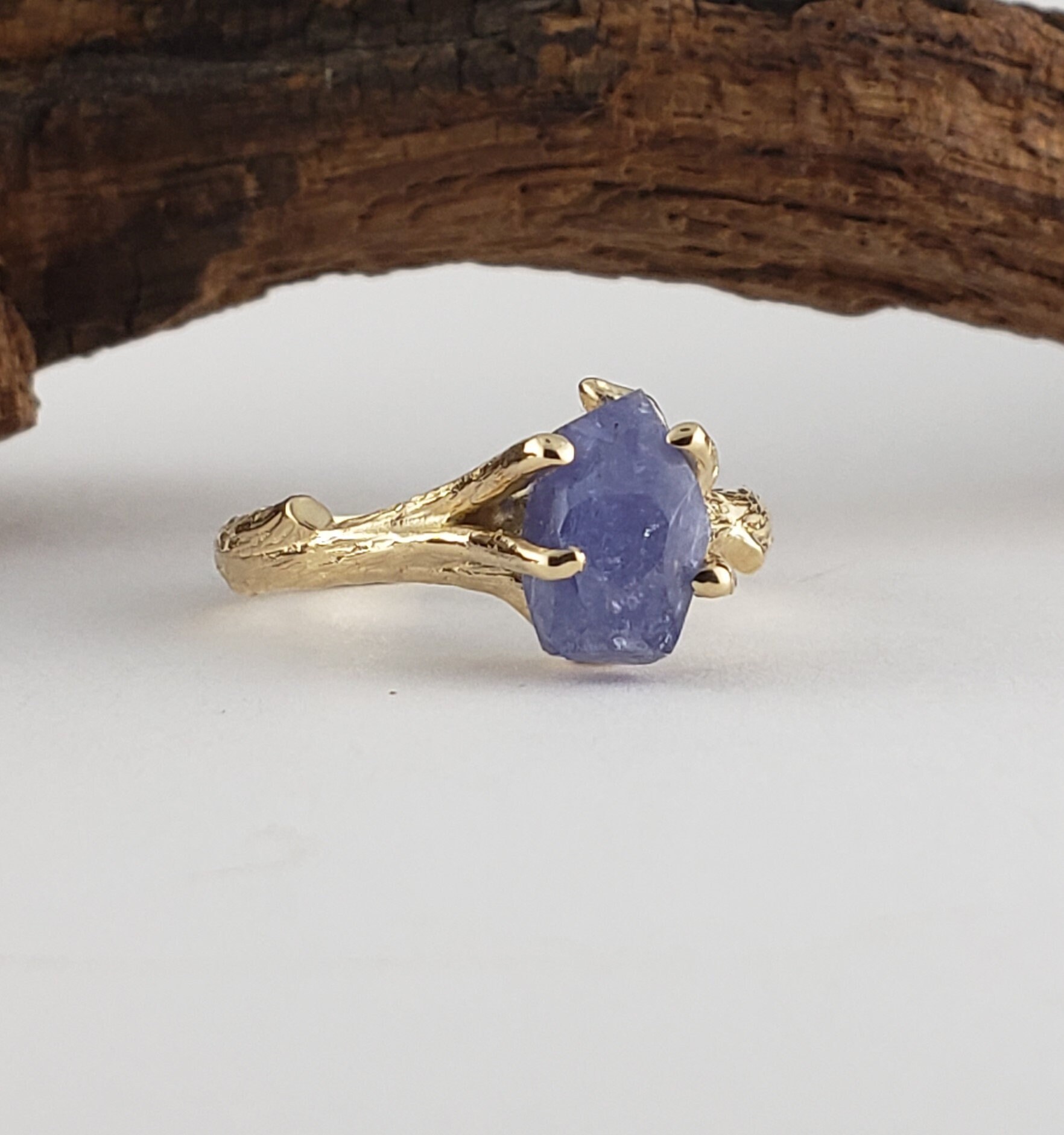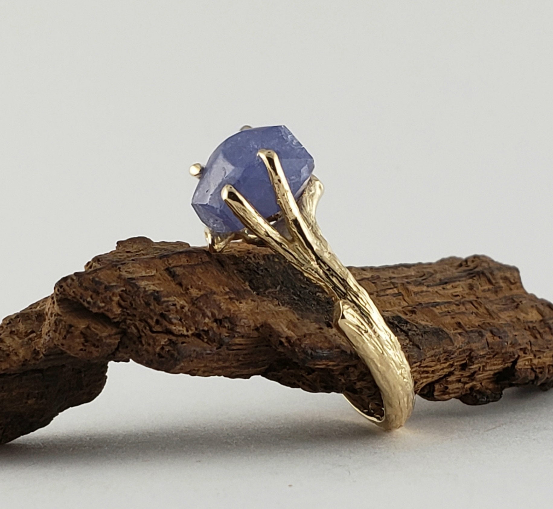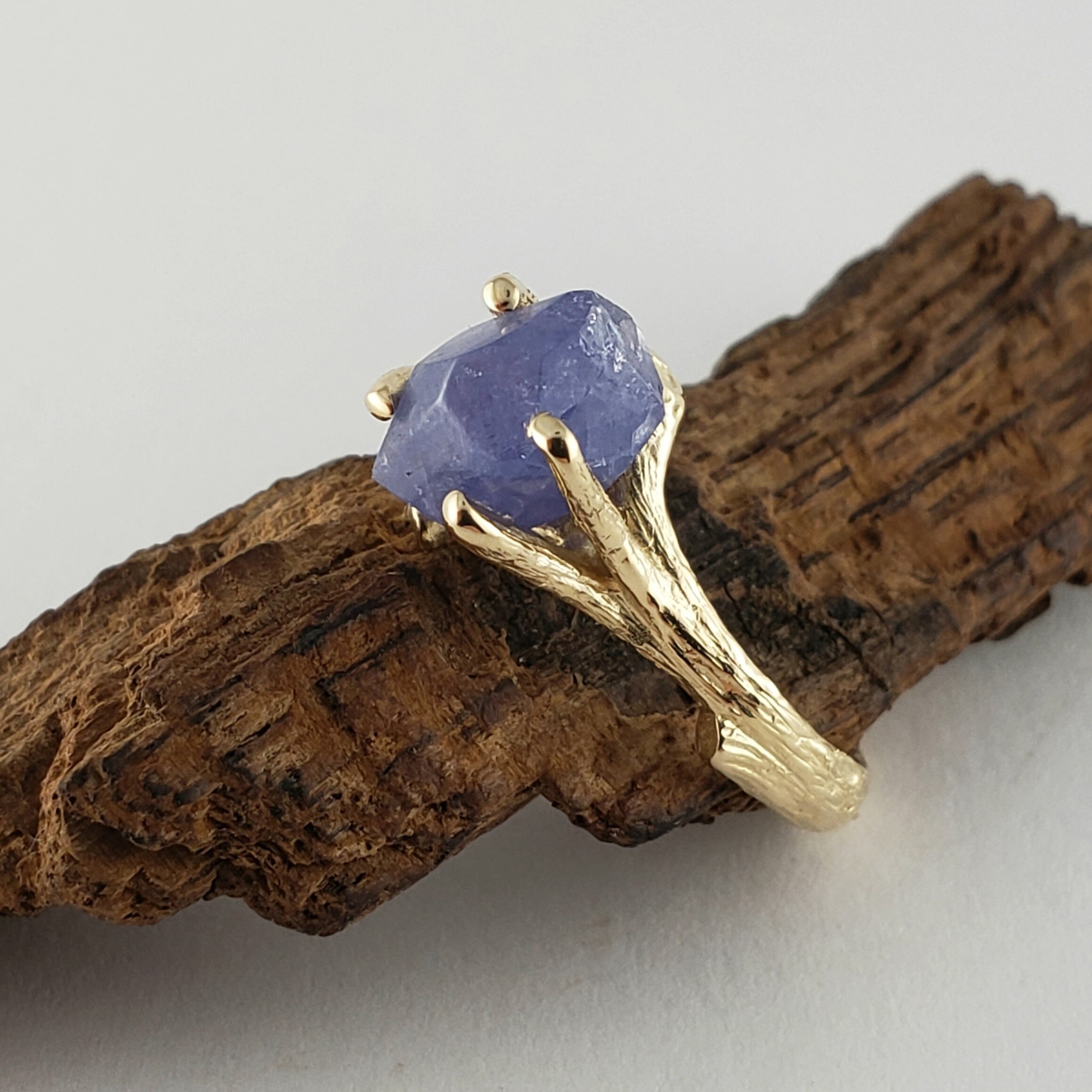 Hand-Sculpted 14k Yellow Gold Tanzanite Ring: Twig Bark Band