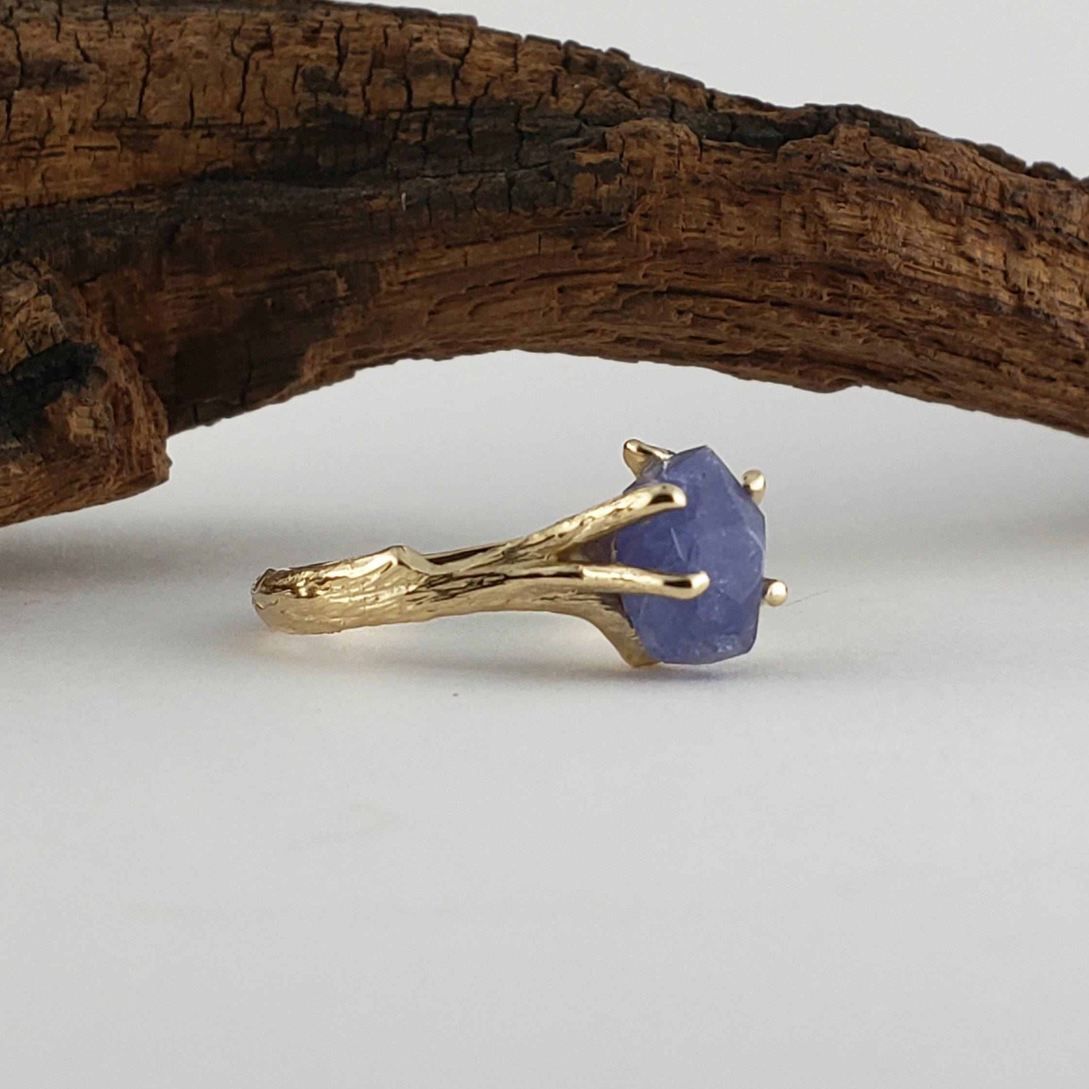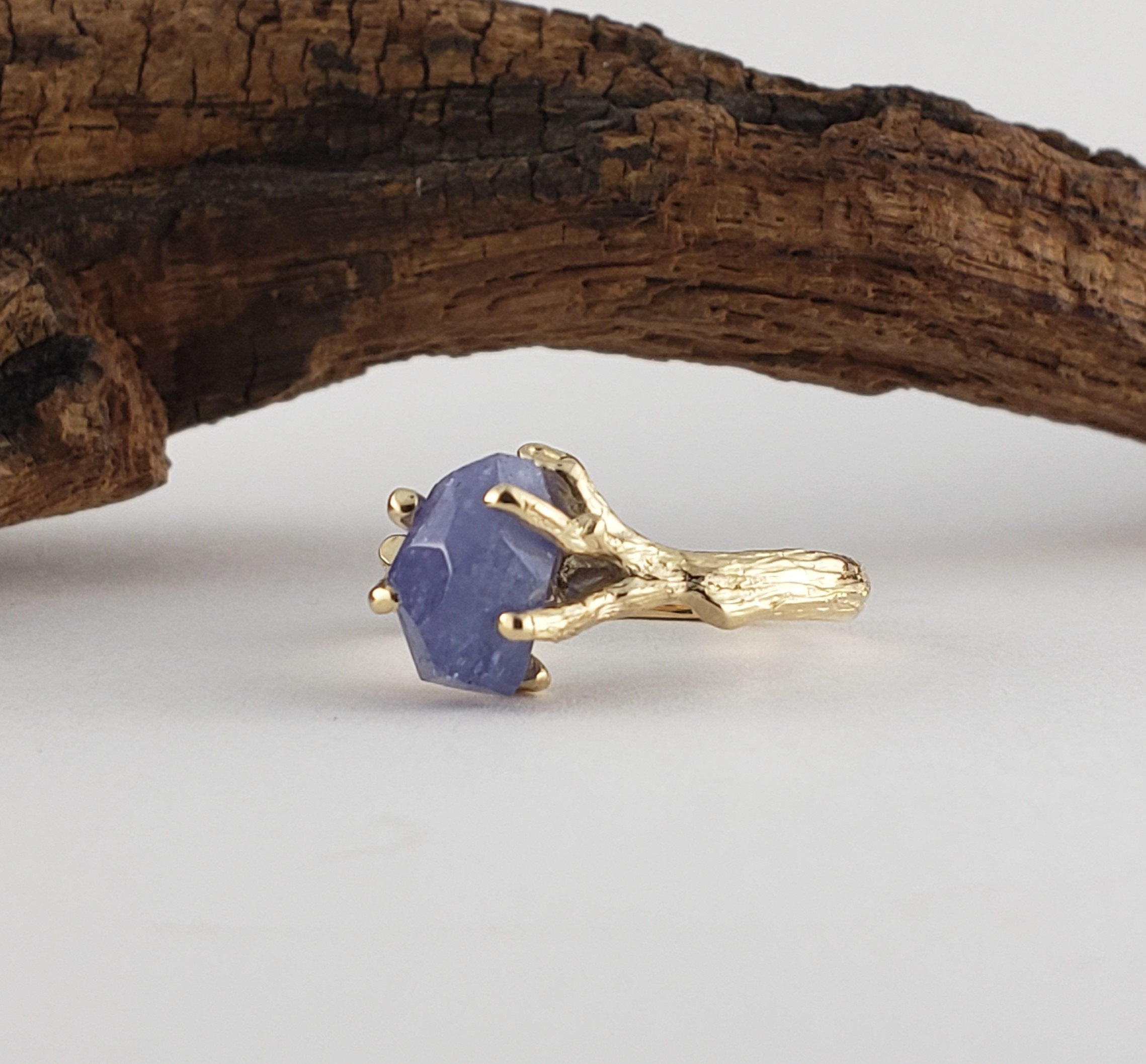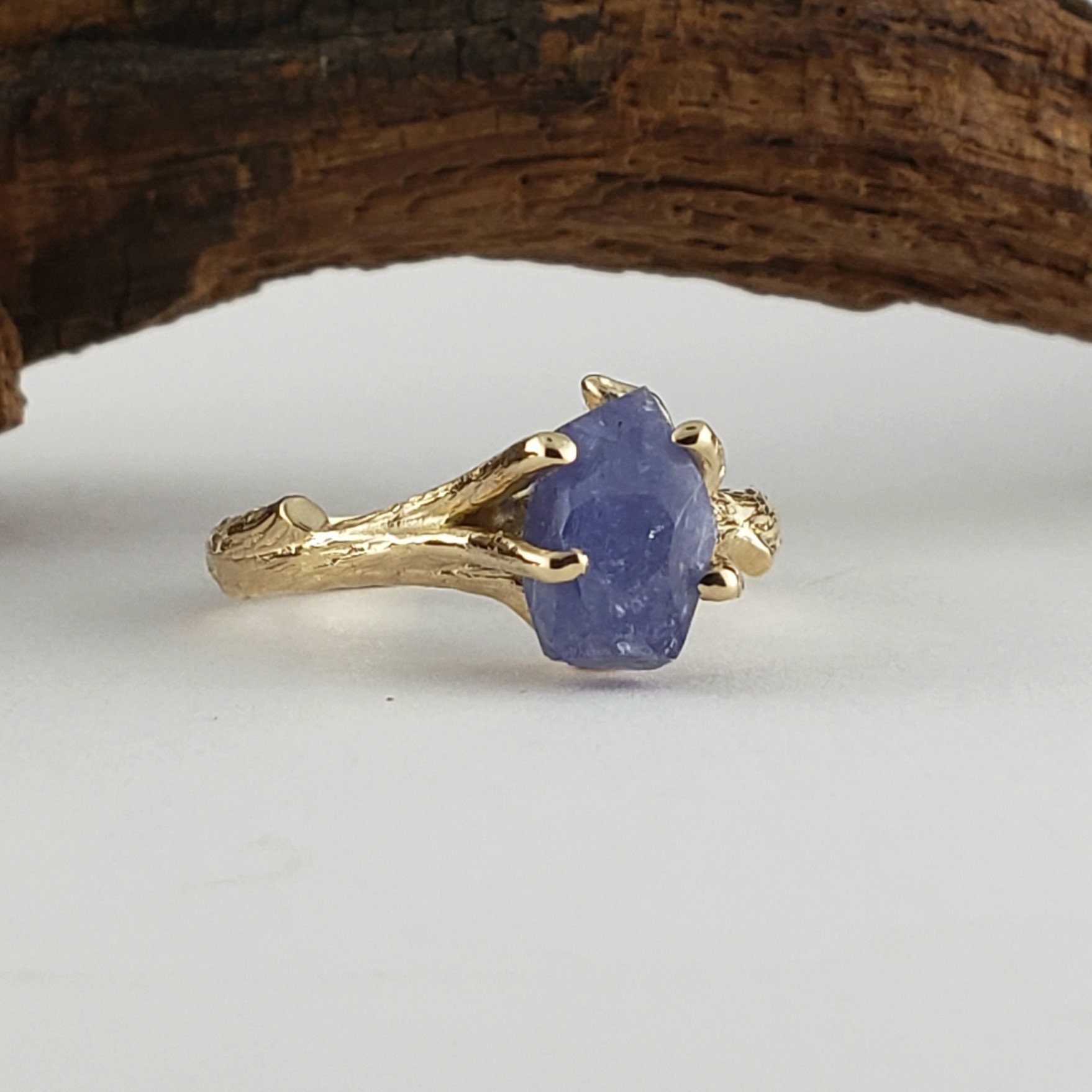 Hand-Sculpted 14k Yellow Gold Tanzanite Ring: Twig Bark Band