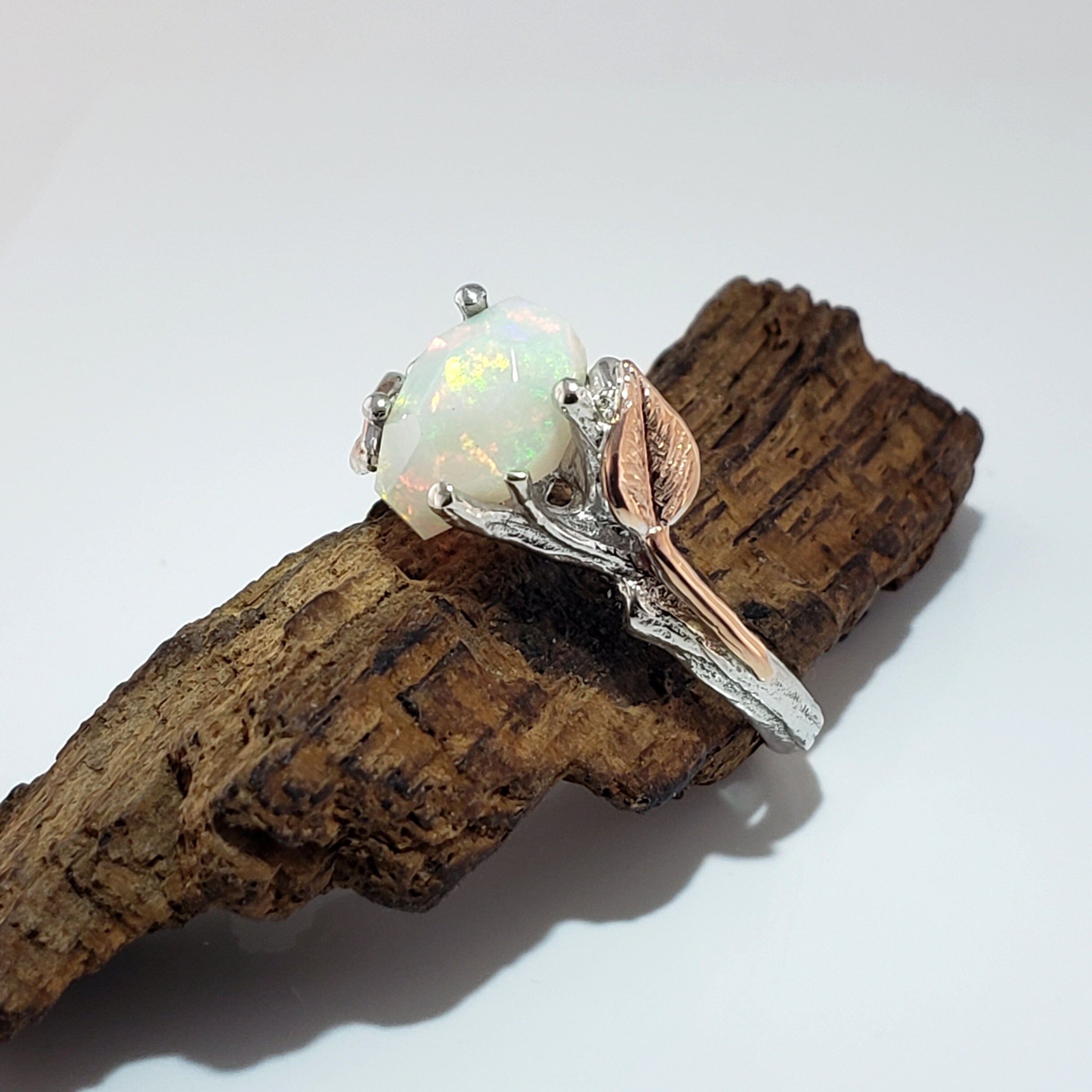 Made to Order - Hand Cut 1.45ct Opal from our rough gemstones and hand sculpted twig setting with two leaves that lay on the two branches.
