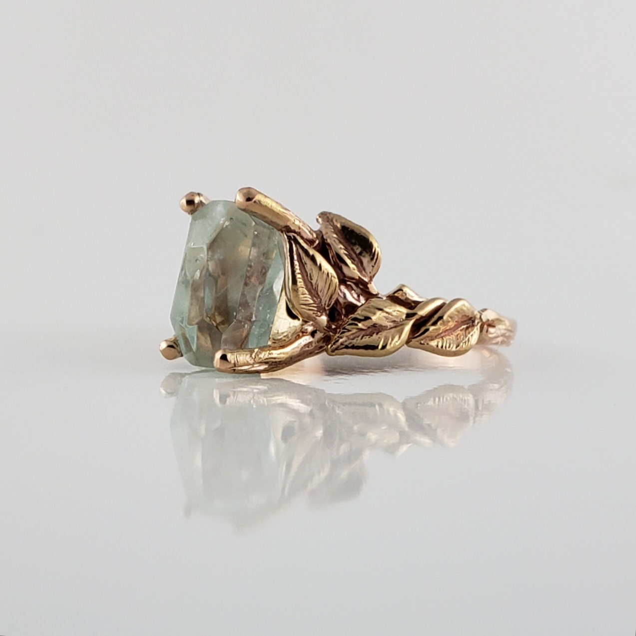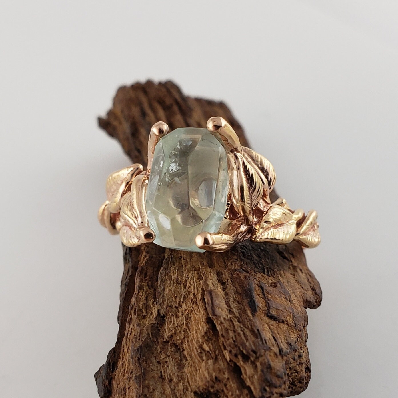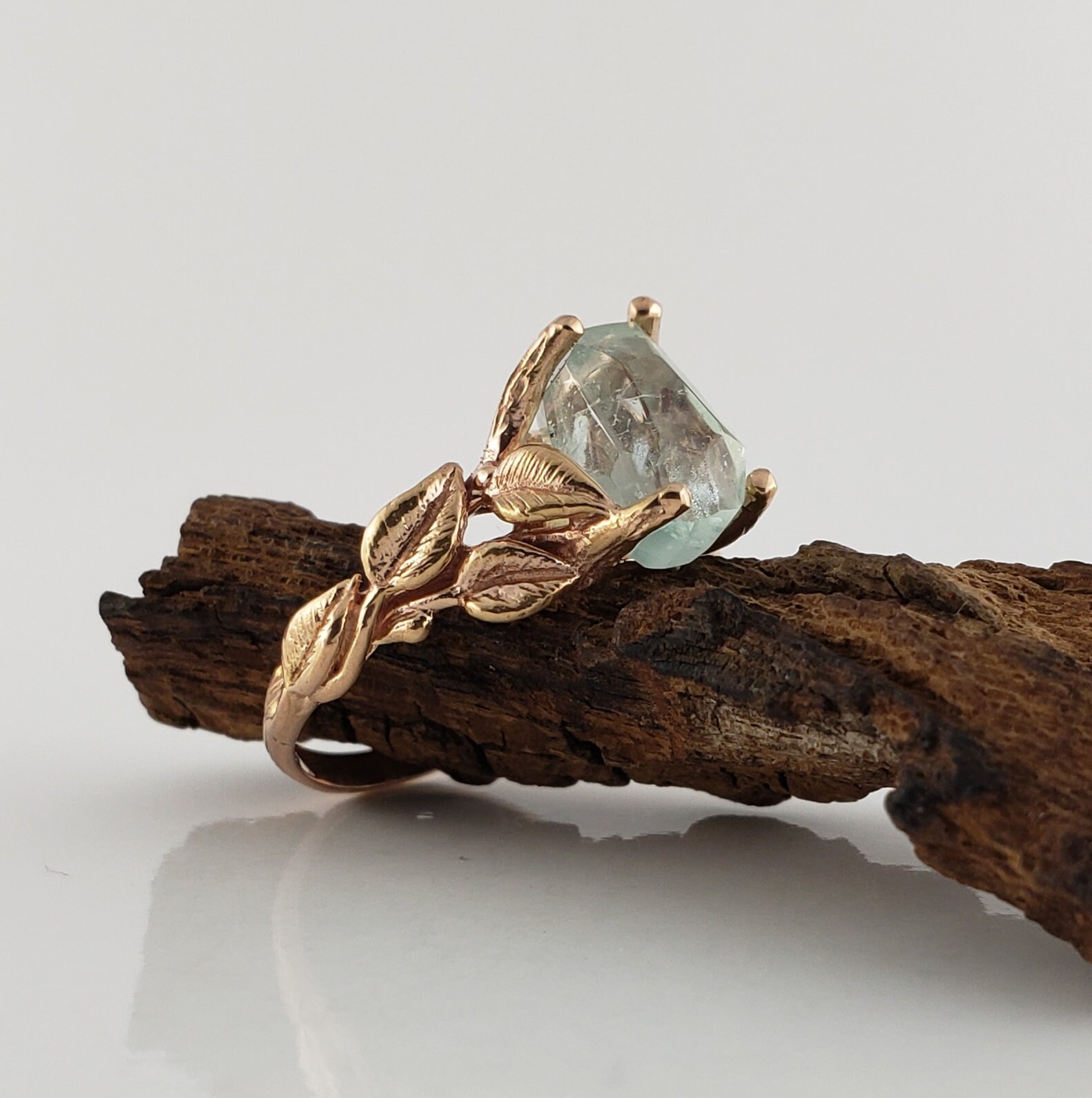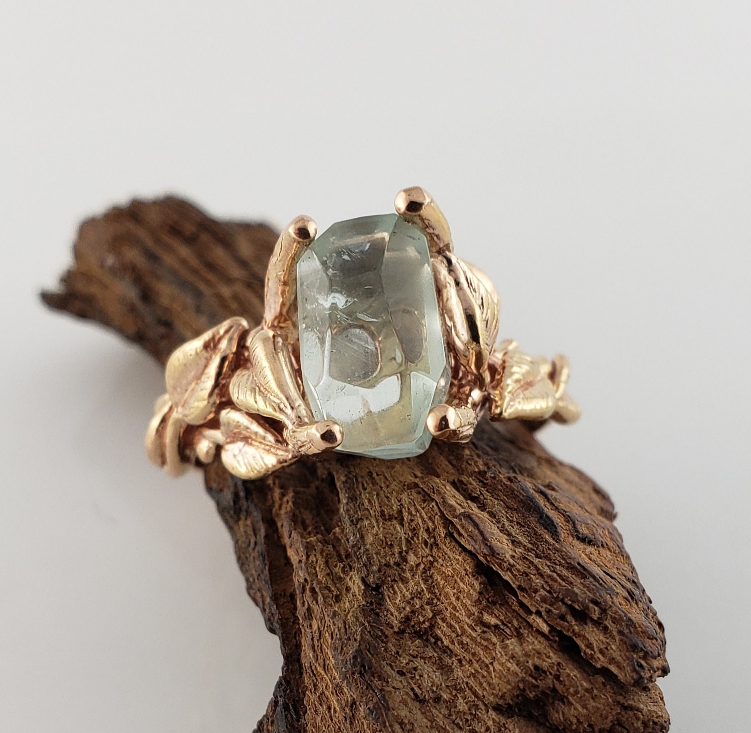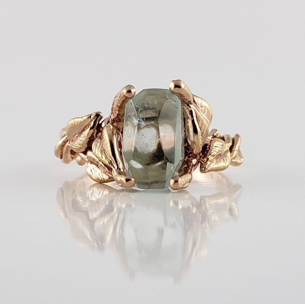 This ring is hand-sculpted by Dawn using the lost wax method. Every leaf was hand sculpted and placed on the twig vines and then cast in solid gold (rose gold is shown). Our gemstones are direct from the ground and hand-cut in our studio. These are truly one-of-a-kind rings.