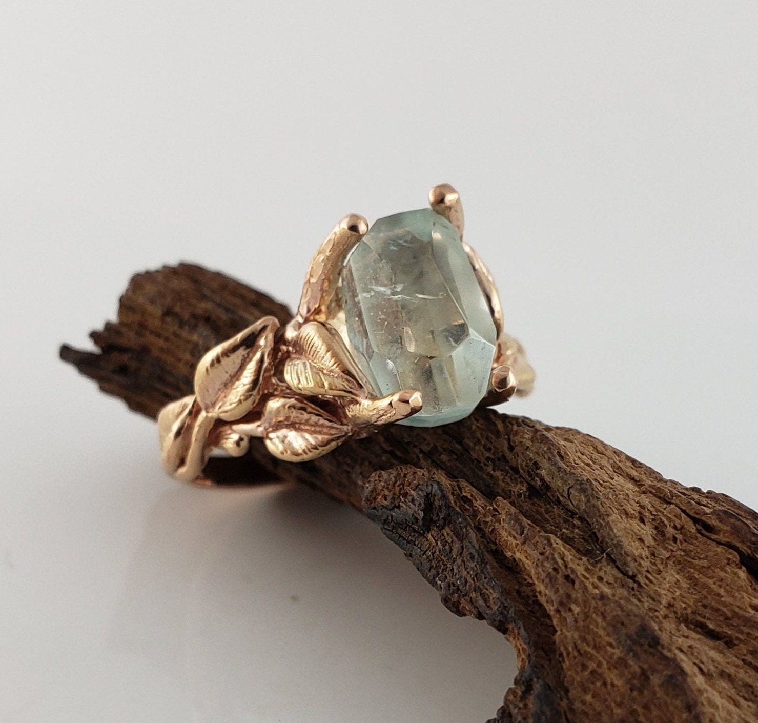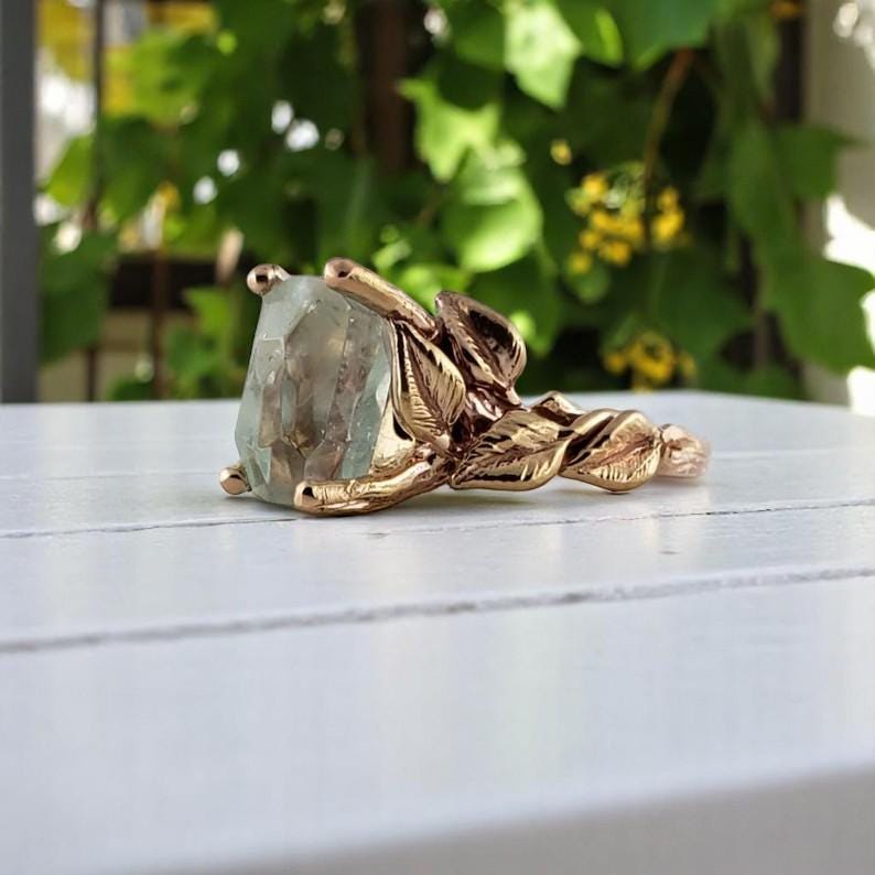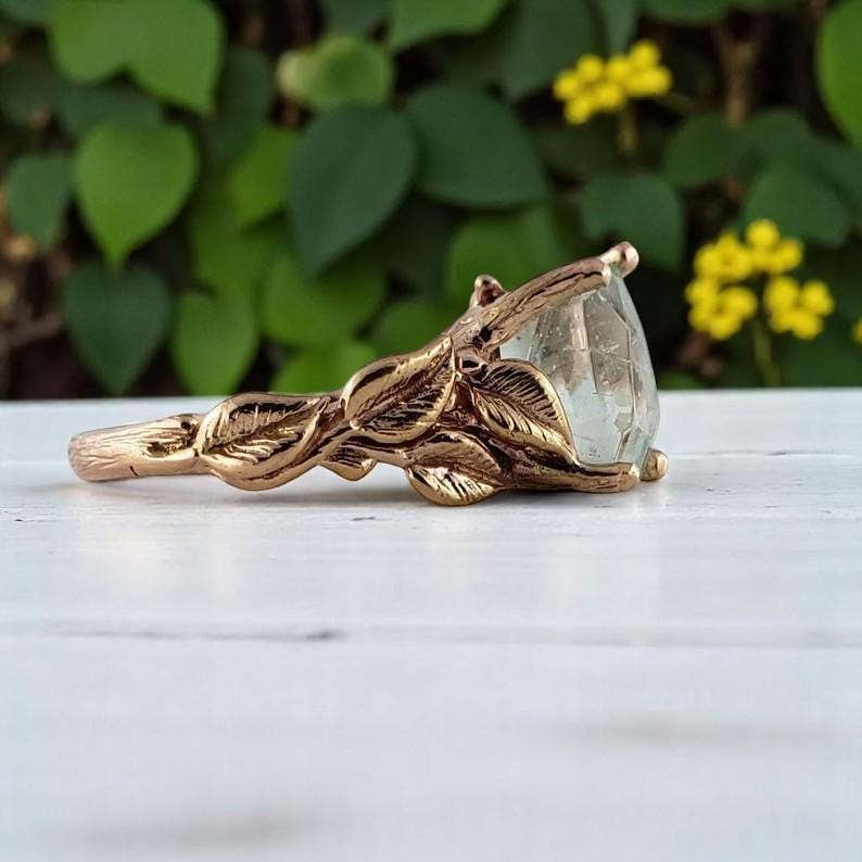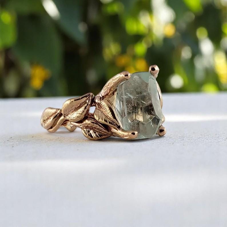 Handmade Aquamarine Engagement Ring in Solid Gold, Twig and Leaf Handmade Gemstone Ring, Anniversary Ring