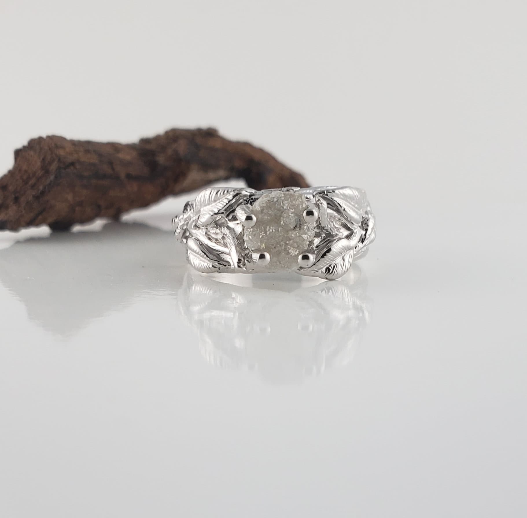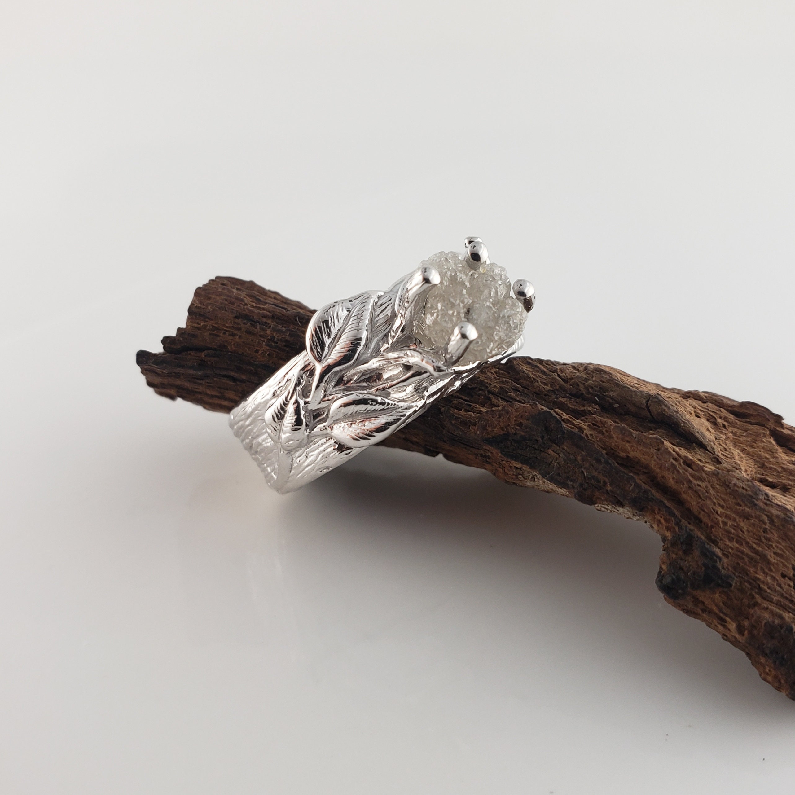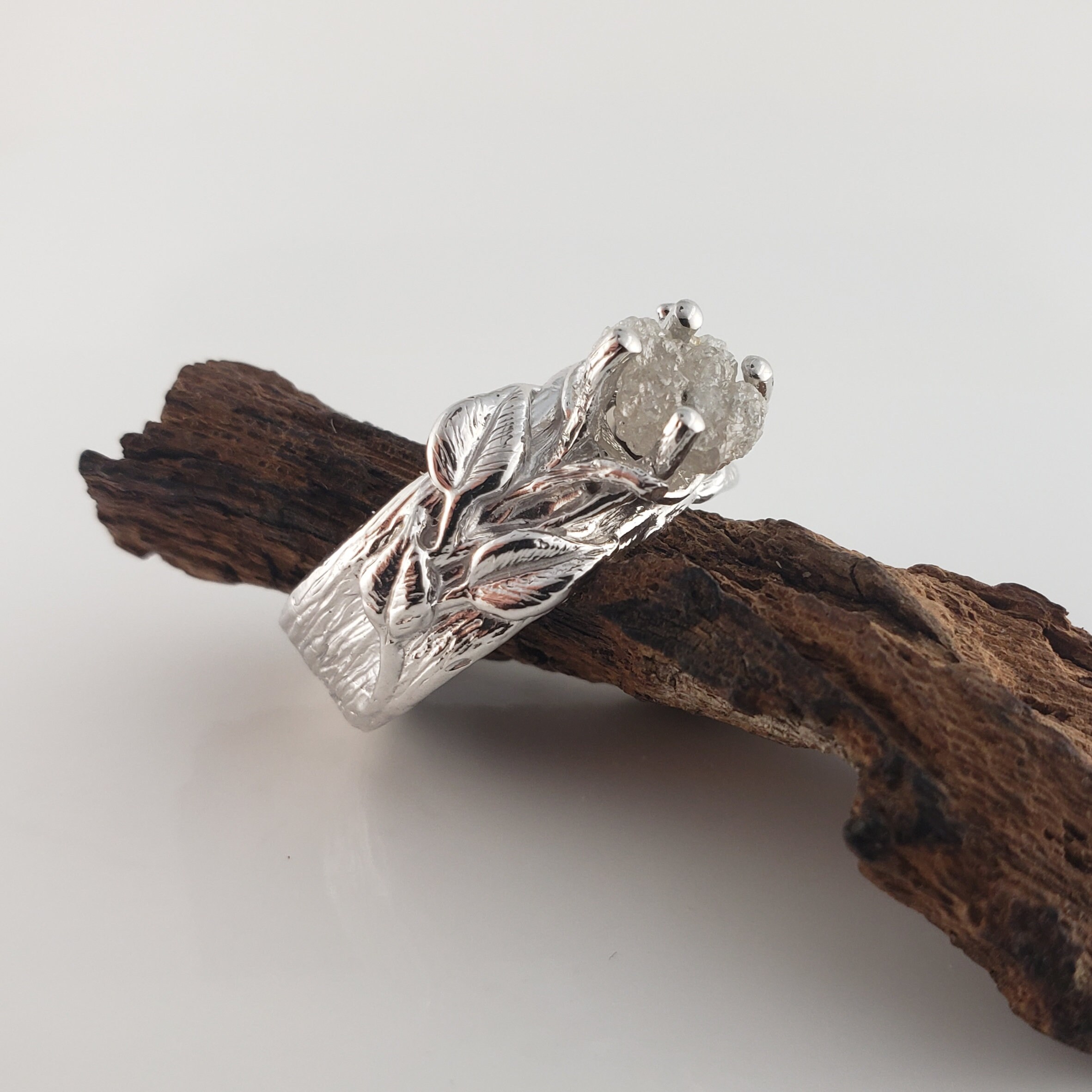 I wanted to create a beautiful wide yet elegant leaf and twig ring using a Rough Uncut Diamond, so I sculpted the branch to focus on the showcasing this rough diamond.