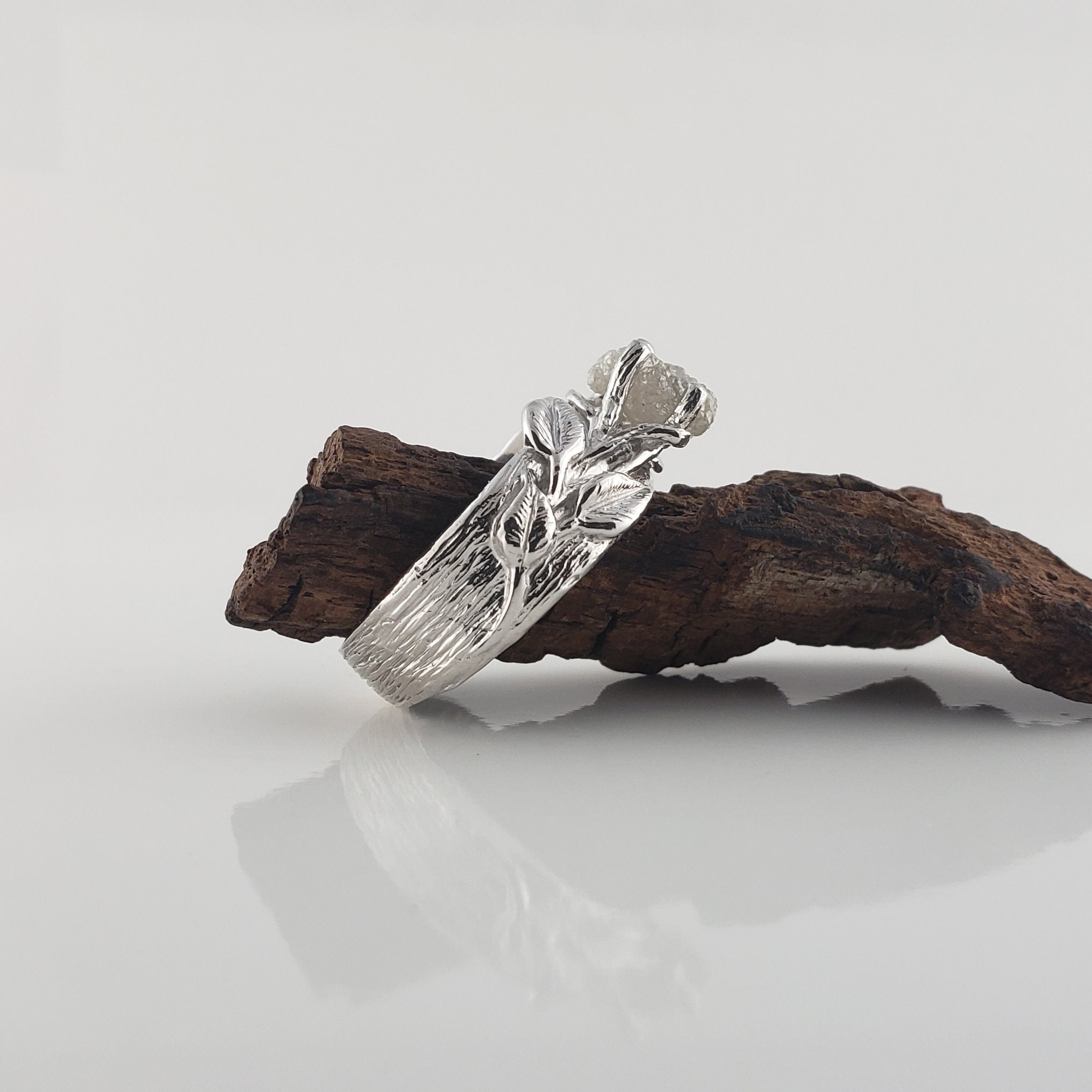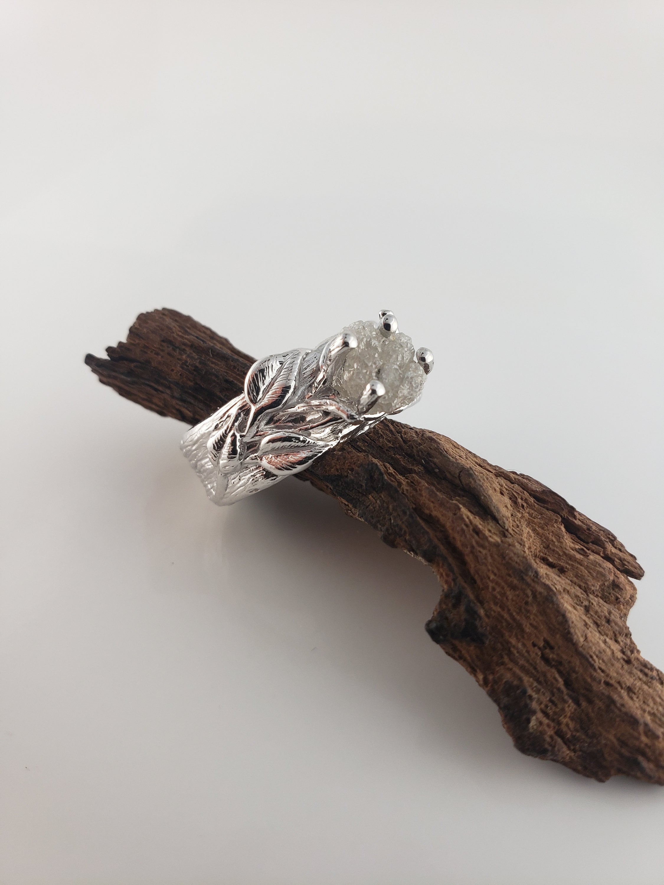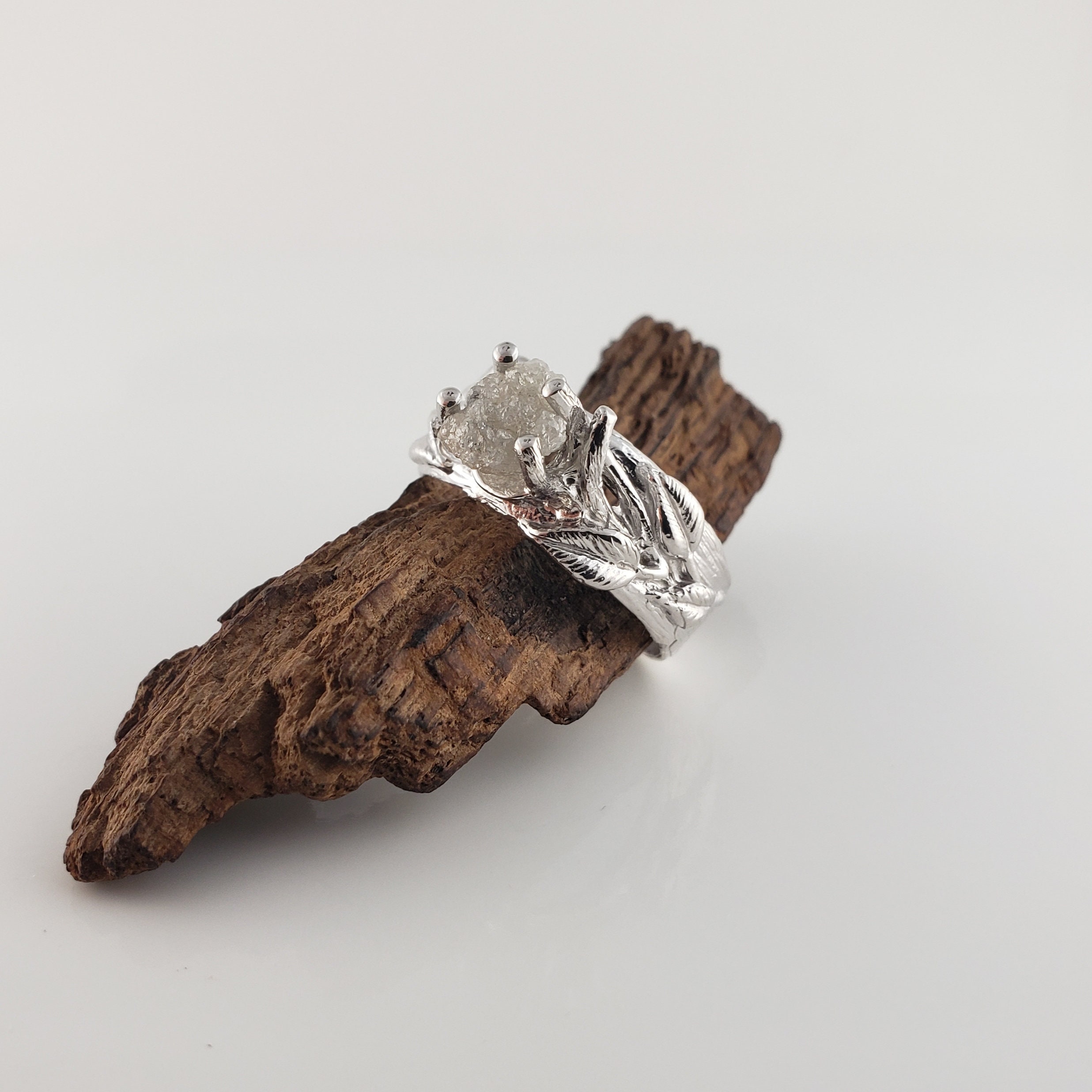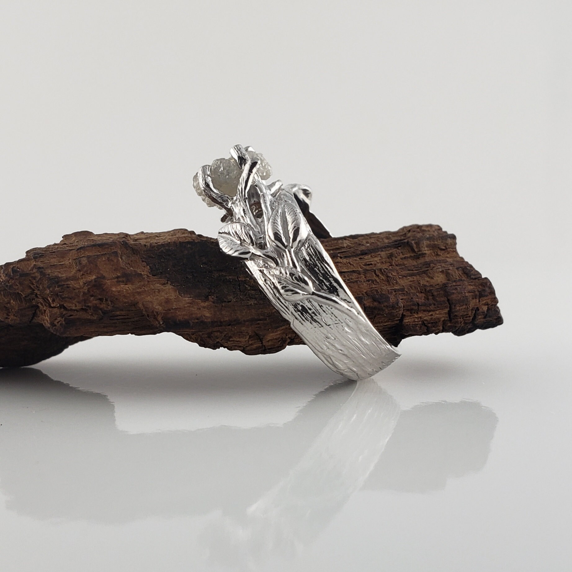 I wanted to create a beautiful wide yet elegant leaf and twig ring using a Rough Uncut Diamond, so I sculpted the branch to focus on the showcasing this rough diamond.