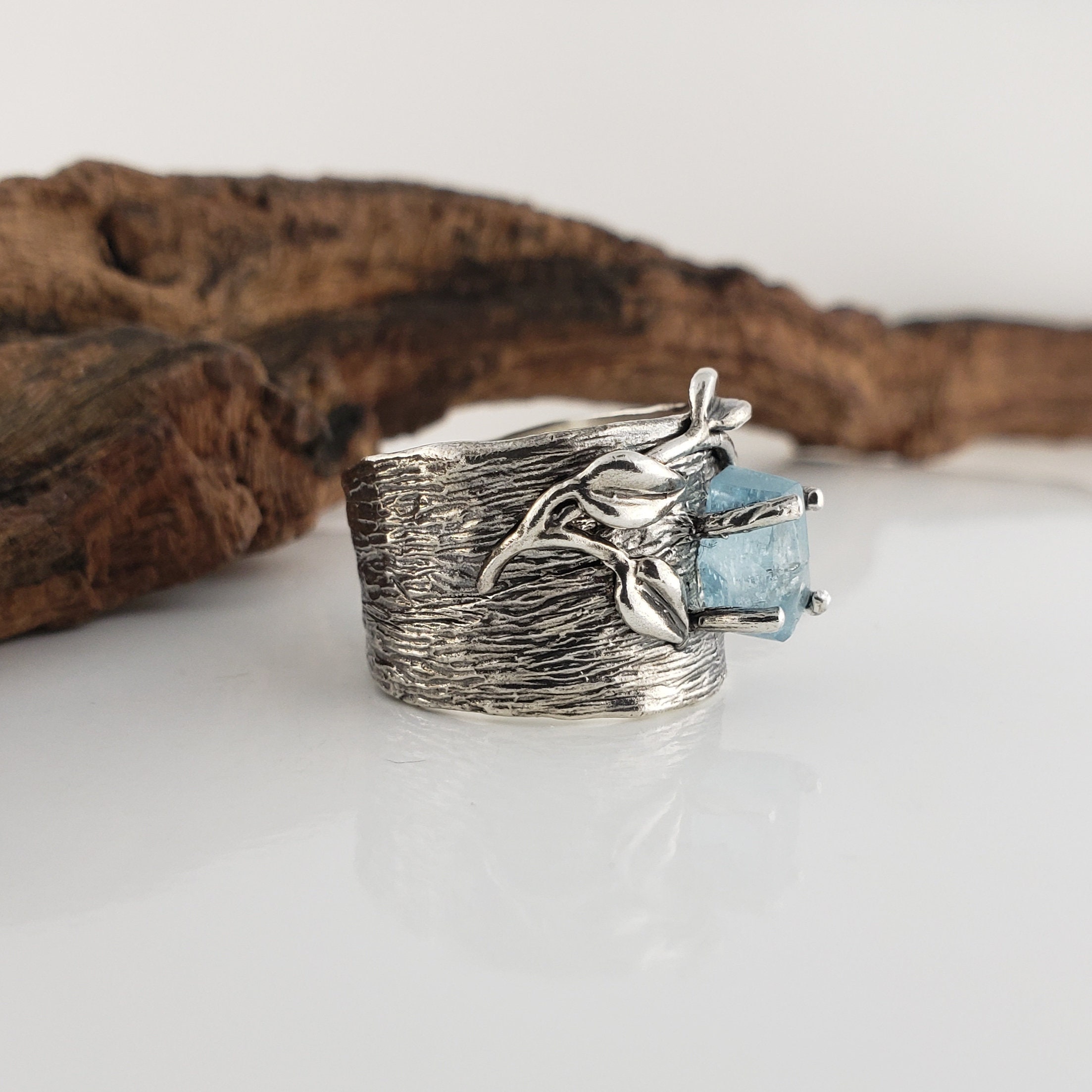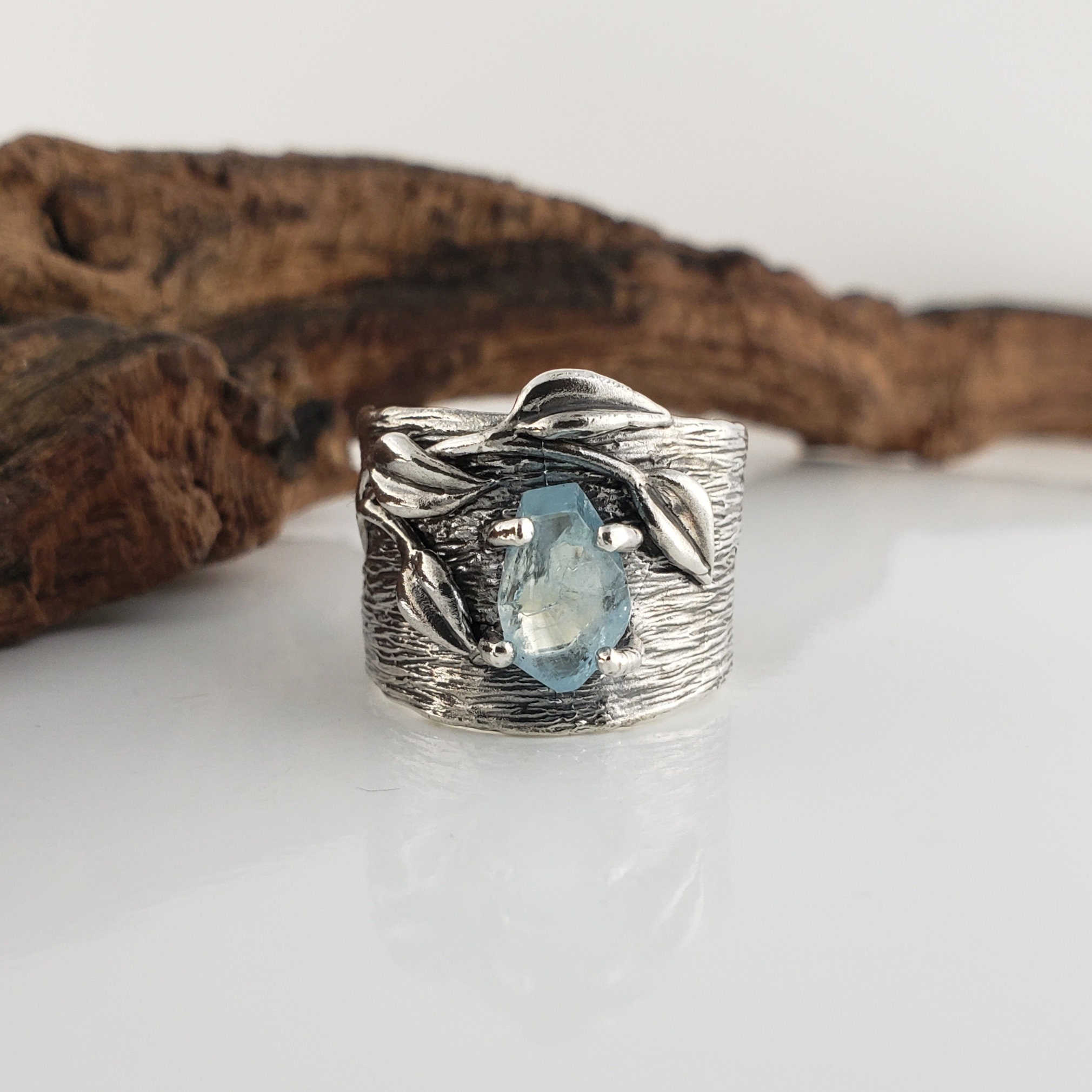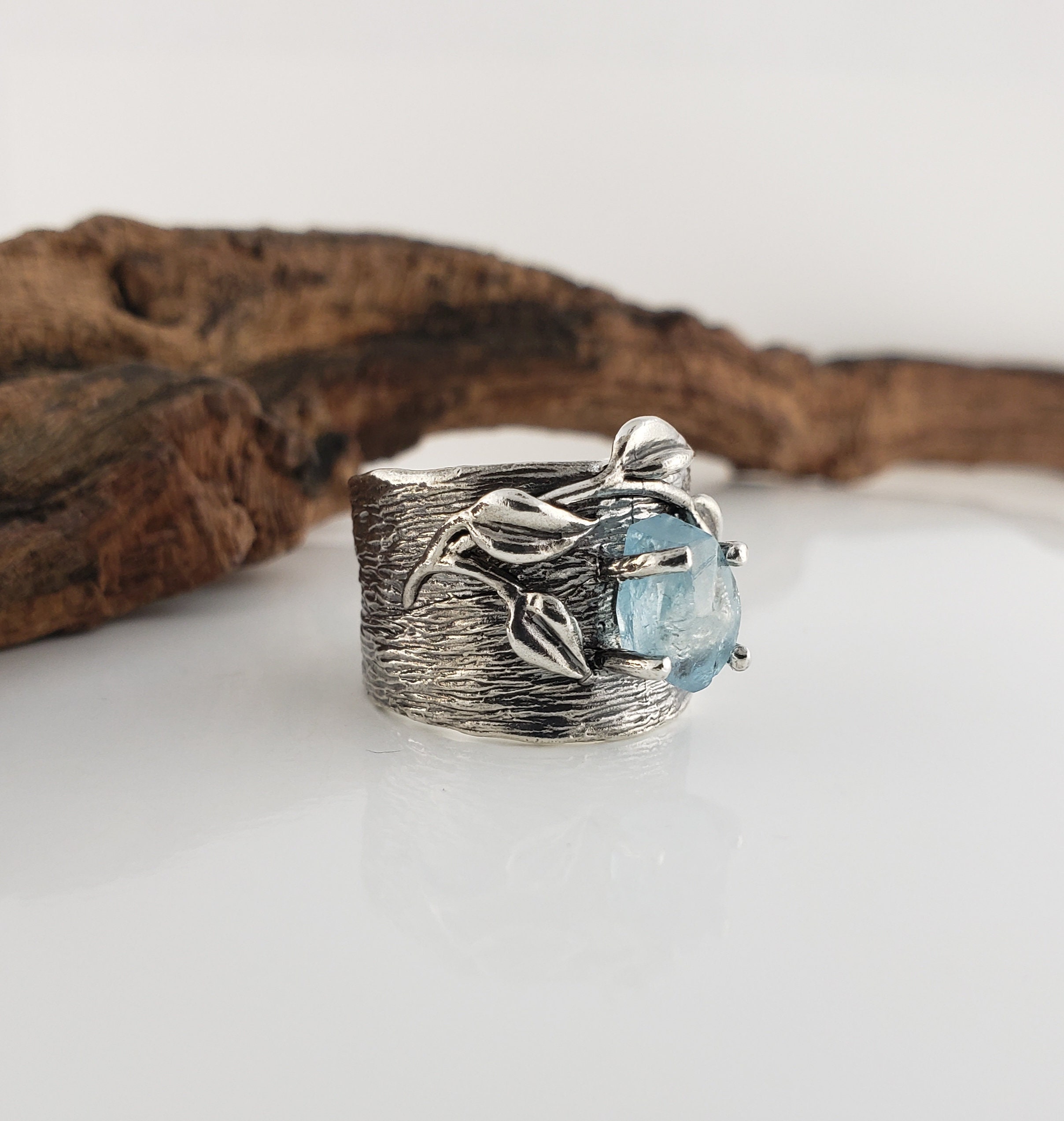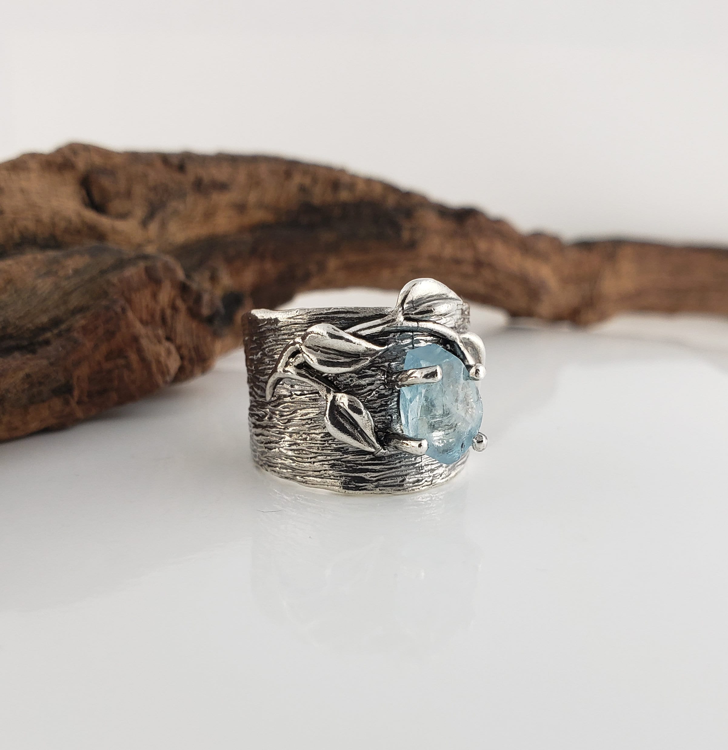 Handmade Sterling Silver Aquamarine Ring – Leaf & Twig Wide Band