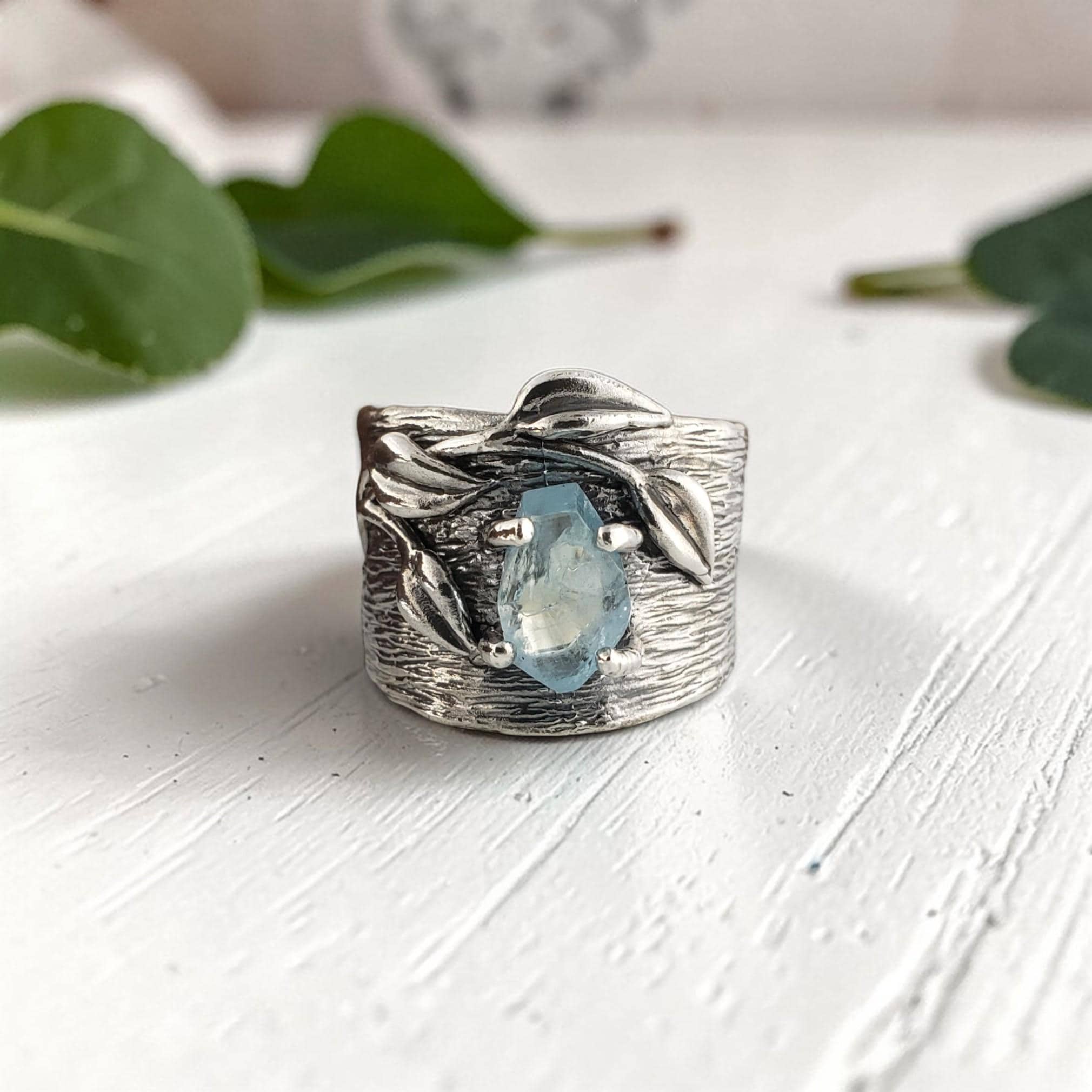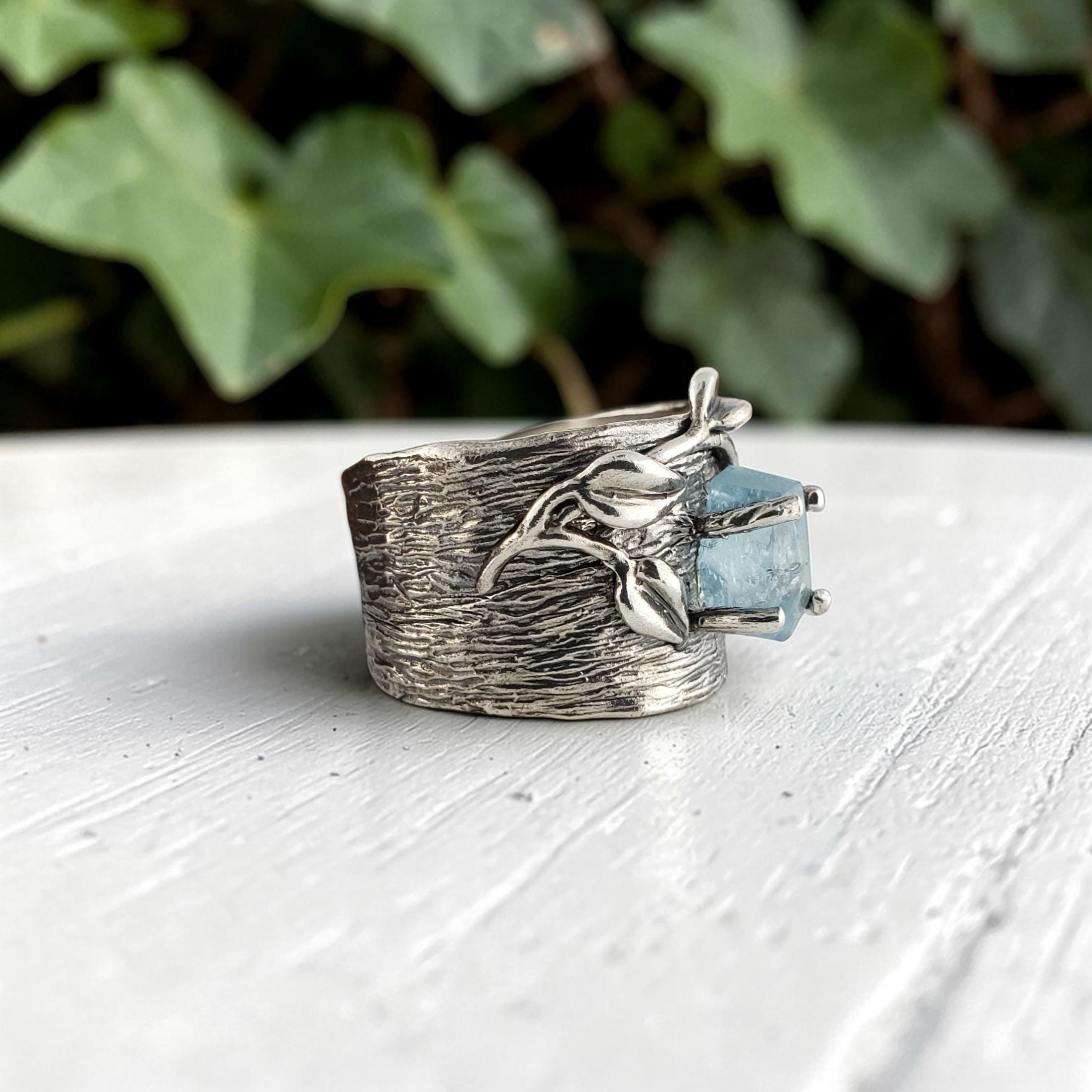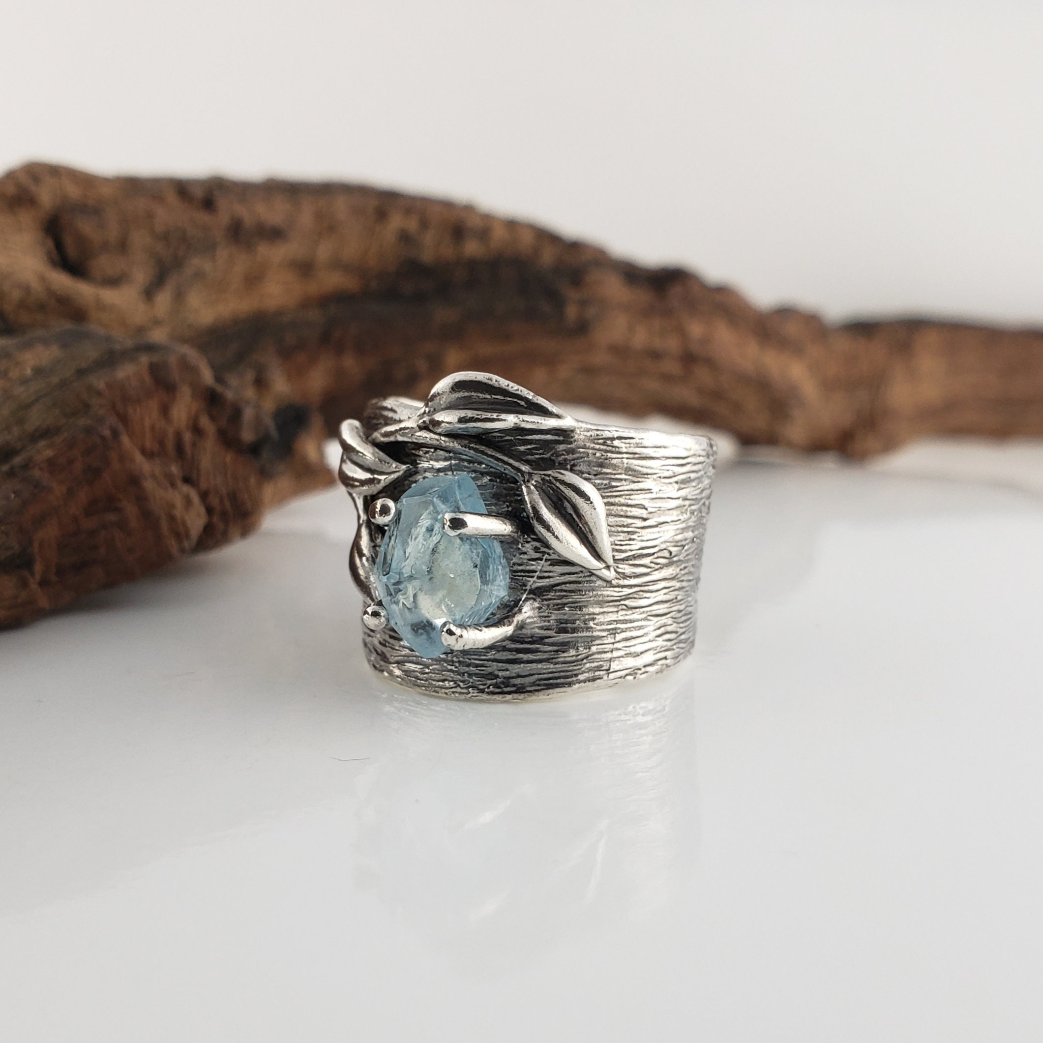 Handmade Sterling Silver Aquamarine Ring – Leaf & Twig Wide Band