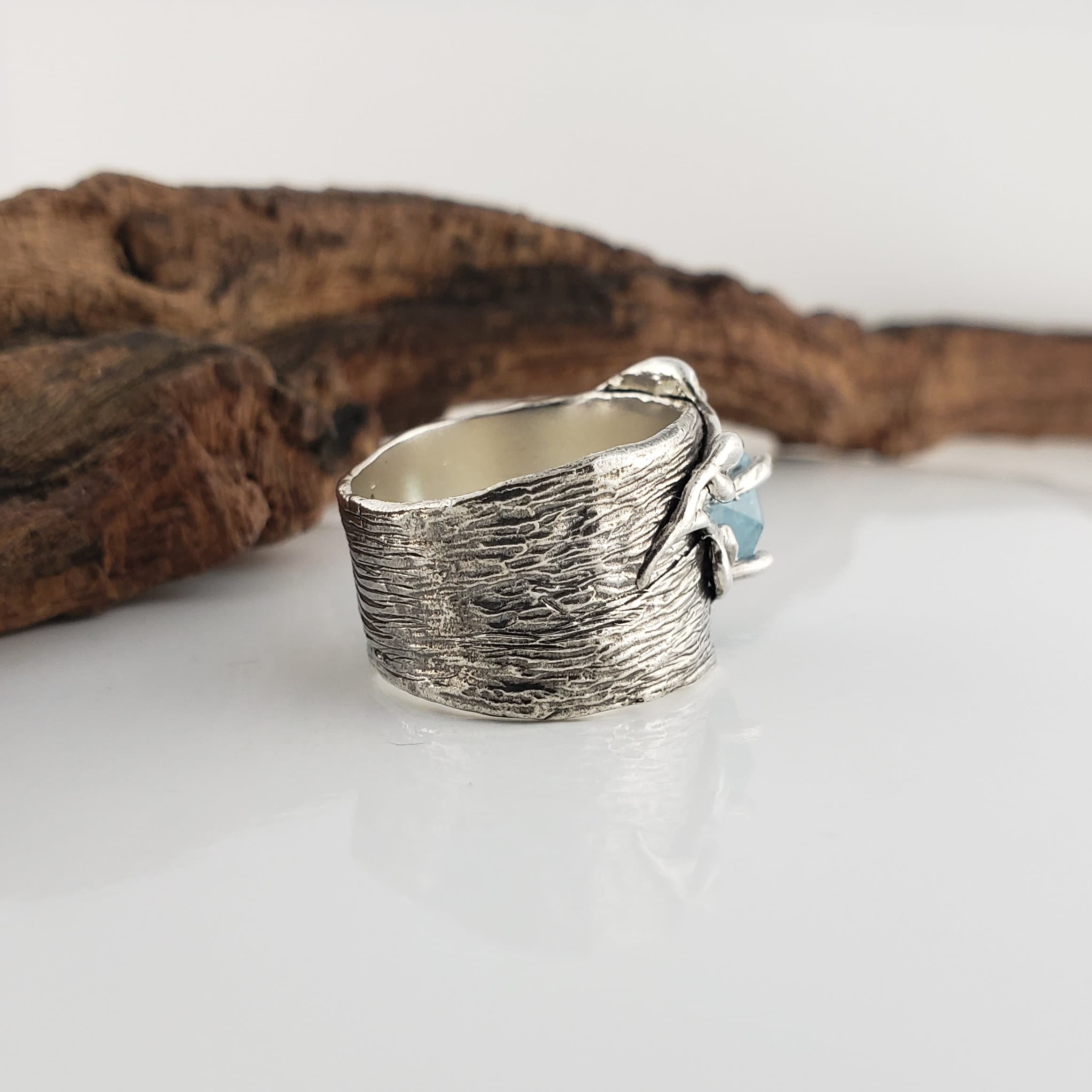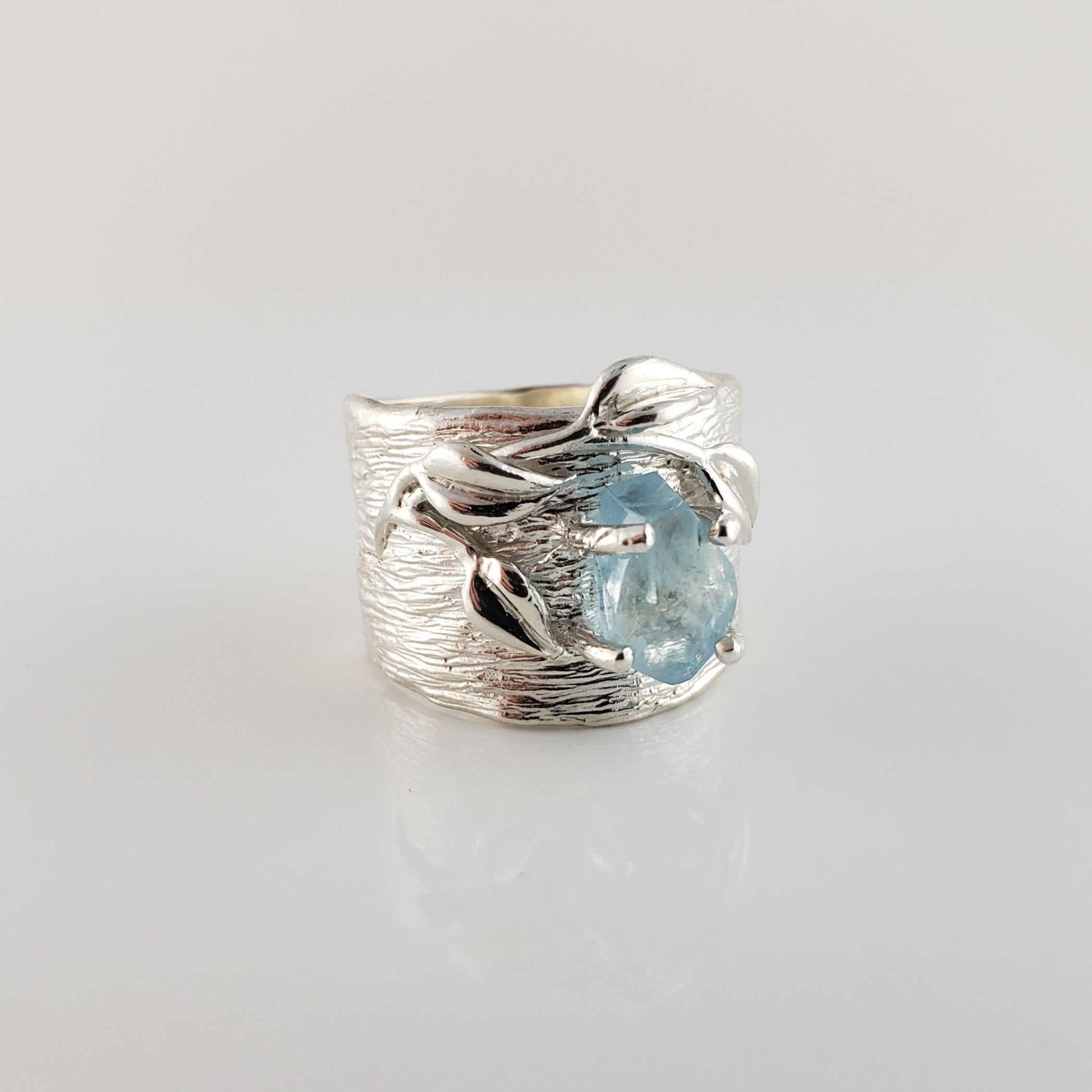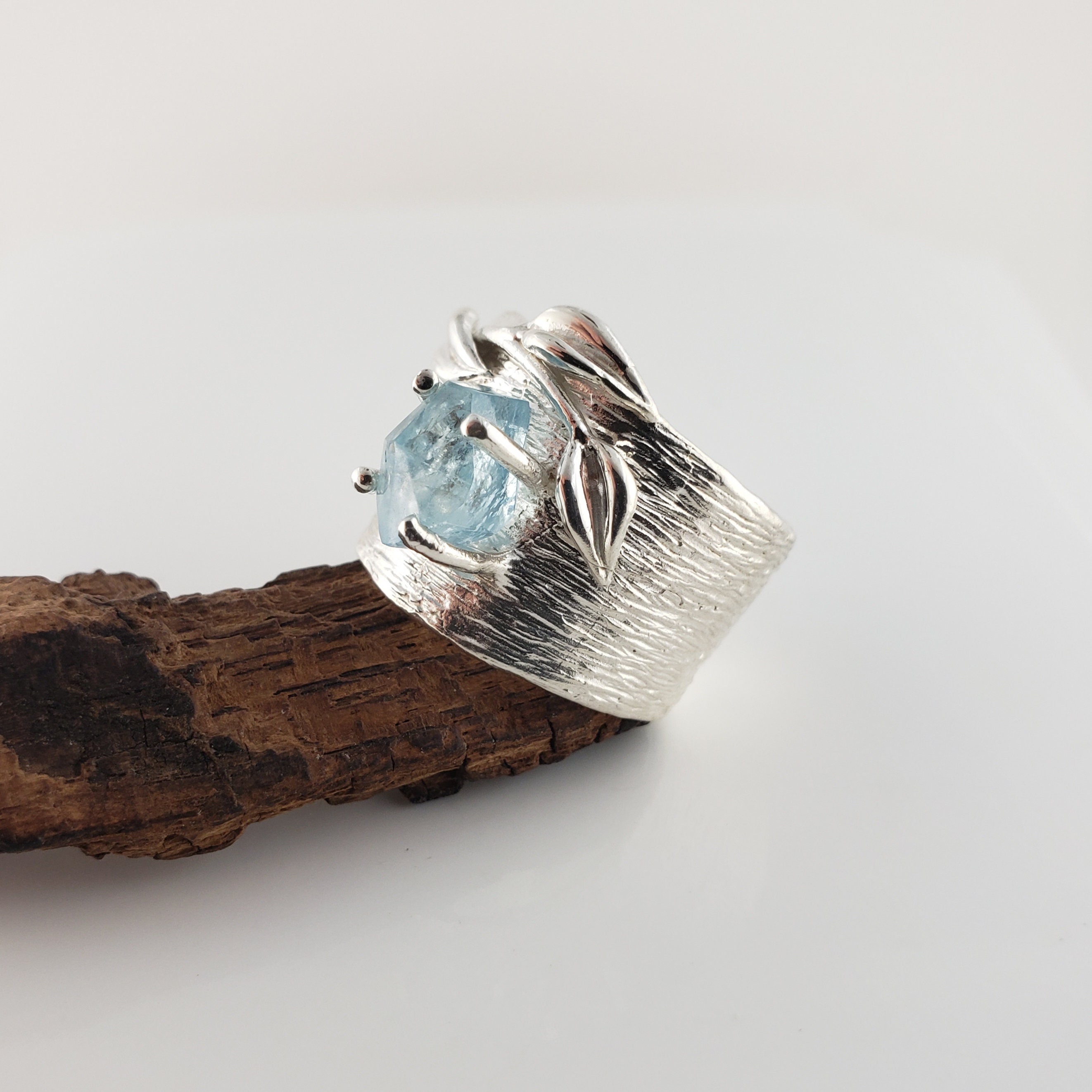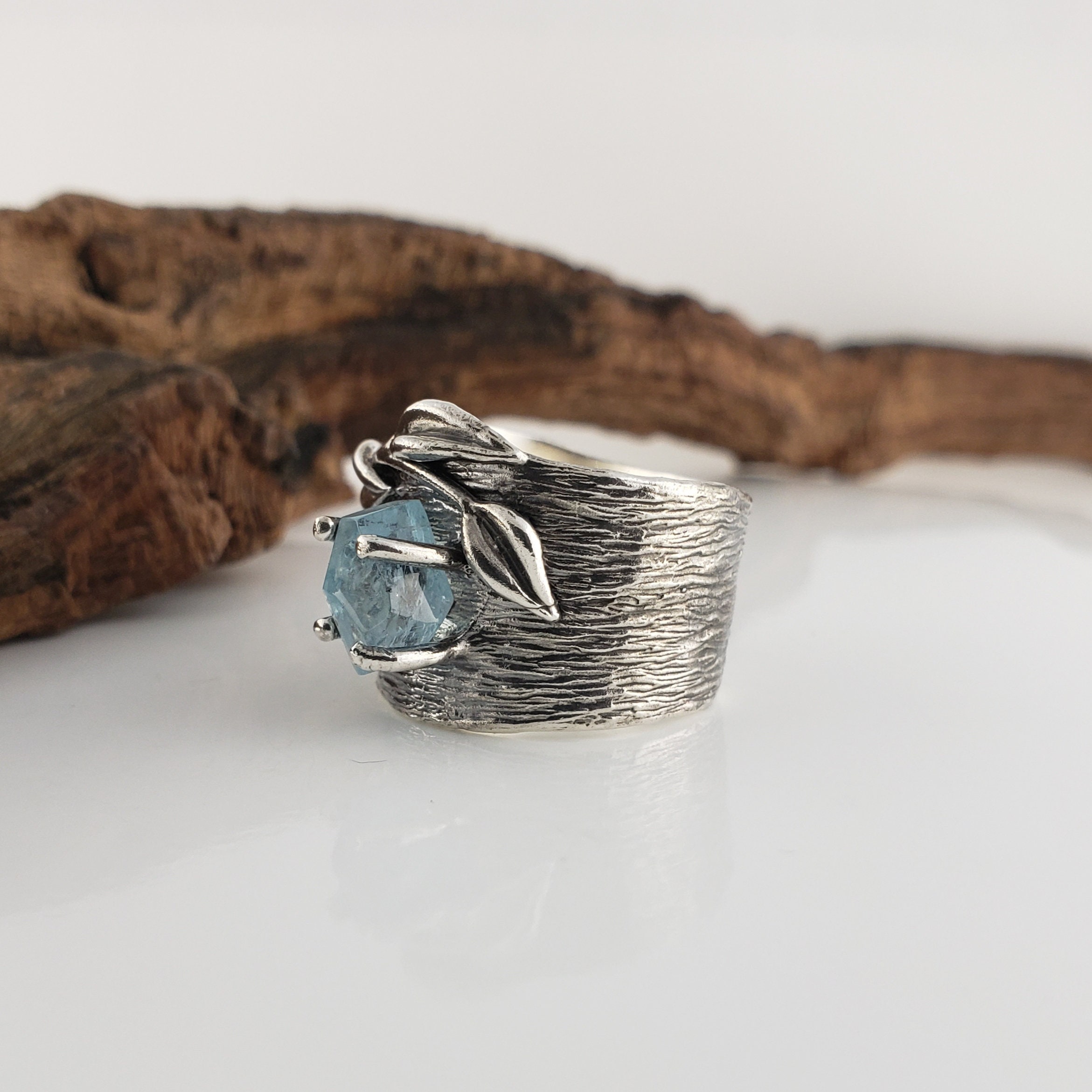 Handmade Sterling Silver Aquamarine Ring – Leaf & Twig Wide Band