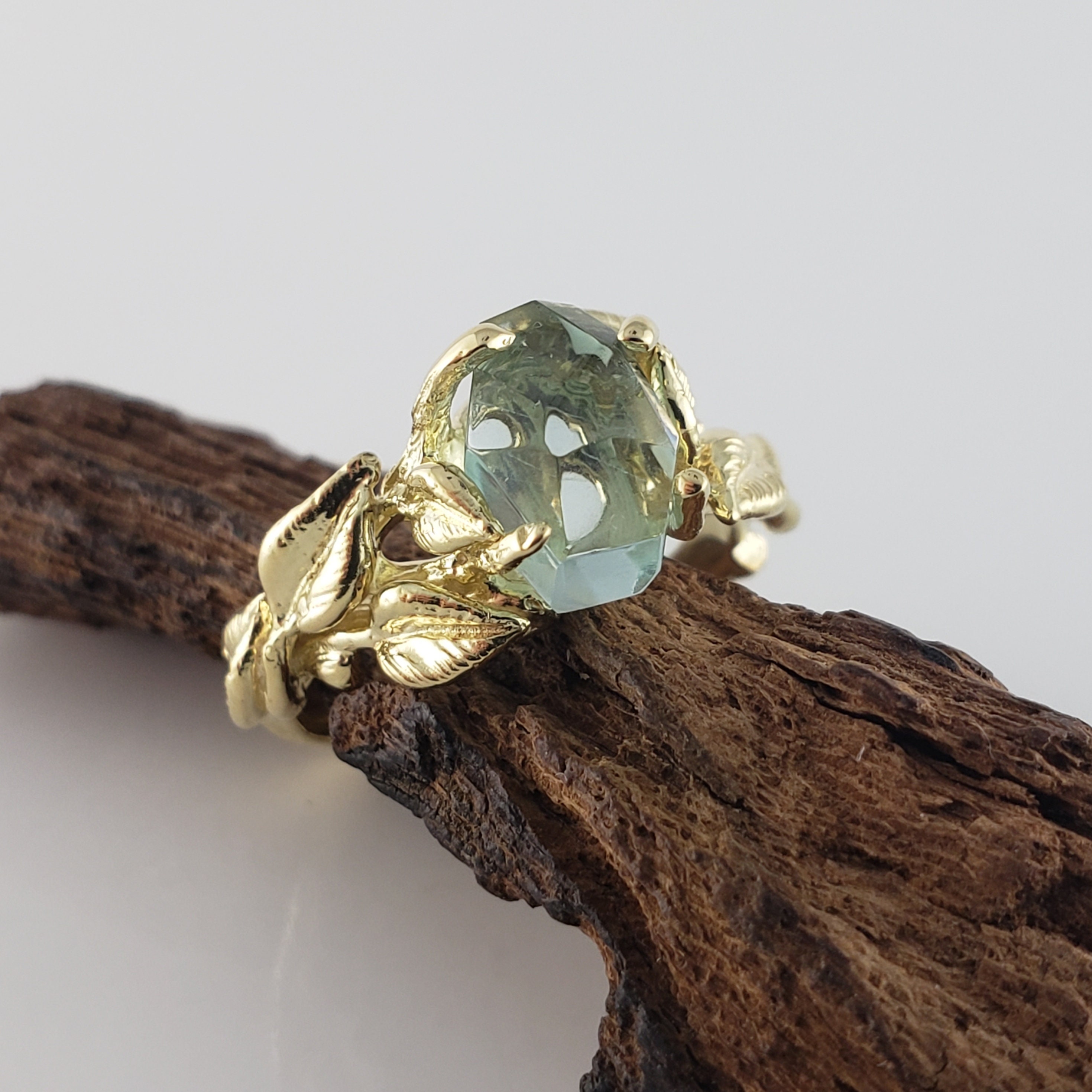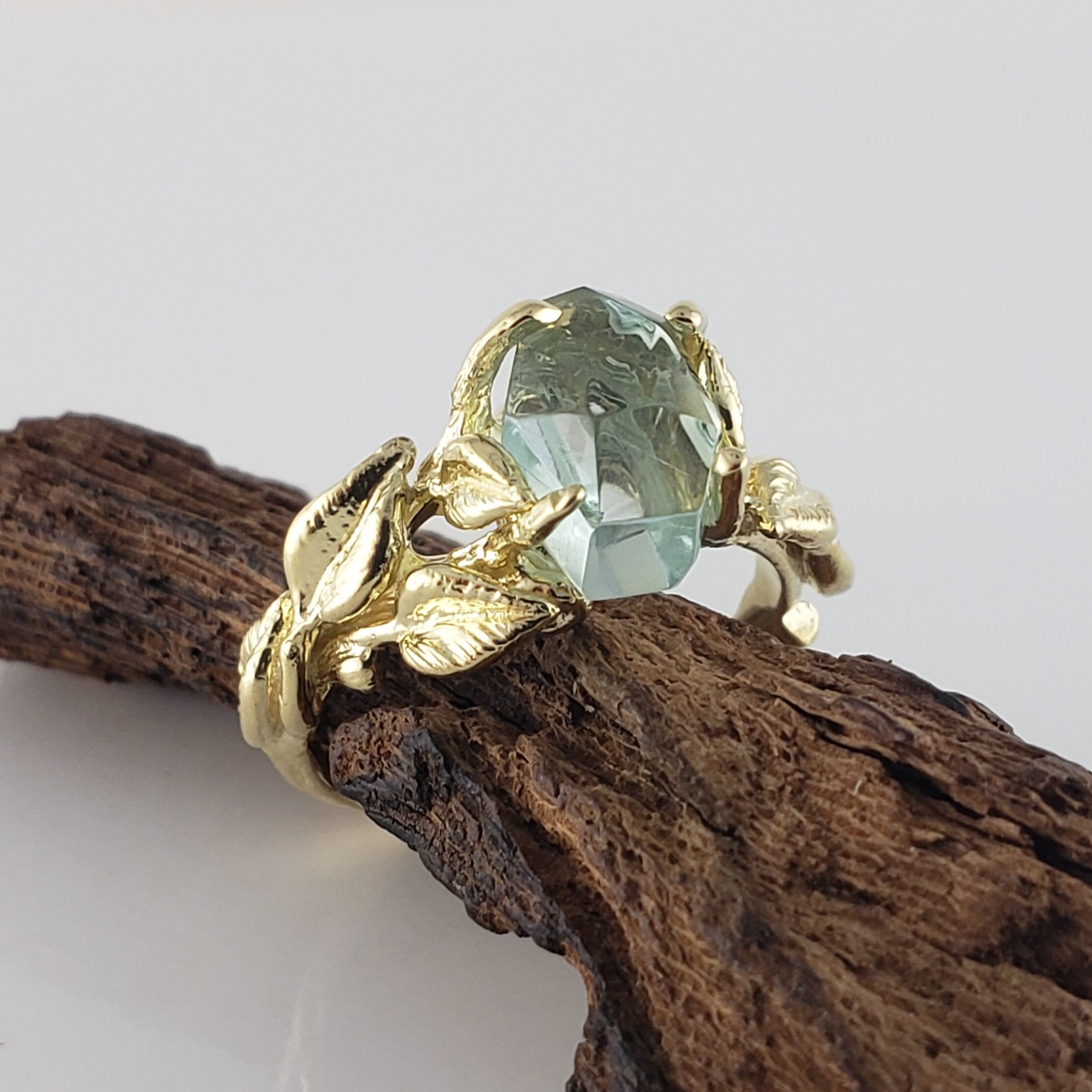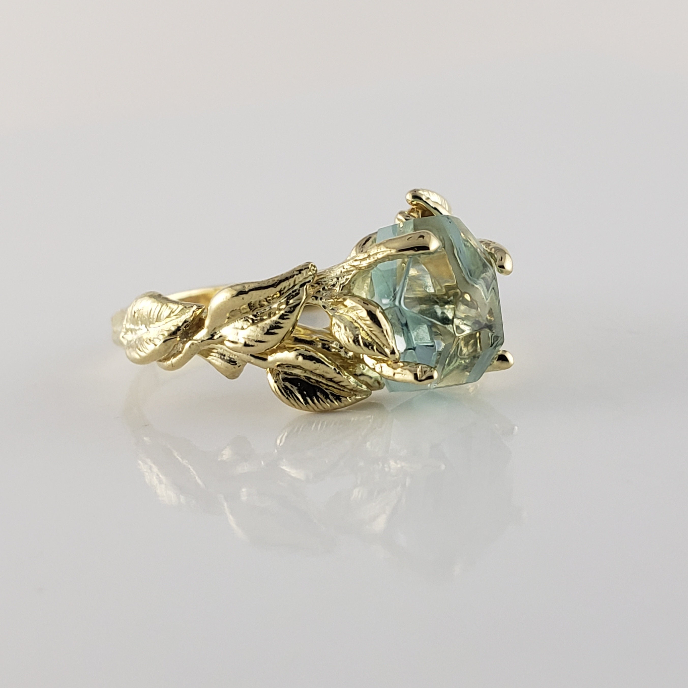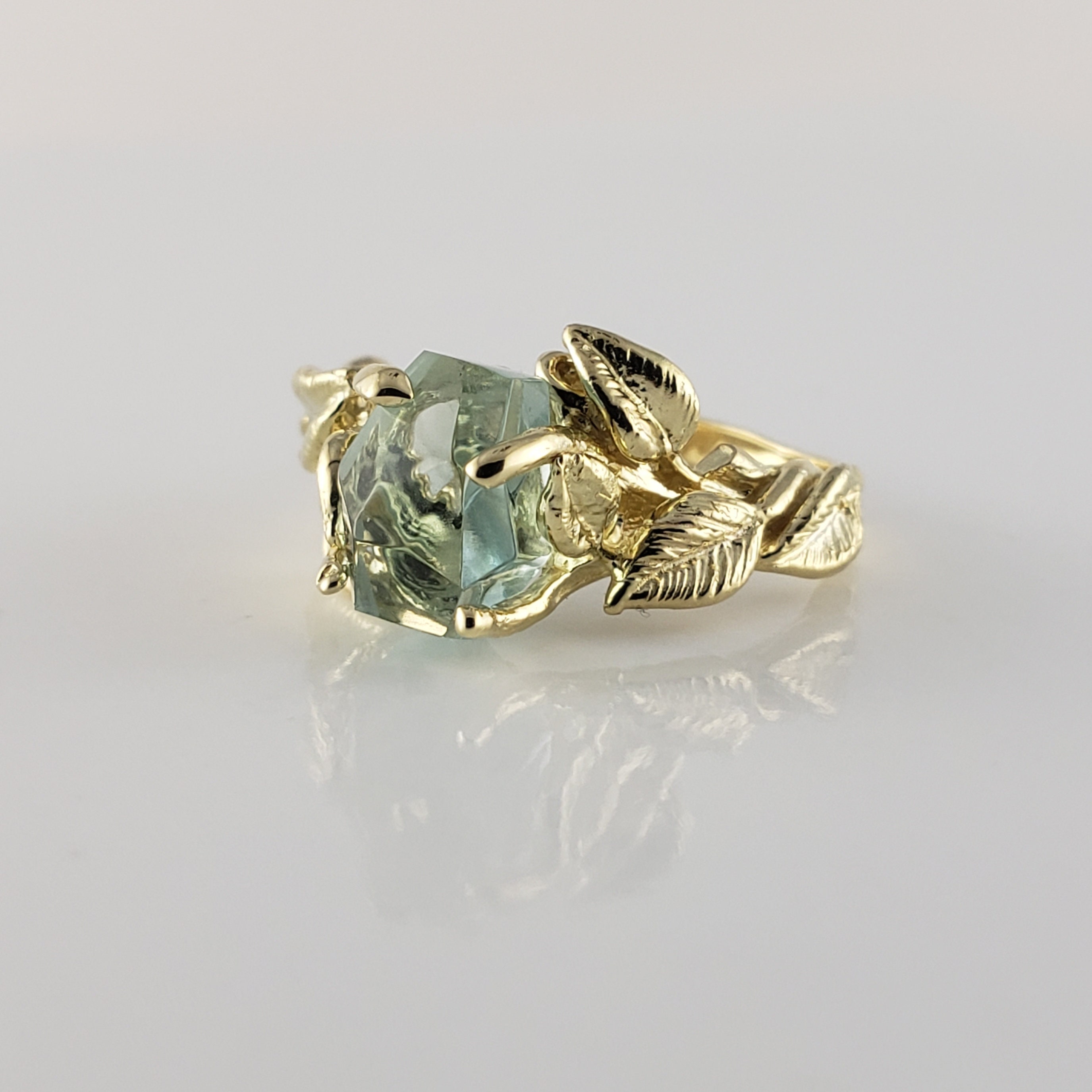 This ring was hand sculpted by Dawn using the lost wax method. Every leaf was hand sculpted and placed on the twig vines and then cast in 18k Yellow Gold (shown). Our gemstones are direct from the ground and hand cut in our studio. These are truly one-of-a-kind rings.
