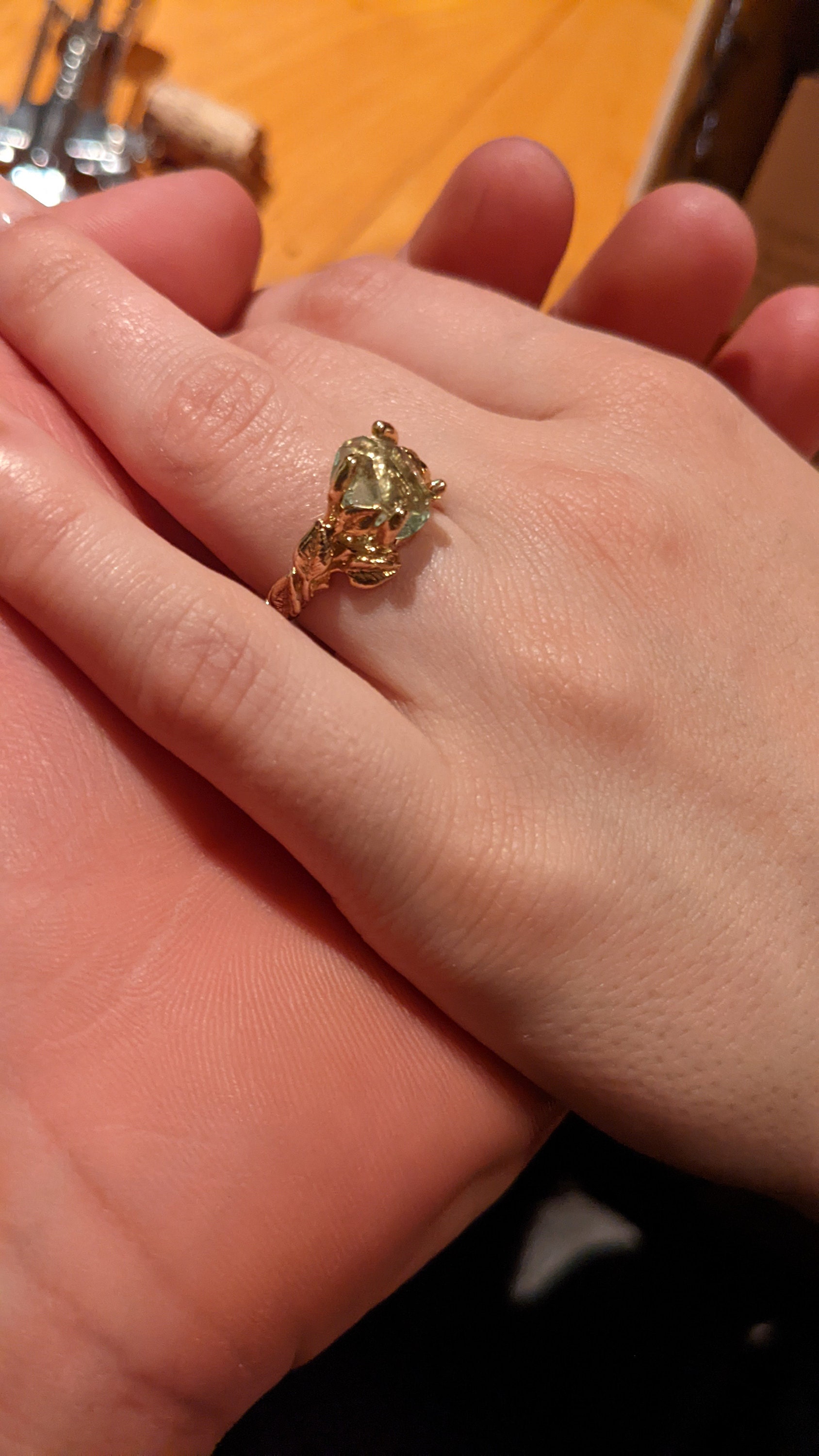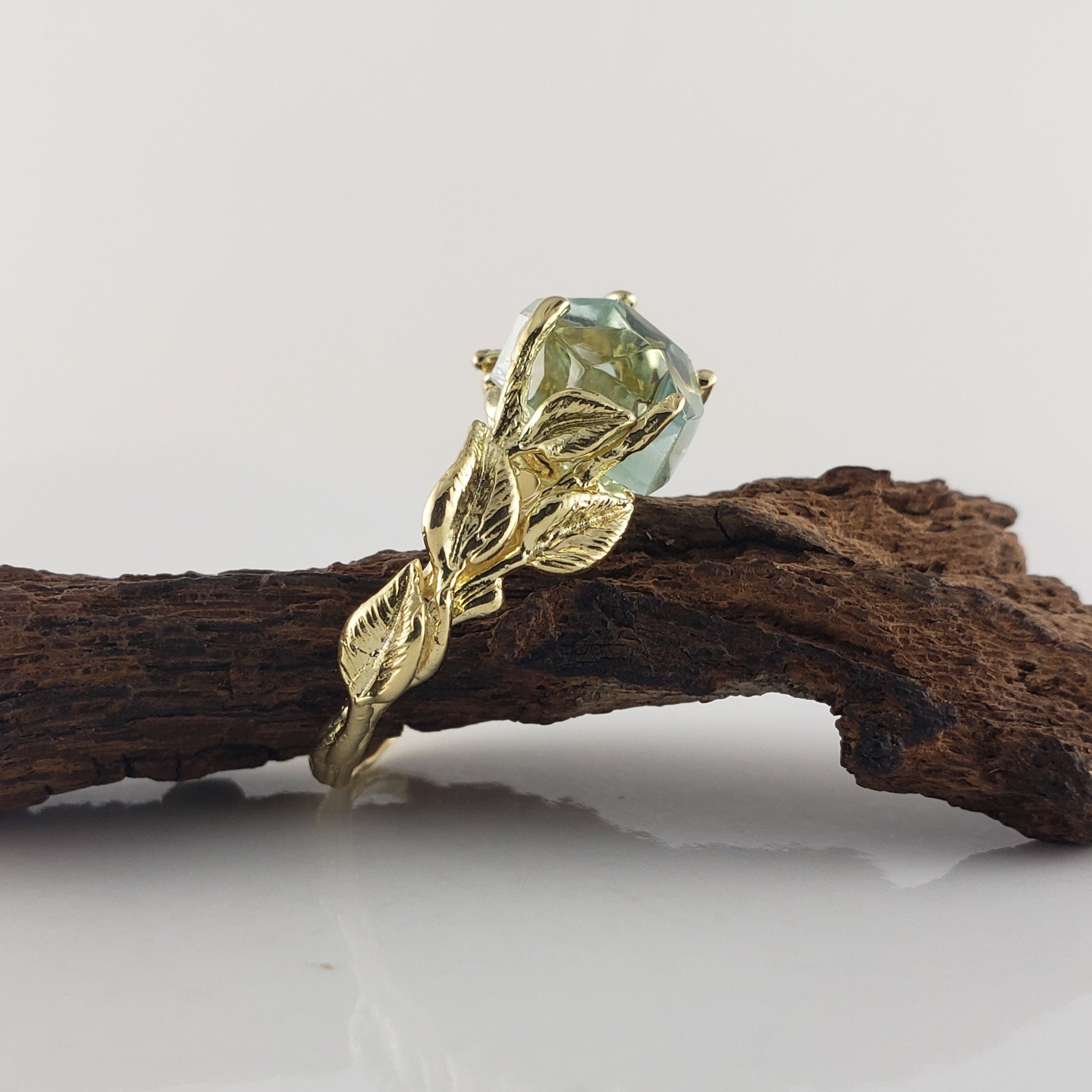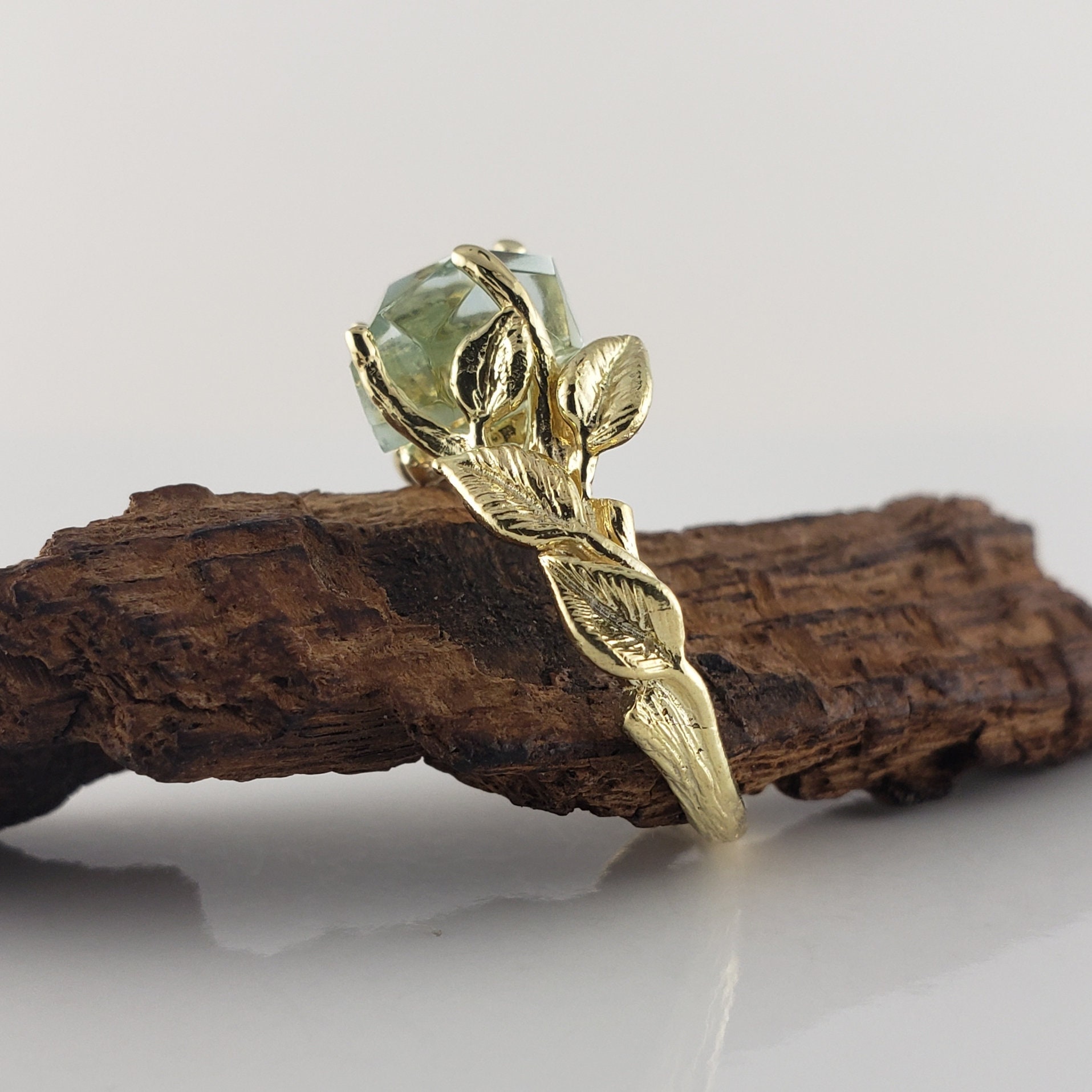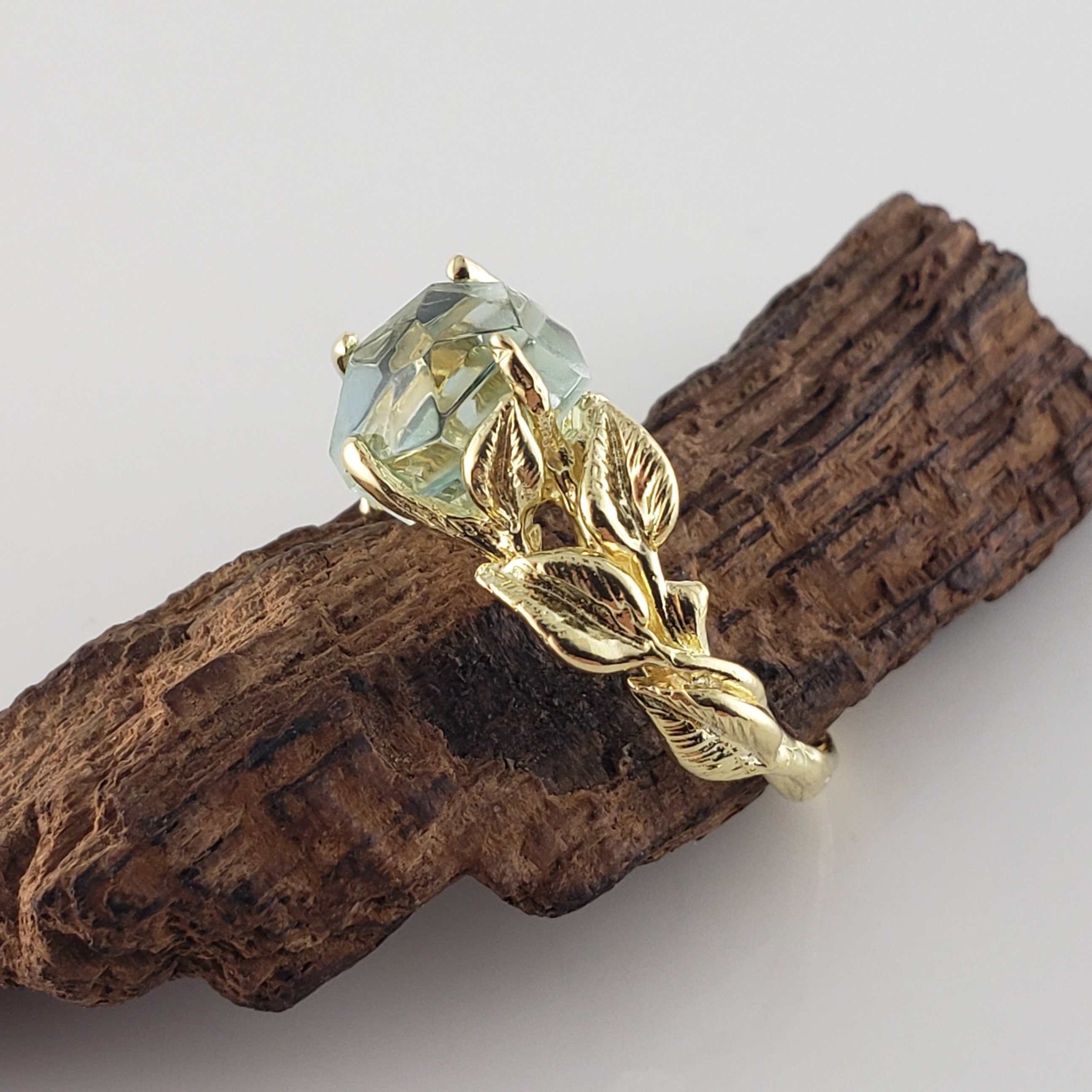 This ring was hand sculpted by Dawn using the lost wax method. Every leaf was hand sculpted and placed on the twig vines and then cast in 18k Yellow Gold (shown). Our gemstones are direct from the ground and hand cut in our studio. These are truly one-of-a-kind rings.