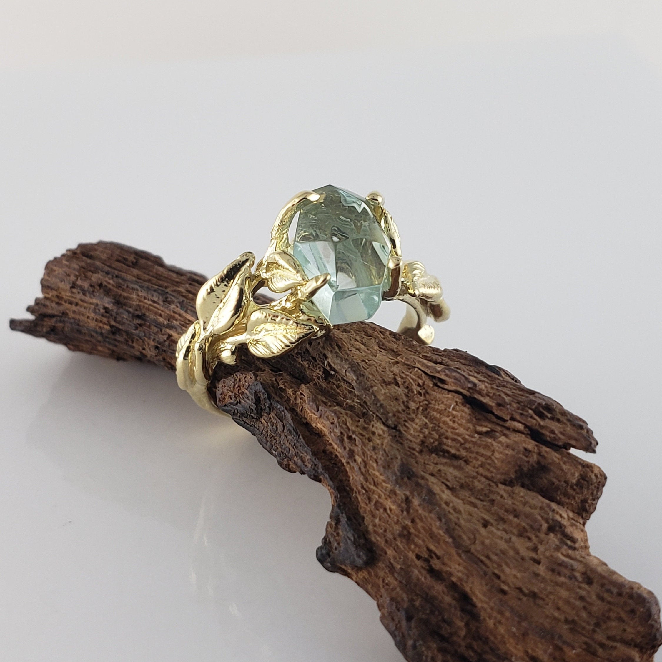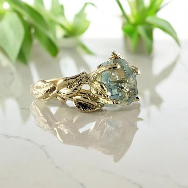 Unique Raw Aquamarine Leaf Engagement Ring - Twig Setting in Solid Gold by DV Designs