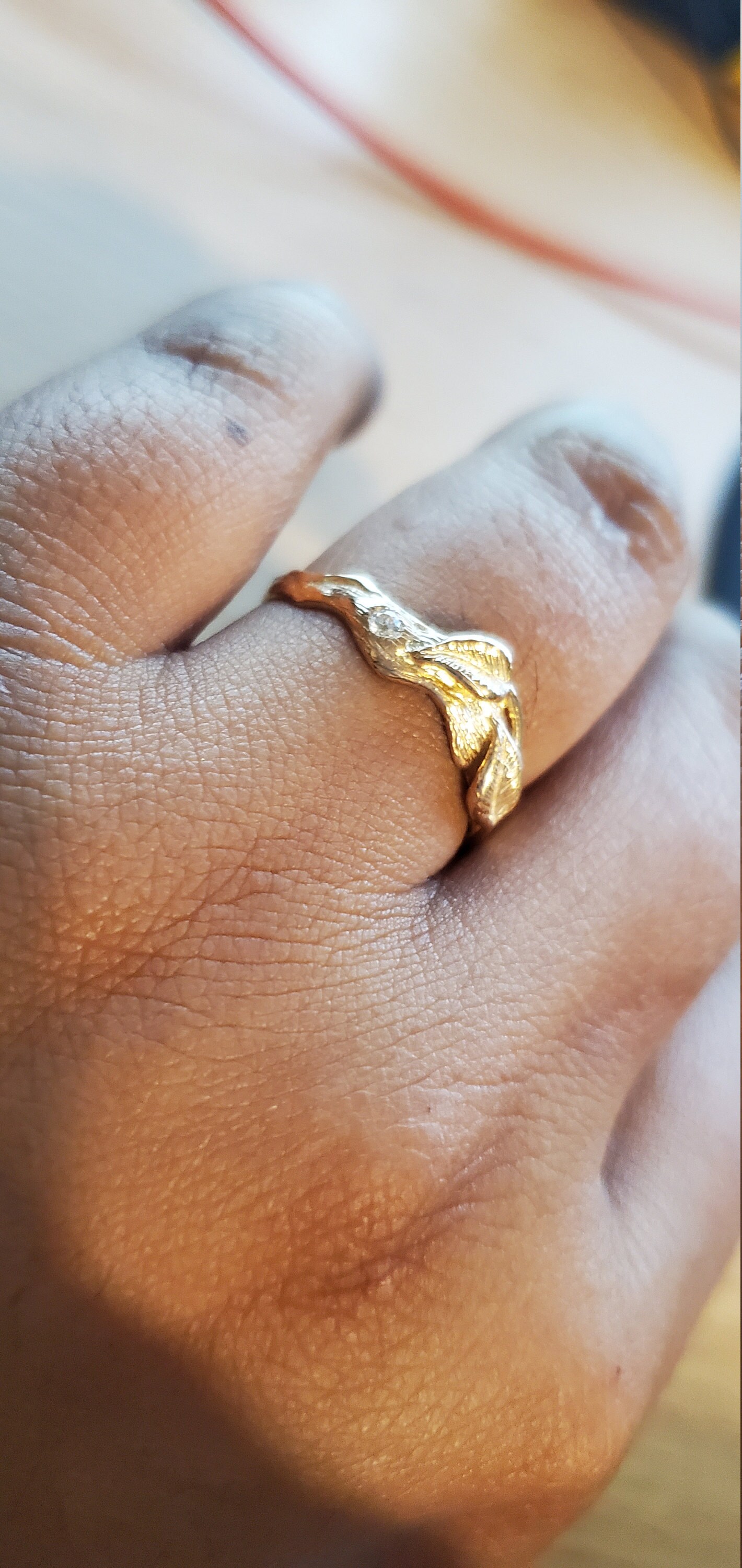 This ring is stunning. I received an engagement ring from her and decided to get the matching band. Unfortunately the band didn’t quite work with the engagement ring so she hand carved the ring to make a perfect fit. Wonderful customer service and very friendly and fast.