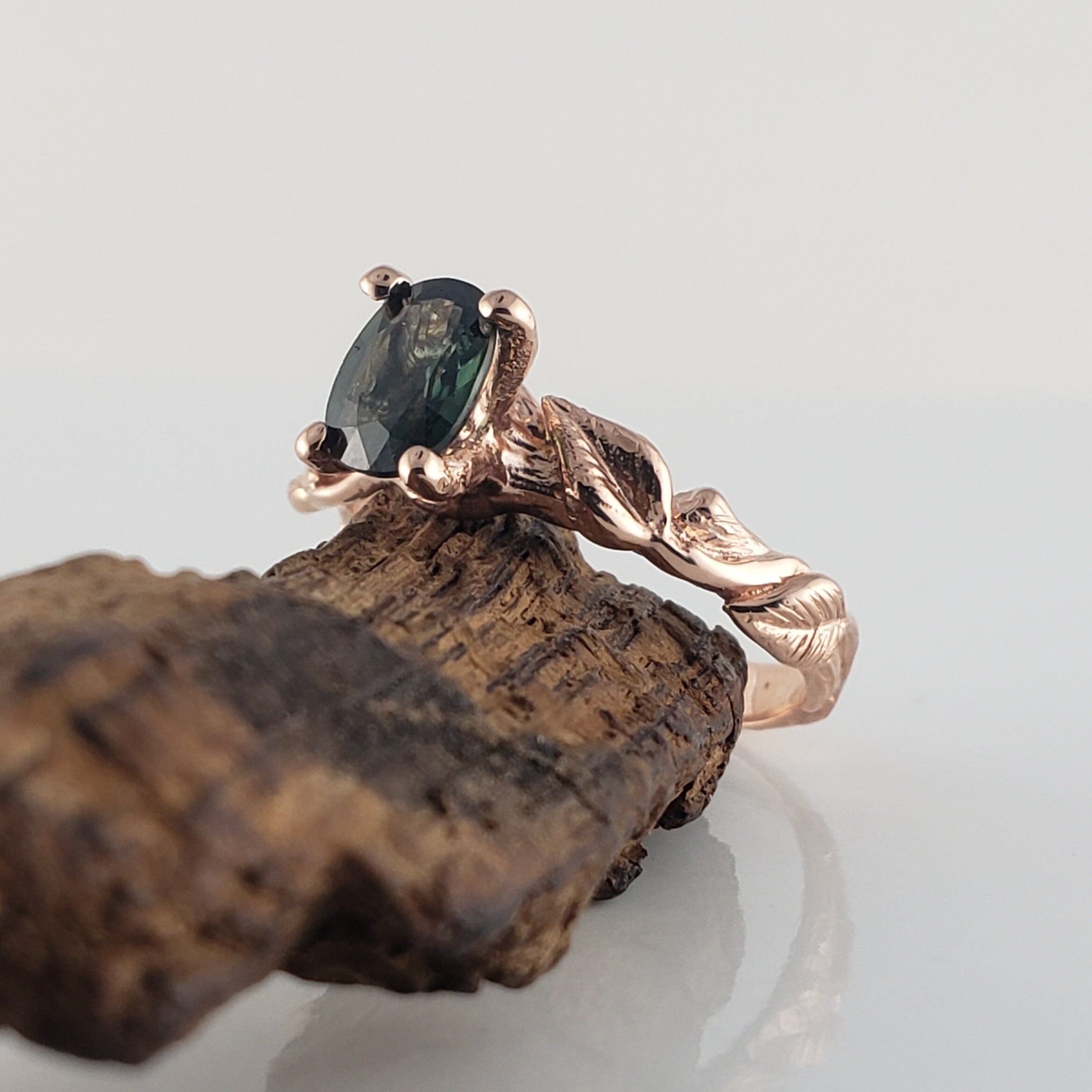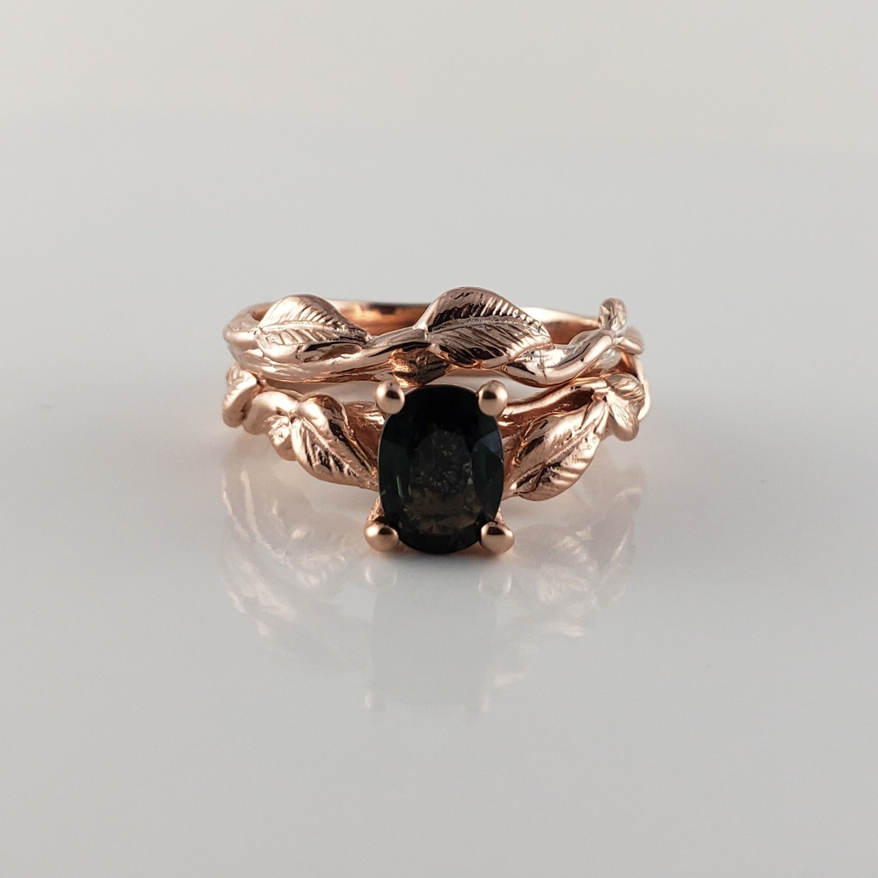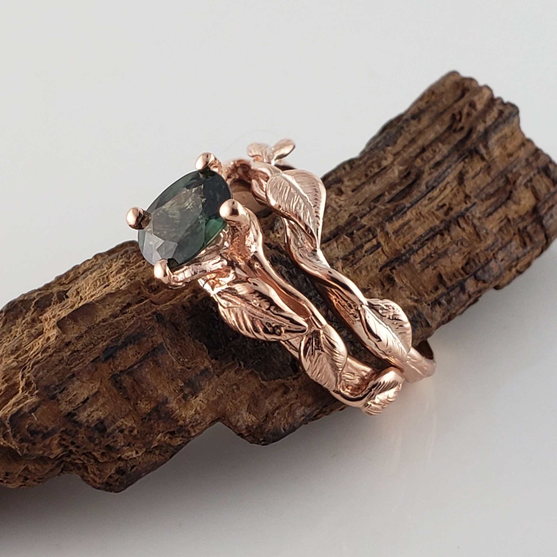 Green Oval Sapphire Twig and Leaf Bridal Set - Solid Gold Engagement Ring by DV Jewelry Designs
