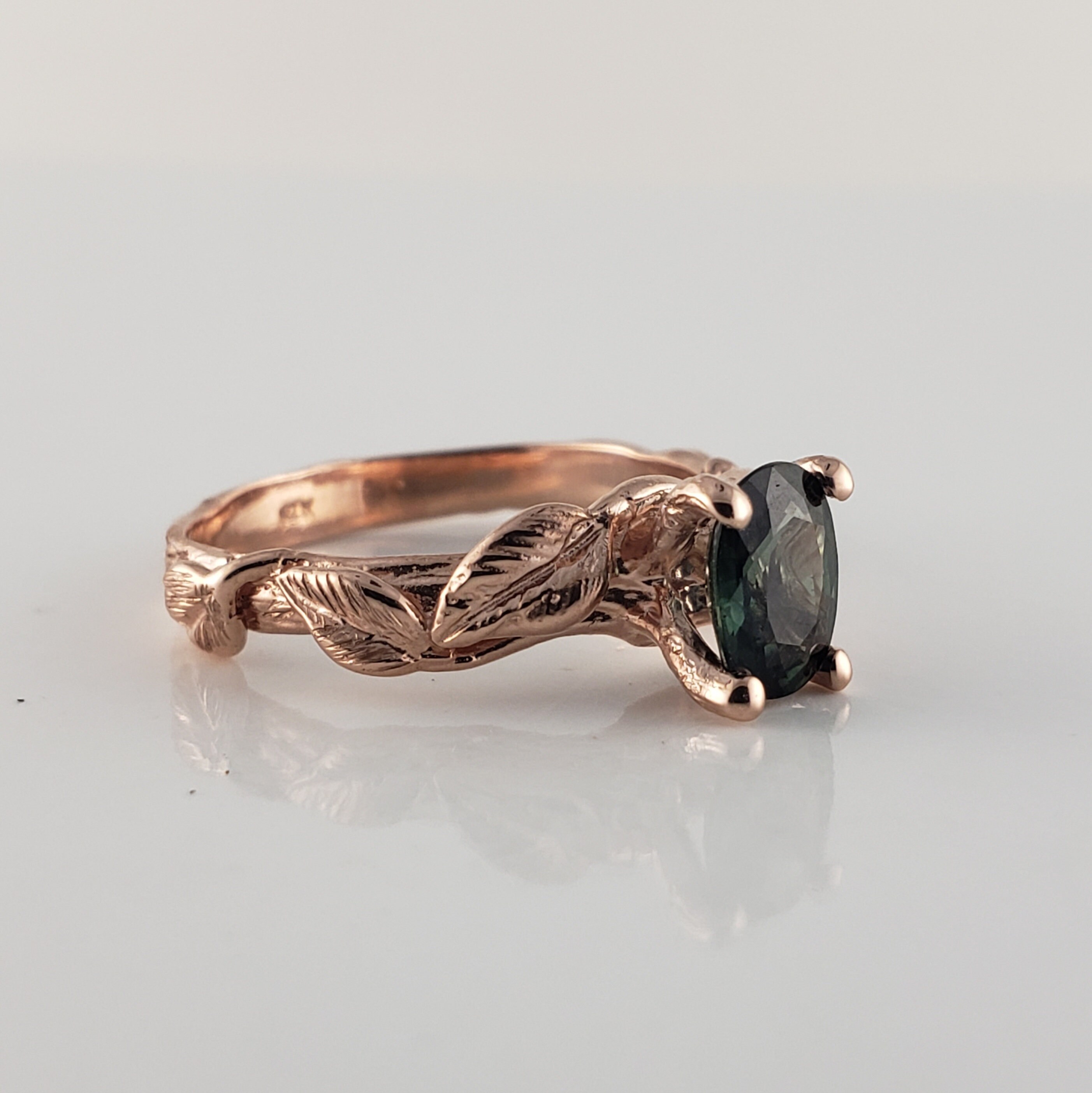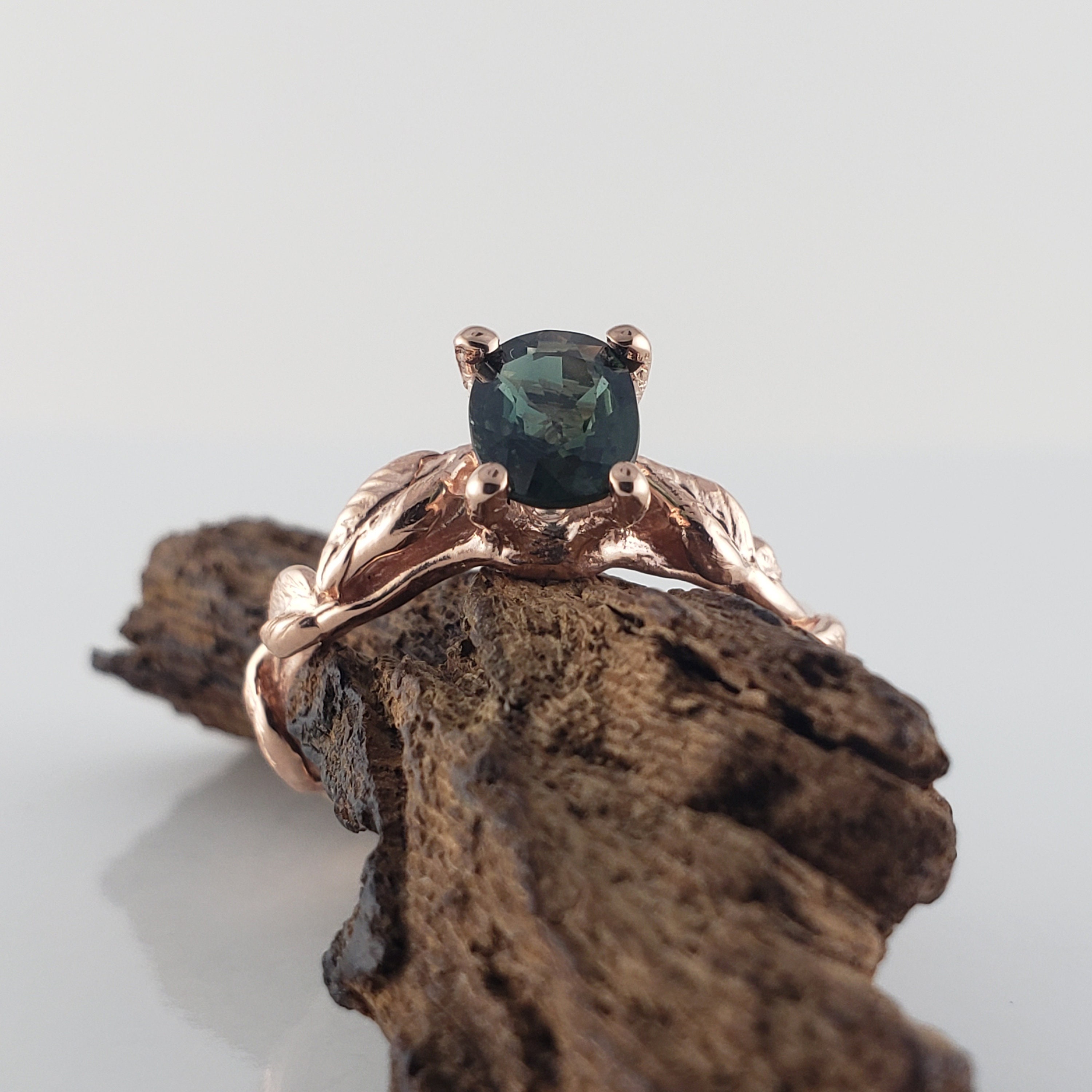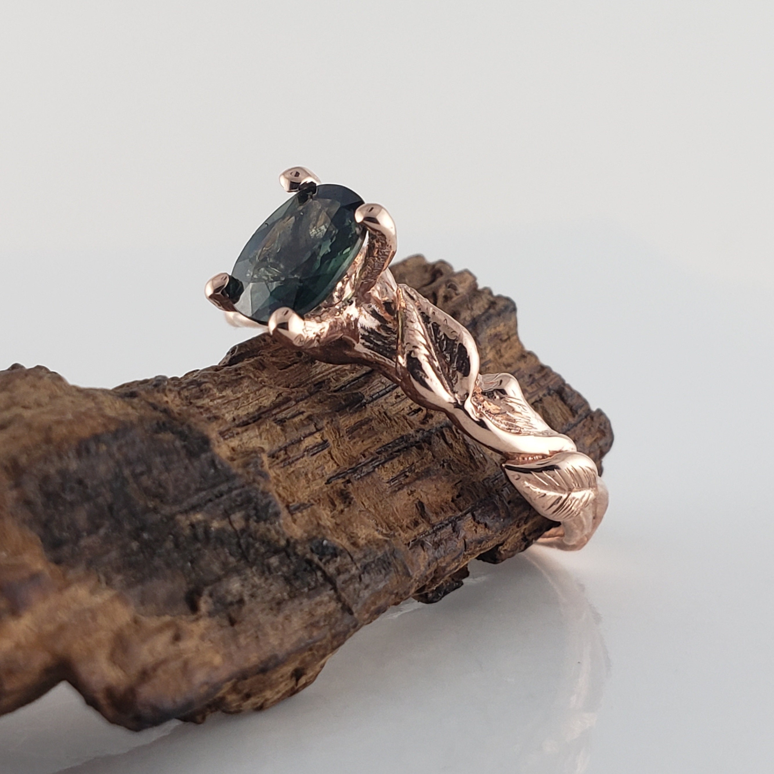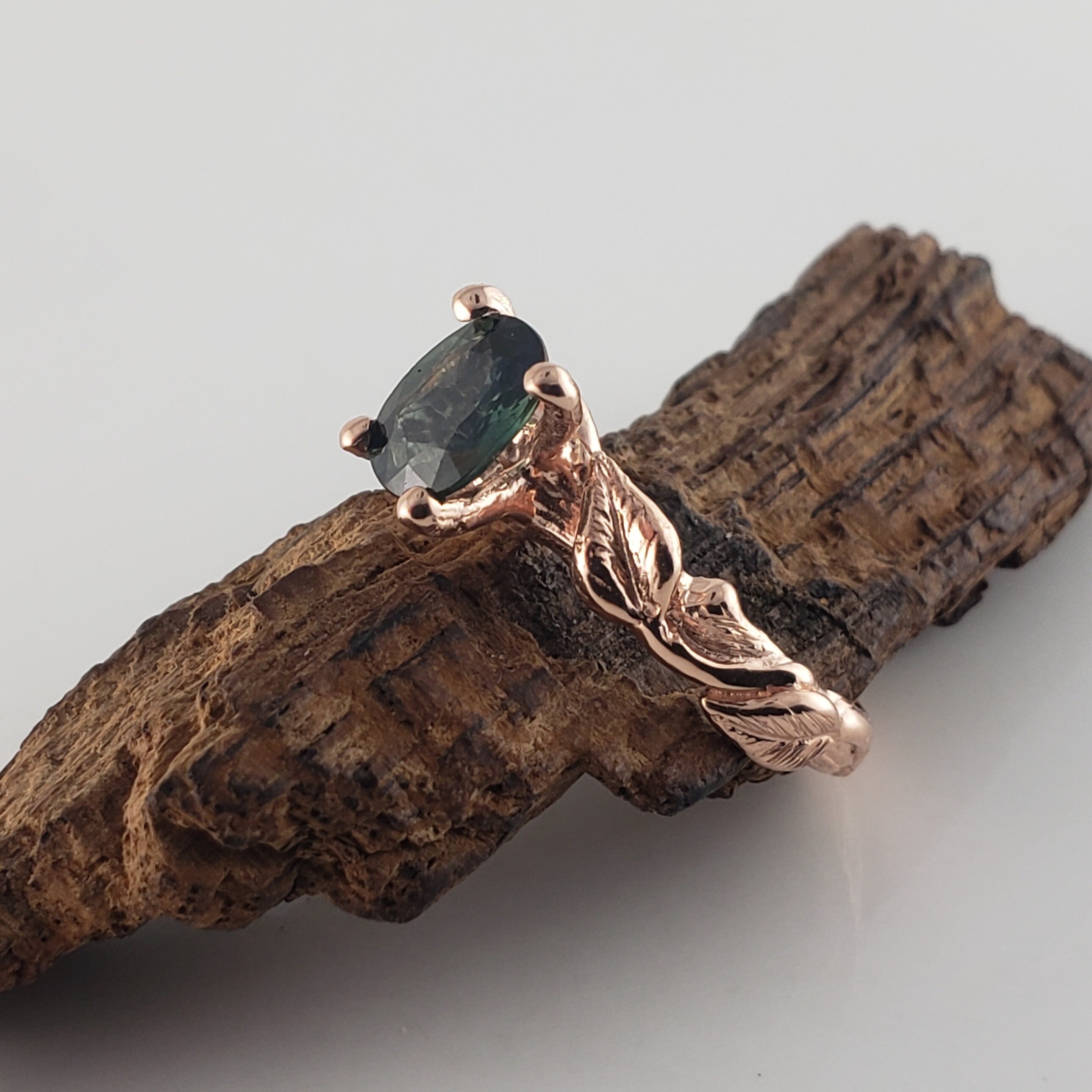 Green Oval Sapphire Twig and Leaf Bridal Set - Solid Gold Engagement Ring by DV Jewelry Designs