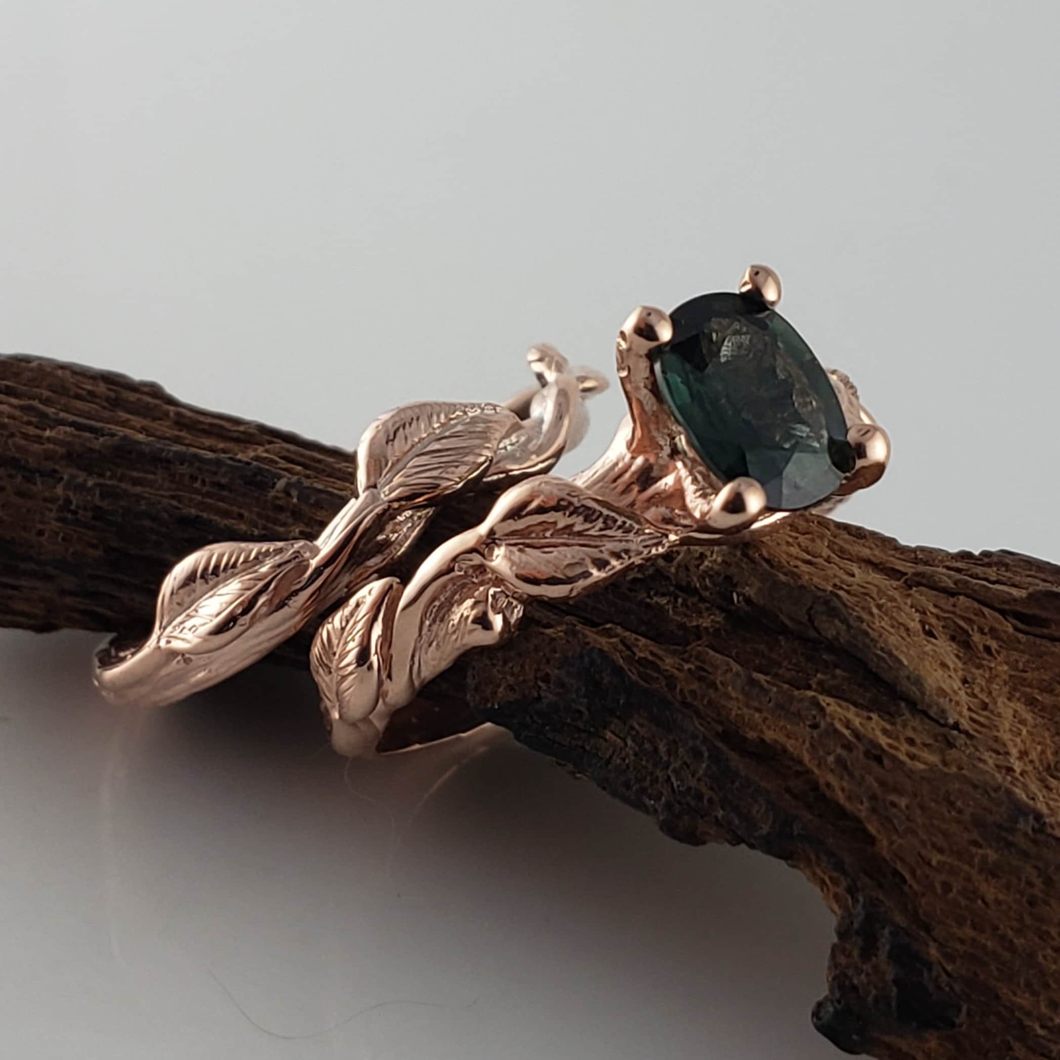 Green Sapphire Twig and Leaf Bridal Set - Solid Gold Engagement Ring by DV Jewelry Designs