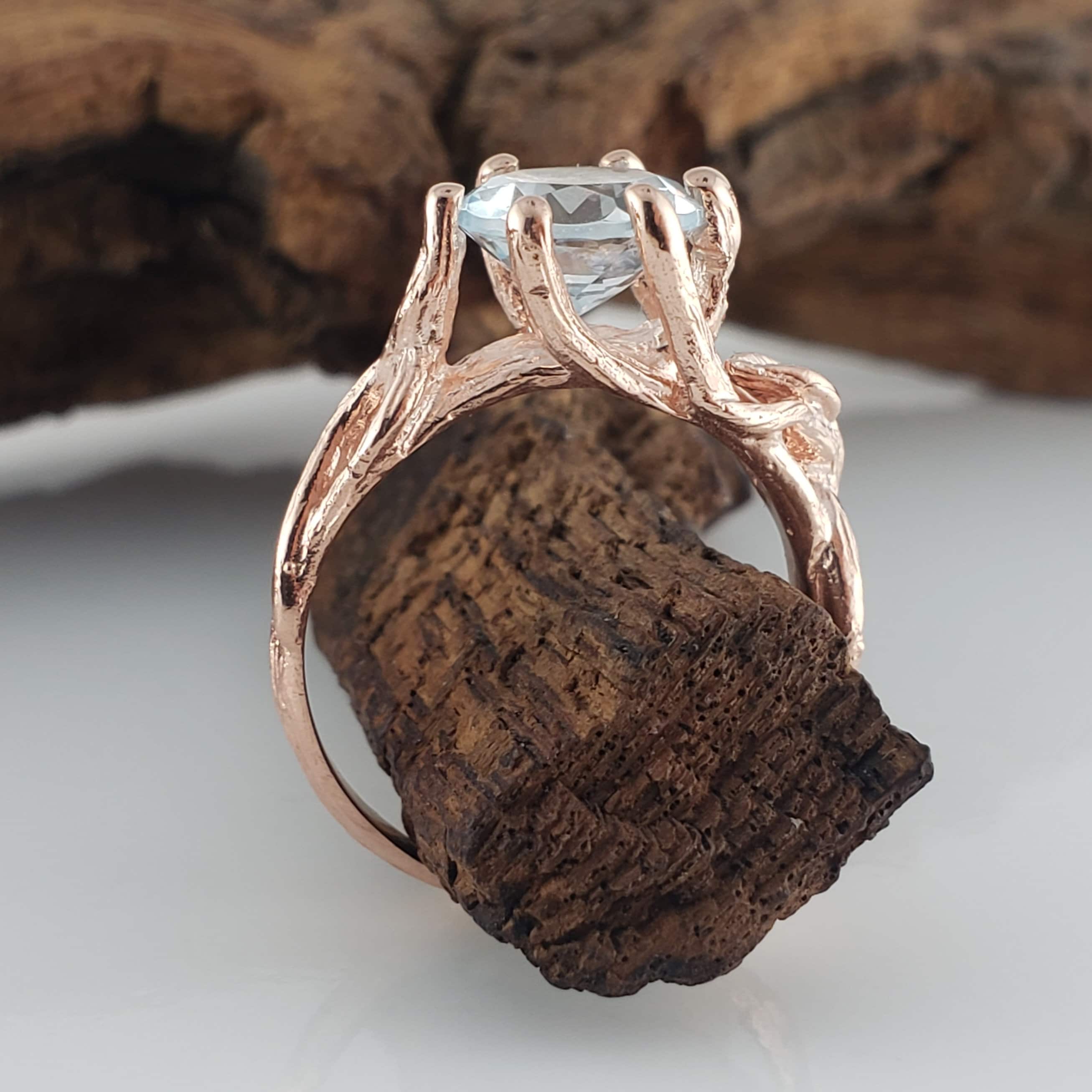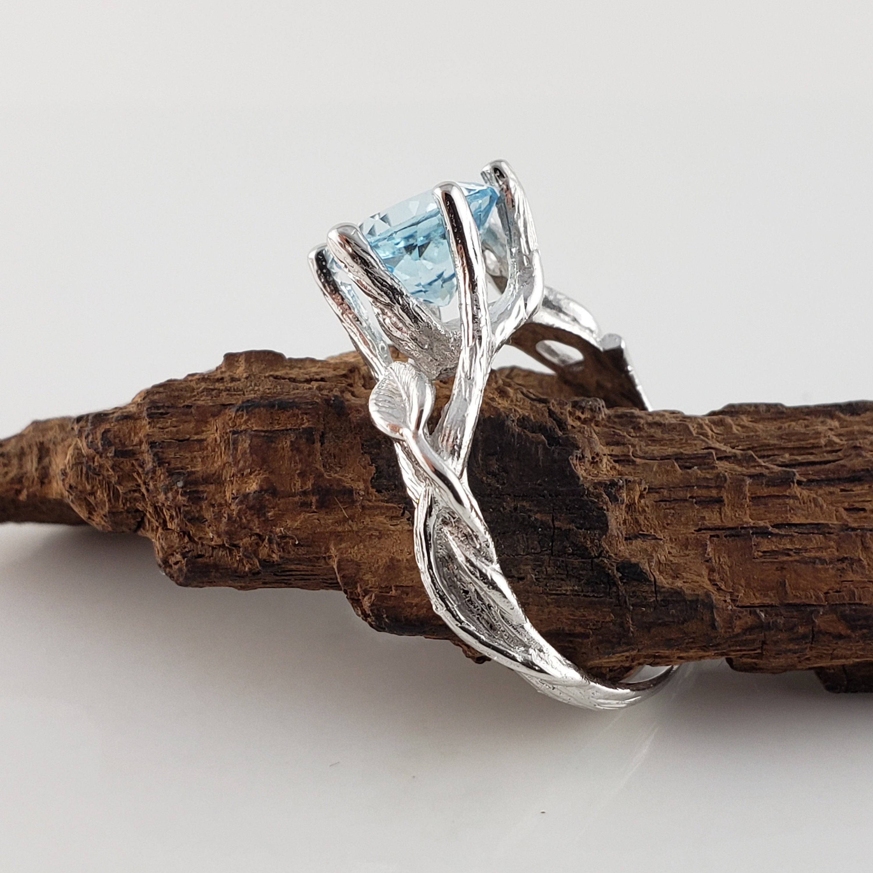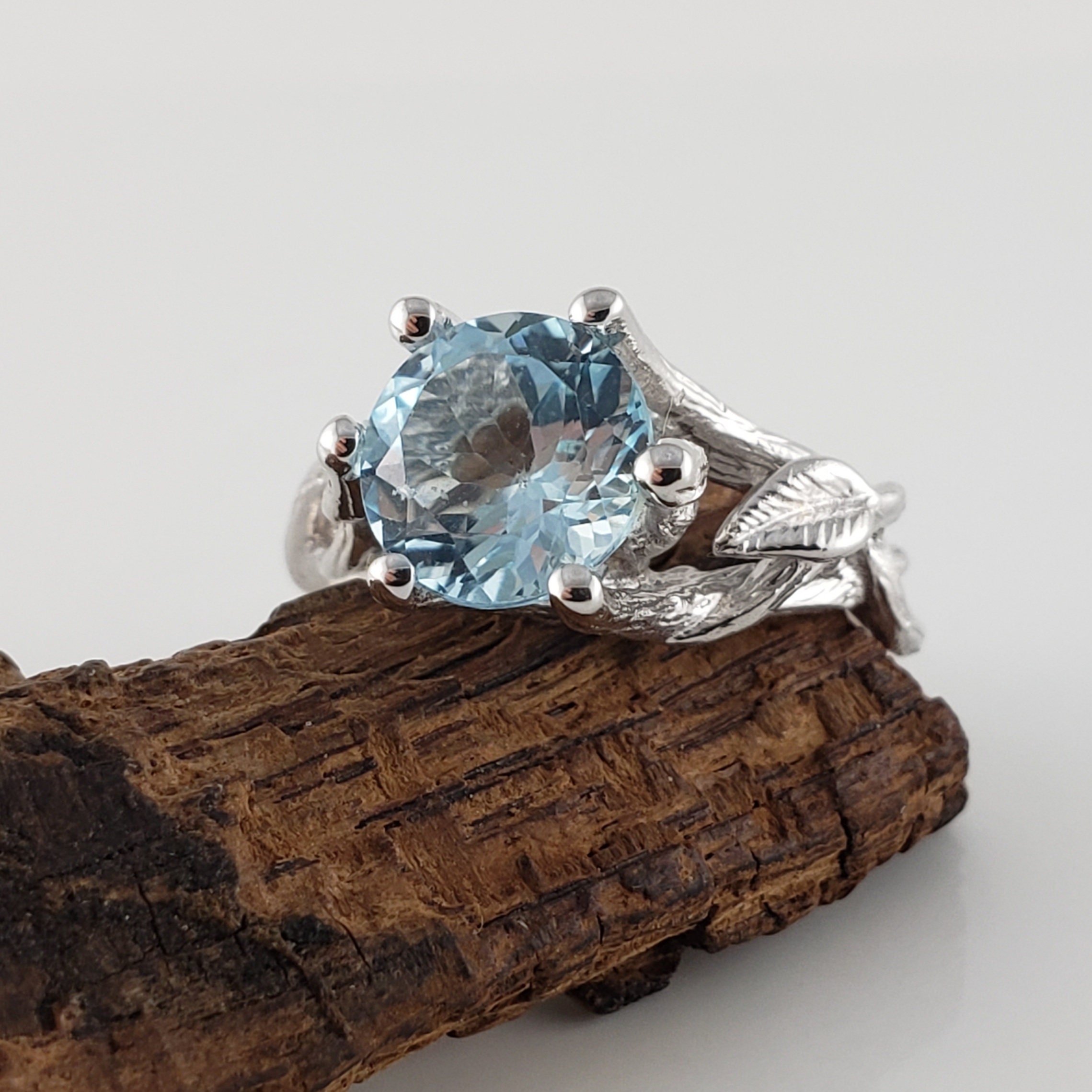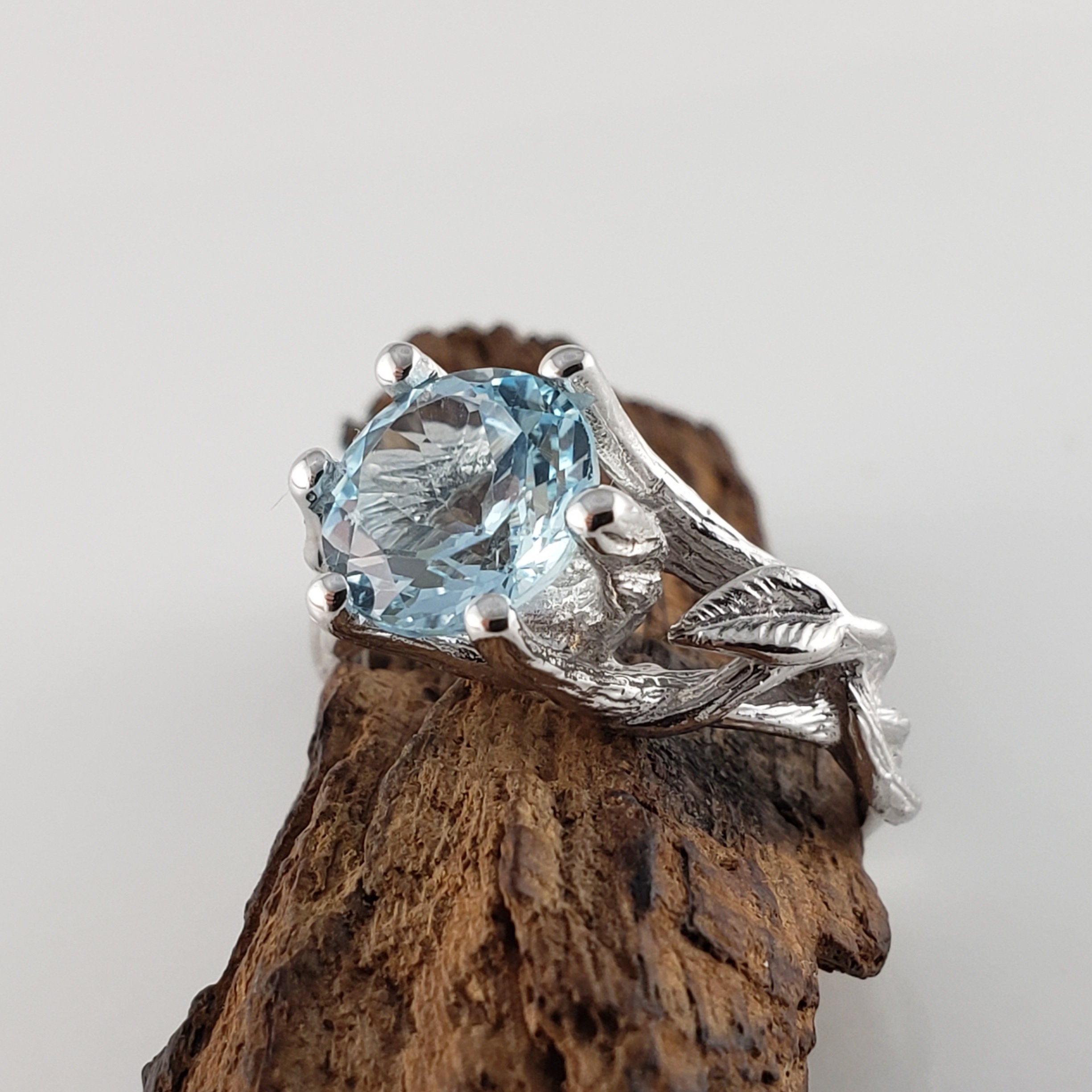 This ring was hand sculpted by Dawn using the lost wax method. Every leaf was hand sculpted and placed on the twig vines and then cast in 14k White Gold (shown). Our gemstones are direct from the ground and hand cut in our studio. These are truly one-of-a-kind rings.
