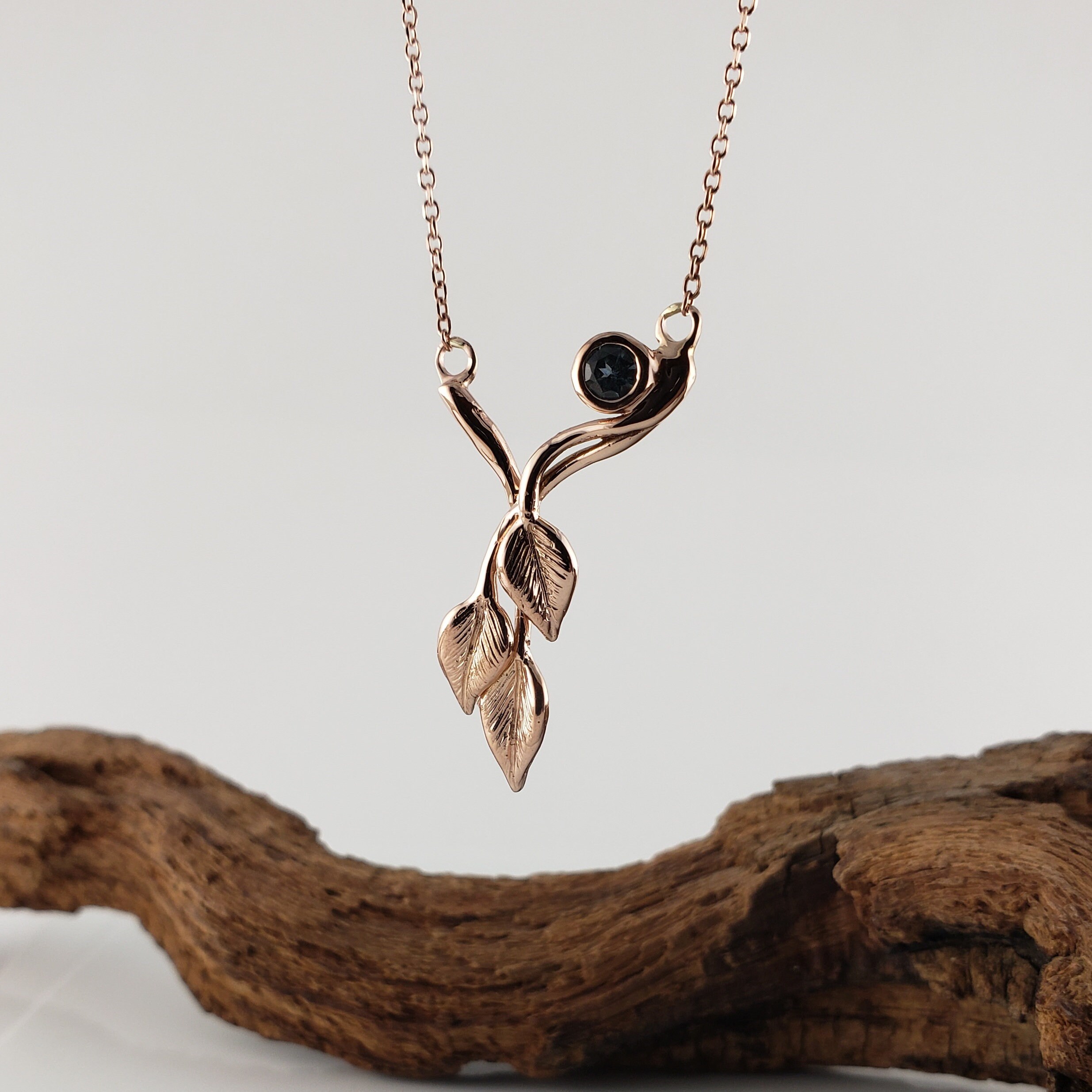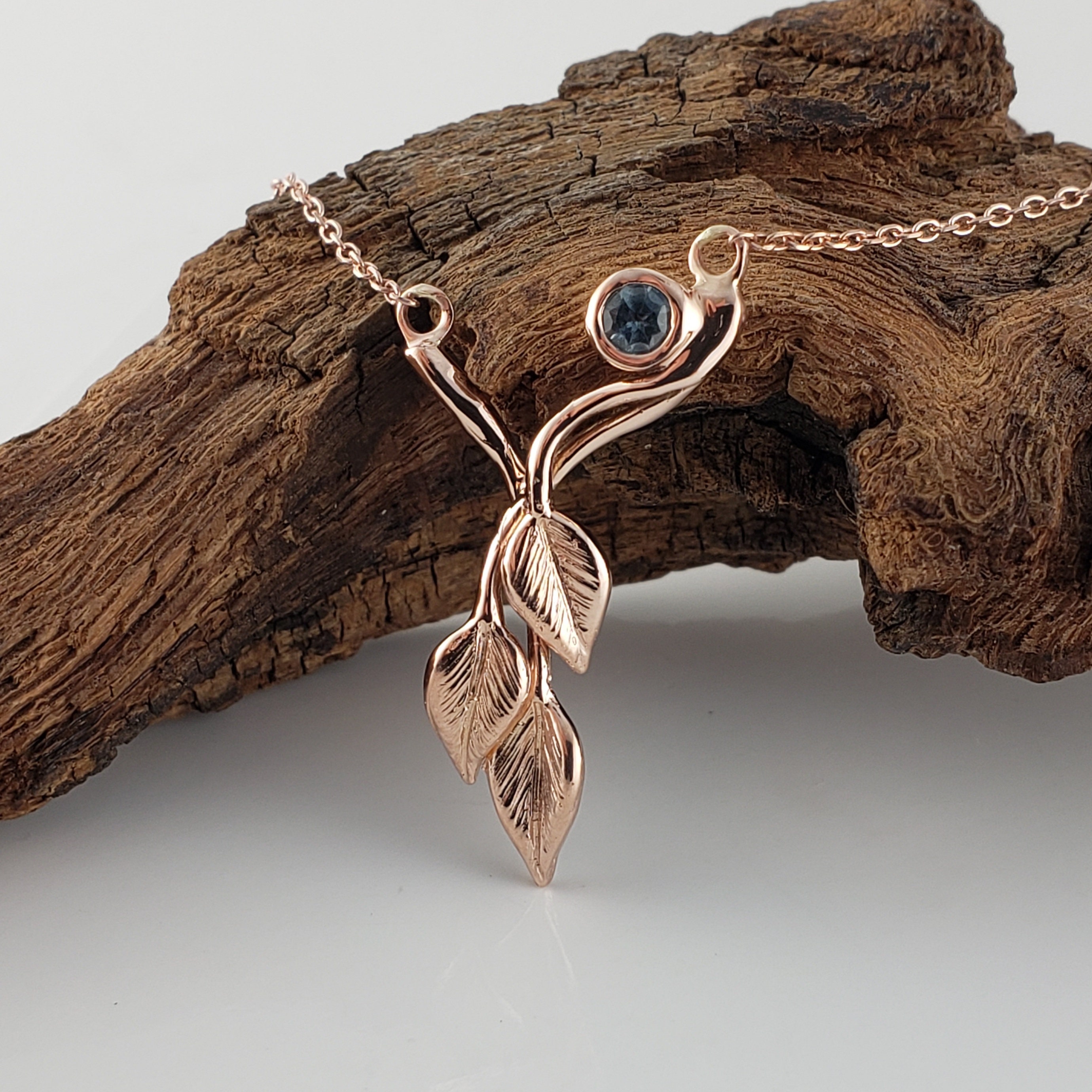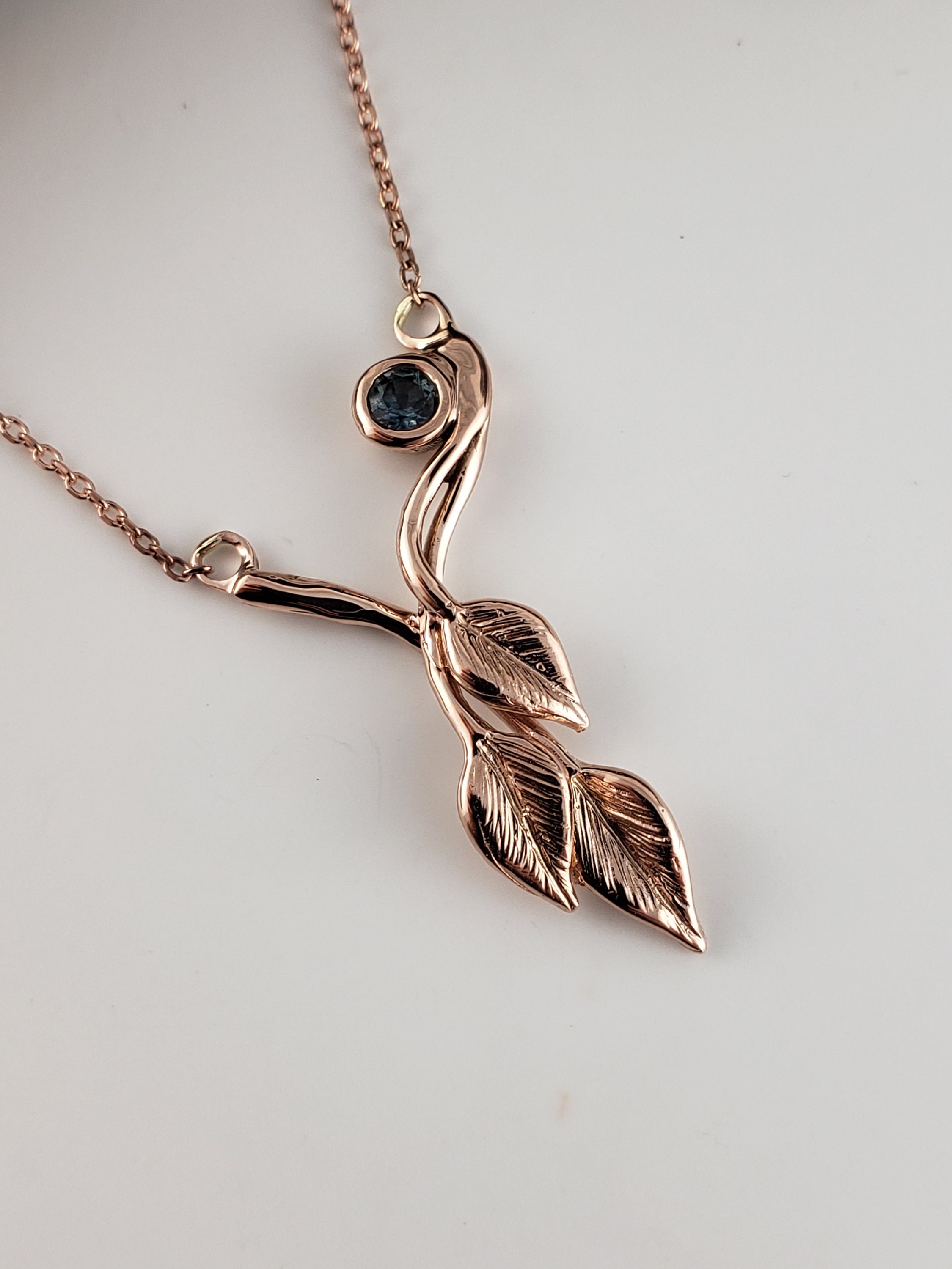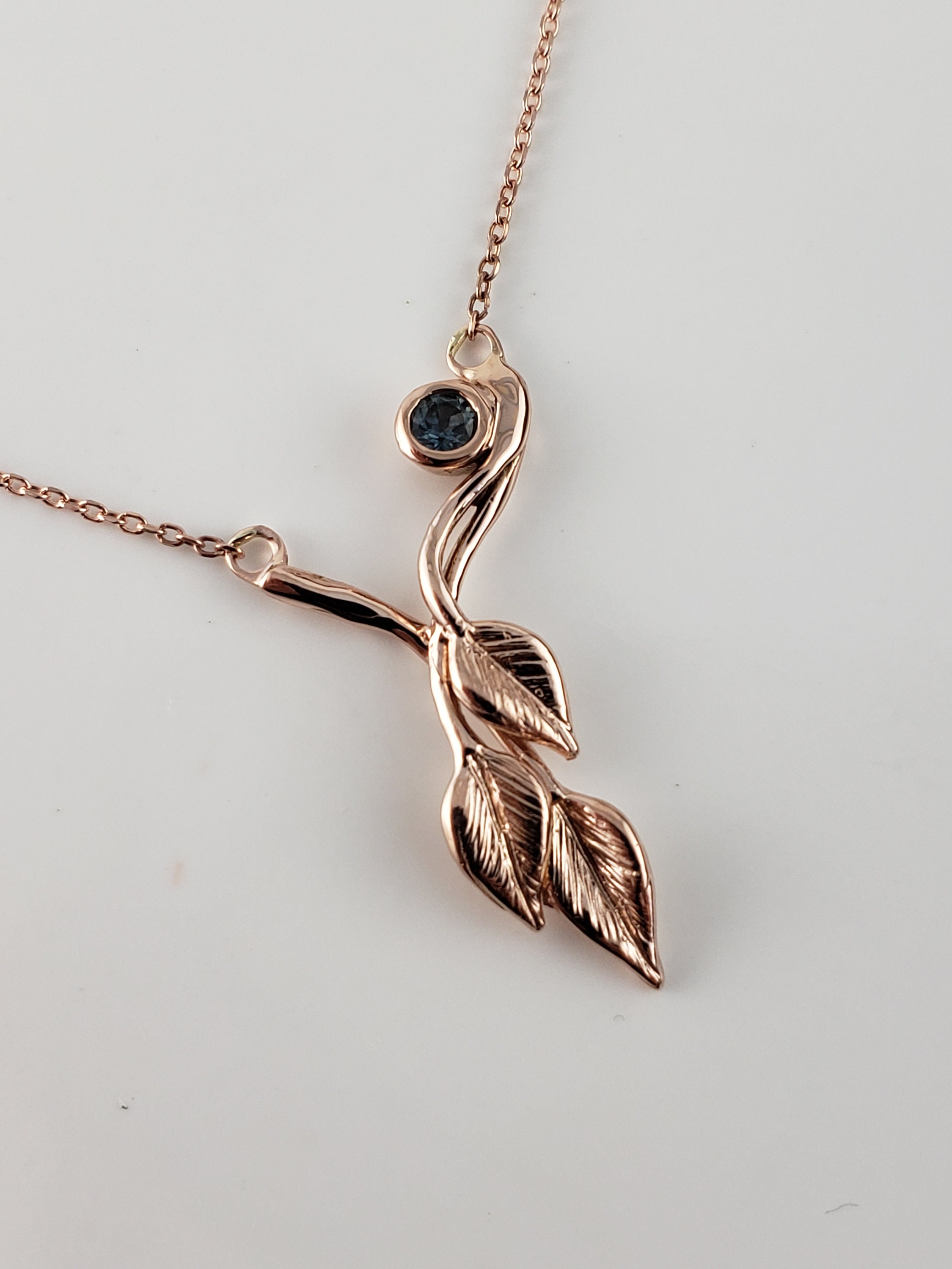 14k Rose Gold Three Leaf & Twig Gemstone Necklace - Teal Montana Sapphire Pendant by DV Jewelry Designs