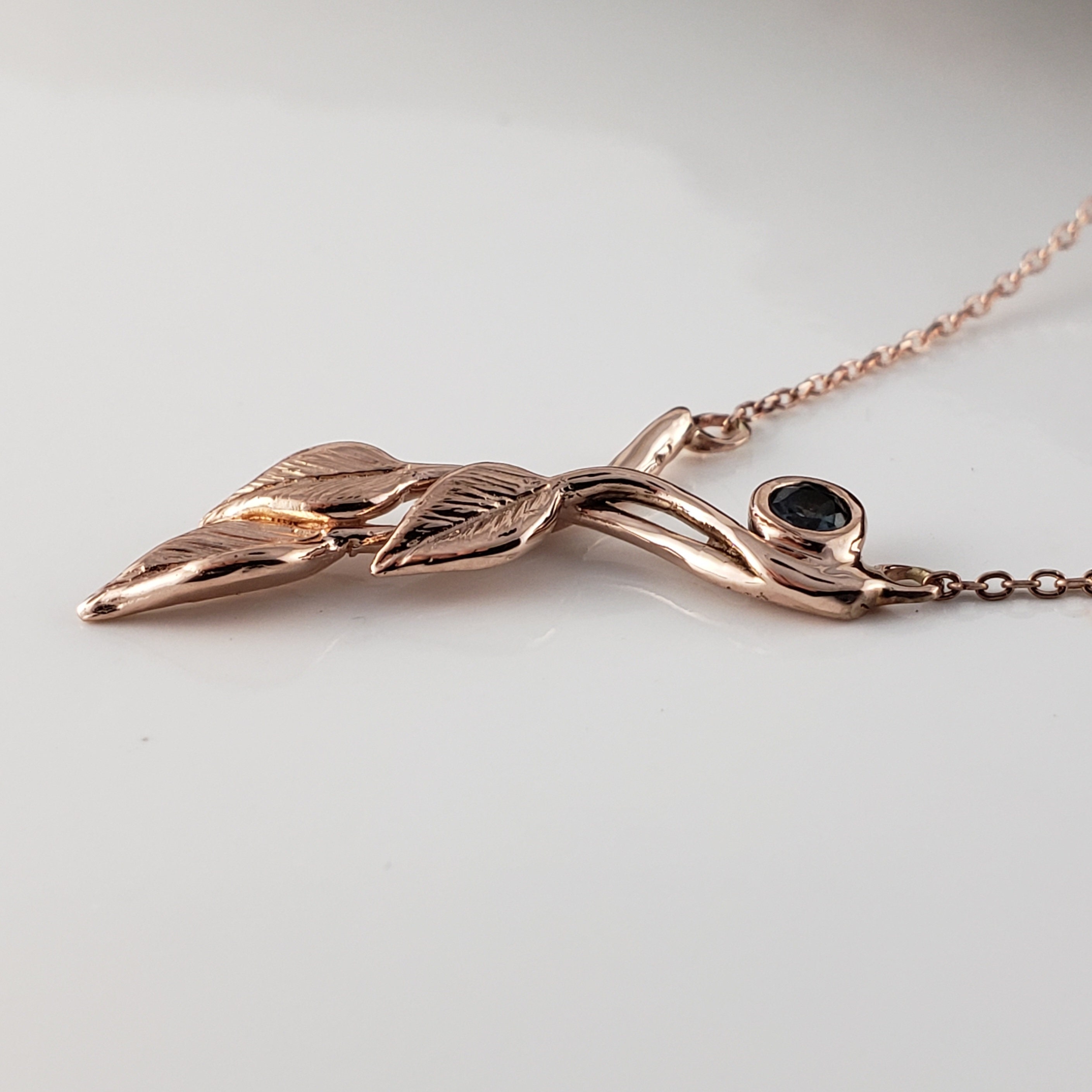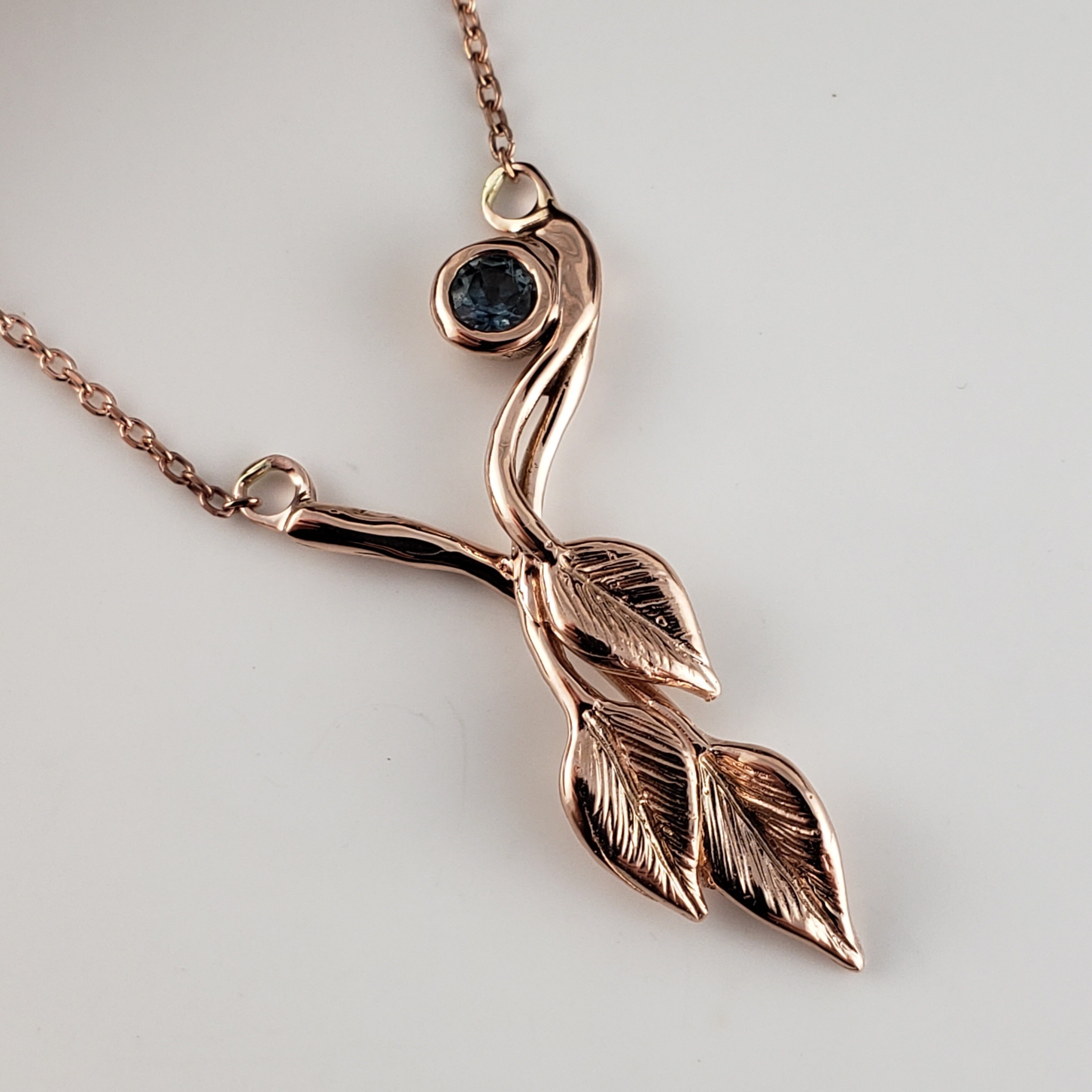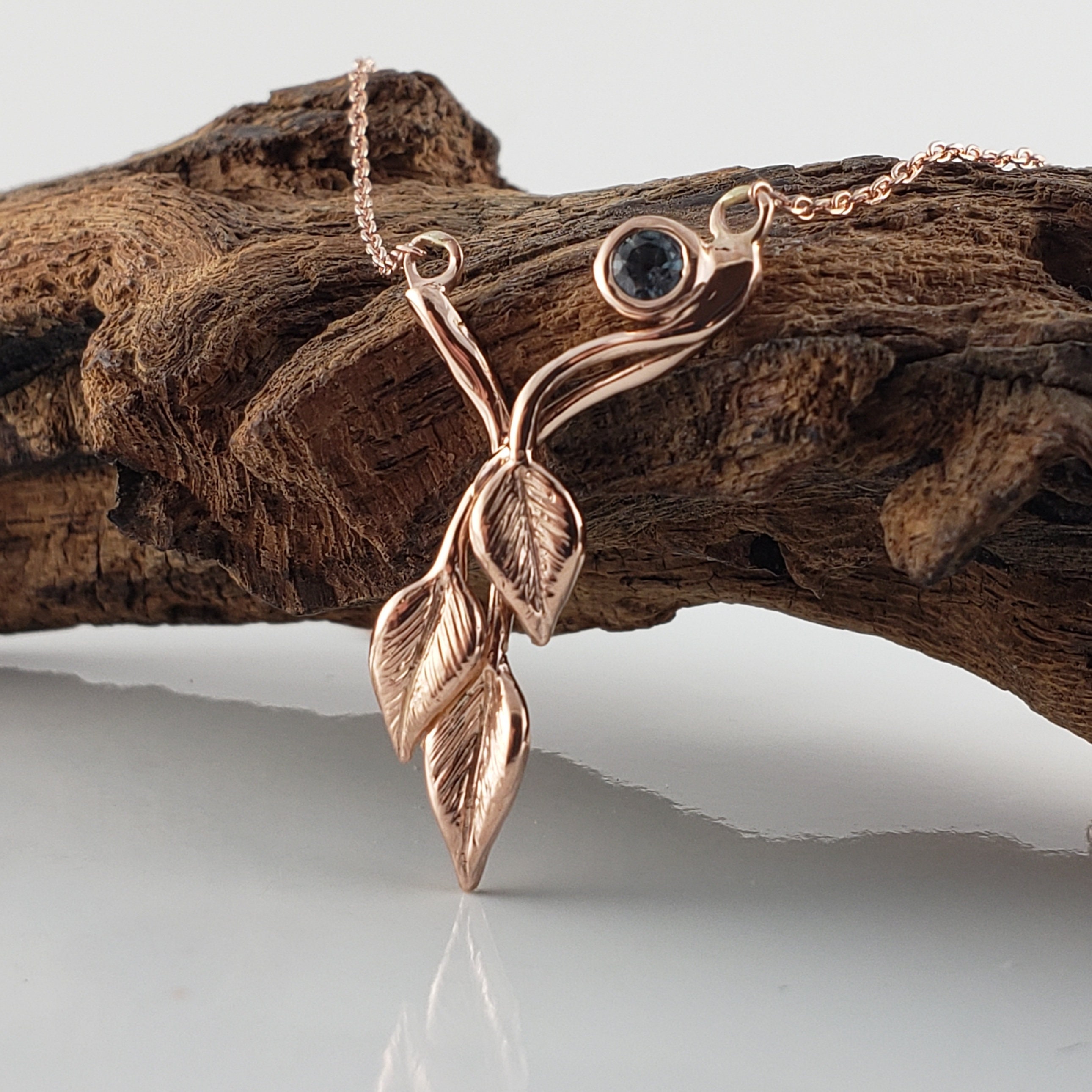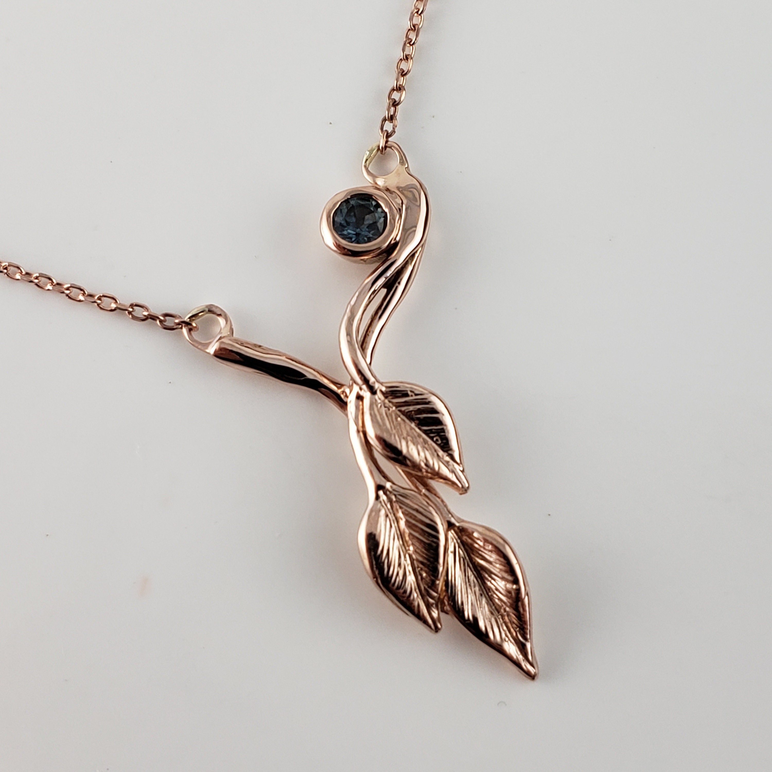 14k Rose Gold Three Leaf & Twig Gemstone Necklace - Teal Montana Sapphire Pendant by DV Jewelry Designs
