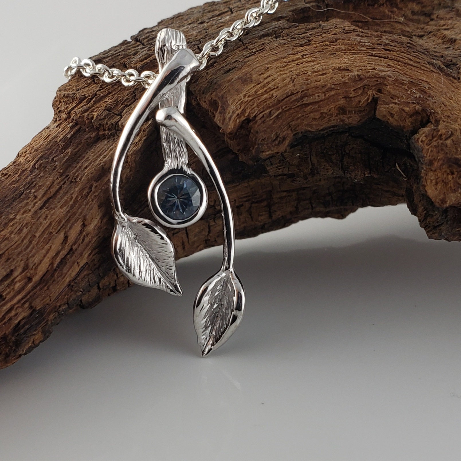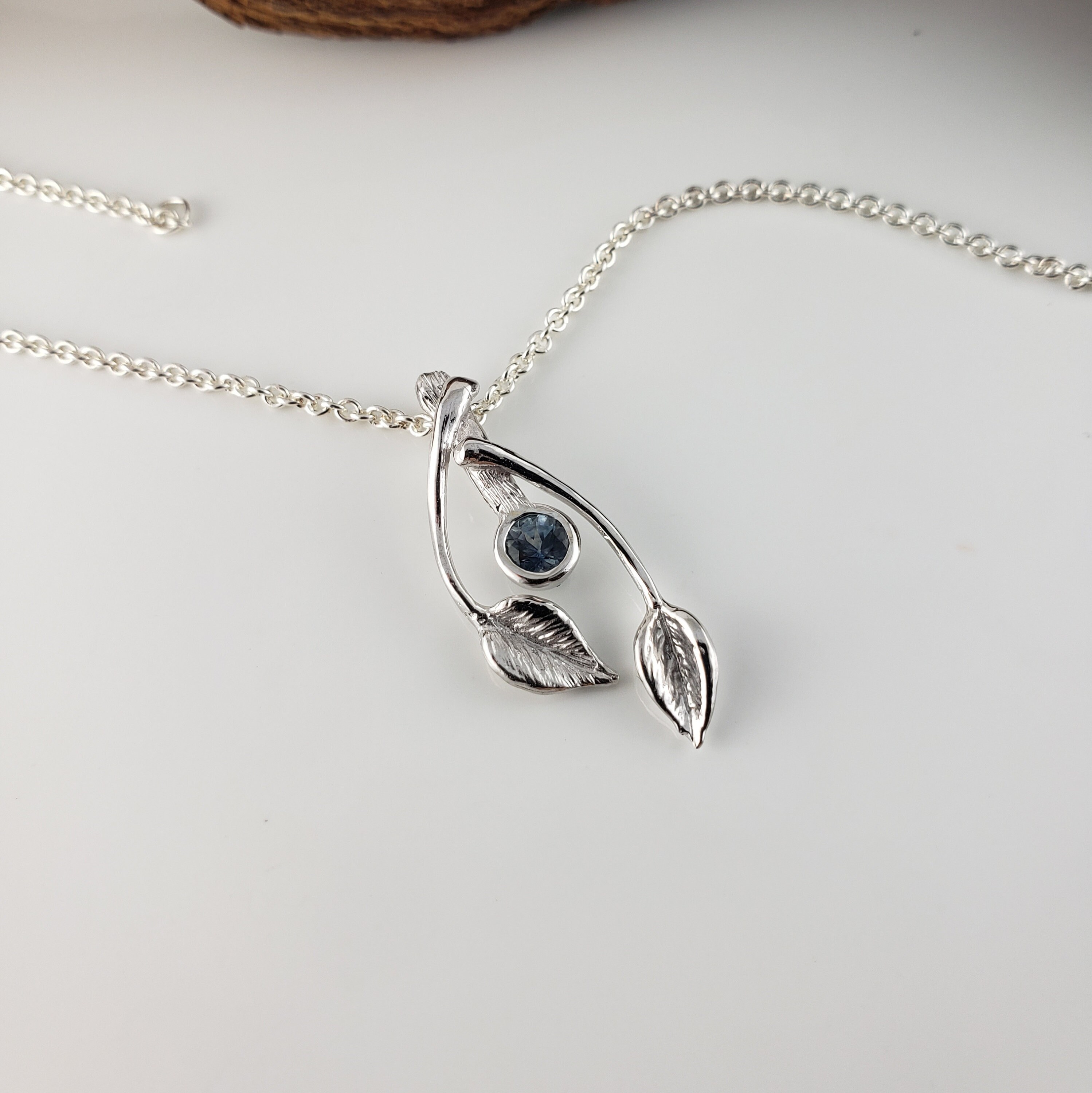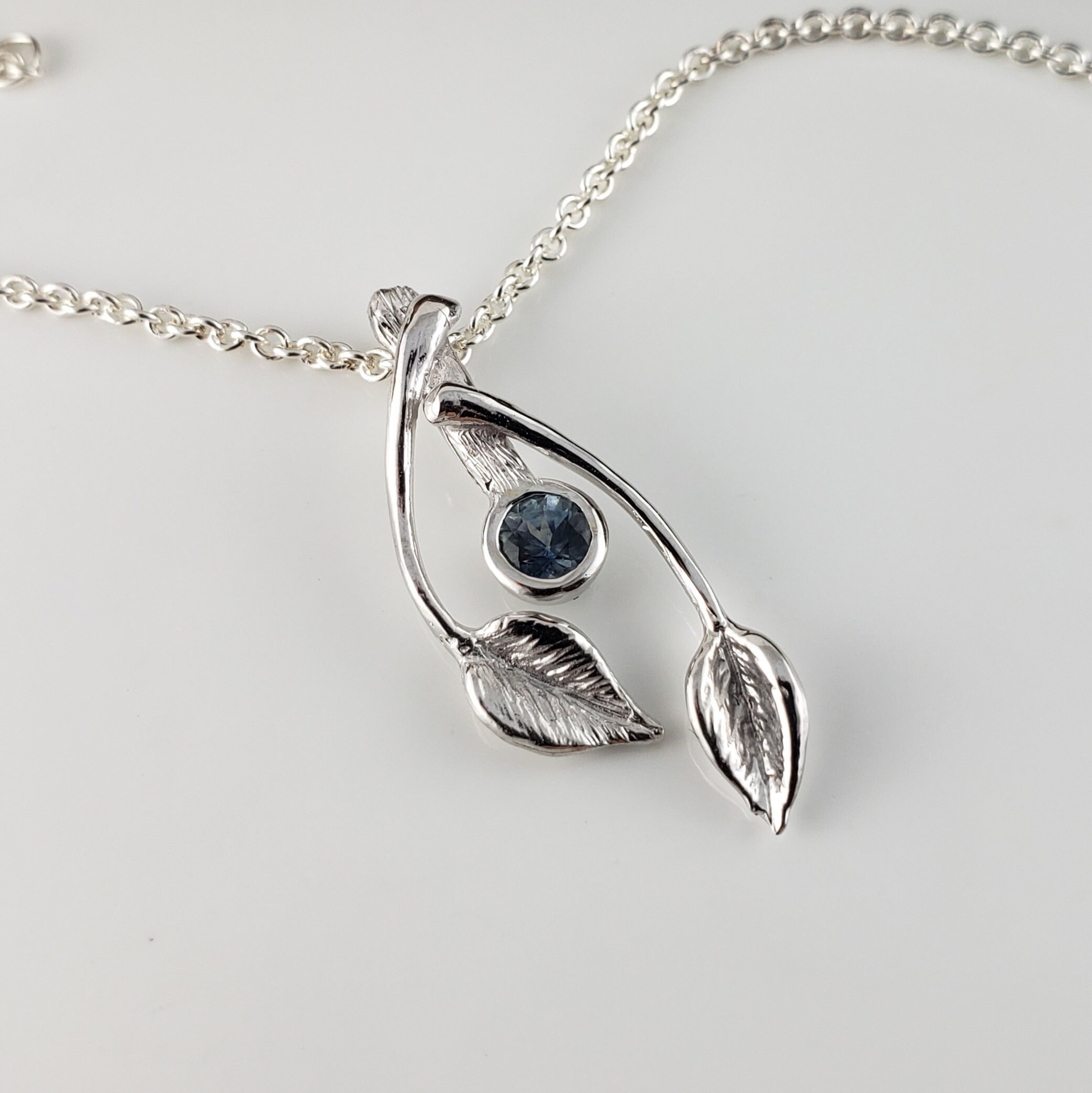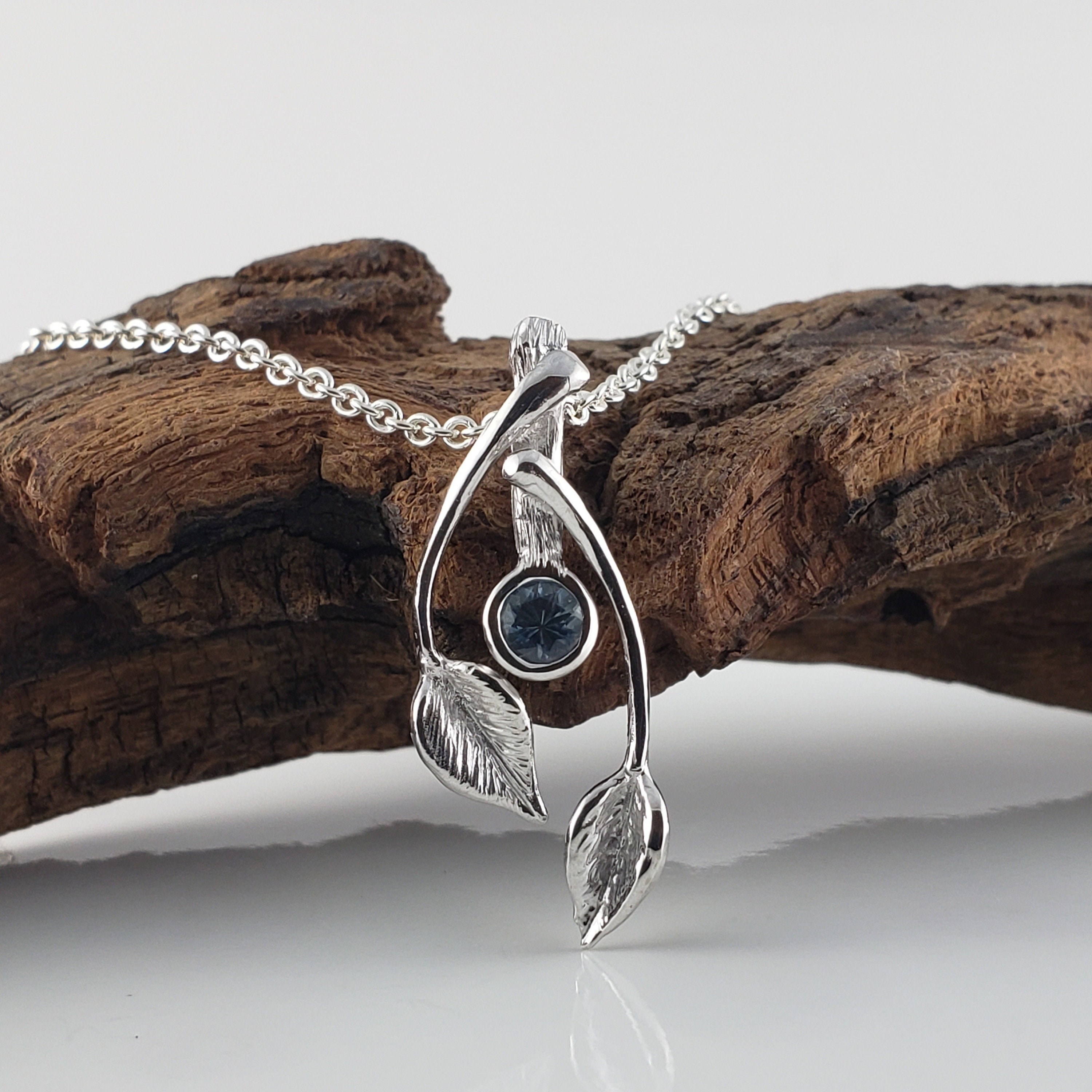 14k Gold Two Leaf & Twig Gemstone Necklace - Blue Sapphire Pendant by DV Jewelry Designs