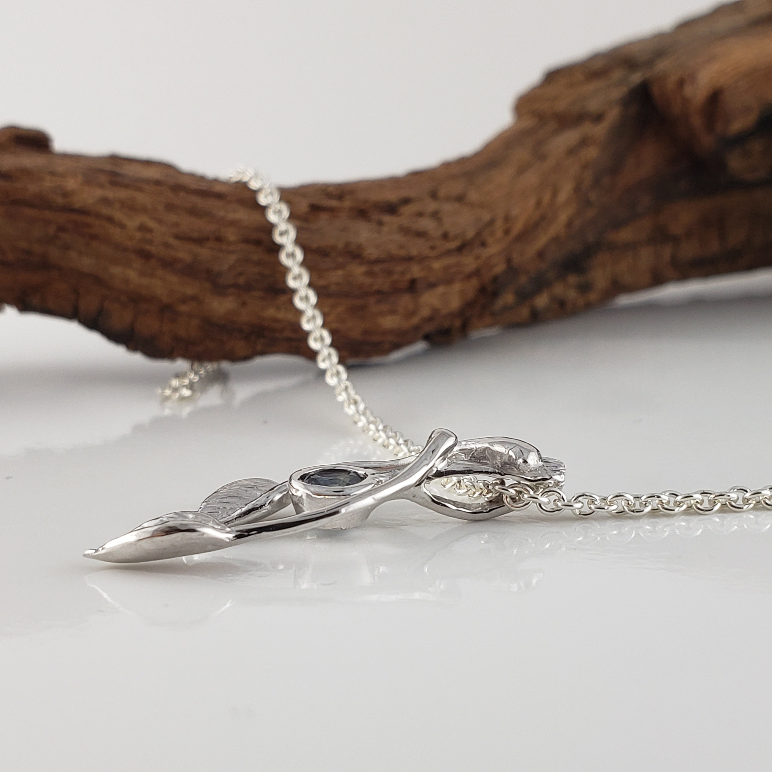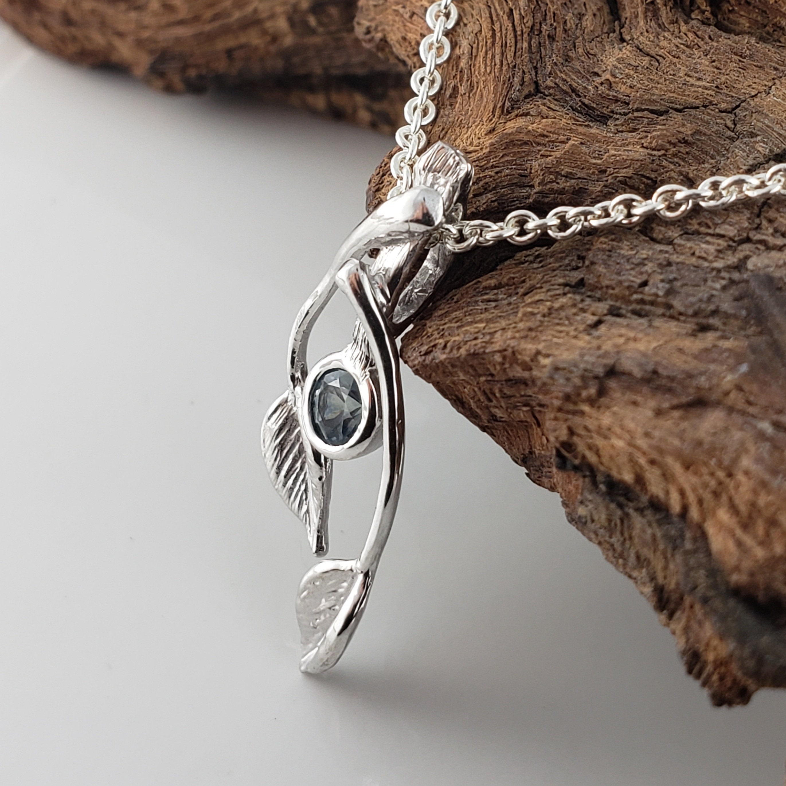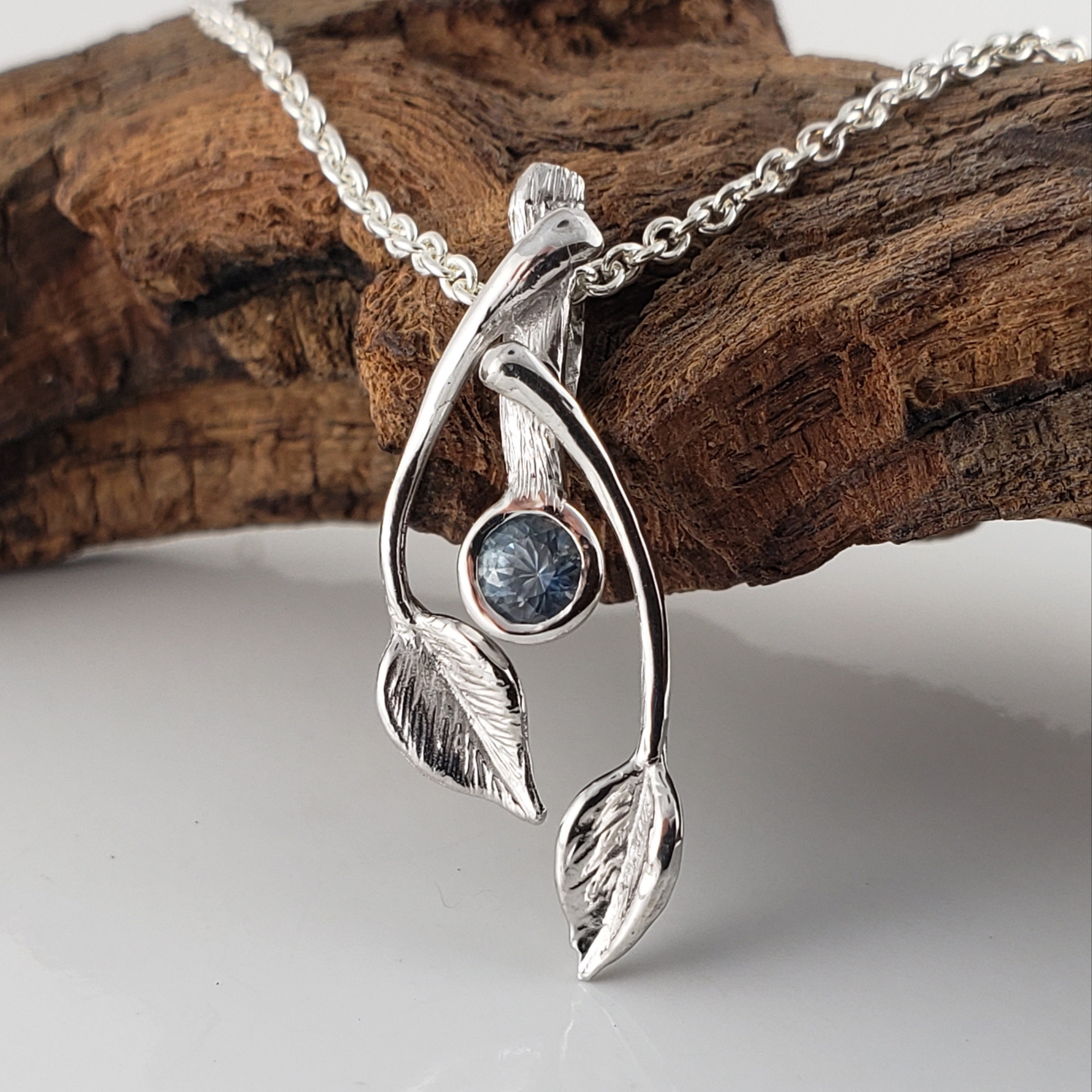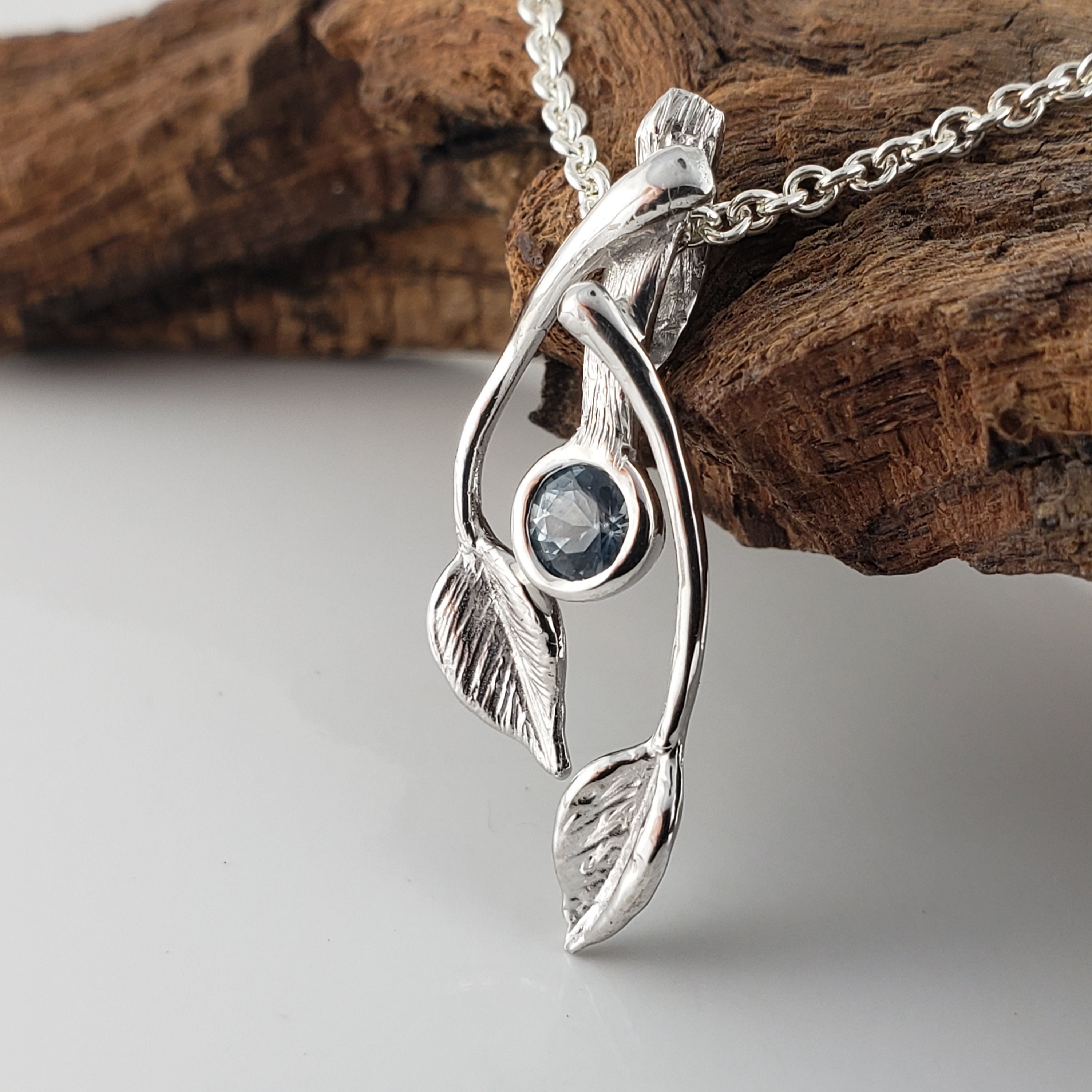 14k Gold Two Leaf & Twig Gemstone Necklace - Blue Sapphire Pendant by DV Jewelry Designs