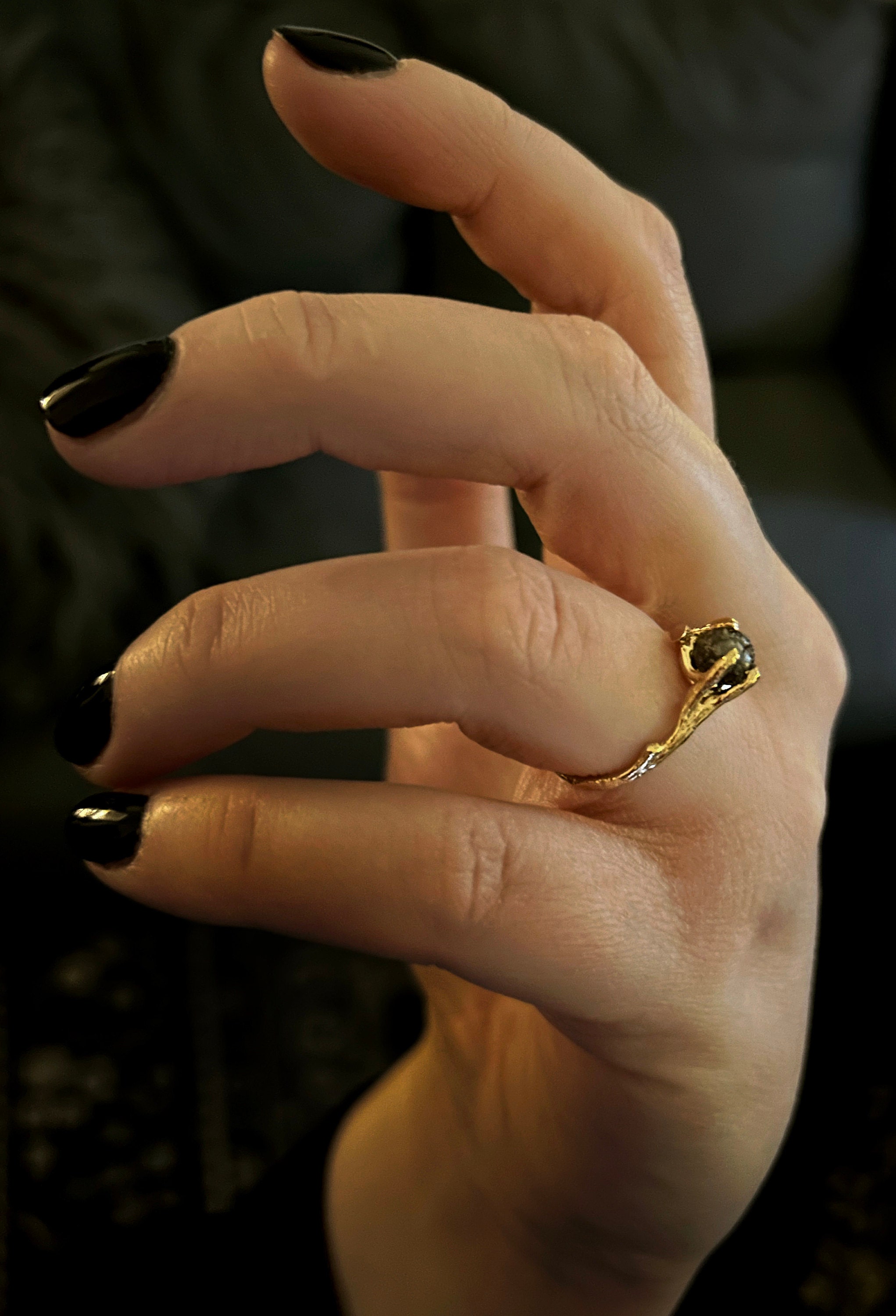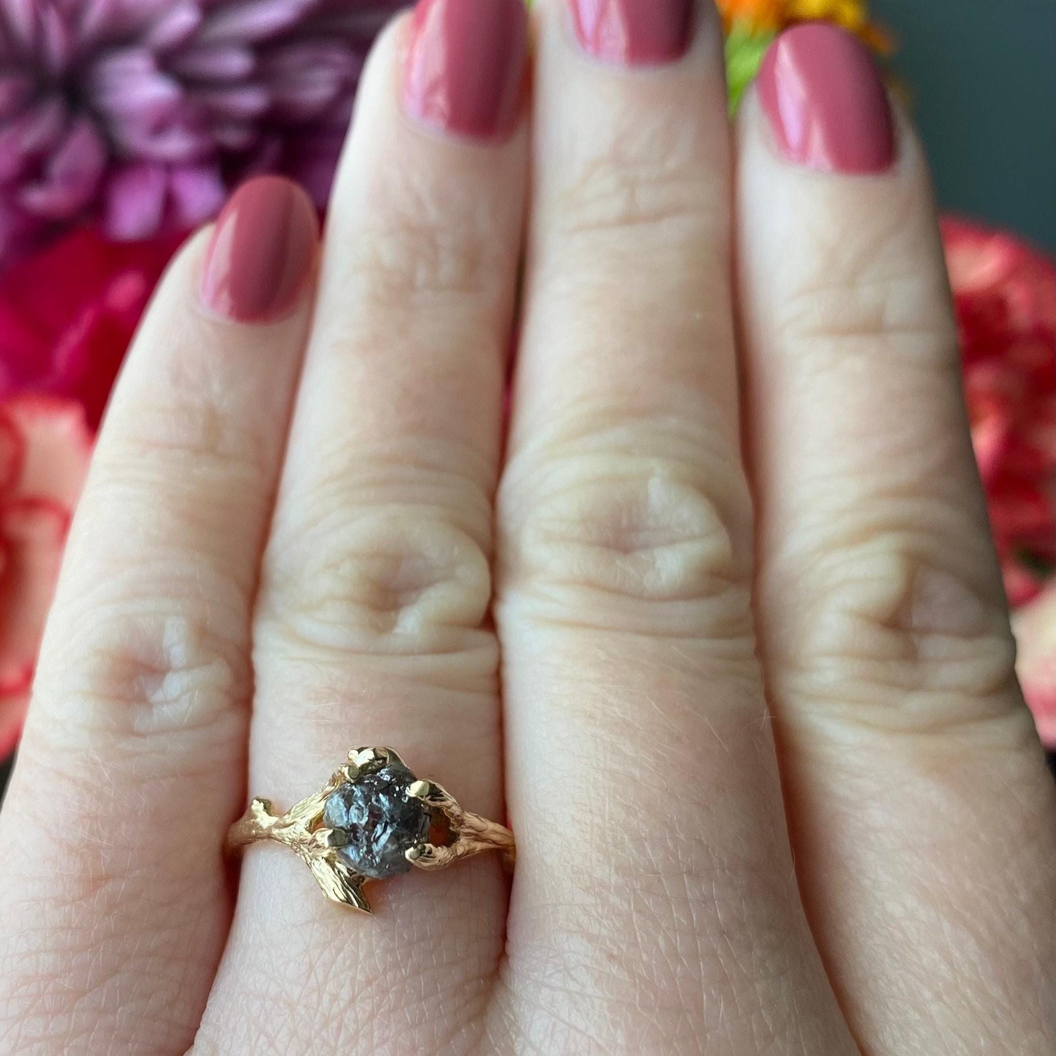 ●1.5ct Dainty Natural Black Rough Diamond Engagement Ring set in 14k Yellow Gold.